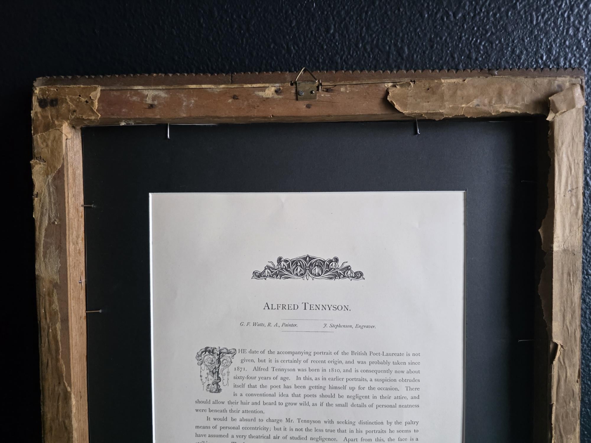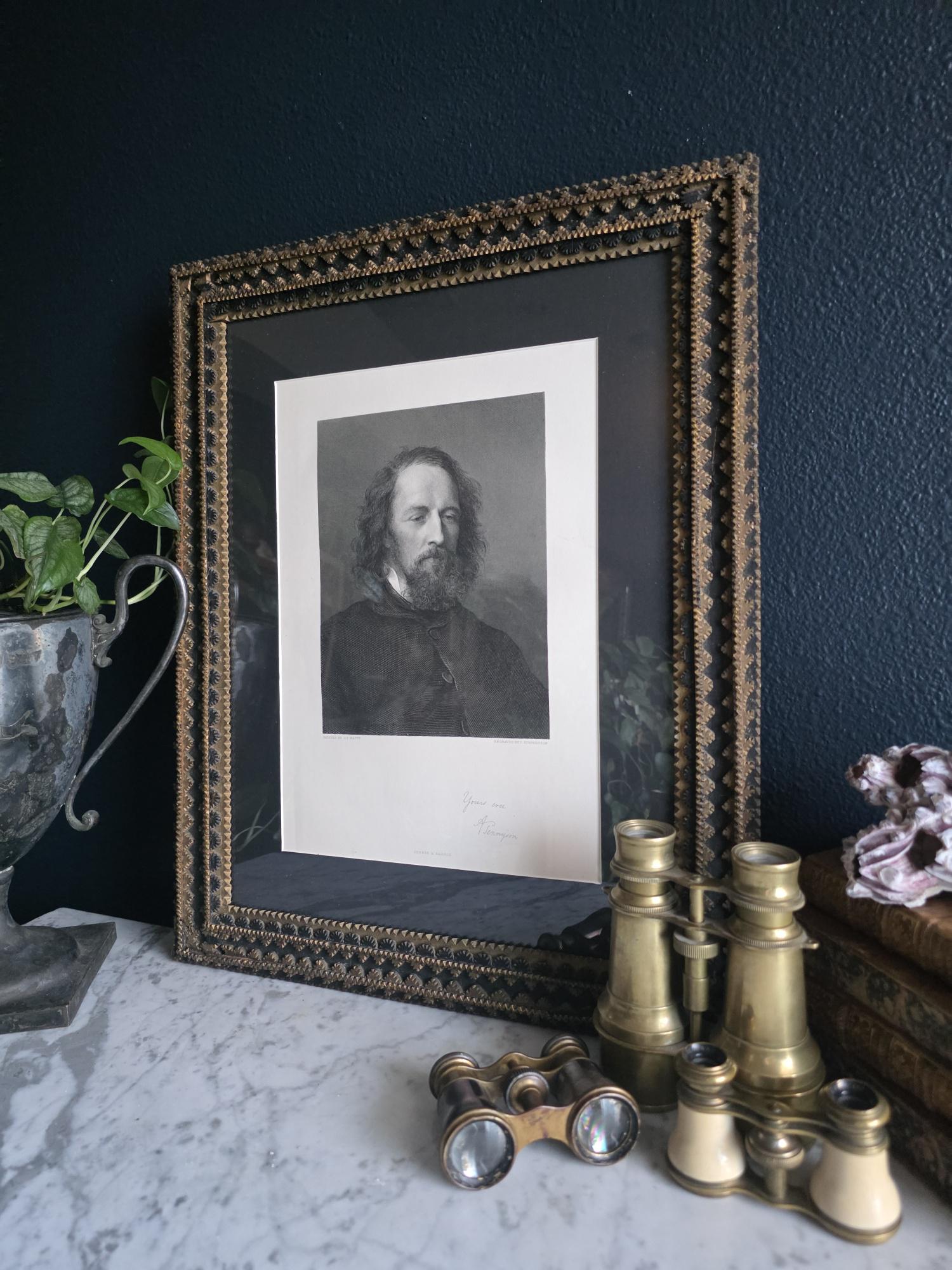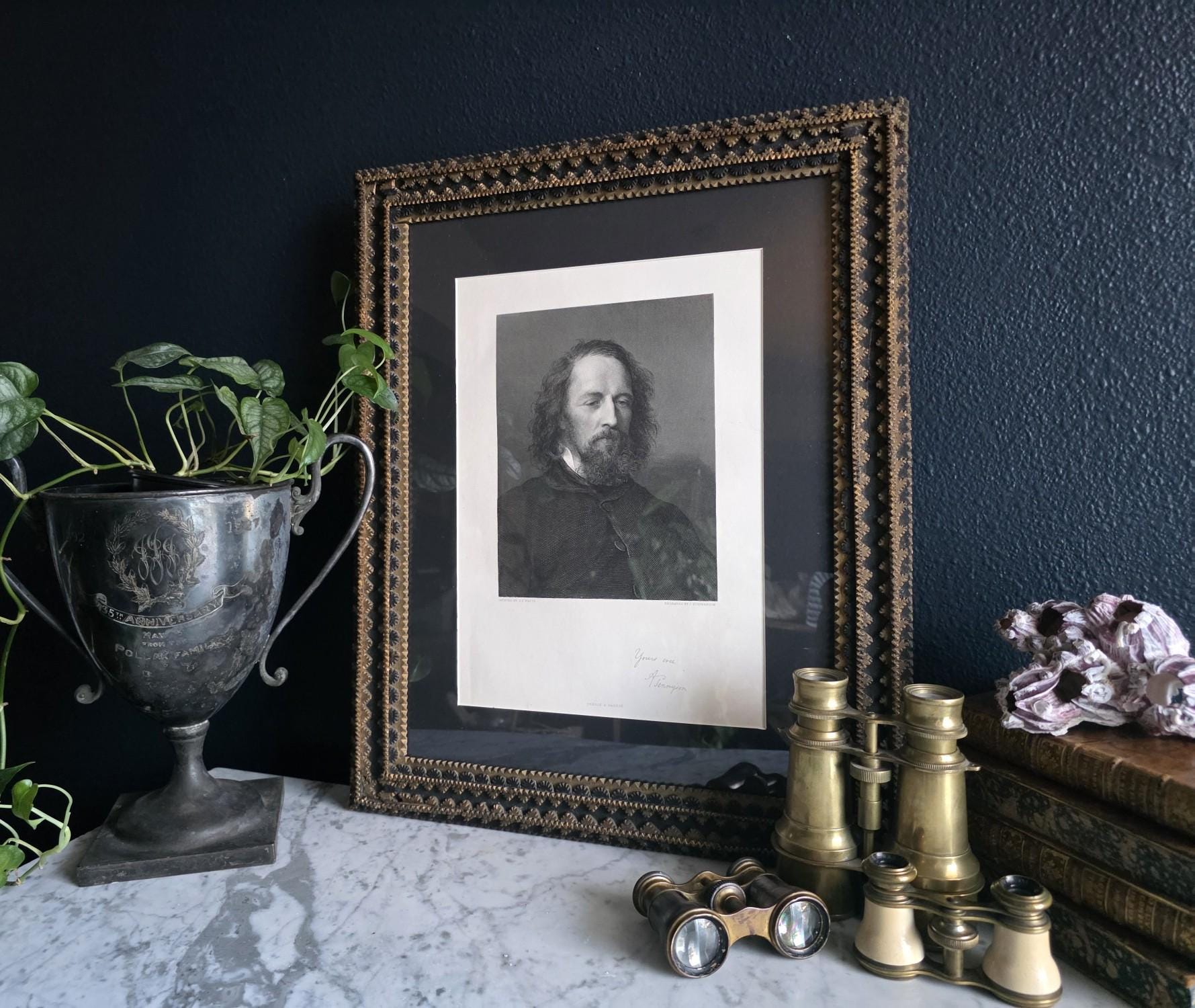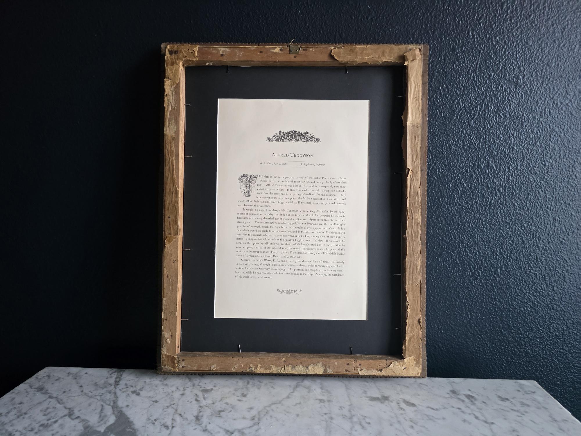 The engraving was published by the Philadelphia firm Gebbie & Barrie, likely between 1874 and 1876. This date is supported by the biographical text below the image, which notes Tennyson is "now about sixty-four years of age" (born 1810). The print features a facsimile signature ("Yours ever, A. Tennyson") and captures the poet in his characteristic "studied negligence." The piece is mounted in a decidedly rustic manner; please note that the framing is an amateur, primitive job typical of home-crafted folk art. The backing is rough, secured with nails and retaining fragments of the original folio book paper, adding to its authentic, untouched historical character.
