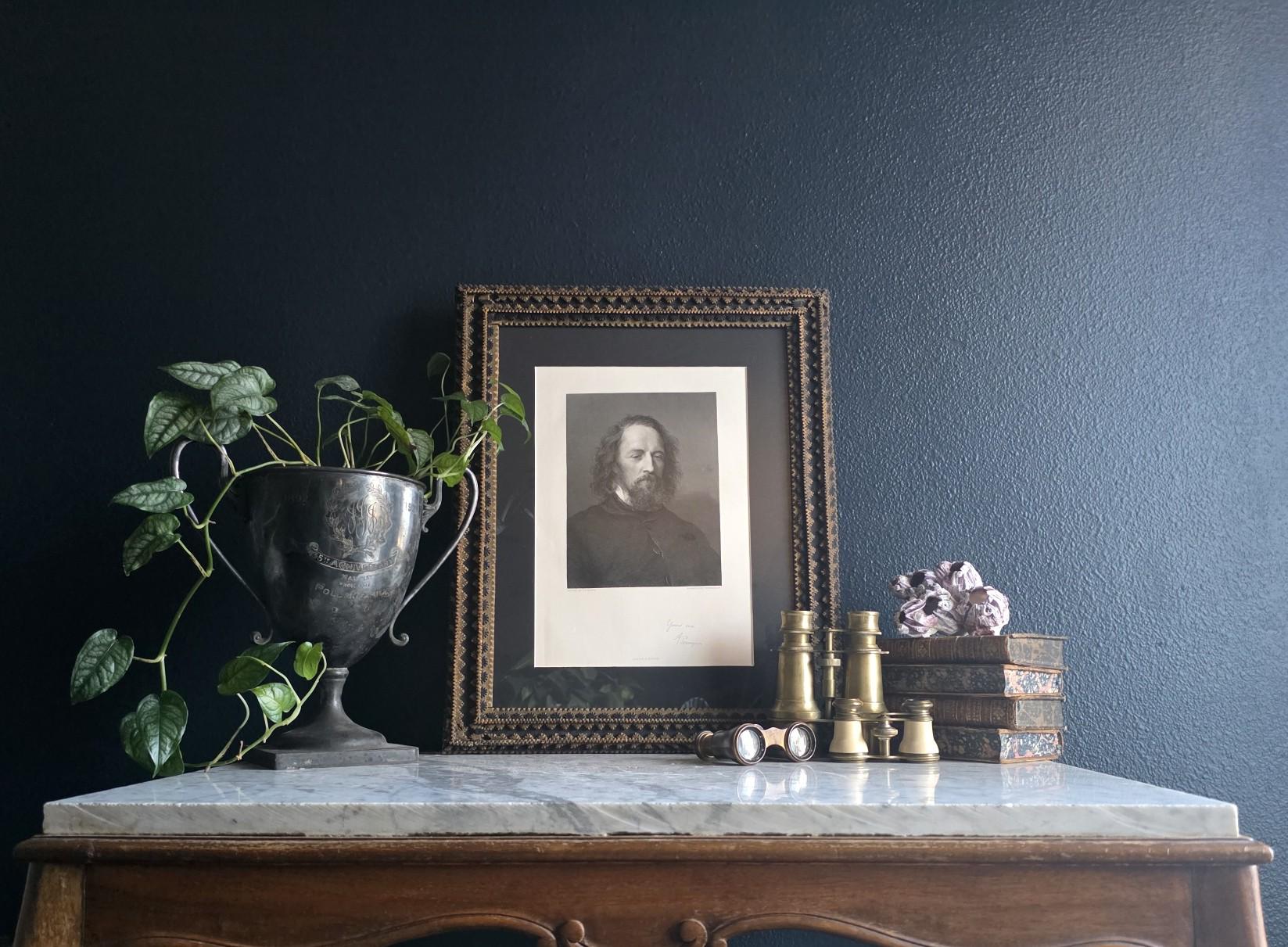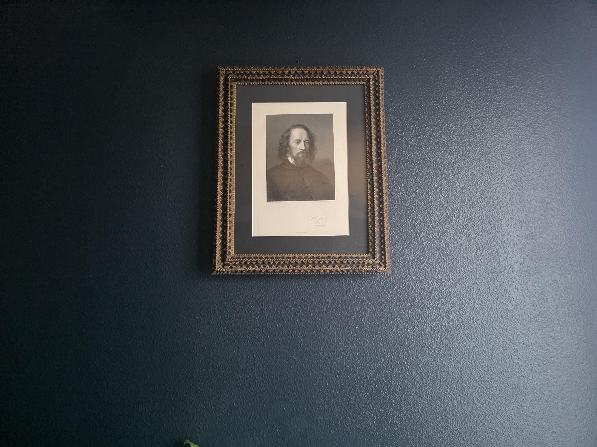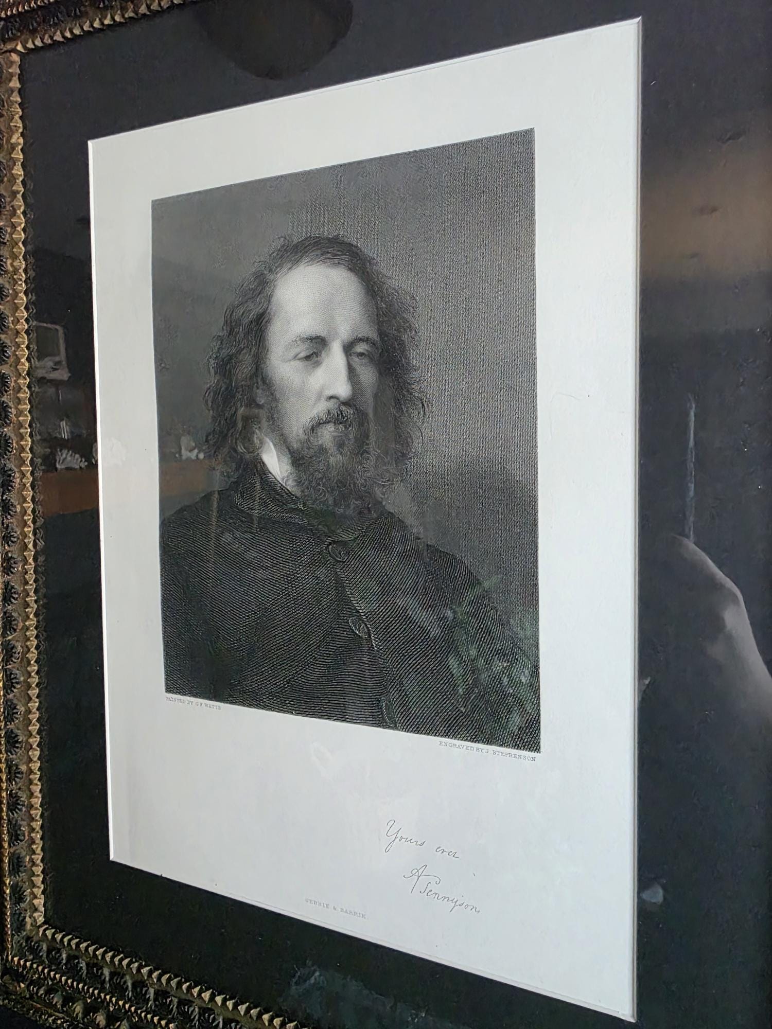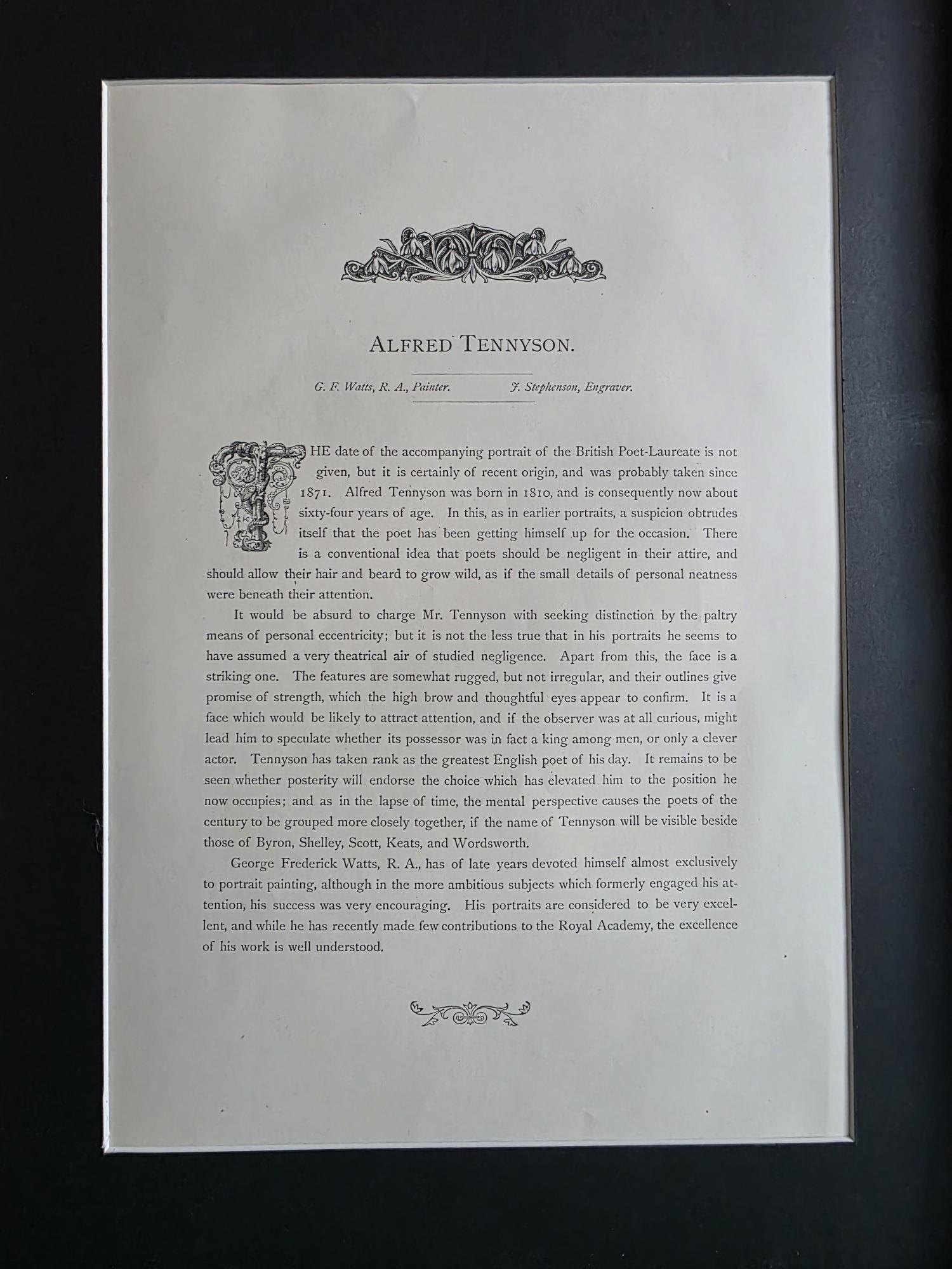 The engraving was published by the Philadelphia firm Gebbie & Barrie, likely between 1874 and 1876. This date is supported by the biographical text below the image, which notes Tennyson is "now about sixty-four years of age" (born 1810). The print features a facsimile signature ("Yours ever, A. Tennyson") and captures the poet in his characteristic "studied negligence." The piece is mounted in a decidedly rustic manner; please note that the framing is an amateur, primitive job typical of home-crafted folk art. The backing is rough, secured with nails and retaining fragments of the original folio book paper, adding to its authentic, untouched historical character.