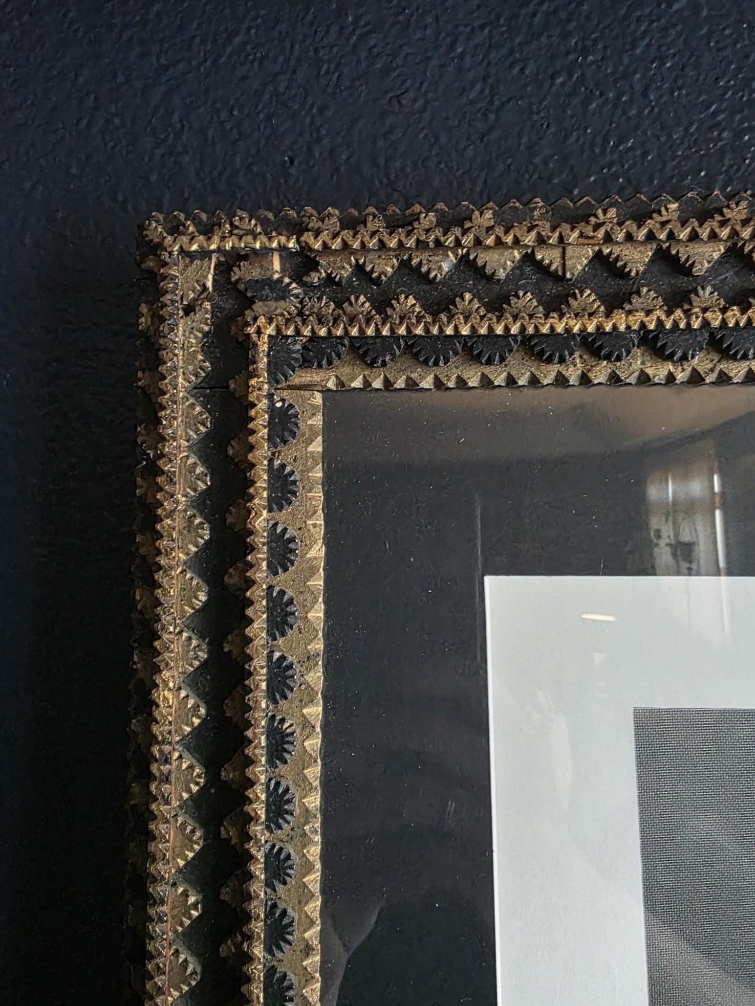 Condition: Tramp art condition consistent with antique age. Chip carvings lengths are loose in spots but remain overall intact. Amateur framing job with an acrylic framing glass. Small bits of debris between glass and black matting.