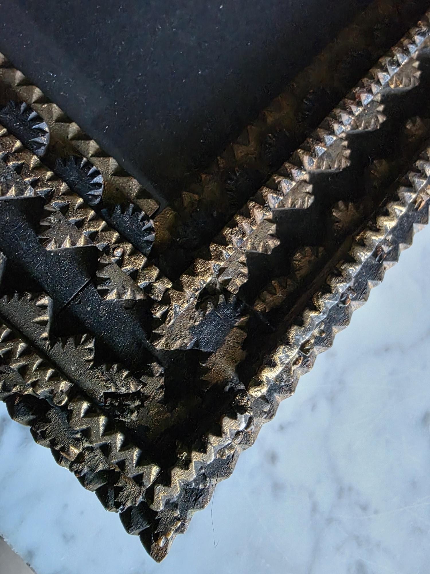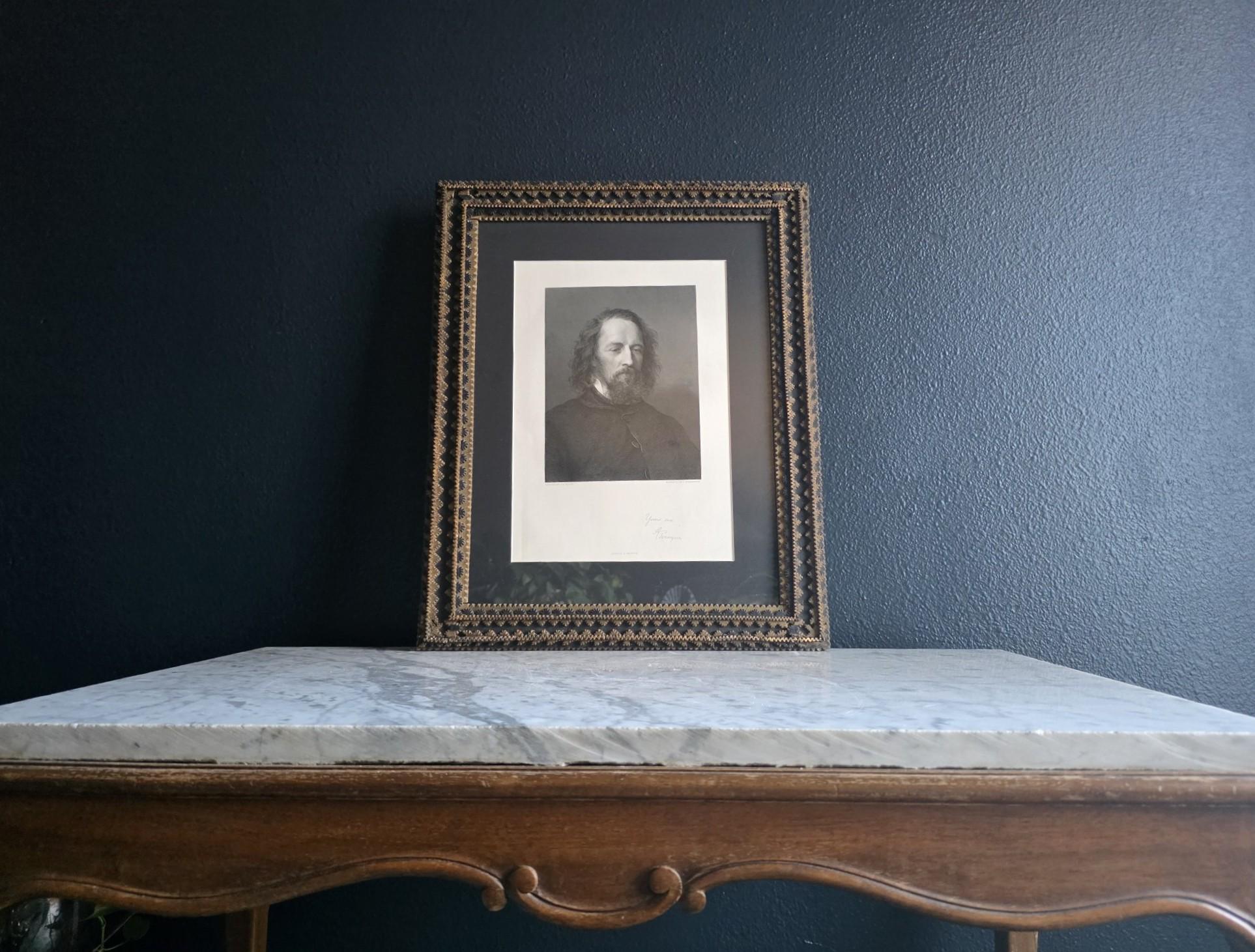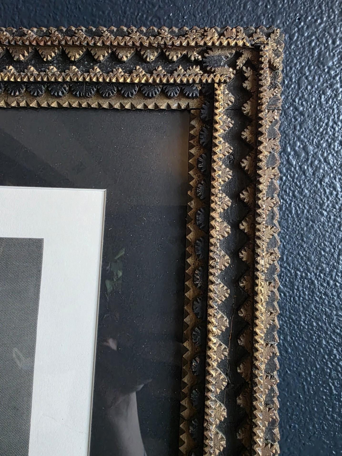 This unique piece features a striking example of antique Tramp Art framing housing a 19th-century steel engraving of the British Poet Laureate, Alfred Tennyson. The frame is a charming specimen of folk art craftsmanship, constructed from layers of chip-carved wood with distinct pyramidal notches and finished in a dark paint—likely black—accented with gilt gold tips that highlight the geometric texture. It holds a detailed portrait engraving by J. Stephenson, based on the painting by renowned Victorian artist G.F. Watts.