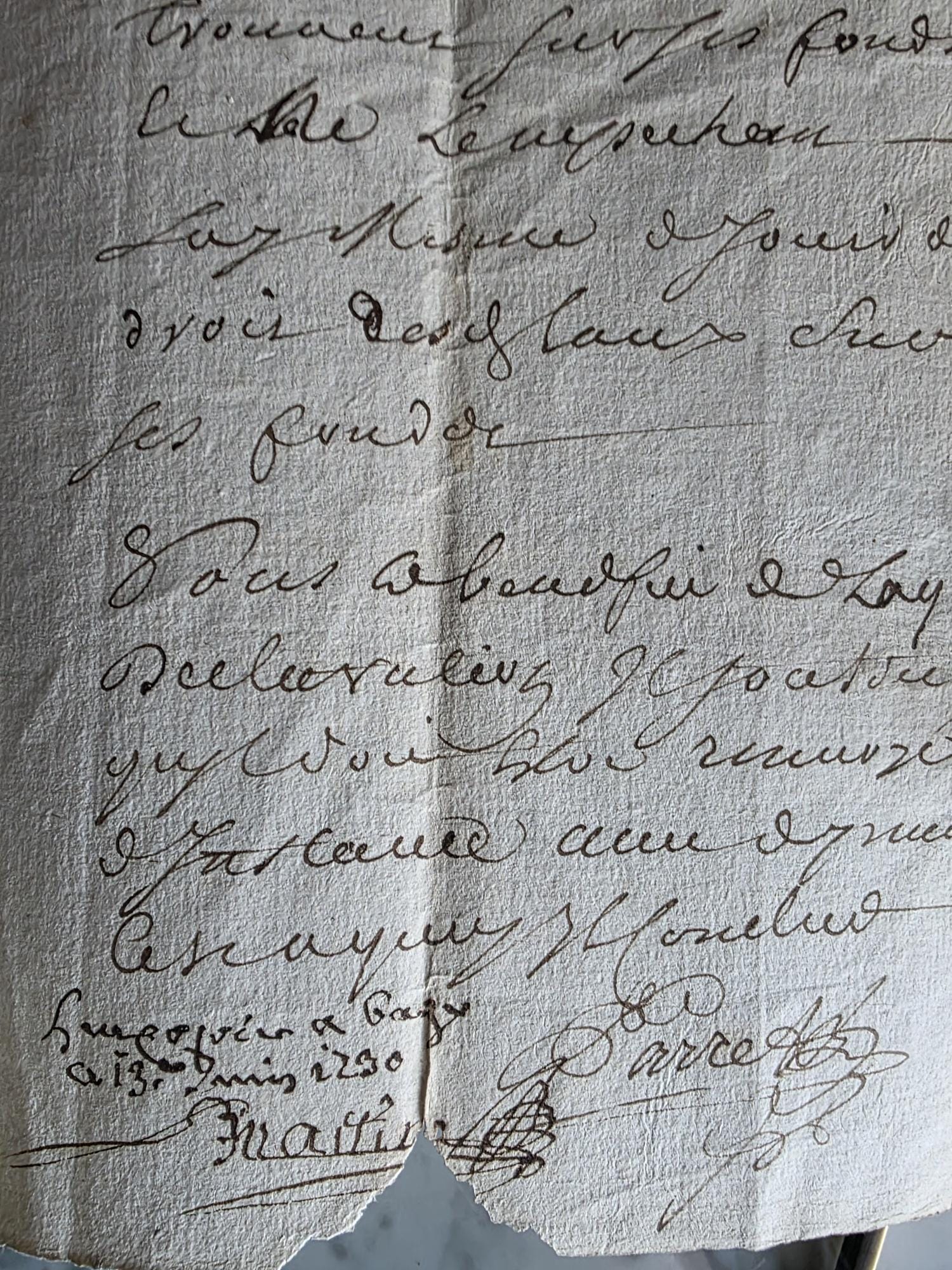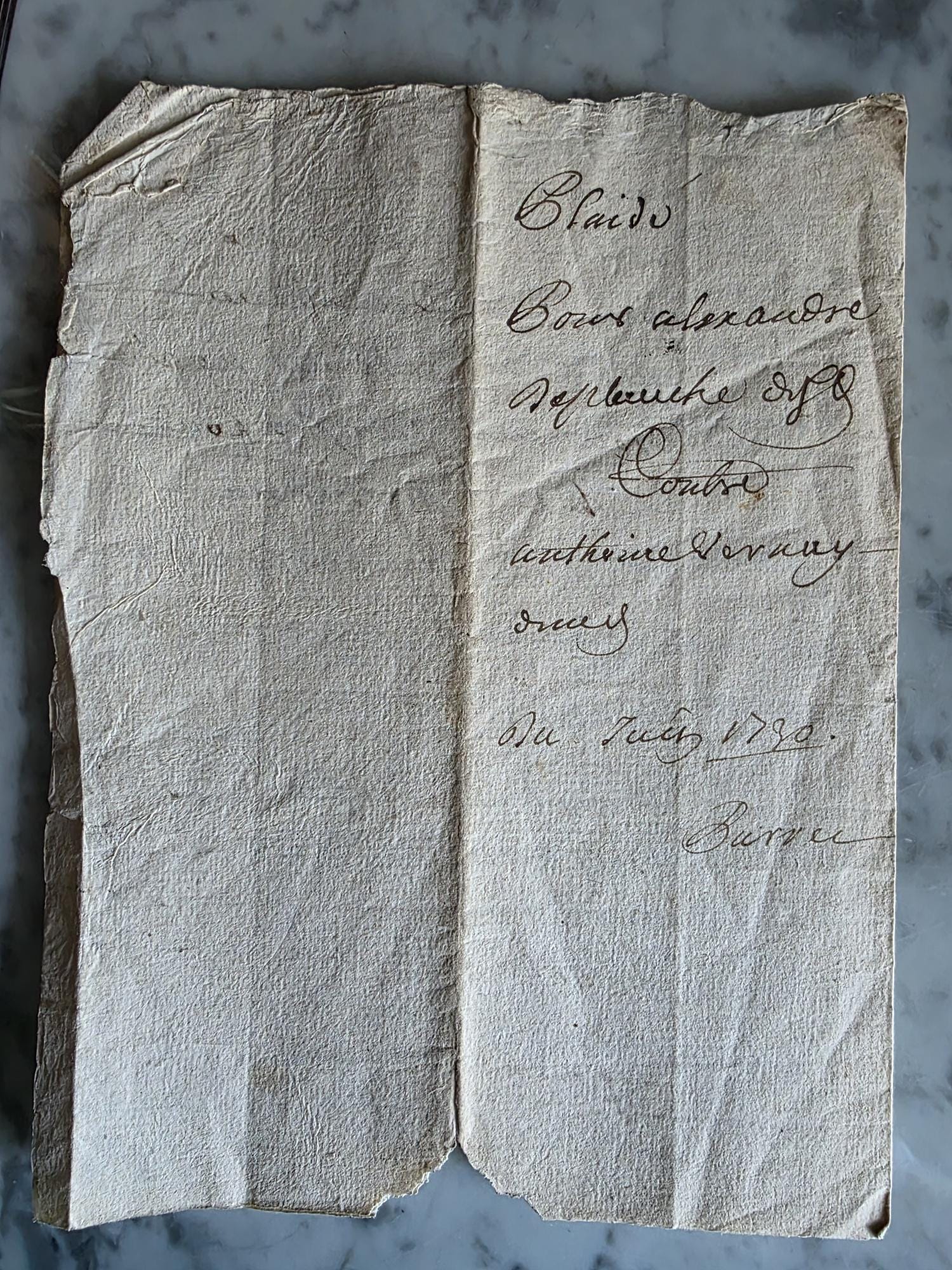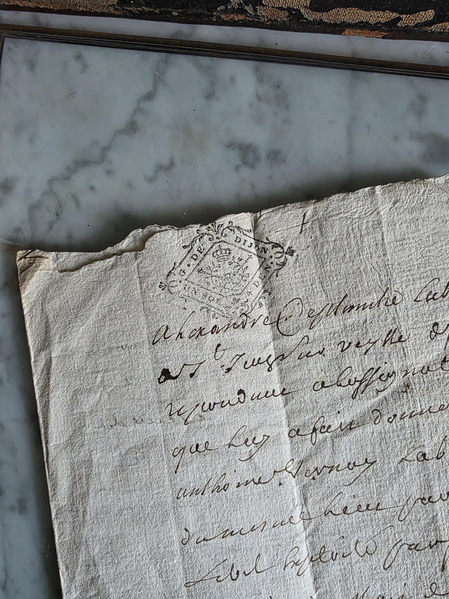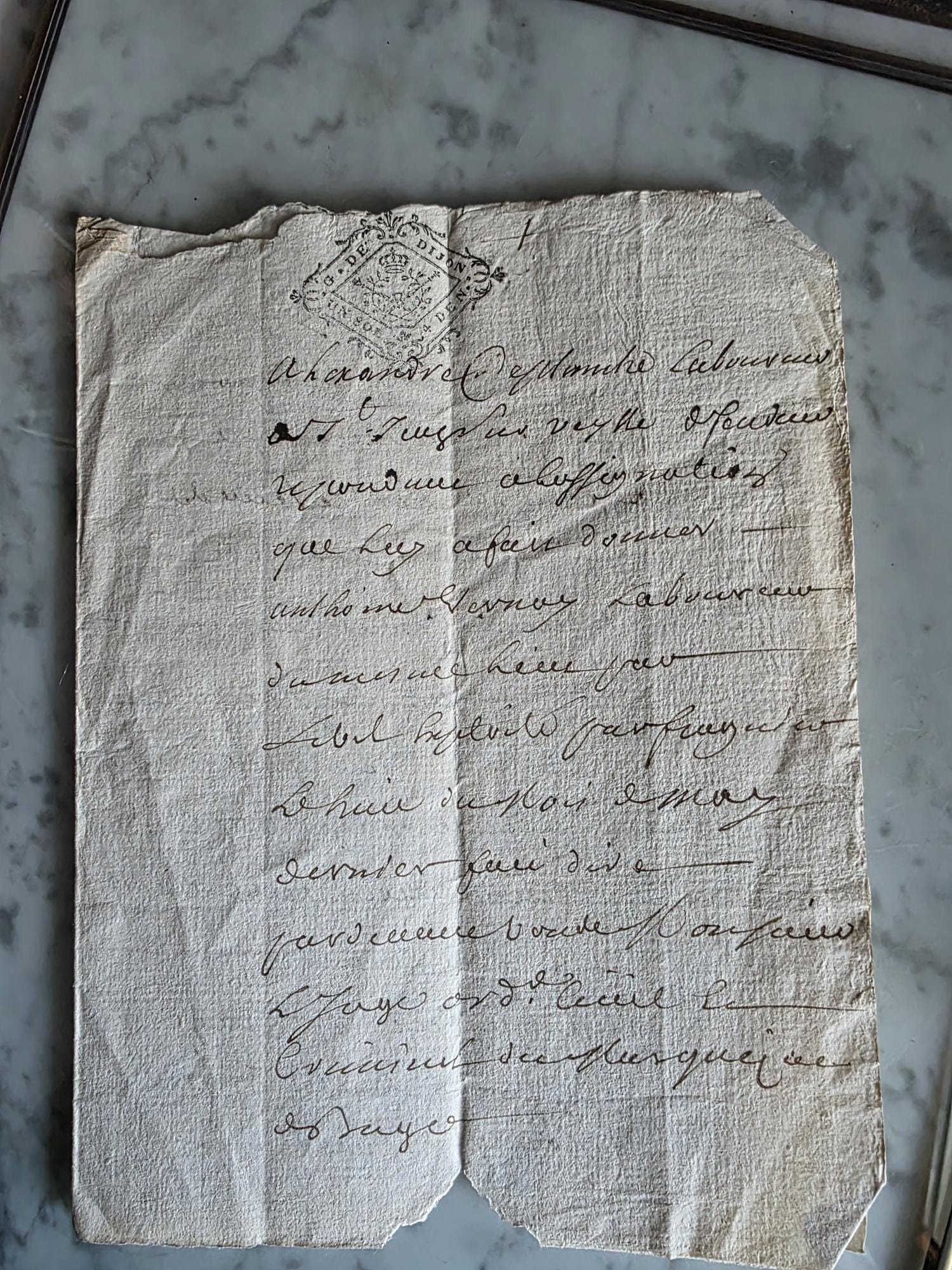 This authentic 18th-century manuscript is a window into the French justice system under King Louis XV. Dated June 13, 1730, the document is a formal legal pleading (Plaids) originating from the Marquisate of Bâgé in the historic Bresse region. The text serves as a written defense for one Alexandre Deplanche, who was responding to a summons brought against him by a laborer named Anthoine Vernay. Of particular note is the crisp, diamond-shaped royal tax stamp at the top left, marked "G. De Dijon," indicating the document was registered in the Généralité of Dijon tax district. The handwriting is a fluid, expressive notary script, typical of the period, penned on textured laid paper that has survived nearly three centuries.