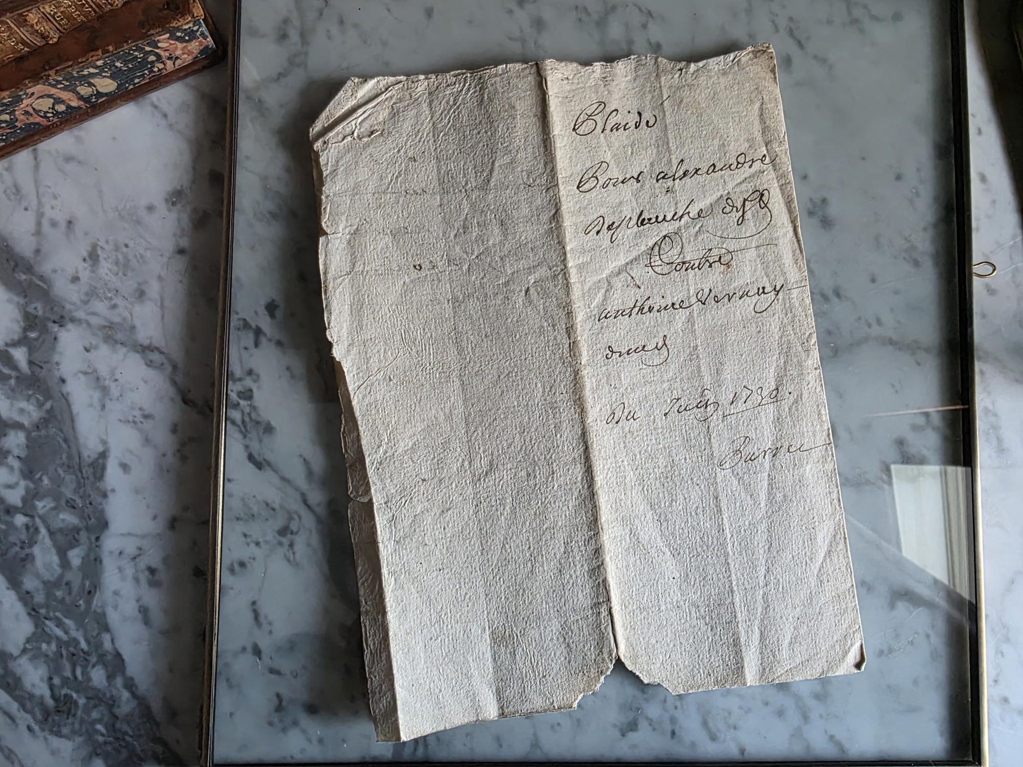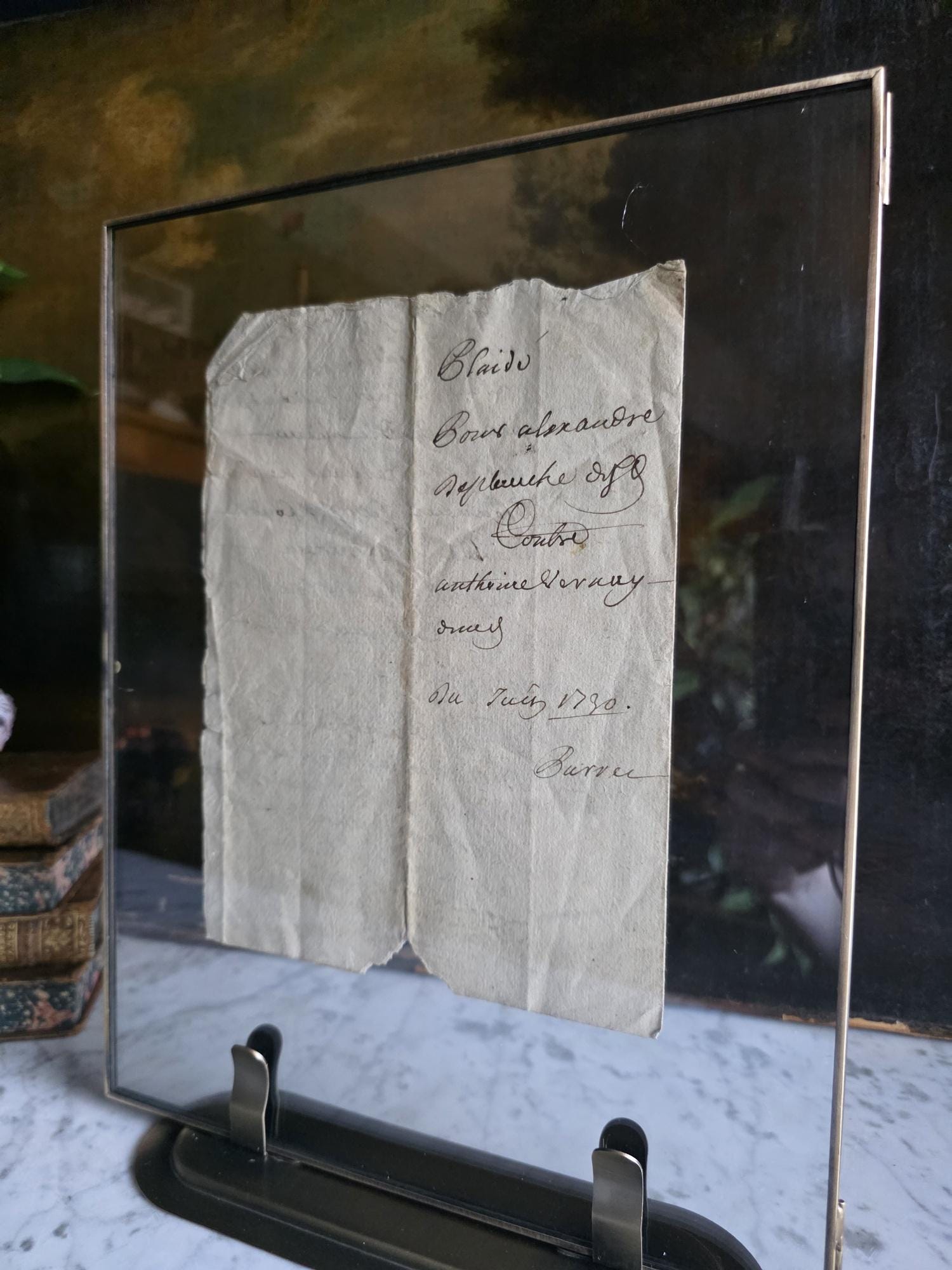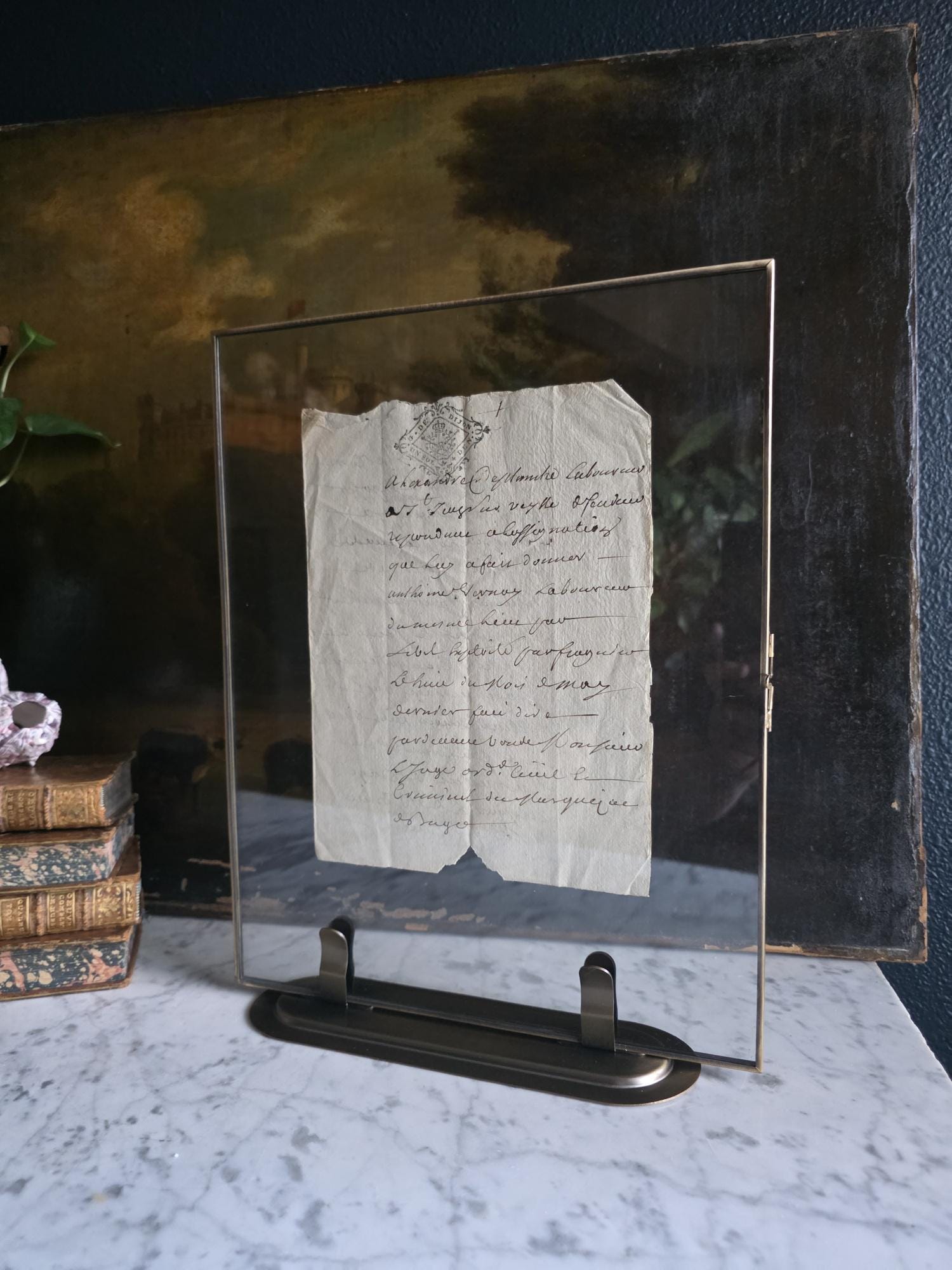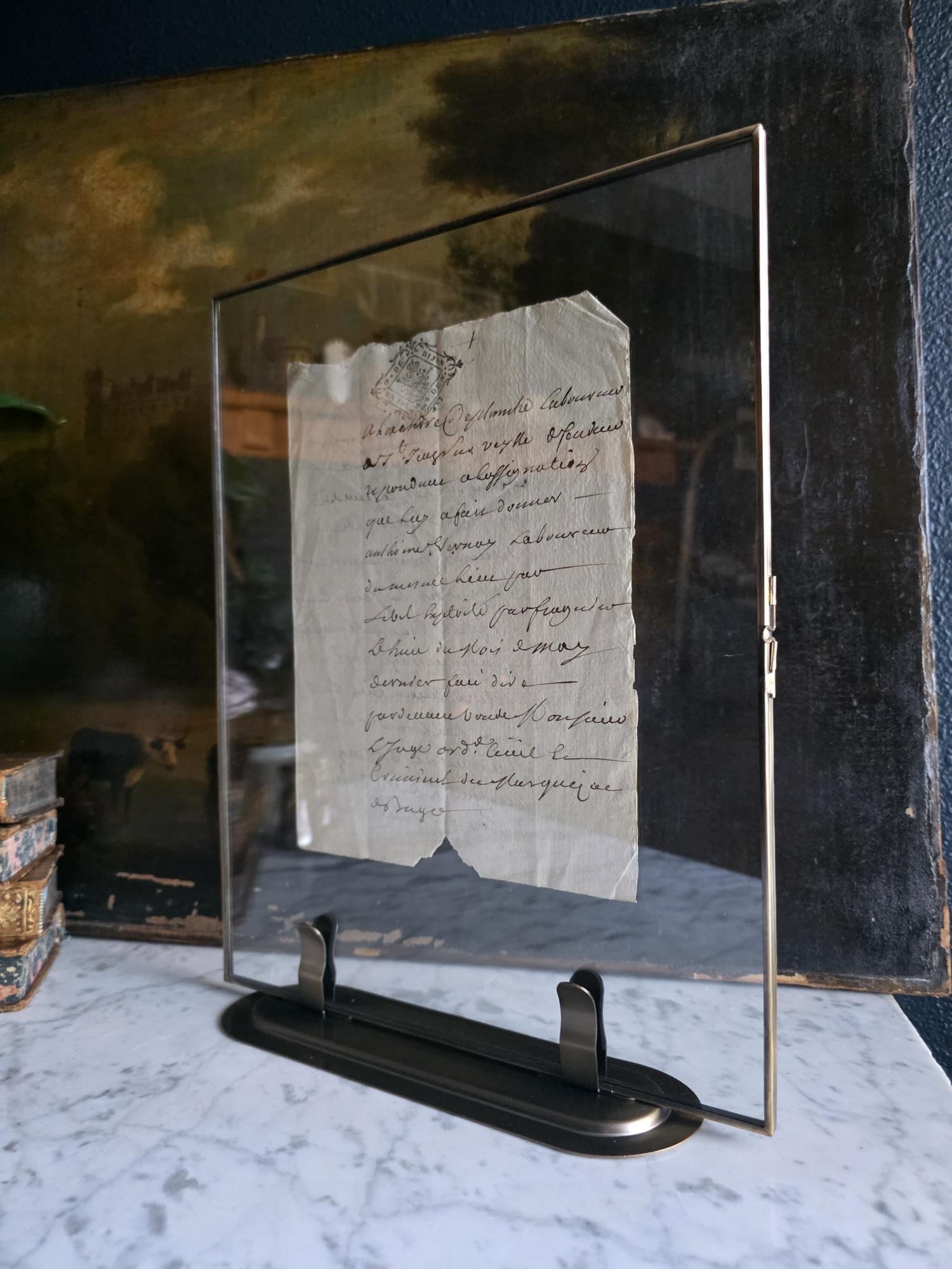 The manuscript is presented in a sleek, modern floating frame with a brass-toned metal stand. The double-glass construction allows for a complete view of the artifact, including the docketing notes and filing dates written on the reverse side. The frame is designed to be easily opened, giving the buyer the option to remove the document to feel the texture of the antique handmade paper or to examine the 300-year-old ink up close. This is a unique decor piece that combines stark modern framing with the rich, tangible history of pre-revolutionary France.