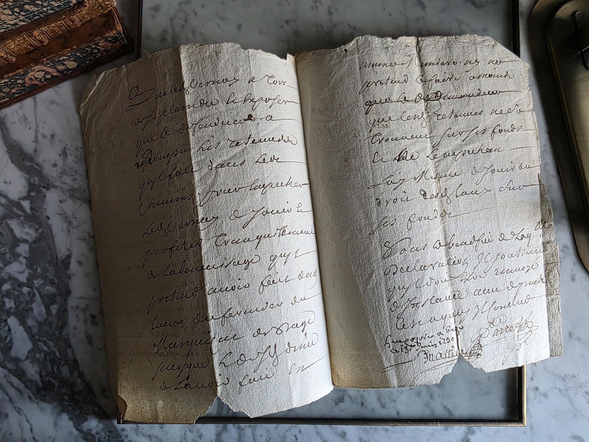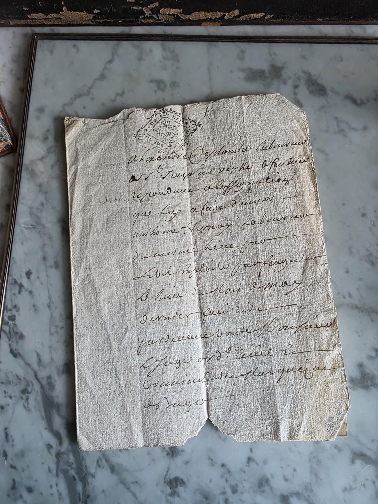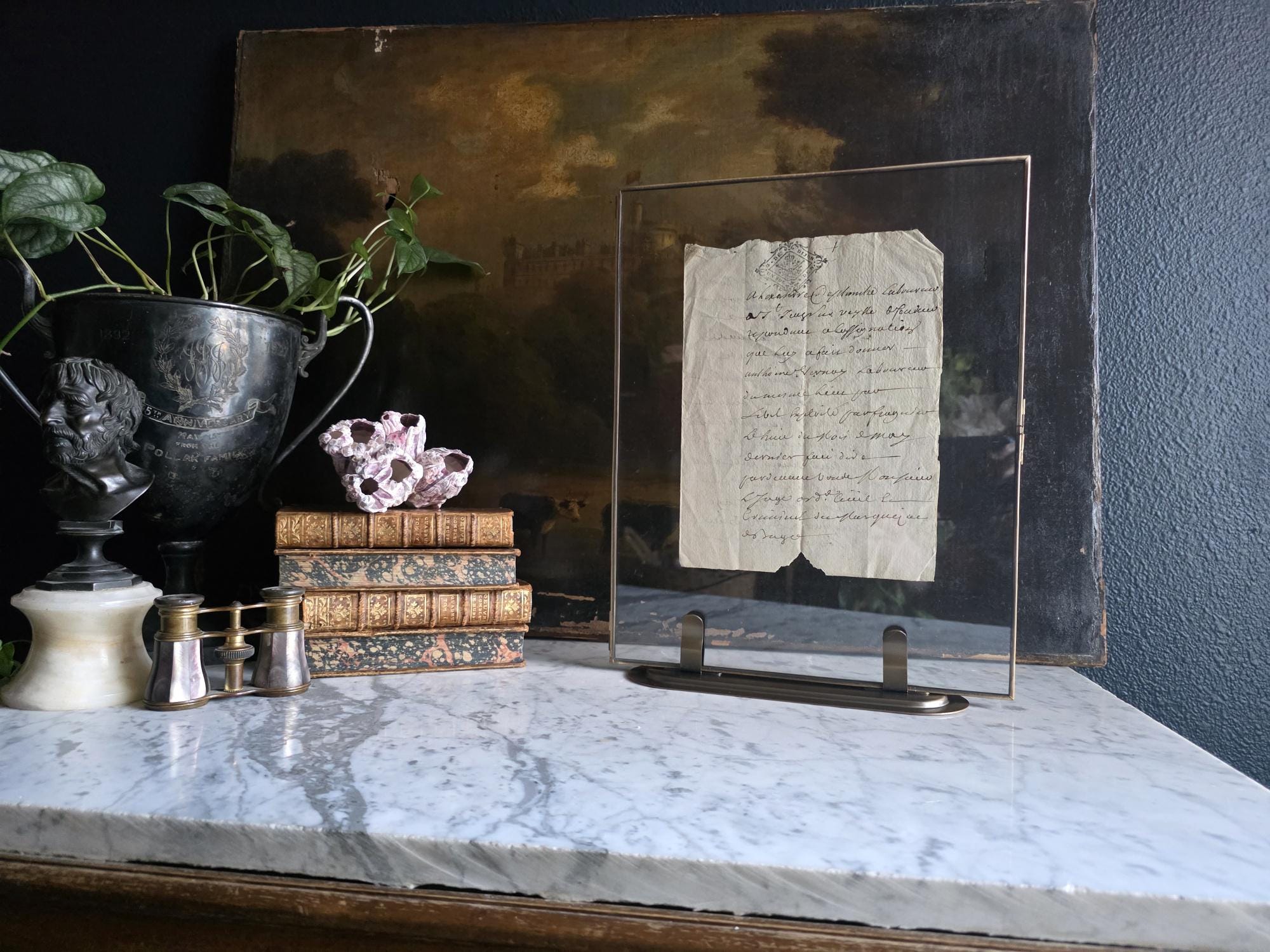 The manuscript is presented in a sleek, modern floating frame with a brass-toned metal stand. The double-glass construction allows for a complete view of the artifact, including the docketing notes and filing dates written on the reverse side. The frame is designed to be easily opened, giving the buyer the option to remove the document to feel the texture of the antique handmade paper or to examine the 300-year-old ink up close. This is a unique decor piece that combines stark modern framing with the rich, tangible history of pre-revolutionary France.