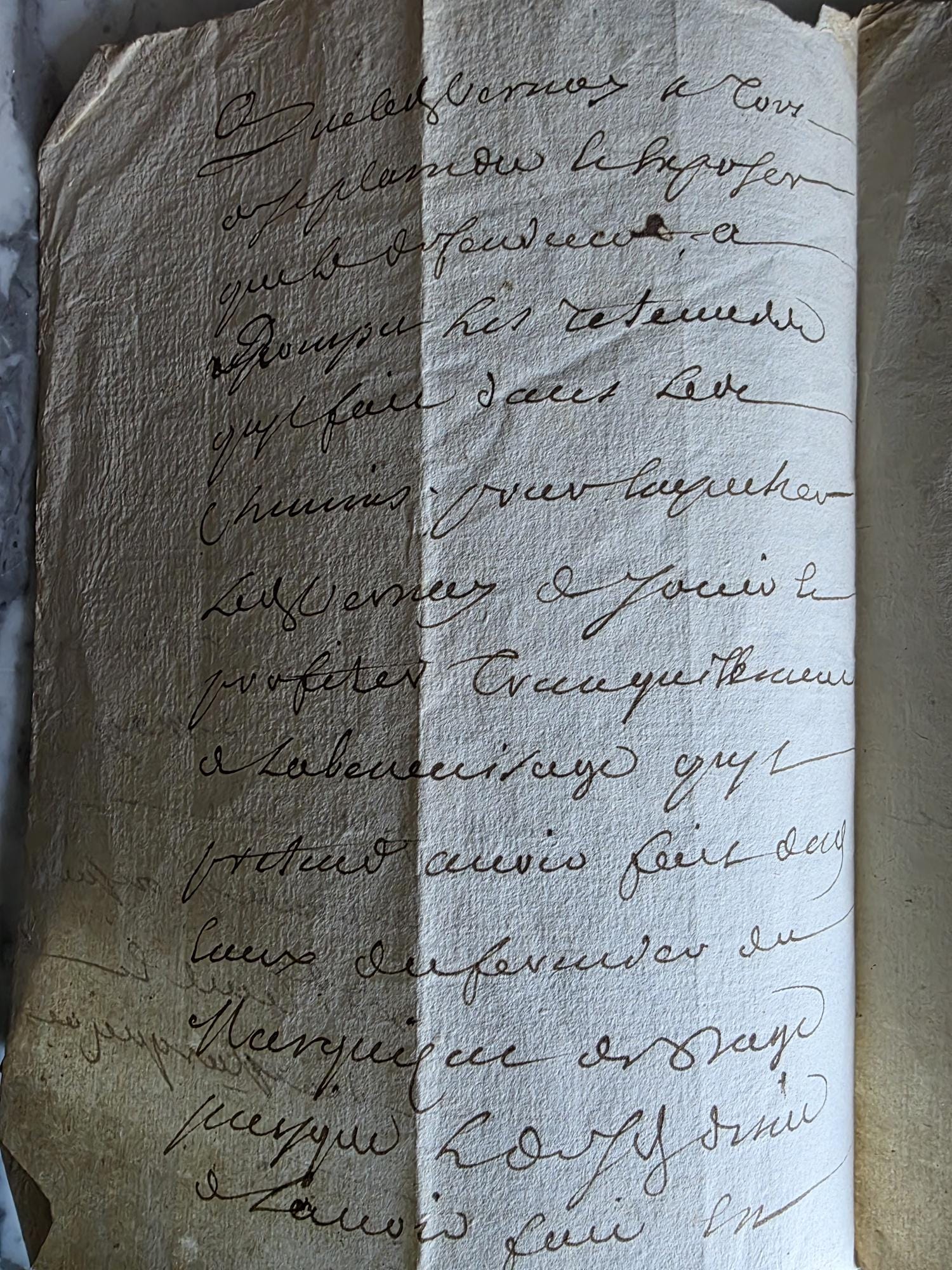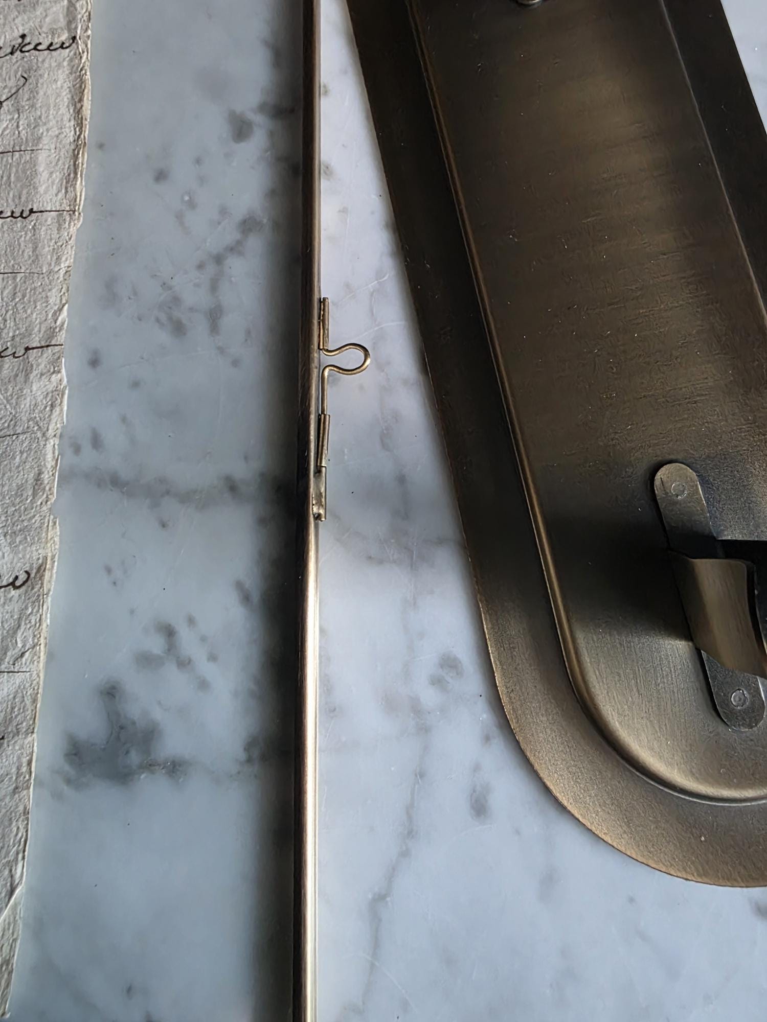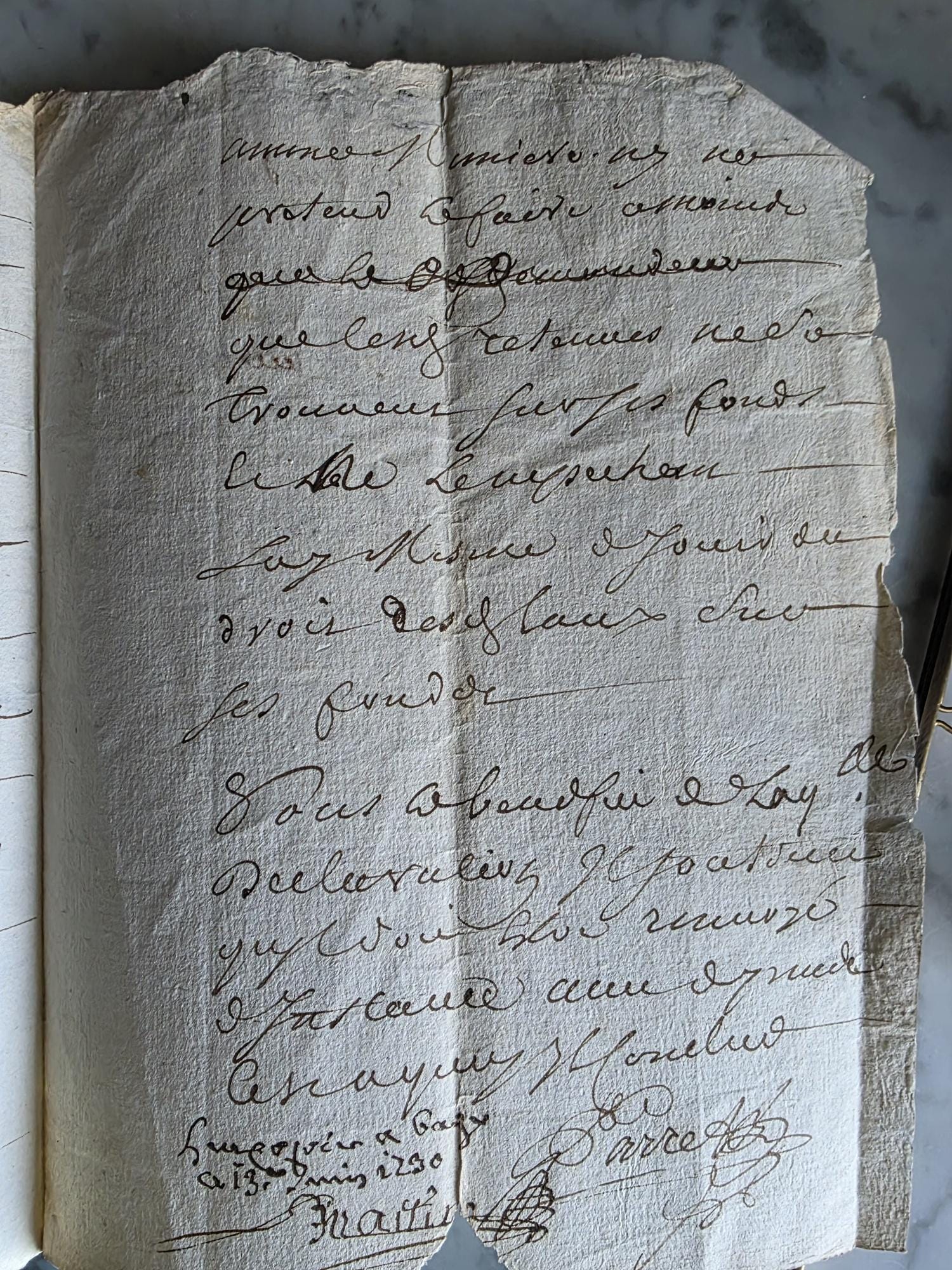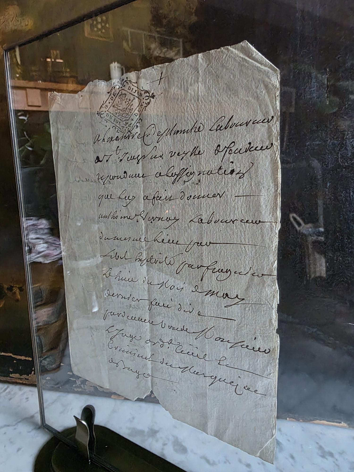 The manuscript is presented in a sleek, modern floating frame with a brass-toned metal stand. The double-glass construction allows for a complete view of the artifact, including the docketing notes and filing dates written on the reverse side. The frame is designed to be easily opened, giving the buyer the option to remove the document to feel the texture of the antique handmade paper or to examine the 300-year-old ink up close. This is a unique decor piece that combines stark modern framing with the rich, tangible history of pre-revolutionary France.