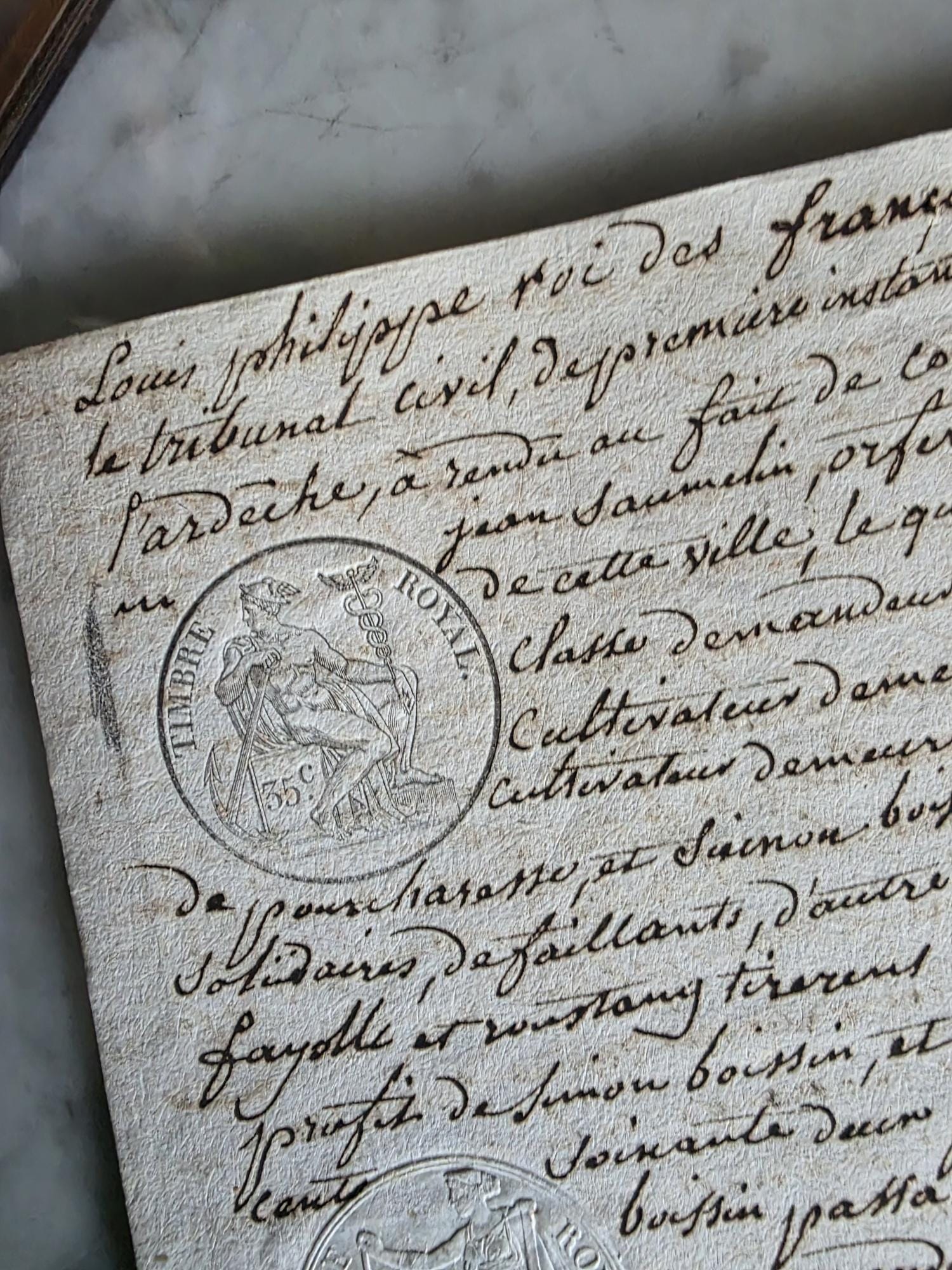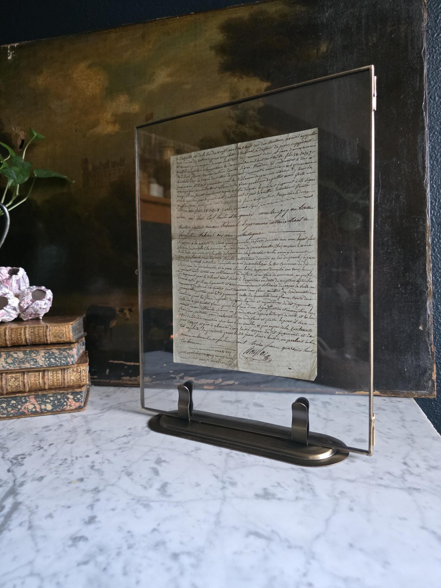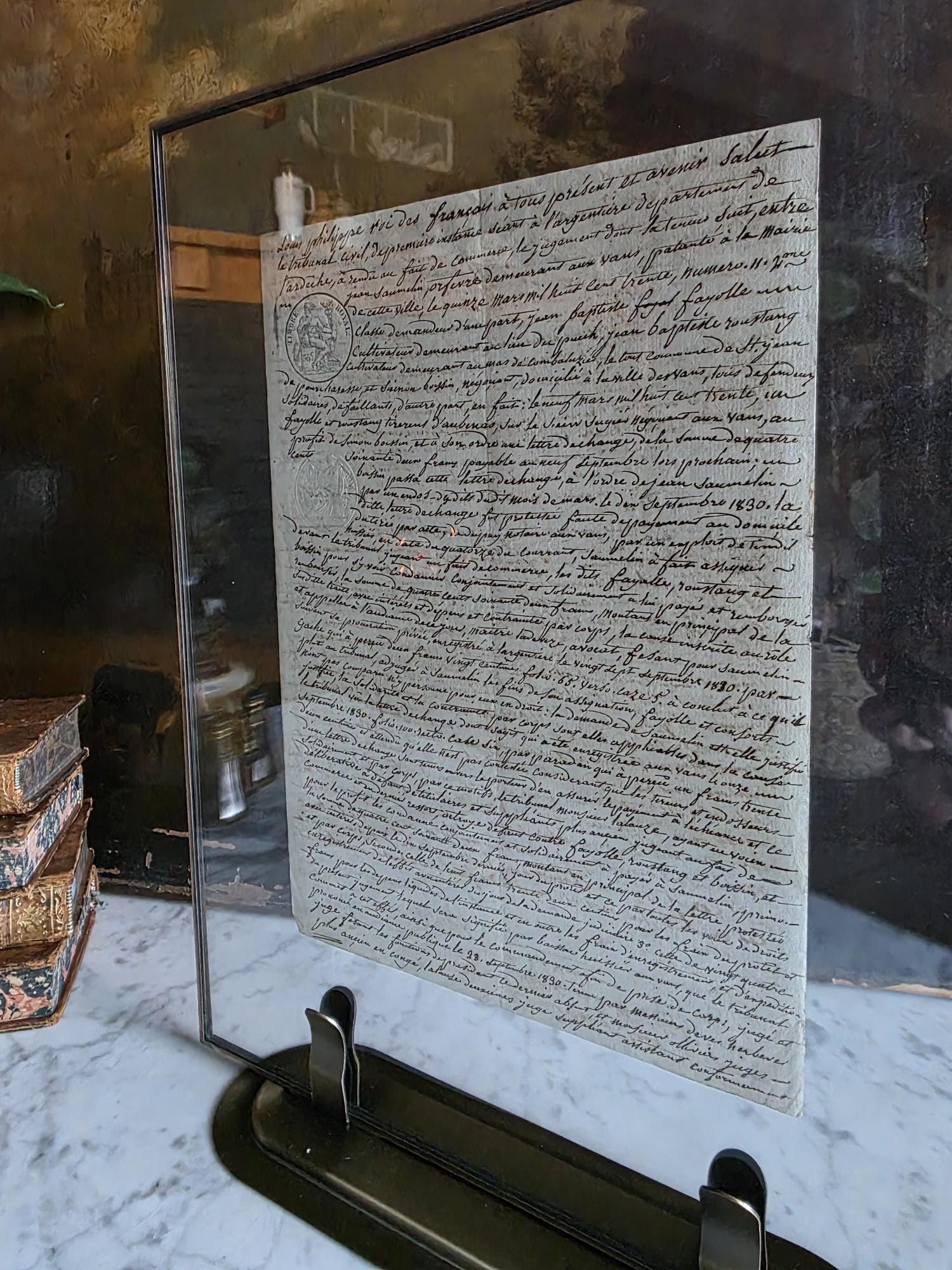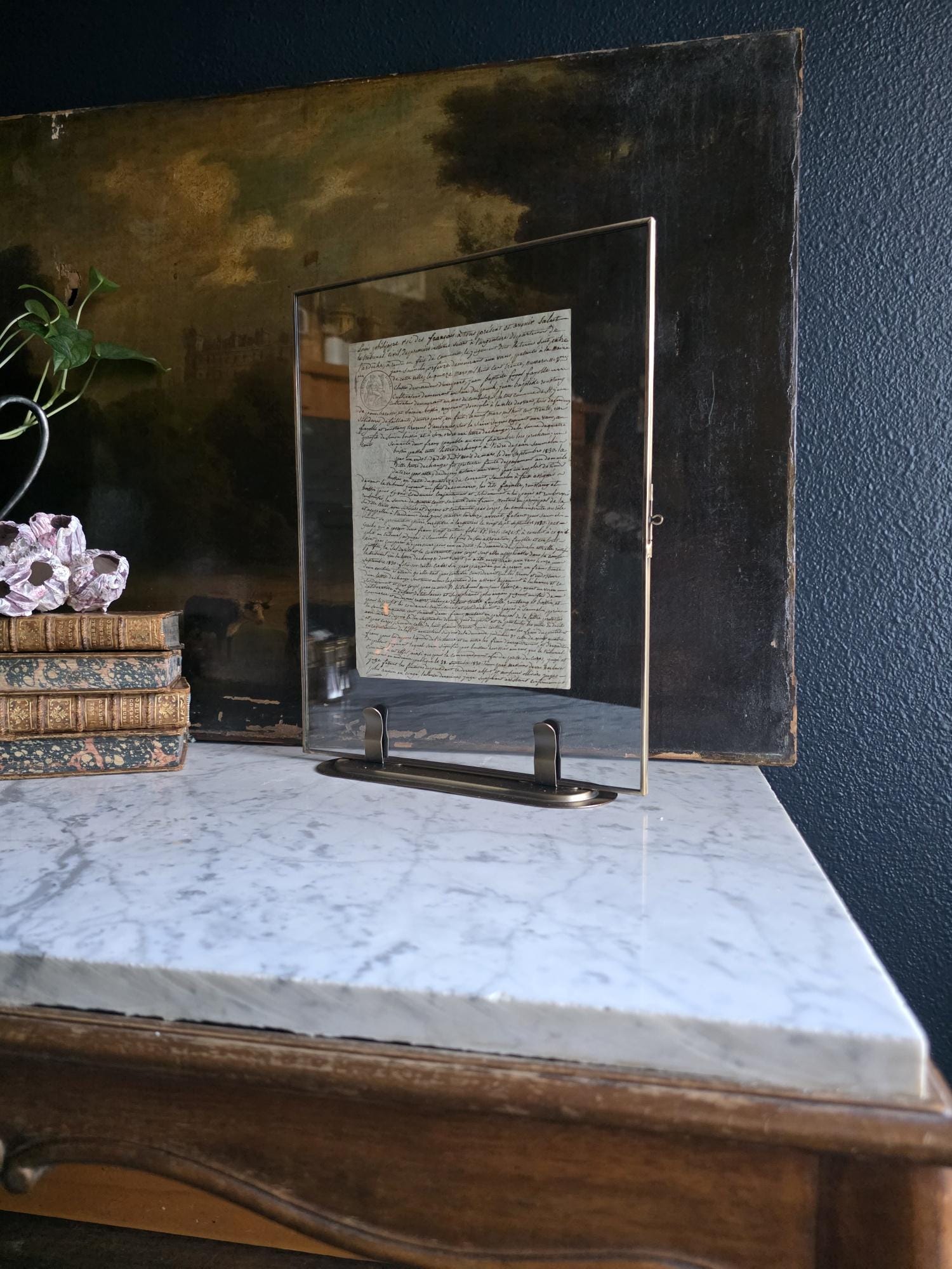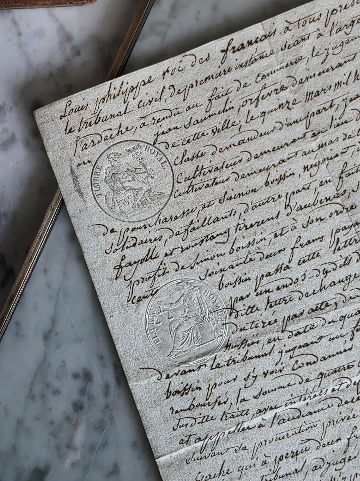 The document is notable for its two crisp "Timbre Royal" tax stamps on the left margin, featuring the allegorical figure of Justice, and its dense, legible 19th-century legal script. It is presented in a contemporary floating frame with a brass-toned metal stand, designed to let the viewer appreciate the full artifact. The double-glass construction suspends the paper, emphasizing its texture and the faint "chain lines" of the mold. The frame is easily opened, allowing the buyer to remove the manuscript for closer study or conservation. This is a fascinating piece of legal and financial history from the dawn of the "July Monarchy," perfectly preserved for display.