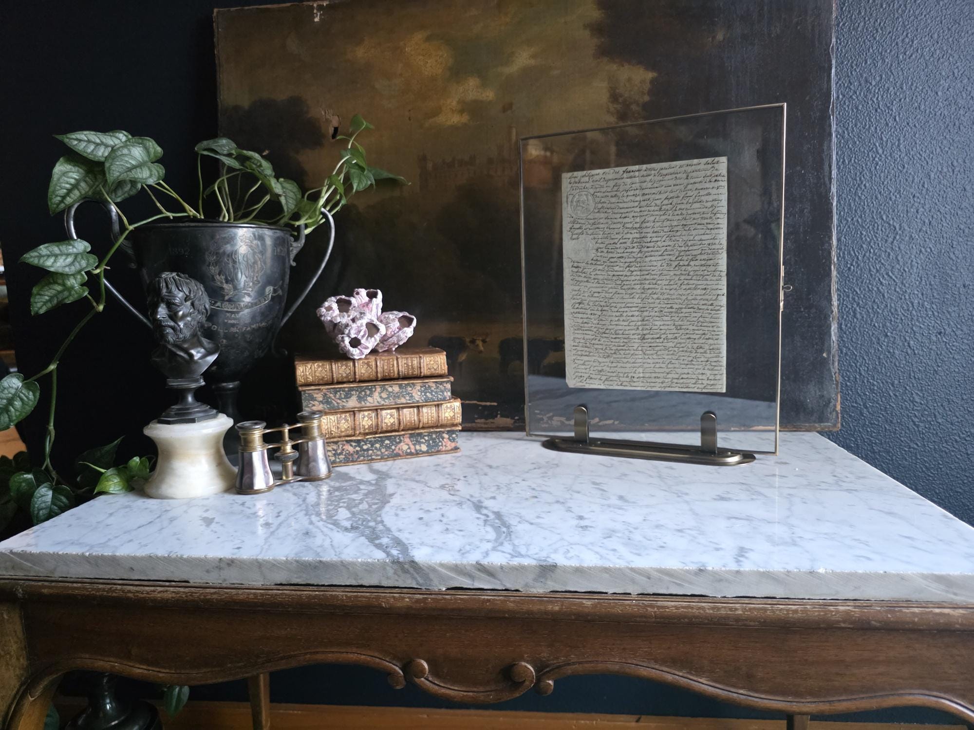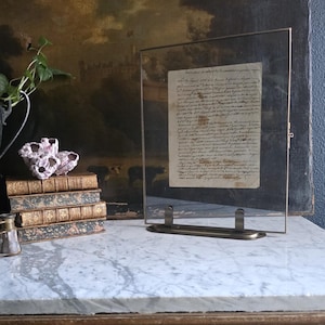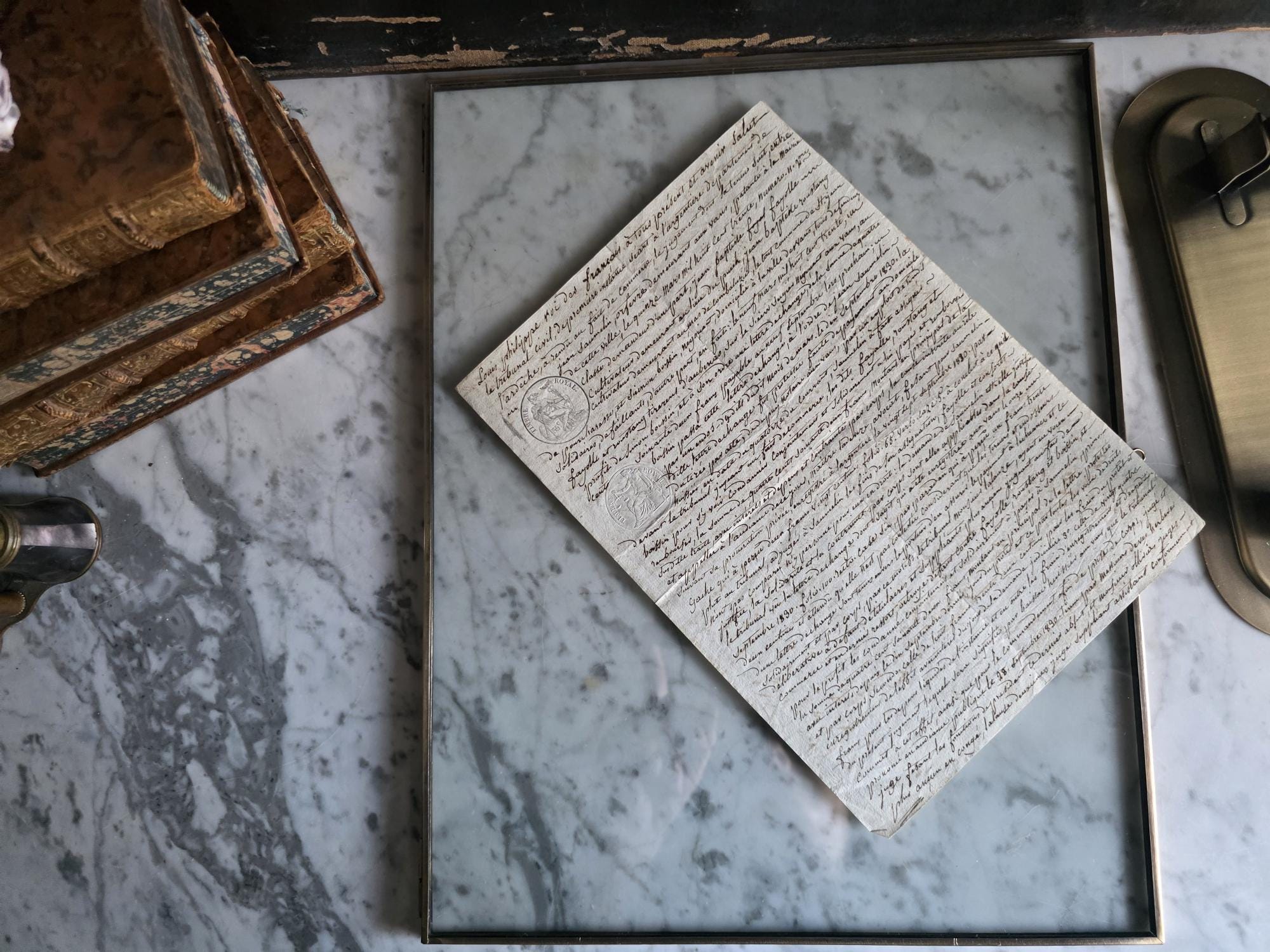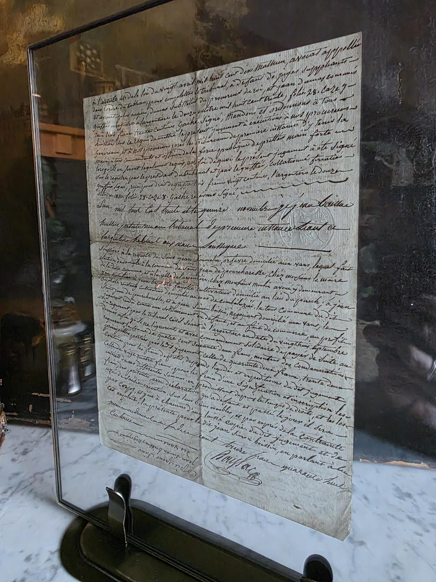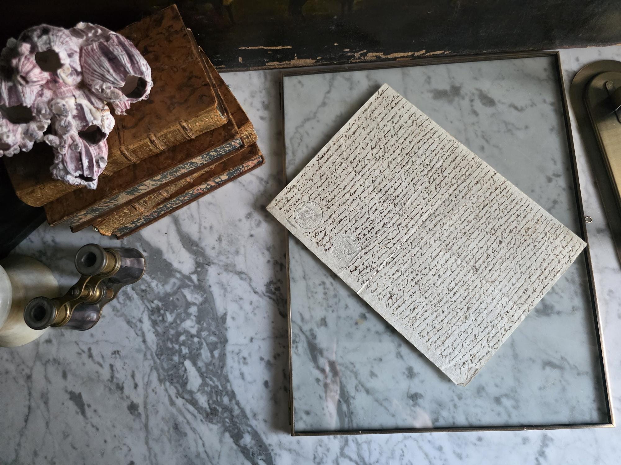 The document is notable for its two crisp "Timbre Royal" tax stamps on the left margin, featuring the allegorical figure of Justice, and its dense, legible 19th-century legal script. It is presented in a contemporary floating frame with a brass-toned metal stand, designed to let the viewer appreciate the full artifact. The double-glass construction suspends the paper, emphasizing its texture and the faint "chain lines" of the mold. The frame is easily opened, allowing the buyer to remove the manuscript for closer study or conservation. This is a fascinating piece of legal and financial history from the dawn of the "July Monarchy," perfectly preserved for display.