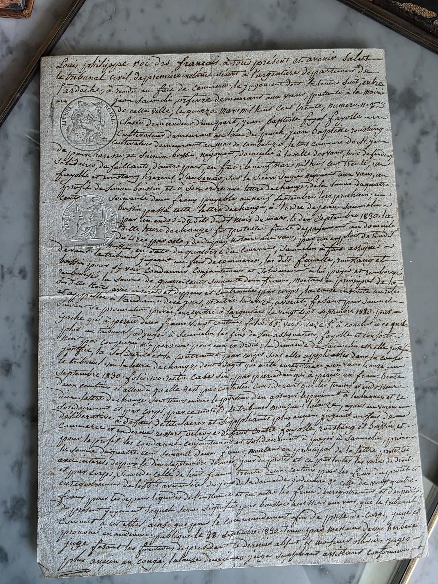 This impressive antique manuscript is a formal court judgment (Jugement) dated September 28, 1830, originating from the Civil Court of L'Argentière in the Ardèche region of southern France. Issued just months after the July Revolution, the document opens with the distinctive royal header of the new constitutional monarchy: "Louis Philippe, Roi des Français" (Louis Philippe, King of the French). The text details a commercial lawsuit brought by a goldsmith named Jean Saumelin against three local residents—Fayolle, Roustang, and Boissin—regarding an unpaid "Bill of Exchange" of 472 francs. The court's decision is severe, ordering the defendants to pay the debt "jointly and severally" under threat of "bodily constraint" (debtors' prison).