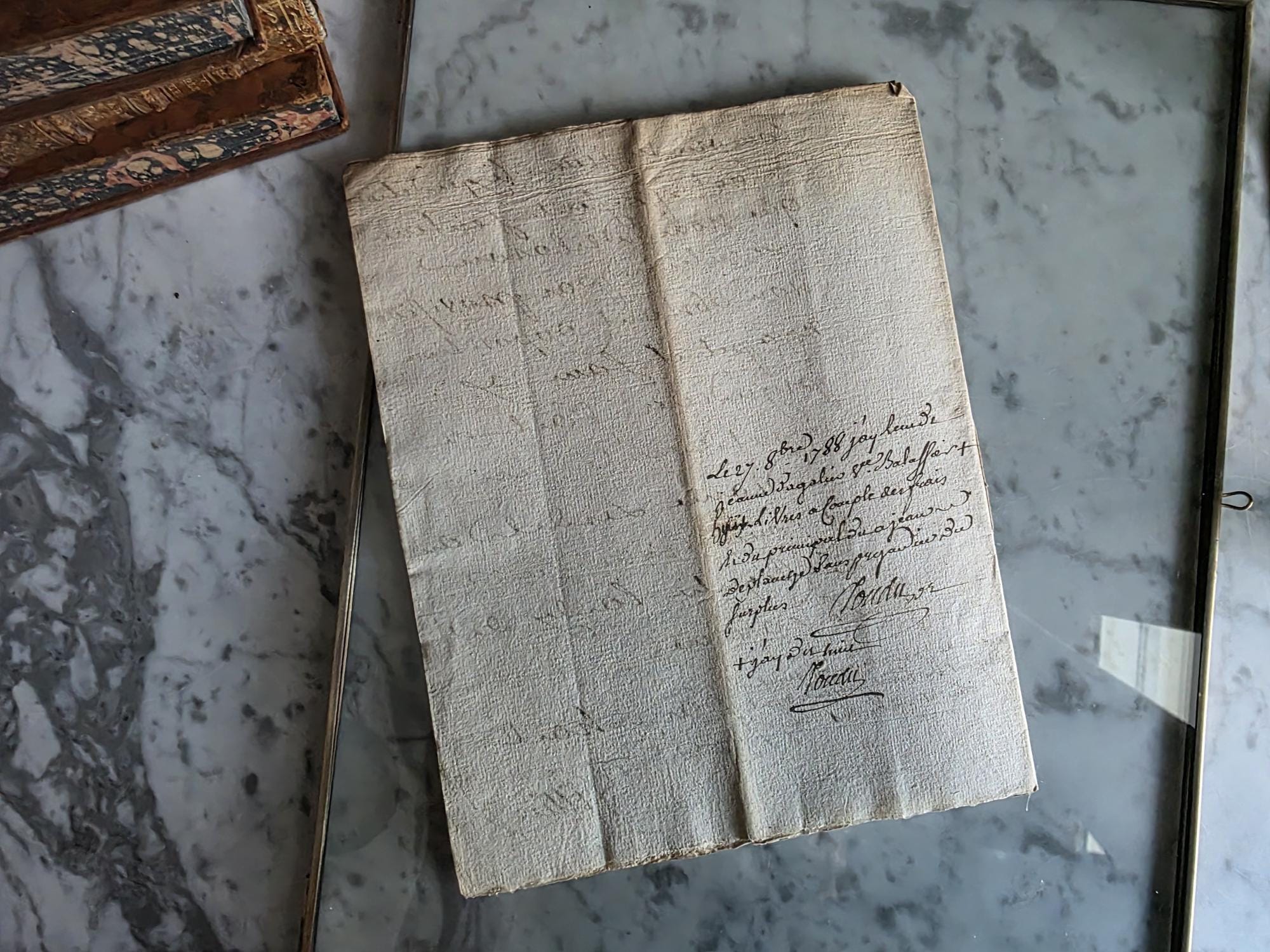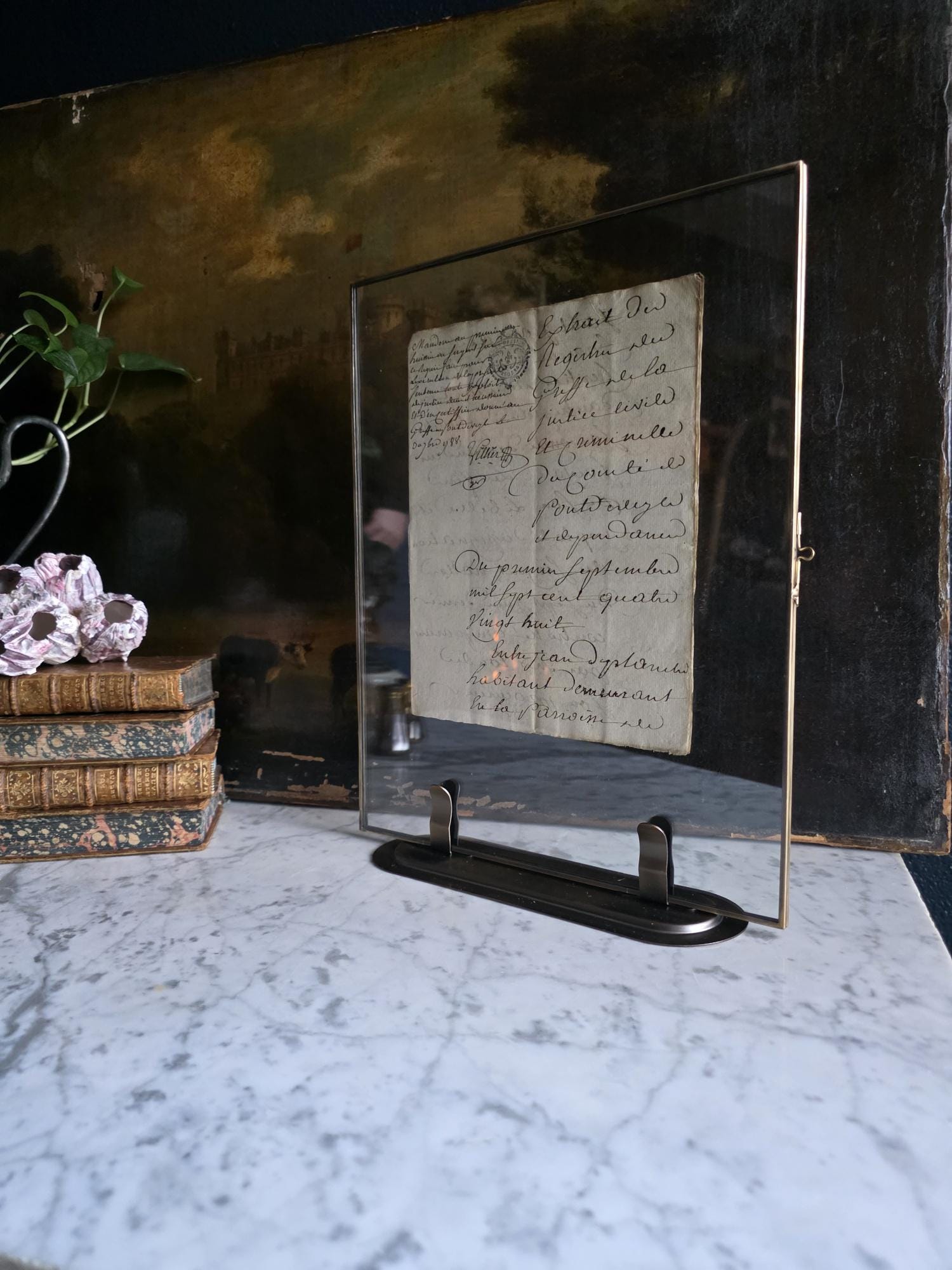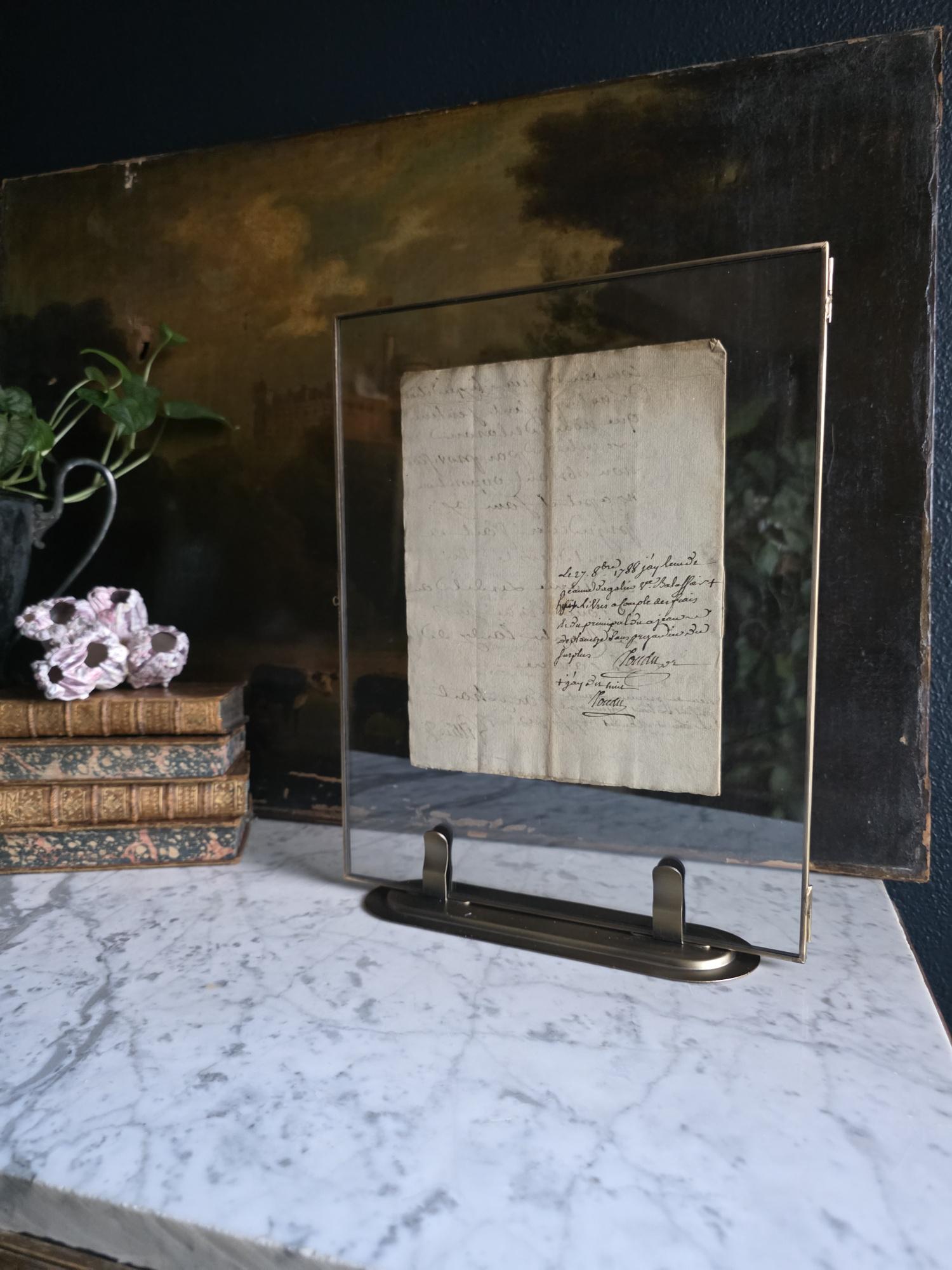 The document is penned on a folded booklet of high-quality, handmade laid paper with deckled edges. It features a crisp, circular royal tax stamp from the "Généralité de Bourg" at the header, a highly collectible philatelic marking. The manuscript is presented in a modern, minimal floating frame with a brass-toned metal stand. The double-glass design suspends the artifact, allowing you to view both the calligraphy on the front and the fascinating accounting notes on the back. The frame is designed to be easily opened, giving you the option to remove the document to appreciate the texture of the 230-year-old paper. This is a rare and beautiful display piece for any lover of legal history or 18th-century French culture.