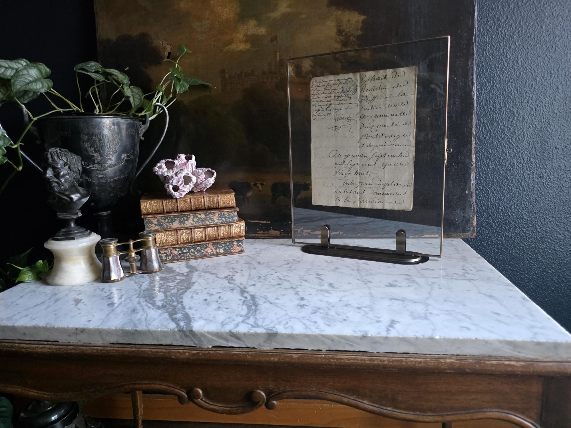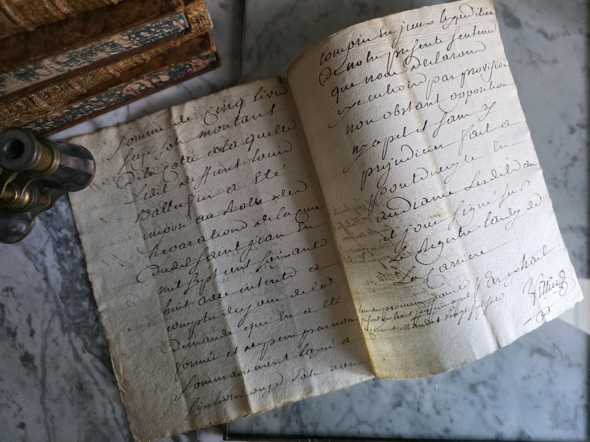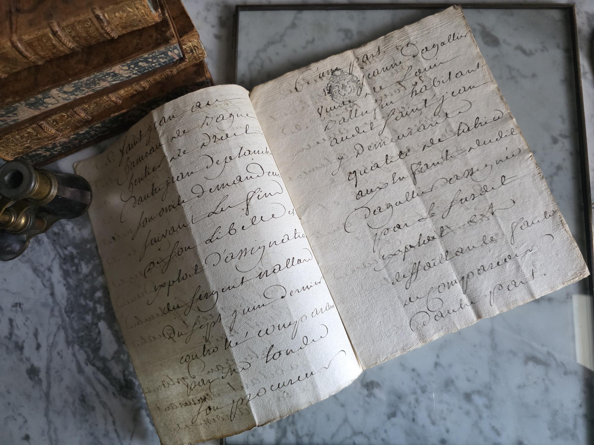 The document is penned on a folded booklet of high-quality, handmade laid paper with deckled edges. It features a crisp, circular royal tax stamp from the "Généralité de Bourg" at the header, a highly collectible philatelic marking. The manuscript is presented in a modern, minimal floating frame with a brass-toned metal stand. The double-glass design suspends the artifact, allowing you to view both the calligraphy on the front and the fascinating accounting notes on the back. The frame is designed to be easily opened, giving you the option to remove the document to appreciate the texture of the 230-year-old paper. This is a rare and beautiful display piece for any lover of legal history or 18th-century French culture.