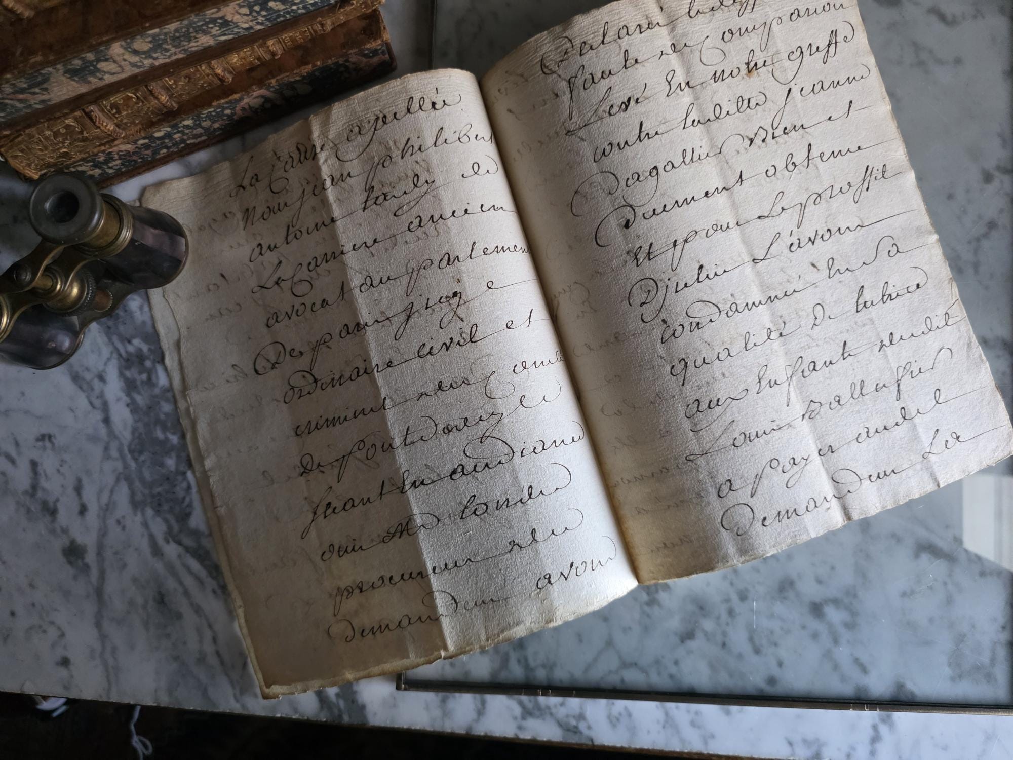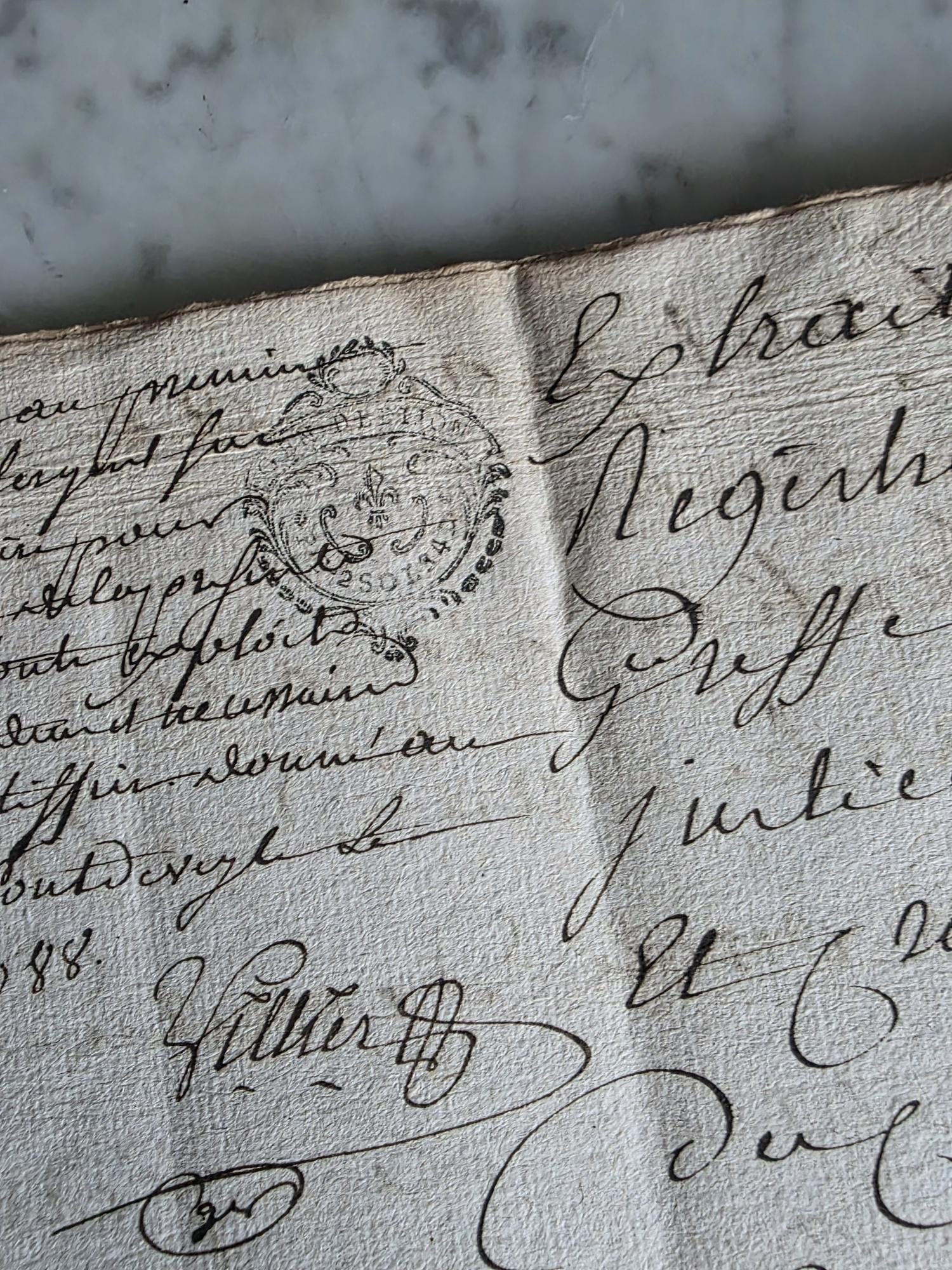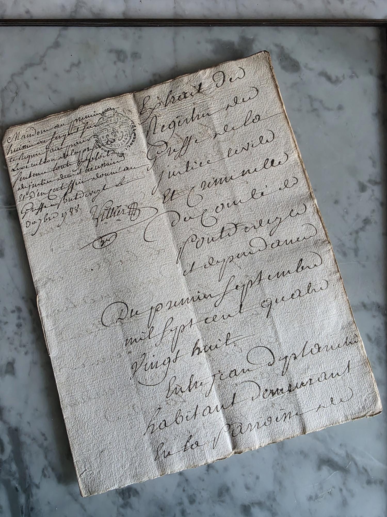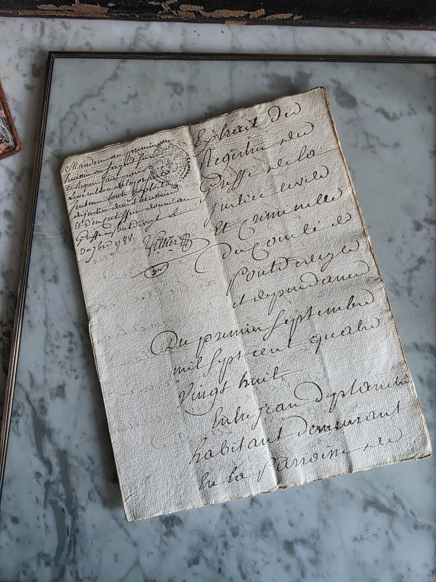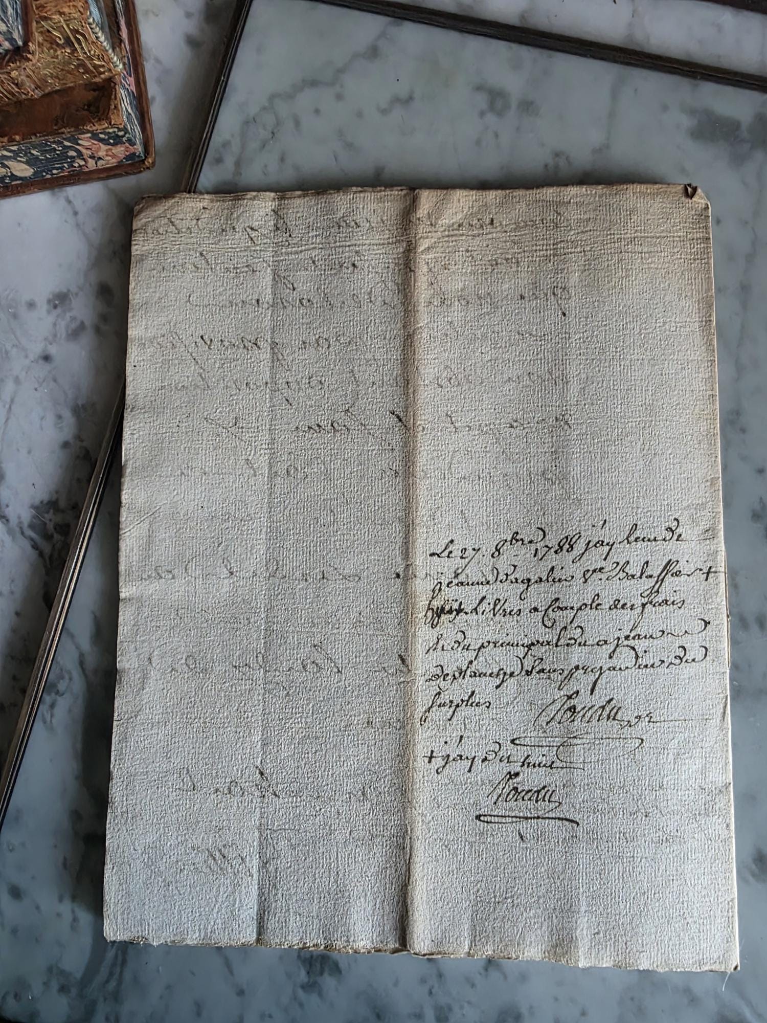 This exceptional antique document is a piece of living history from the final days of the Ancien Régime. Dated September 1, 1788, this formal court judgment originates from the Civil and Criminal Court of the County of Pont-de-Veyle (in the historic Bresse region). The manuscript details a lawsuit between Jean Deplanche and a widow named Jeanne Dagallier (Veuve Ballafier). Written just months before the outbreak of the French Revolution, the text records a default judgment against the widow for failing to appear in court. Of special interest is the handwritten receipt on the reverse side, dated October 27, 1788, documenting that the widow had begun paying "eight livres" toward the legal costs—a tangible connection to the everyday financial struggles of the era.