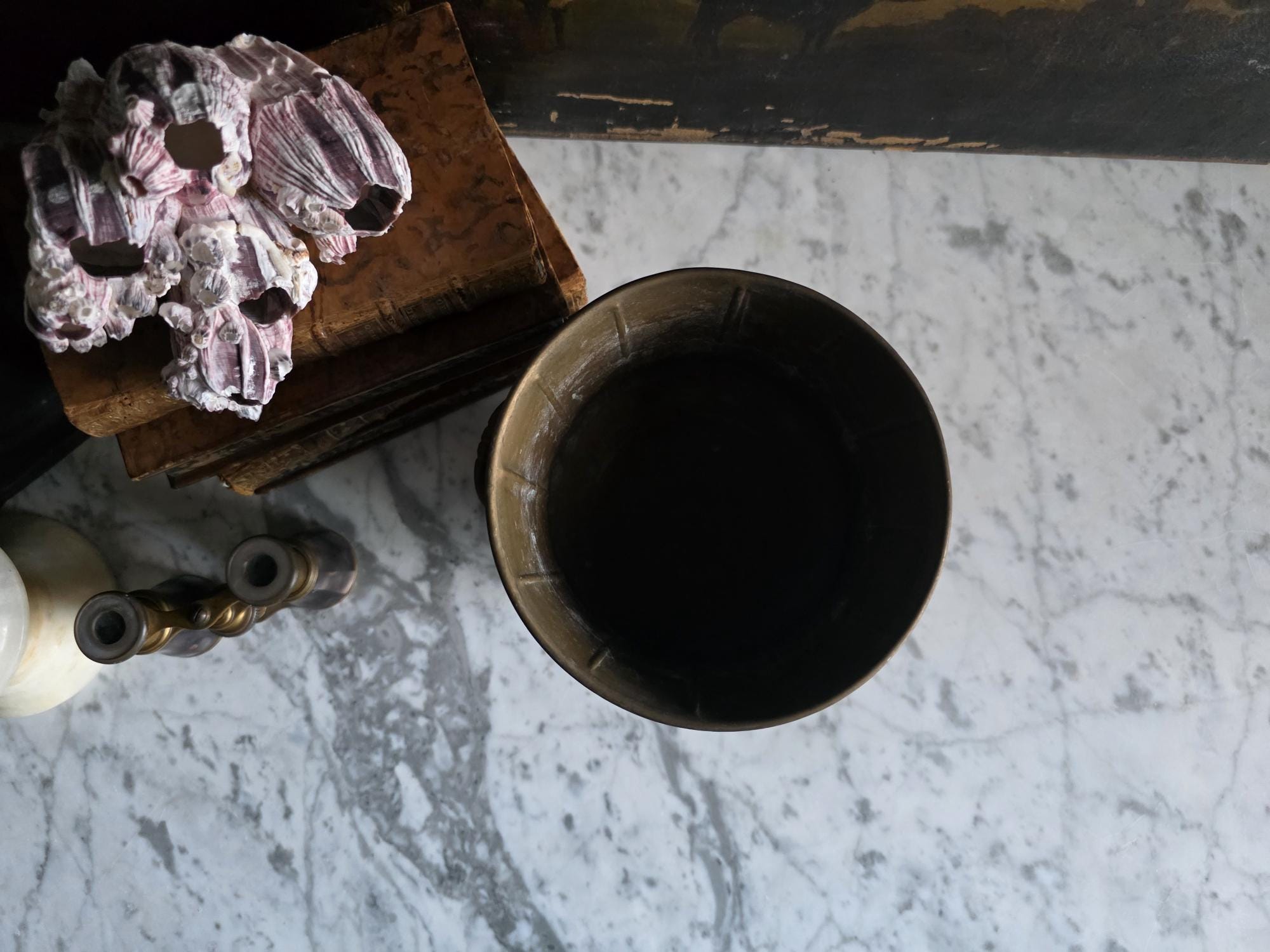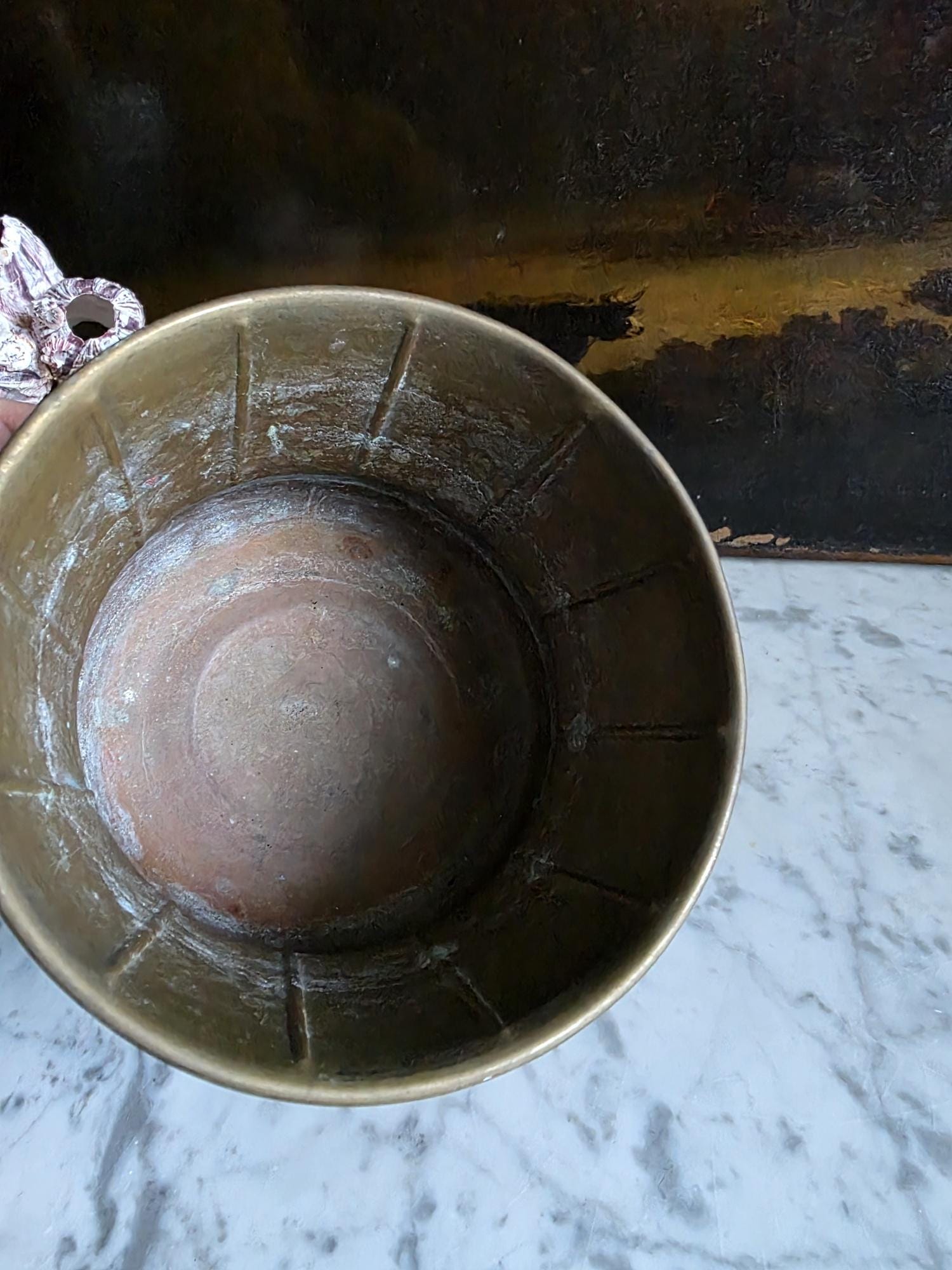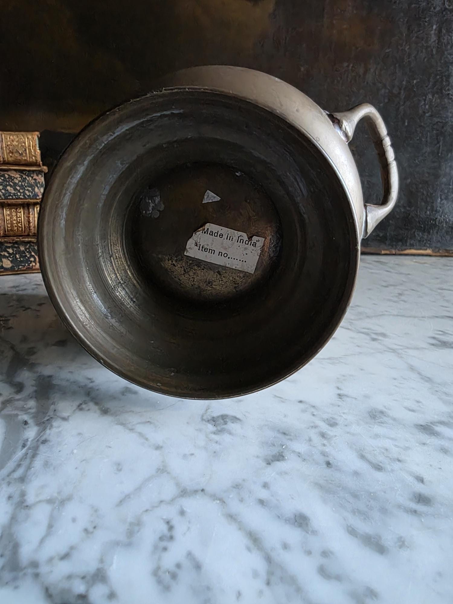 The planter is relatively small, making it an ideal size for a succulent, small fern, or as a catch-all bowl for a desk or entryway table. The interior shows signs of previous use with expected oxidation and mineral deposits, confirming its history as a functional vessel. A "Made in India" sticker is partially visible on the underside base. This piece would make a lovely addition to a vintage-inspired vignette, a bookshelf display, or as a standalone decorative accent.