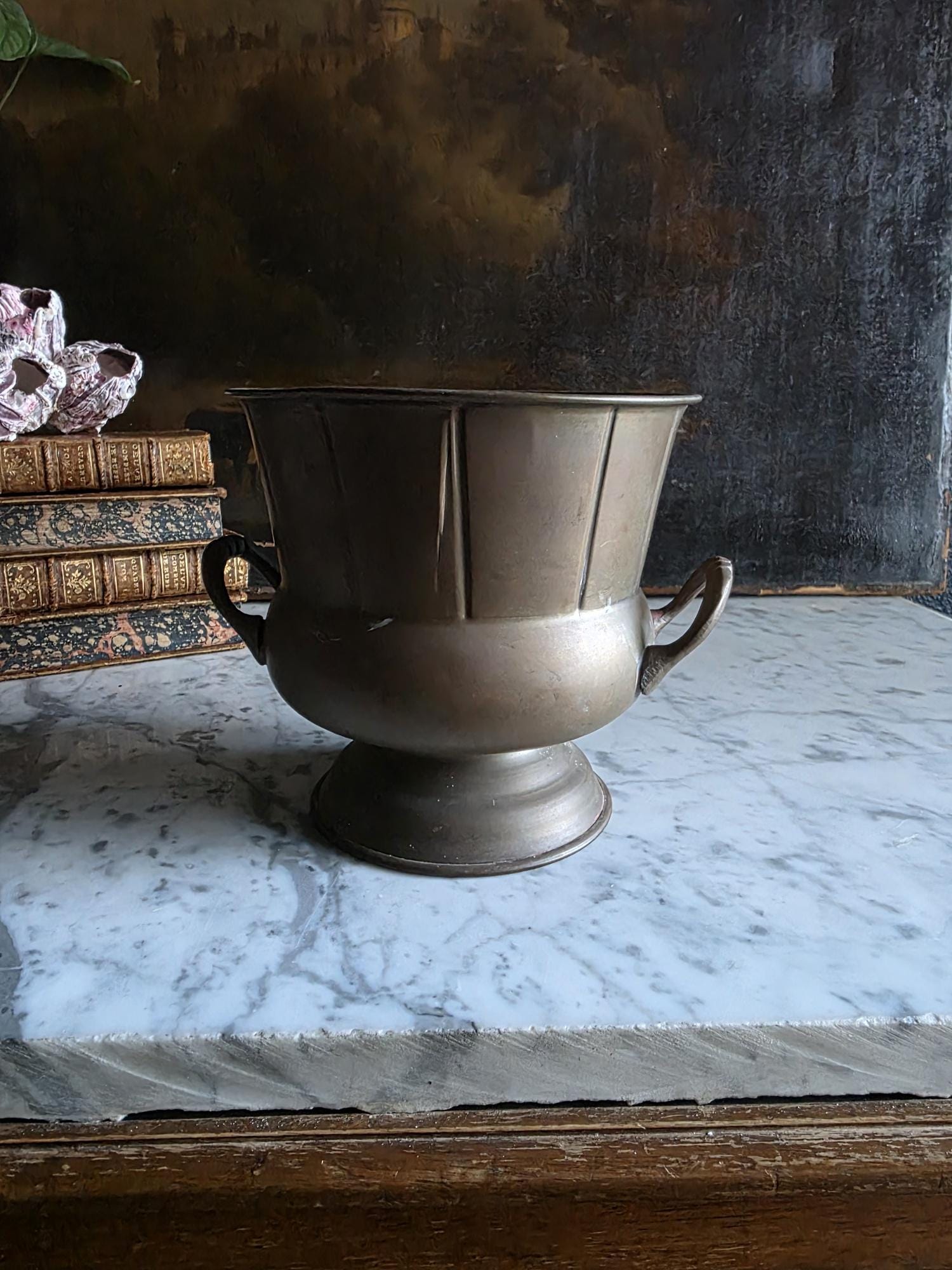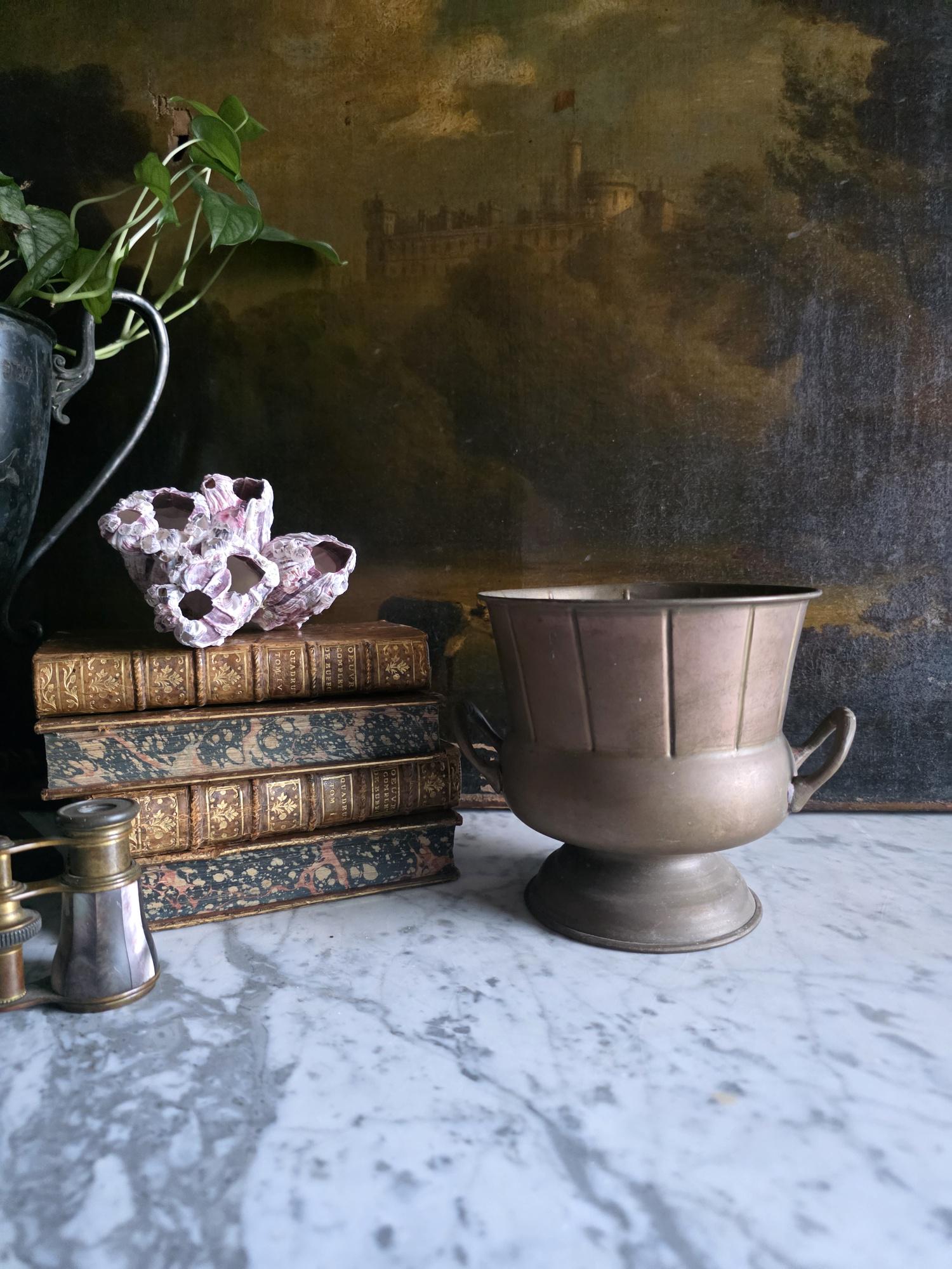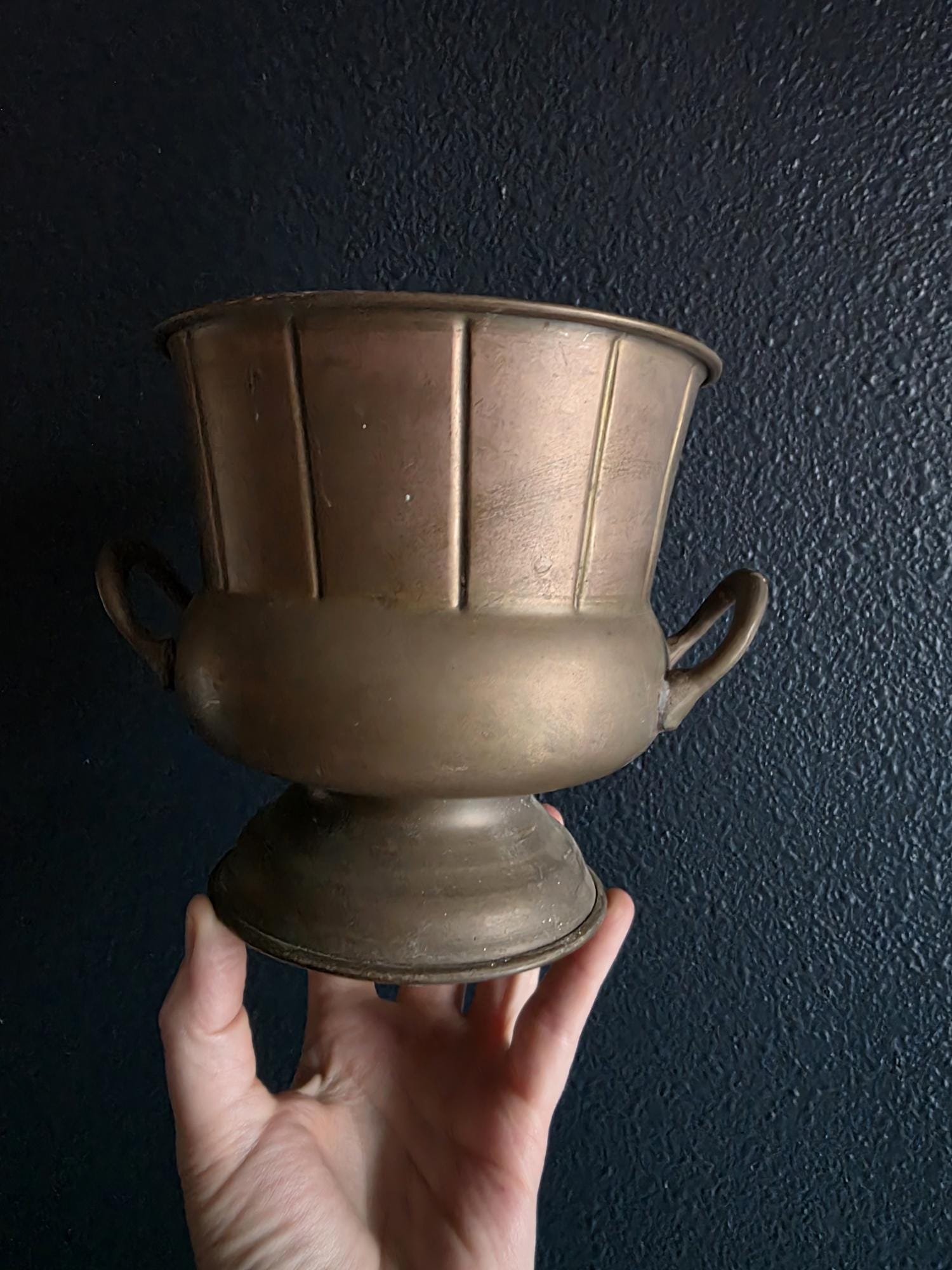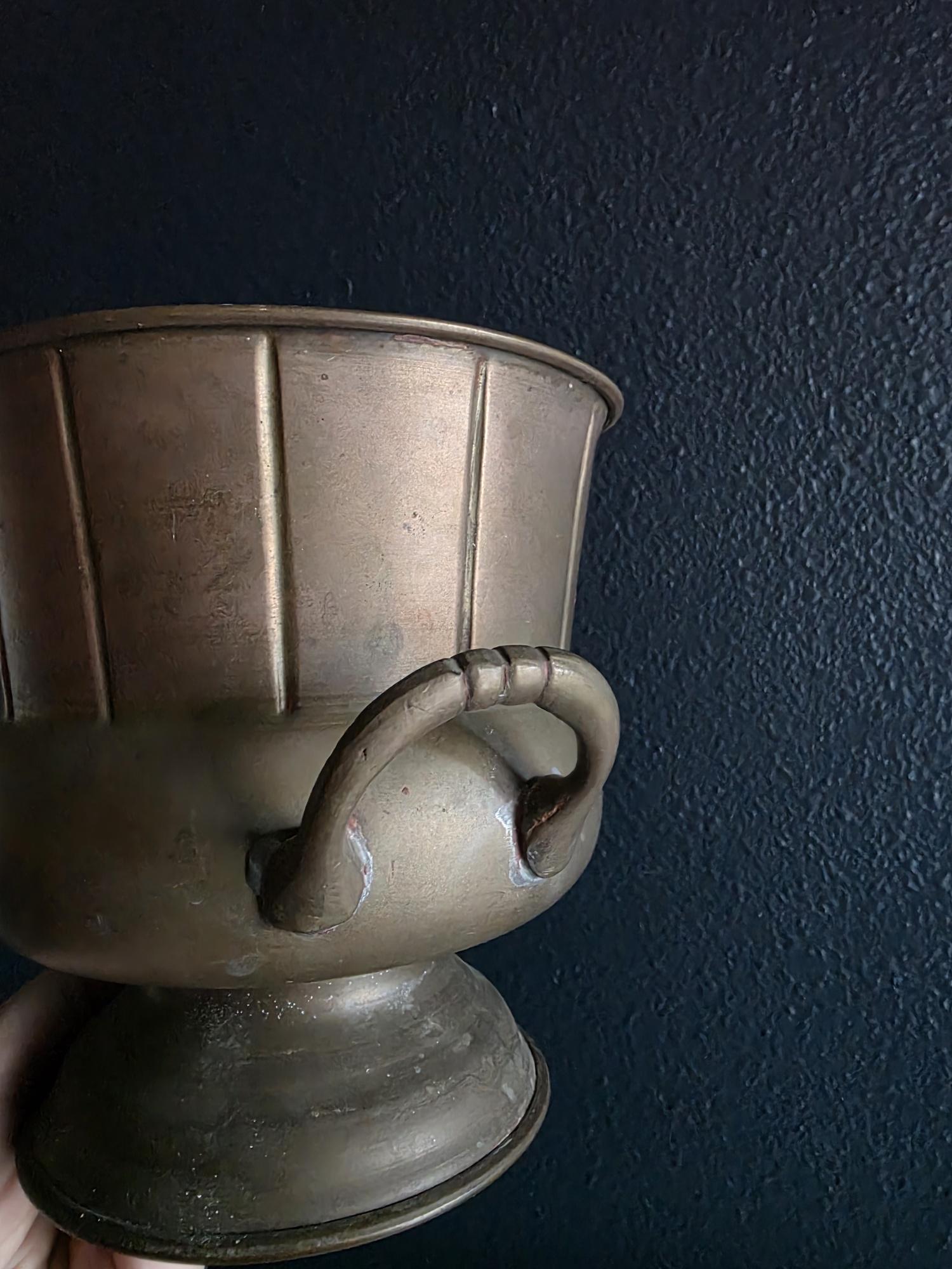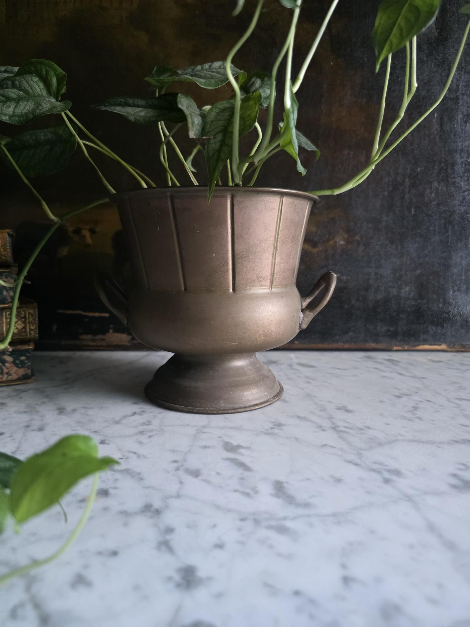 This charming vintage planter features a classic urn or trophy cup silhouette, crafted from metal with an aged brass-tone finish. The design includes a fluted upper body that transitions into a rounded lower bowl, resting on a sturdy pedestal foot. Two small, curved handles adorn the sides, adding to its traditional appeal. The surface displays a rich, authentic patina with varying tones of bronze and gold, along with signs of wear and oxidation consistent with age and use, giving it a distinctive rustic character.