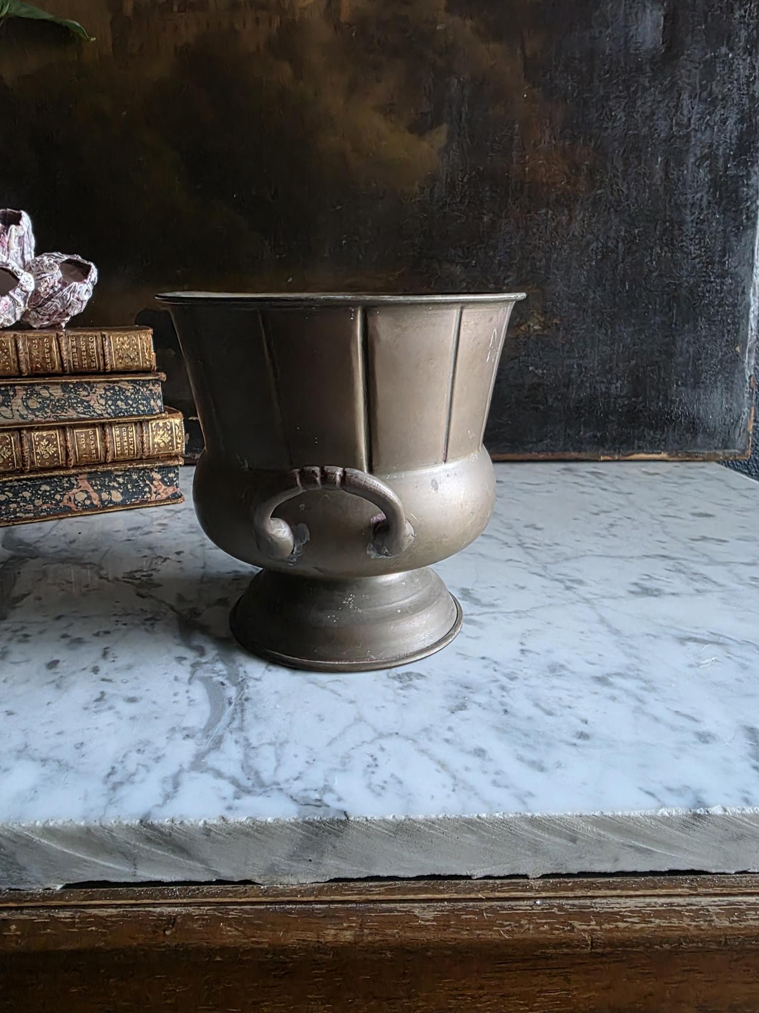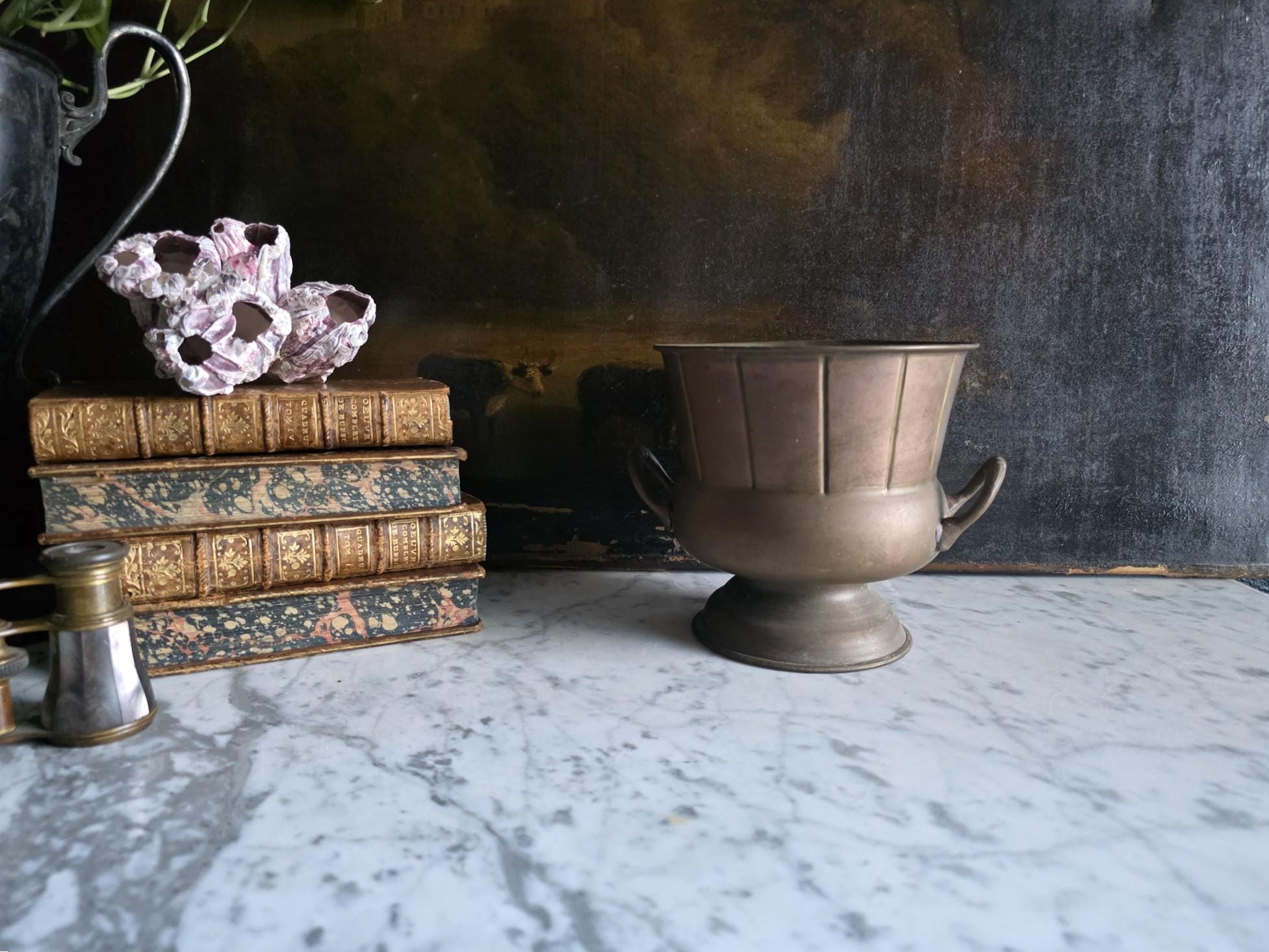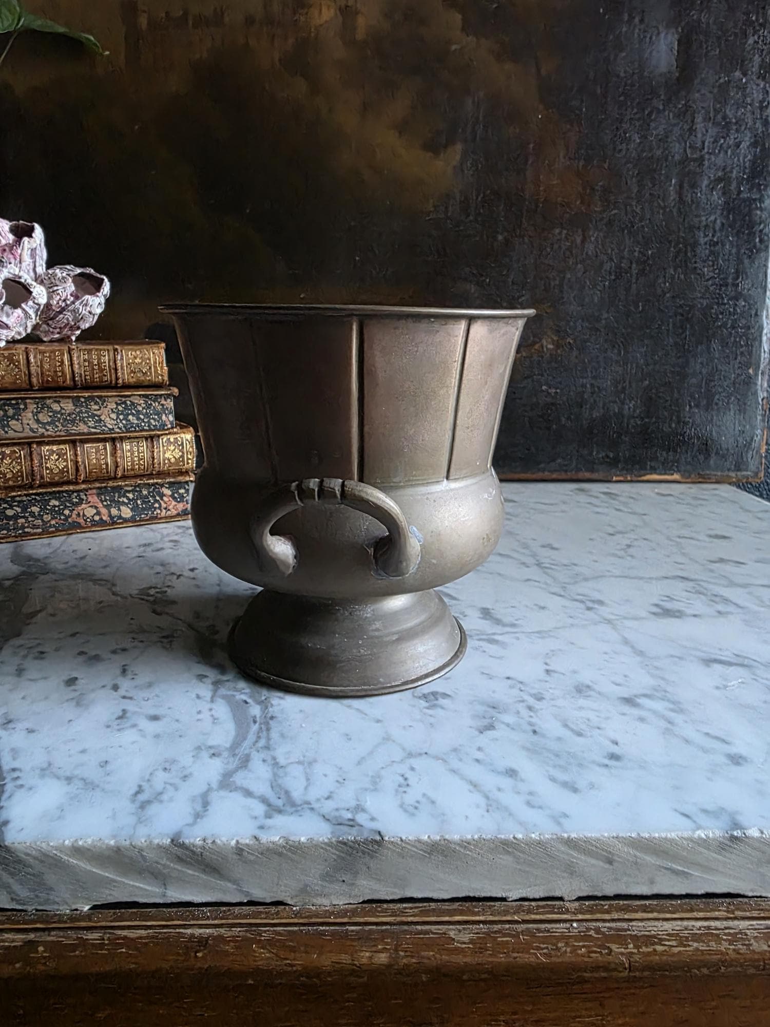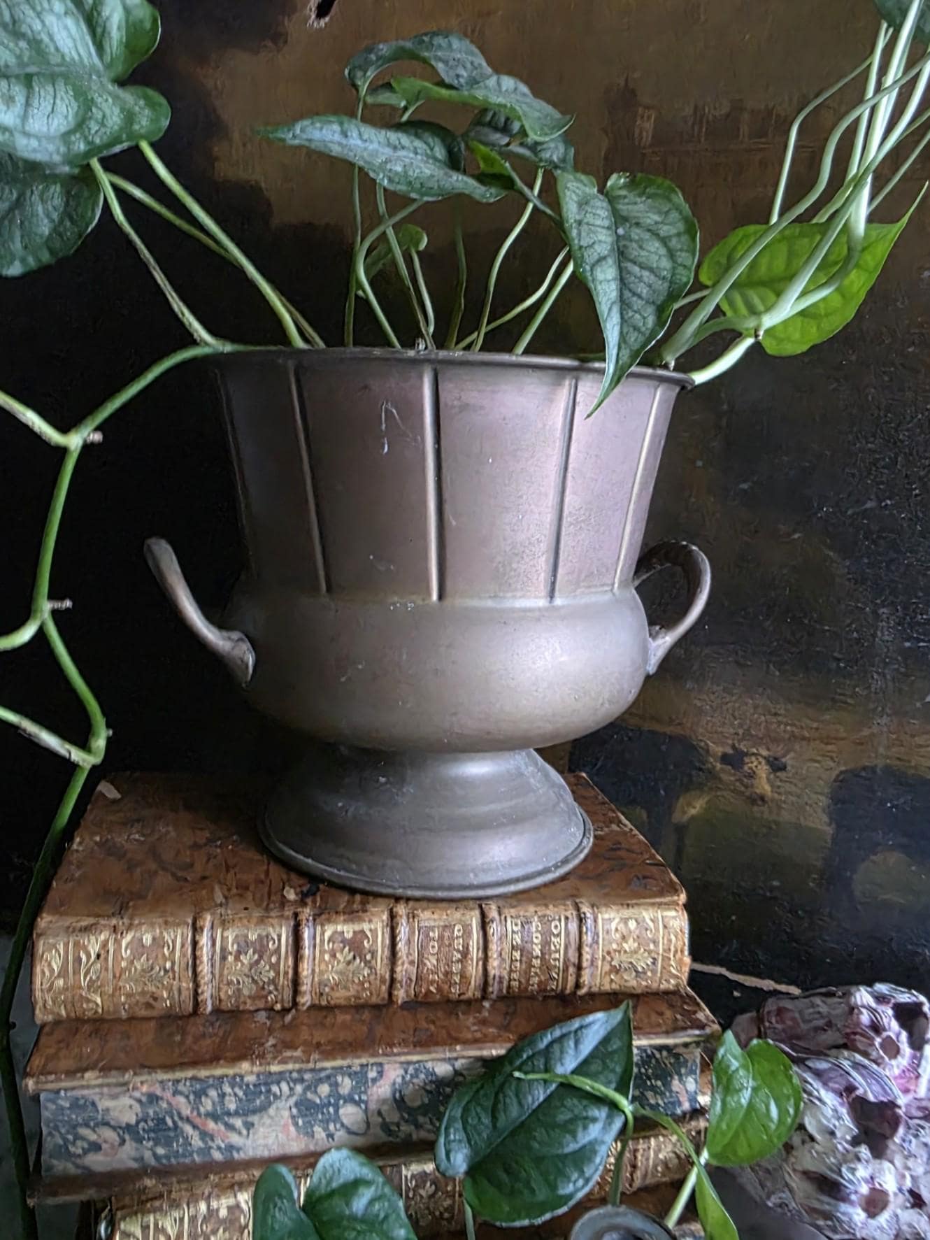 This charming vintage planter features a classic urn or trophy cup silhouette, crafted from metal with an aged brass-tone finish. The design includes a fluted upper body that transitions into a rounded lower bowl, resting on a sturdy pedestal foot. Two small, curved handles adorn the sides, adding to its traditional appeal. The surface displays a rich, authentic patina with varying tones of bronze and gold, along with signs of wear and oxidation consistent with age and use, giving it a distinctive rustic character.