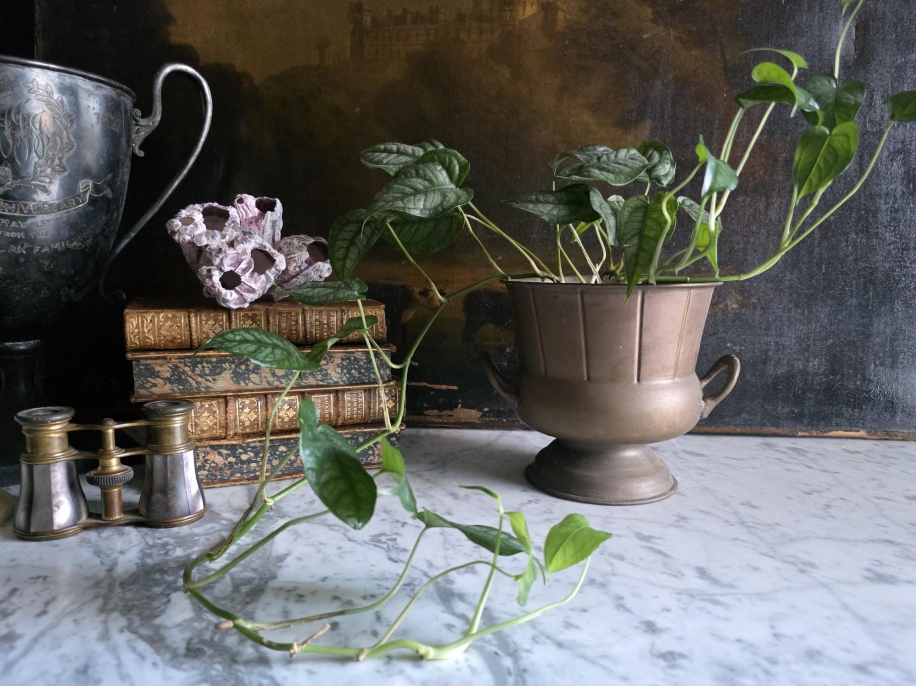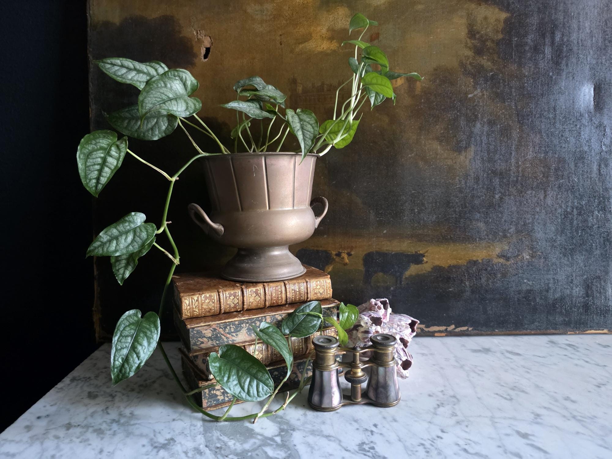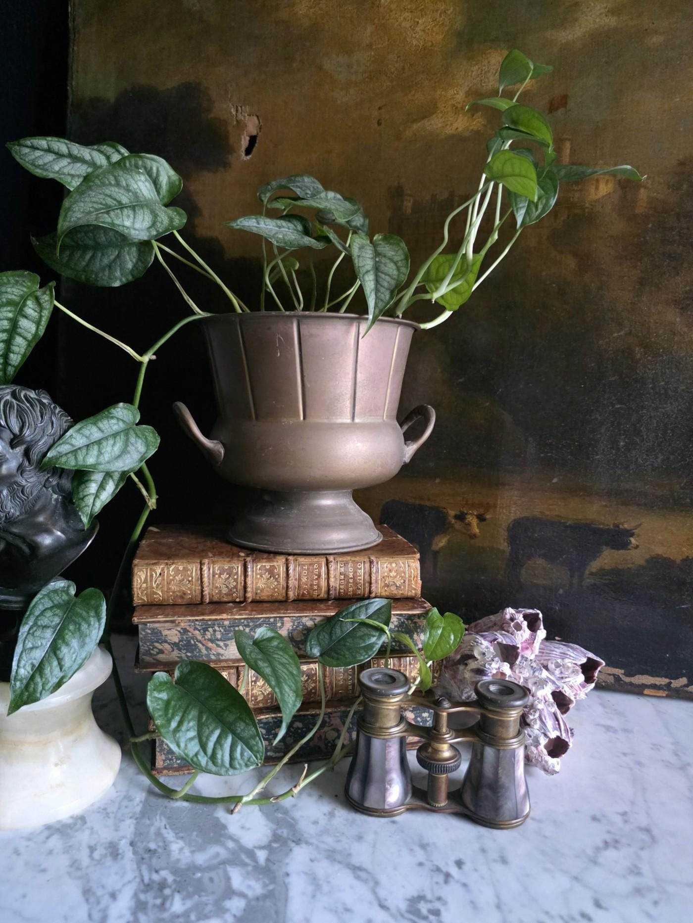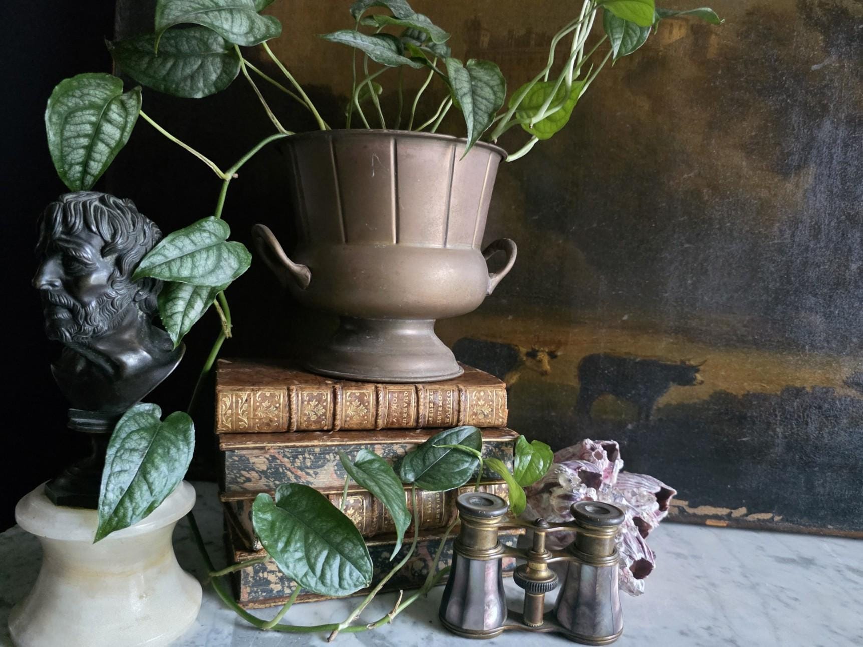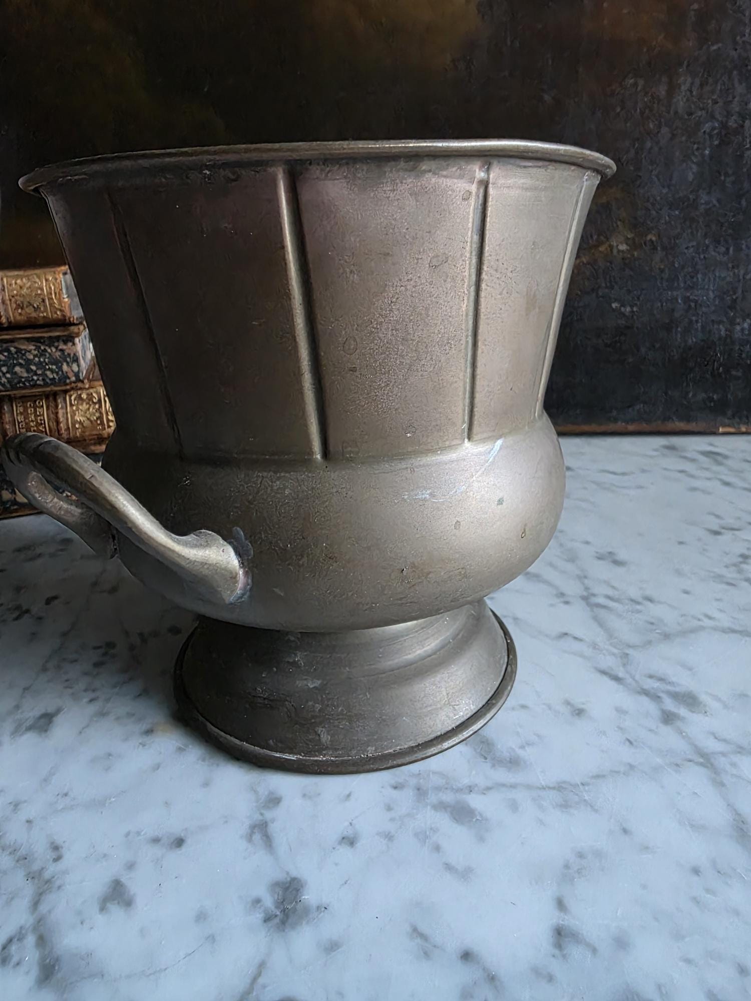 This charming vintage planter features a classic urn or trophy cup silhouette, crafted from metal with an aged brass-tone finish. The design includes a fluted upper body that transitions into a rounded lower bowl, resting on a sturdy pedestal foot. Two small, curved handles adorn the sides, adding to its traditional appeal. The surface displays a rich, authentic patina with varying tones of bronze and gold, along with signs of wear and oxidation consistent with age and use, giving it a distinctive rustic character.