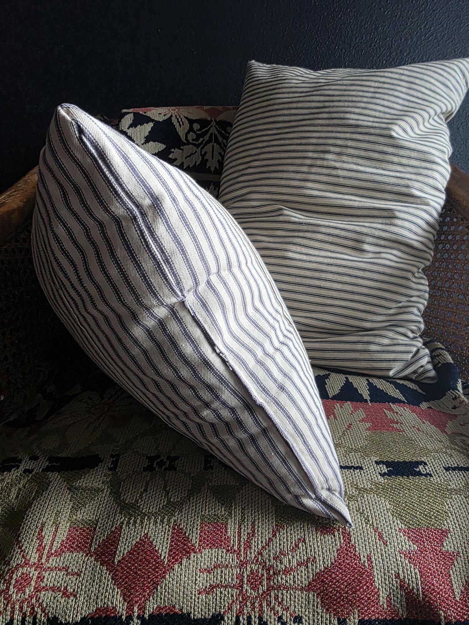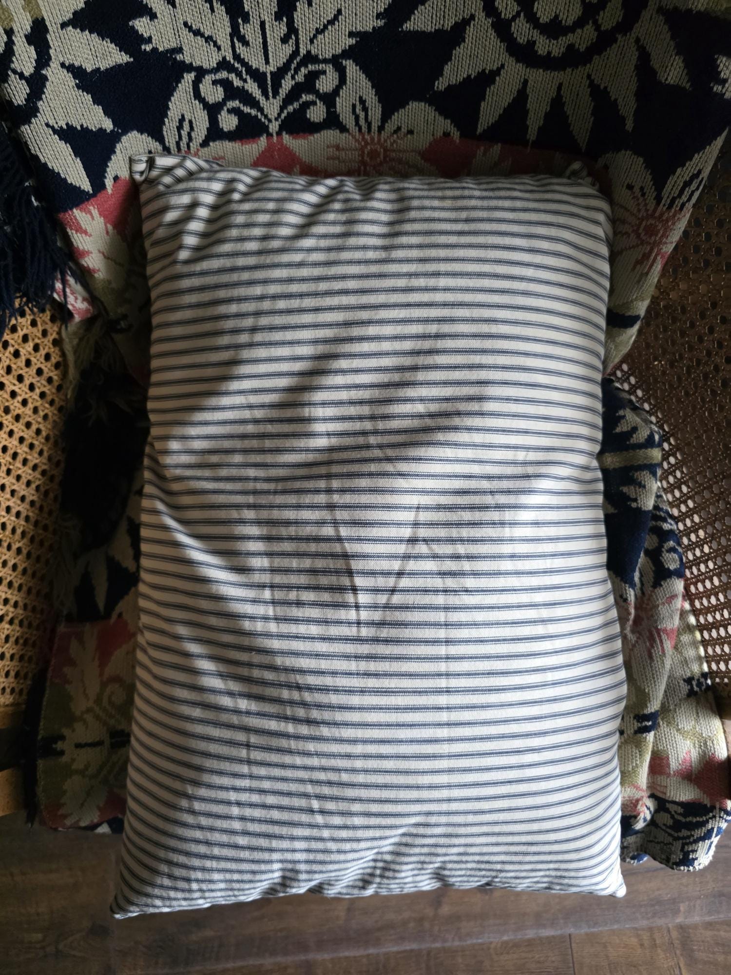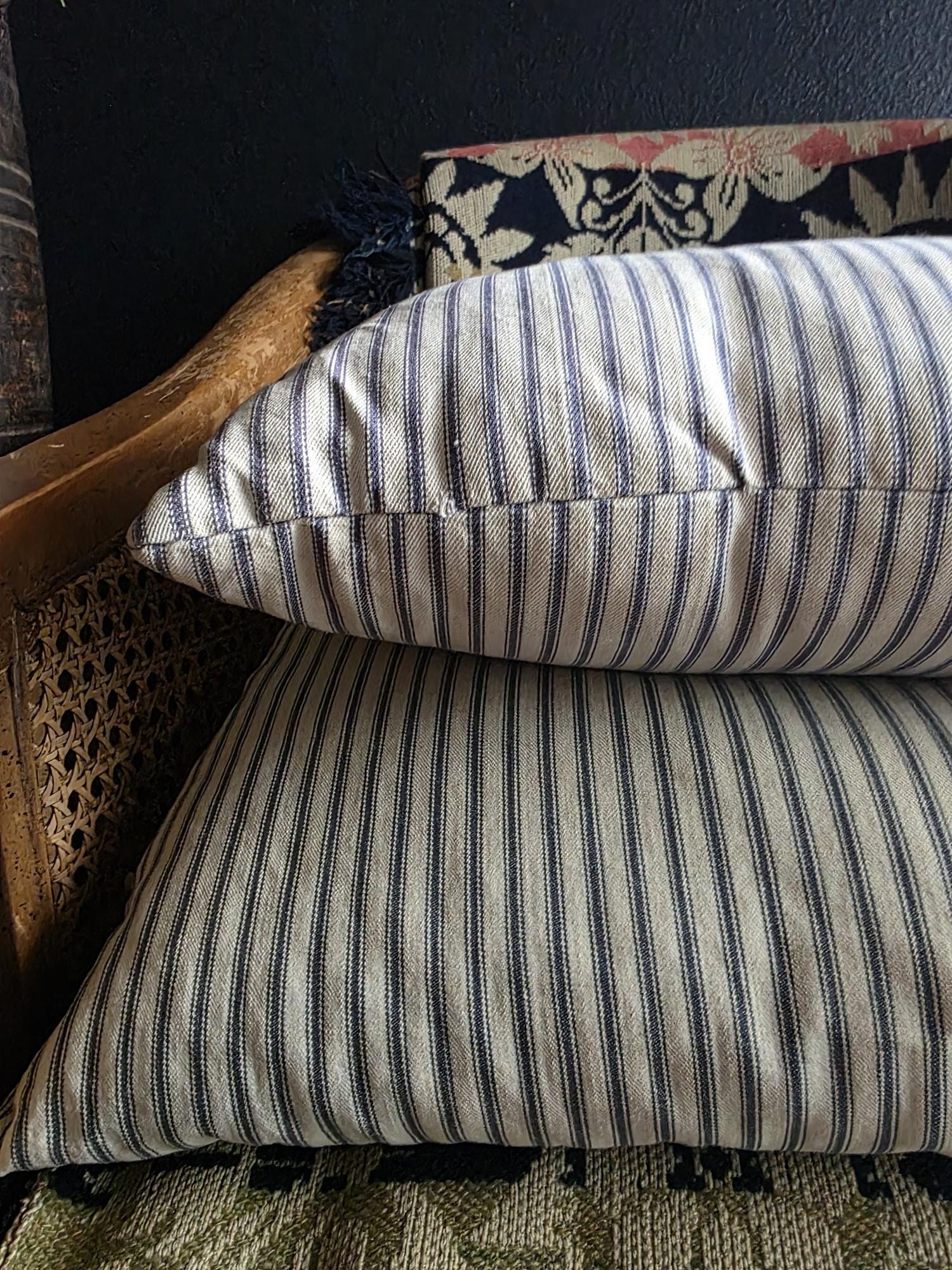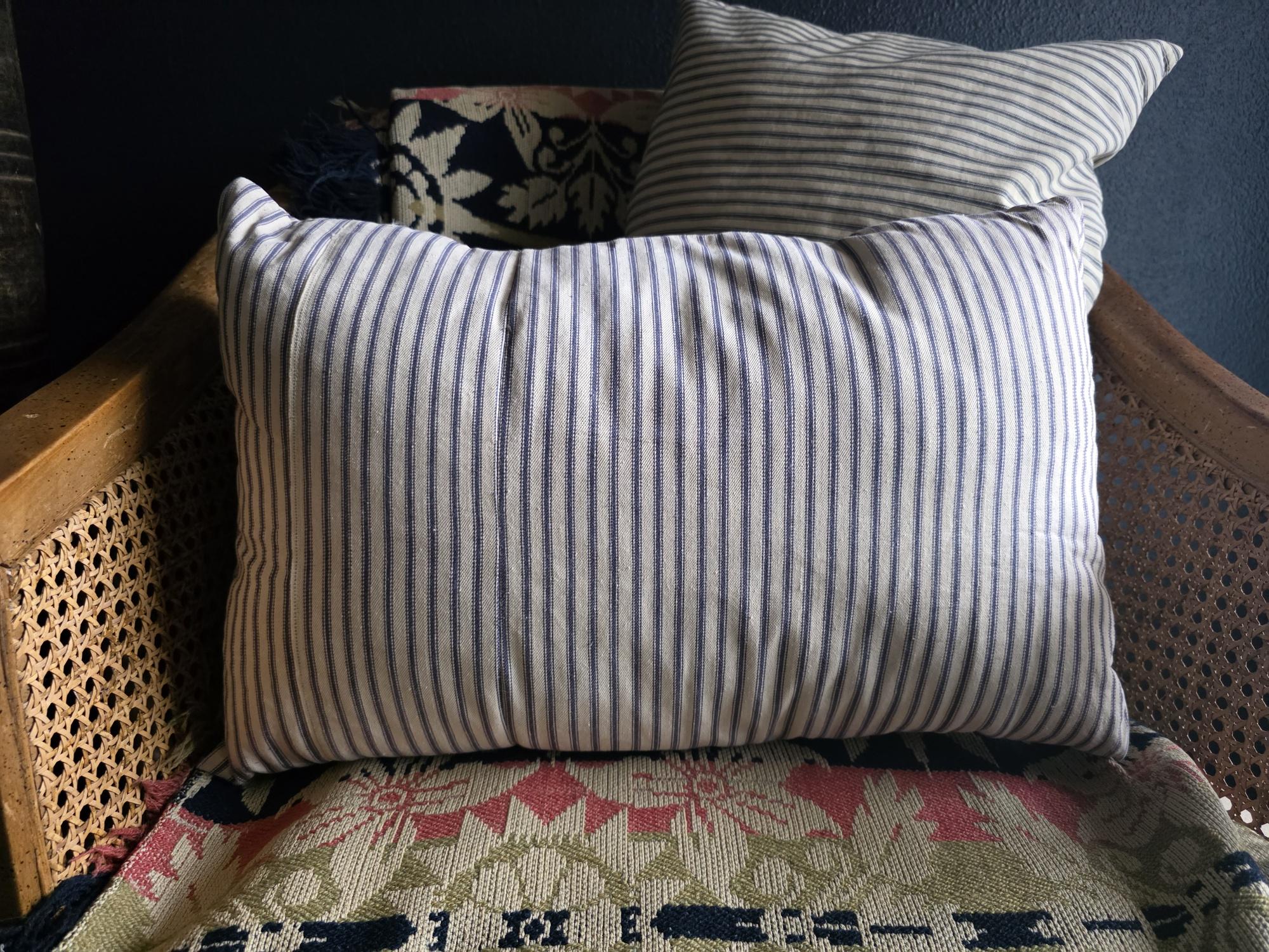 Add a touch of authentic farmhouse charm to your home with this matched set of two antique ticking pillows. Crafted from classic blue and white striped fabric, these pillows possess the distinctive character and are believed to both be down-filled. The set shows a lovely, time-worn patina that speaks to its age; specifically, the larger pillow exhibits a greater amount of natural discoloration, while the smaller pillow retains a fuller, loftier profile than its counterpart. The larger pillow is much looser with its filling. There is minor wear visible to the seams on both pillows, consistent with their antique history, making this pair a perfect, rustic accent for a primitive bench, settee, or bed. The larger pillow exhibits rust colored staining to one of the corners. See listing photographs closely for best description of condition. You will receive both pillow with the purchase of this listing.