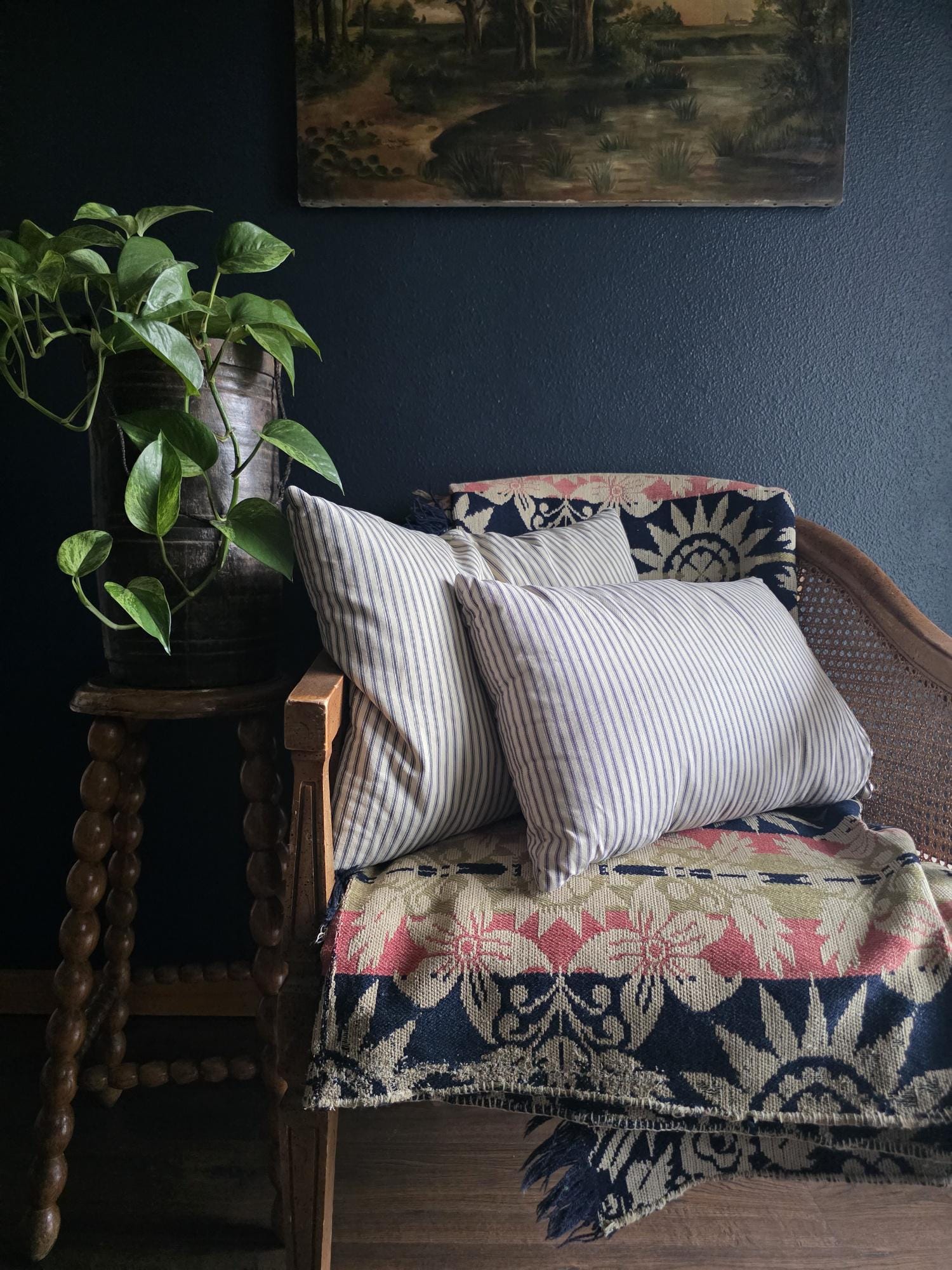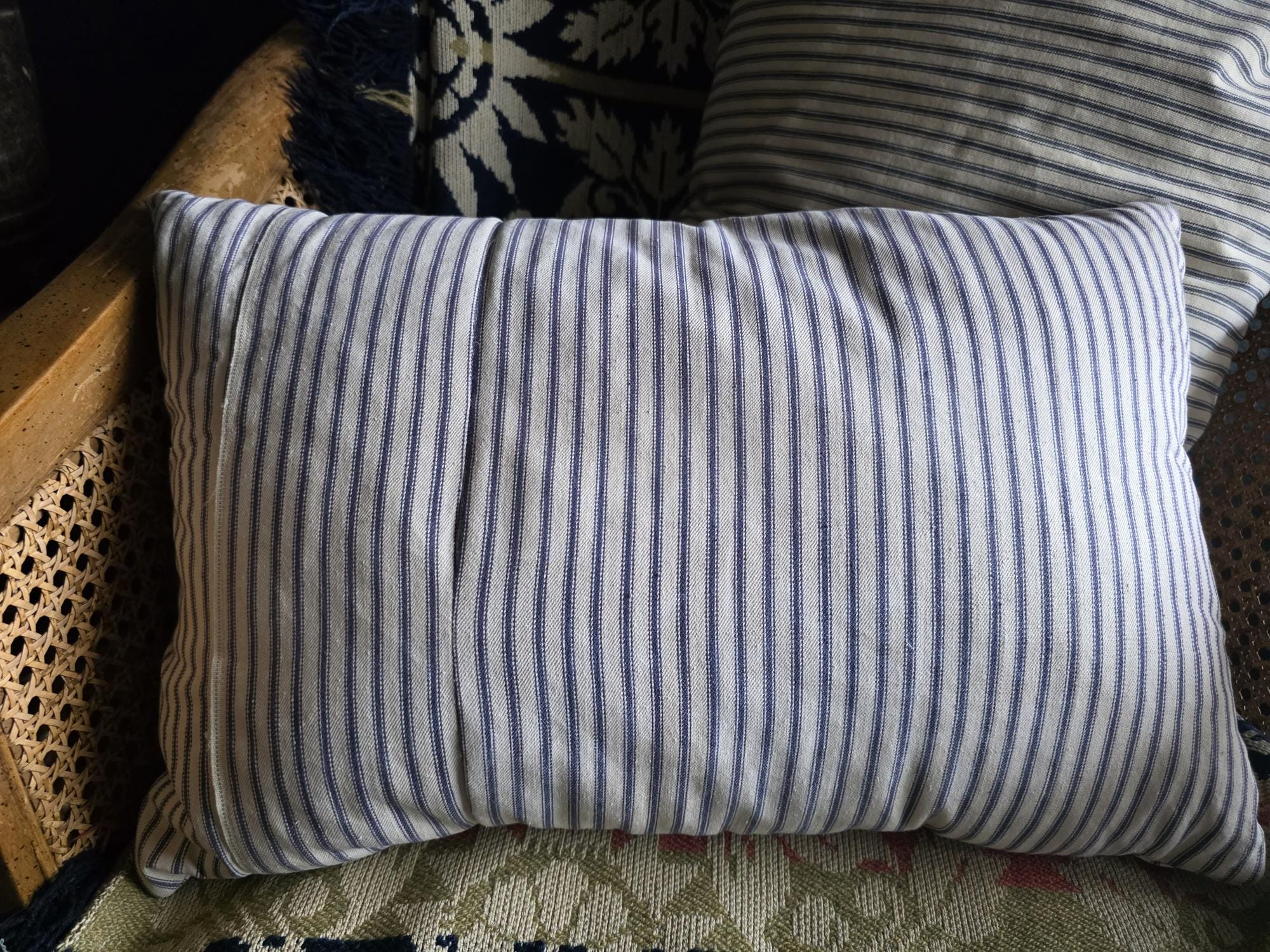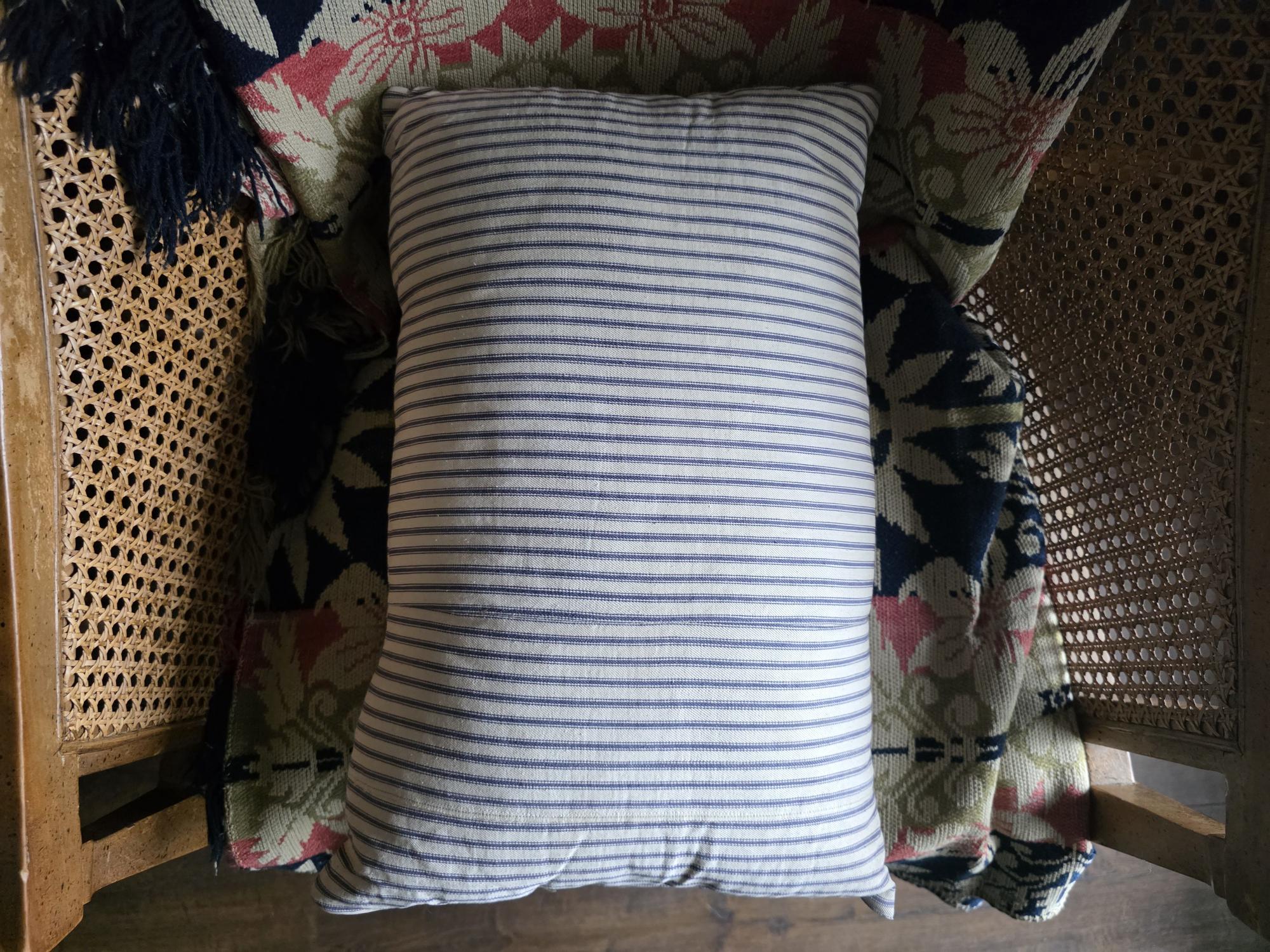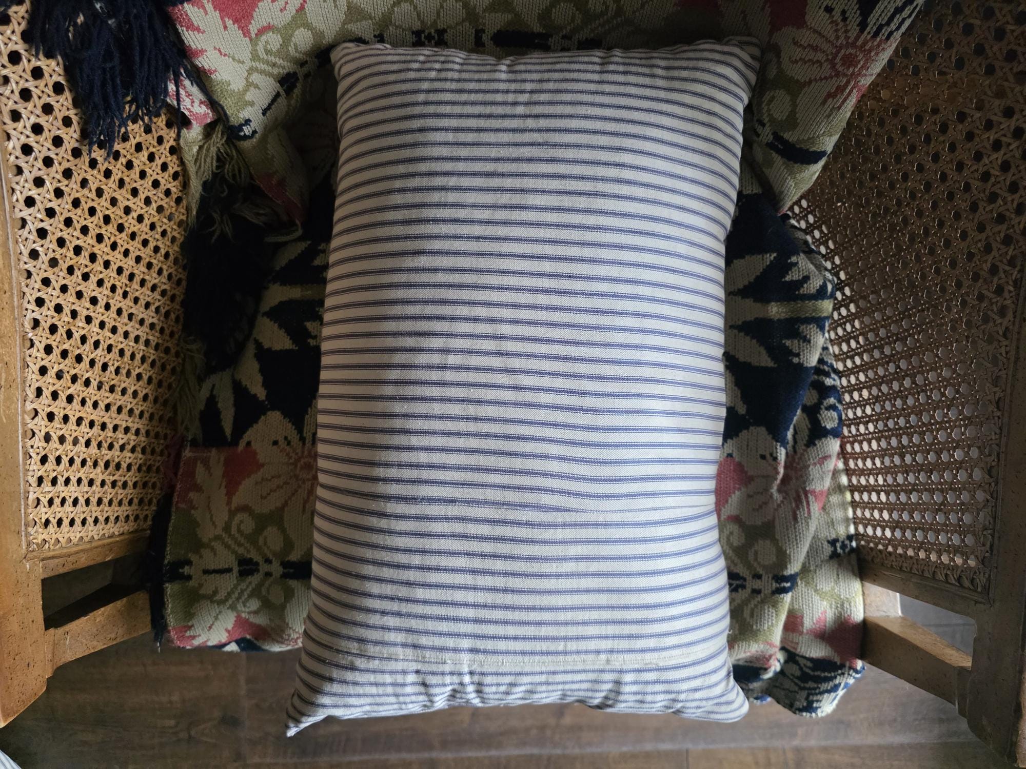 Add a touch of authentic farmhouse charm to your home with this matched set of two antique ticking pillows. Crafted from classic blue and white striped fabric, these pillows possess the distinctive character and are believed to both be down-filled. The set shows a lovely, time-worn patina that speaks to its age; specifically, the larger pillow exhibits a greater amount of natural discoloration, while the smaller pillow retains a fuller, loftier profile than its counterpart. The larger pillow is much looser with its filling. There is minor wear visible to the seams on both pillows, consistent with their antique history, making this pair a perfect, rustic accent for a primitive bench, settee, or bed. The larger pillow exhibits rust colored staining to one of the corners. See listing photographs closely for best description of condition. You will receive both pillow with the purchase of this listing.