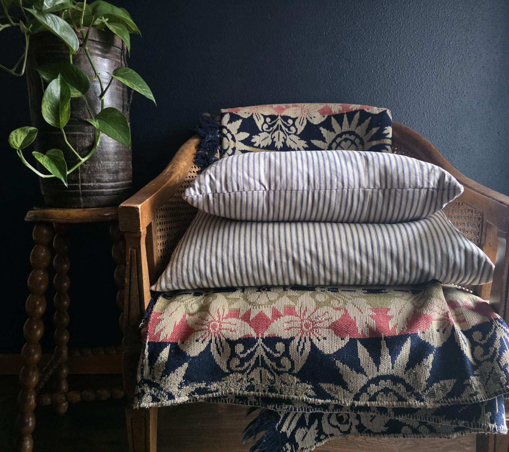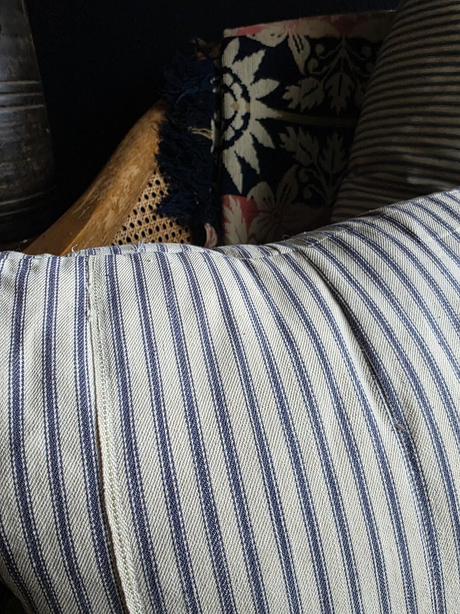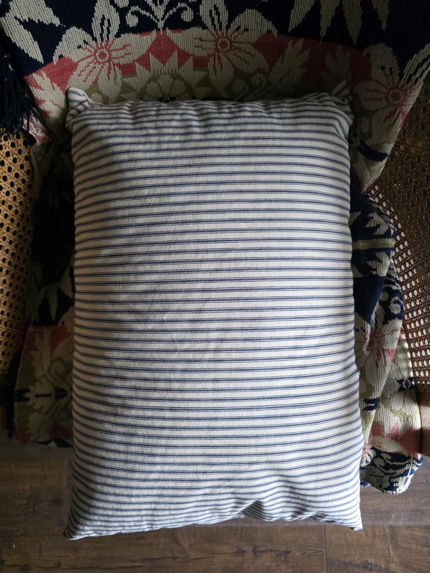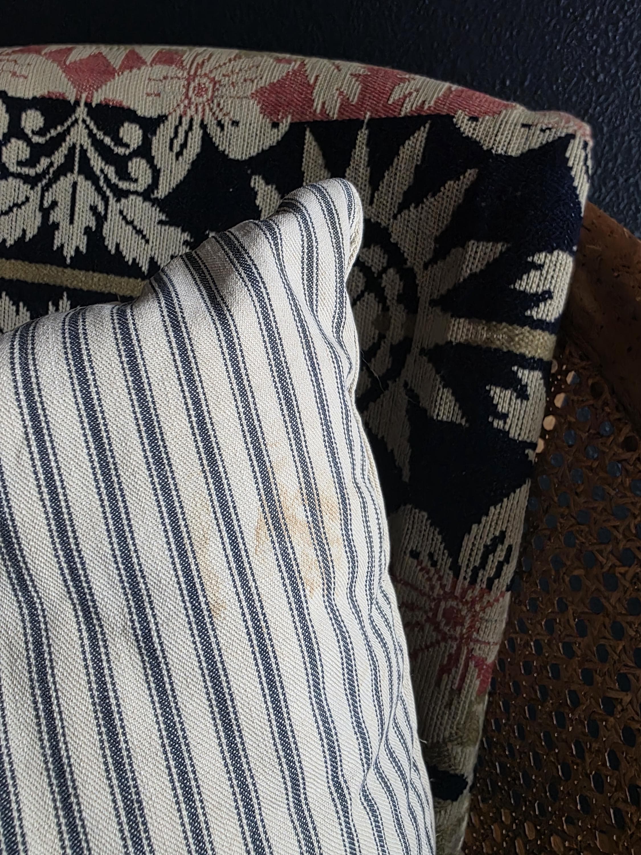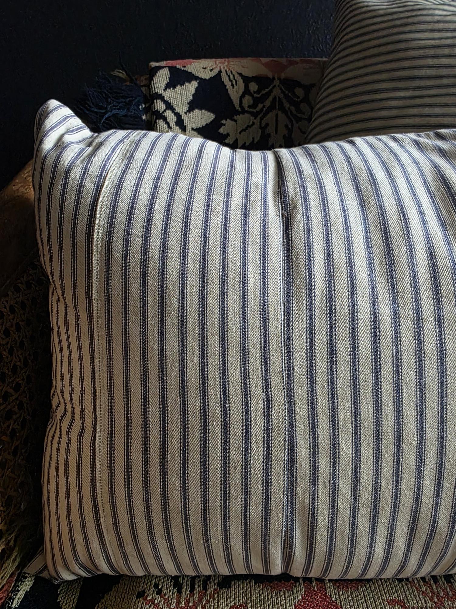 Add a touch of authentic farmhouse charm to your home with this matched set of two antique ticking pillows. Crafted from classic blue and white striped fabric, these pillows possess the distinctive character and are believed to both be down-filled. The set shows a lovely, time-worn patina that speaks to its age; specifically, the larger pillow exhibits a greater amount of natural discoloration, while the smaller pillow retains a fuller, loftier profile than its counterpart. The larger pillow is much looser with its filling. There is minor wear visible to the seams on both pillows, consistent with their antique history, making this pair a perfect, rustic accent for a primitive bench, settee, or bed. The larger pillow exhibits rust colored staining to one of the corners. See listing photographs closely for best description of condition. You will receive both pillow with the purchase of this listing.