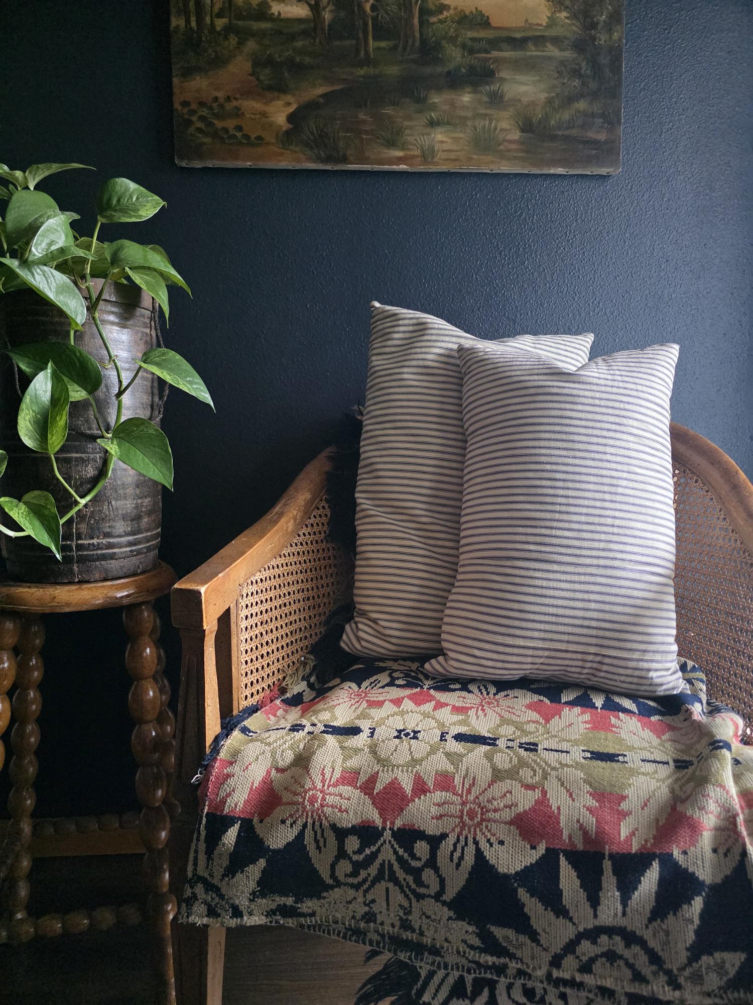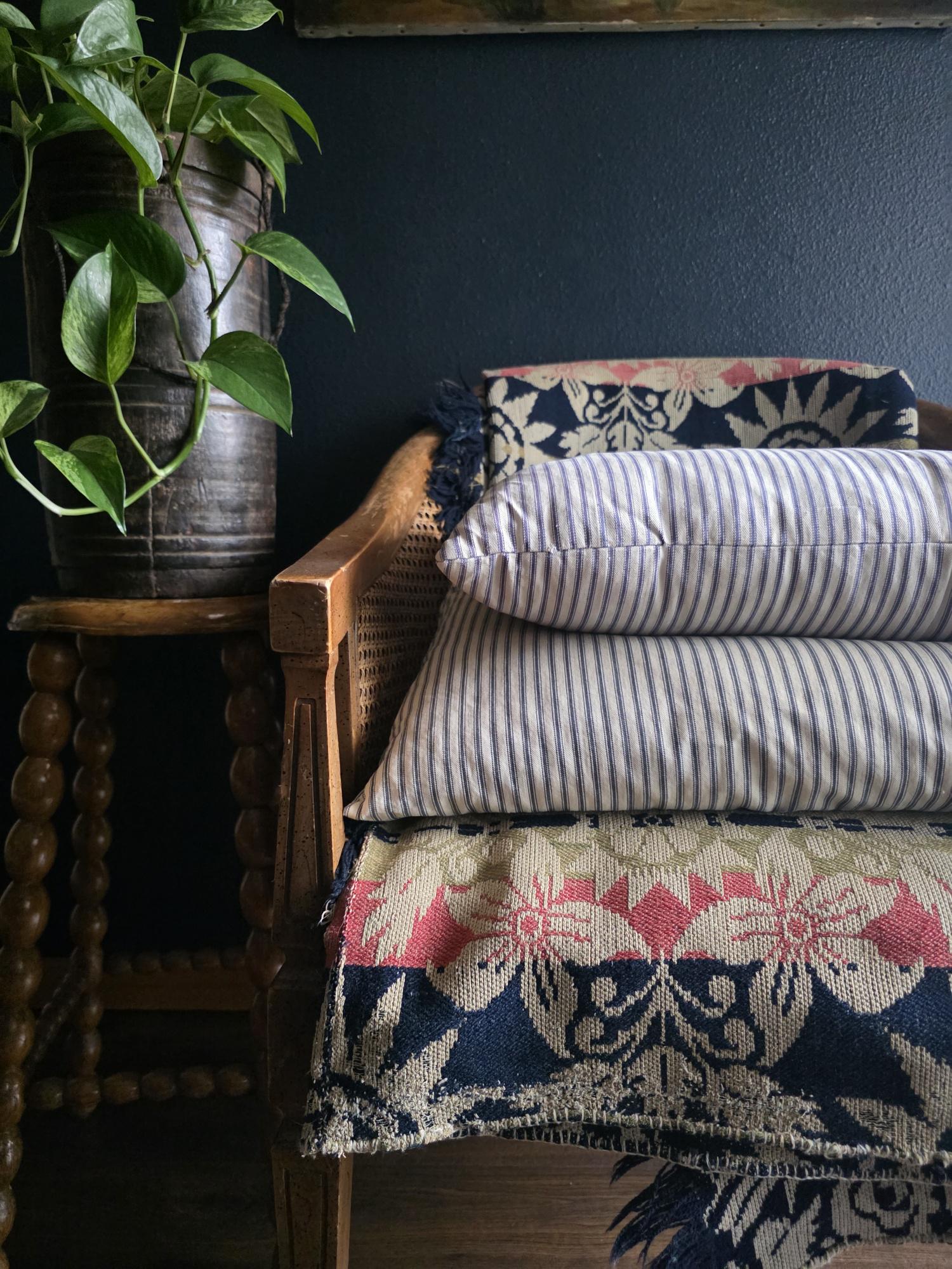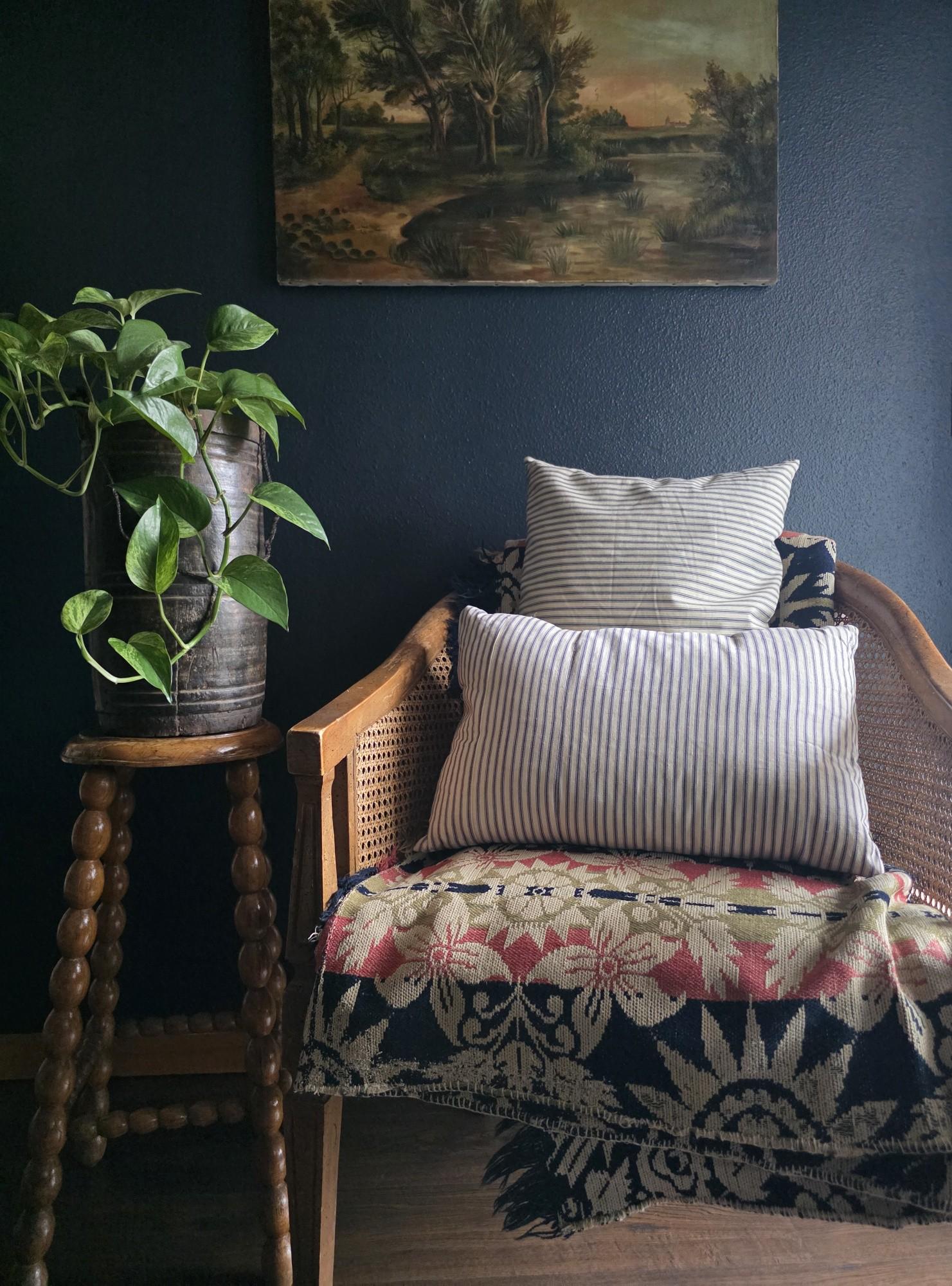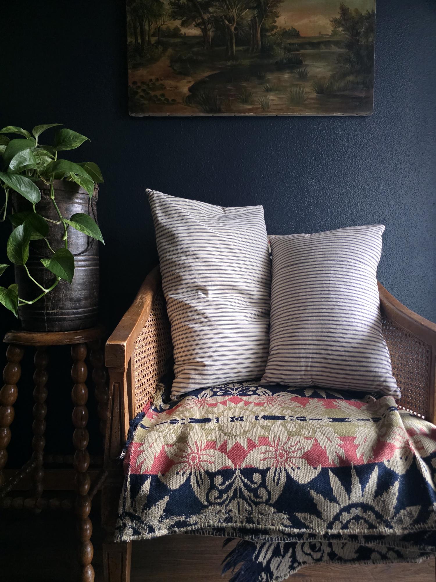 Add a touch of authentic farmhouse charm to your home with this matched set of two antique ticking pillows. Crafted from classic blue and white striped fabric, these pillows possess the distinctive character and are believed to both be down-filled. The set shows a lovely, time-worn patina that speaks to its age; specifically, the larger pillow exhibits a greater amount of natural discoloration, while the smaller pillow retains a fuller, loftier profile than its counterpart. The larger pillow is much looser with its filling. There is minor wear visible to the seams on both pillows, consistent with their antique history, making this pair a perfect, rustic accent for a primitive bench, settee, or bed. The larger pillow exhibits rust colored staining to one of the corners. See listing photographs closely for best description of condition. You will receive both pillow with the purchase of this listing.