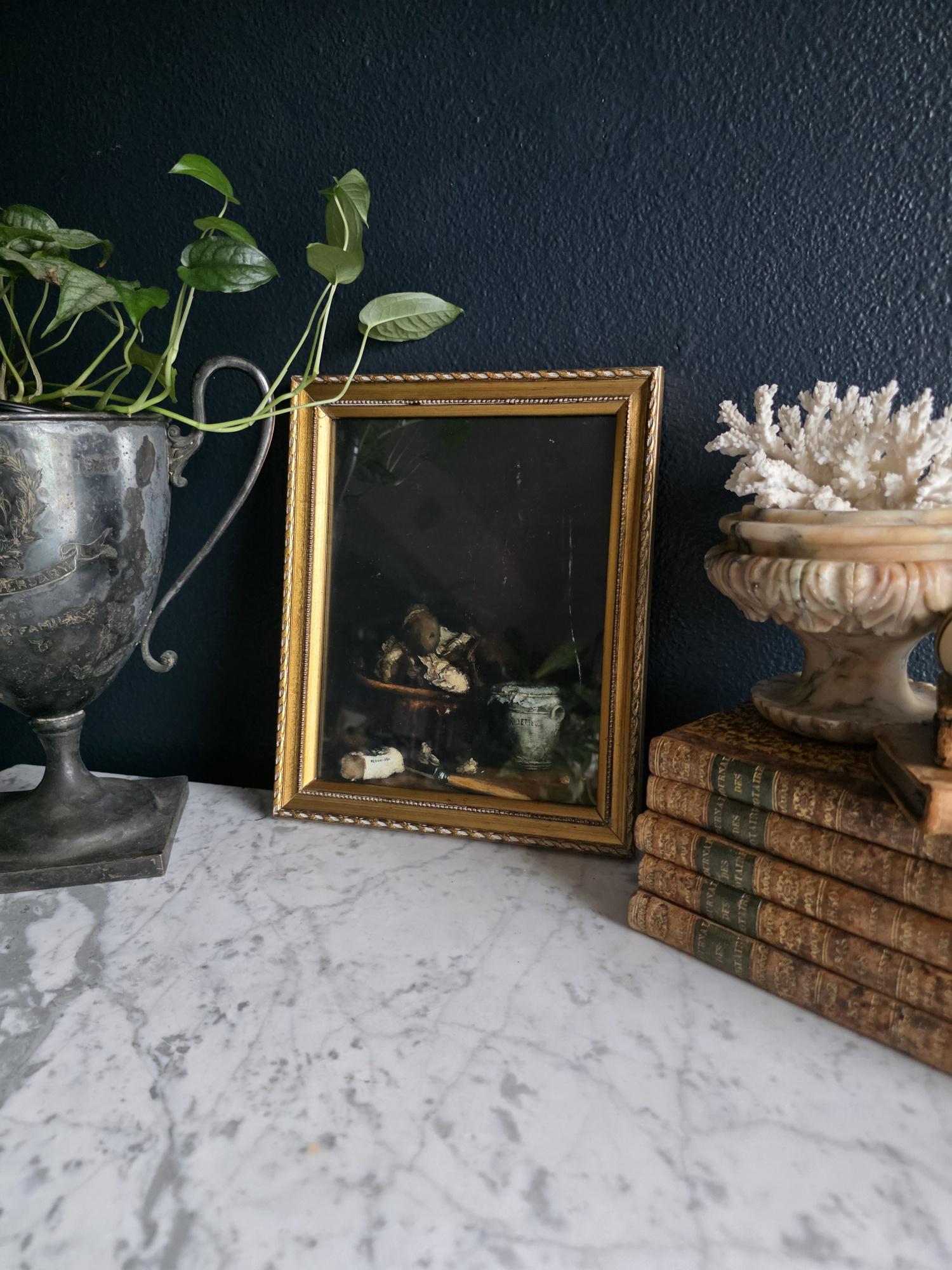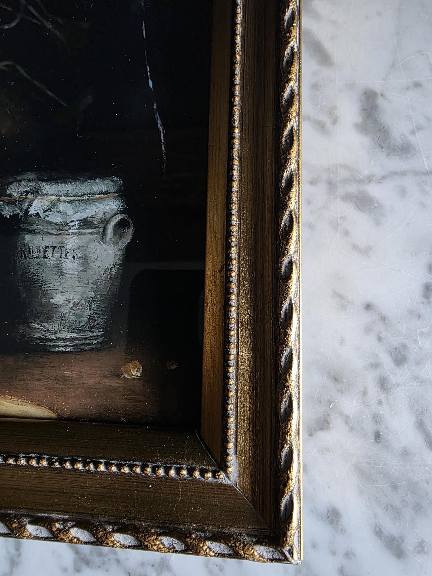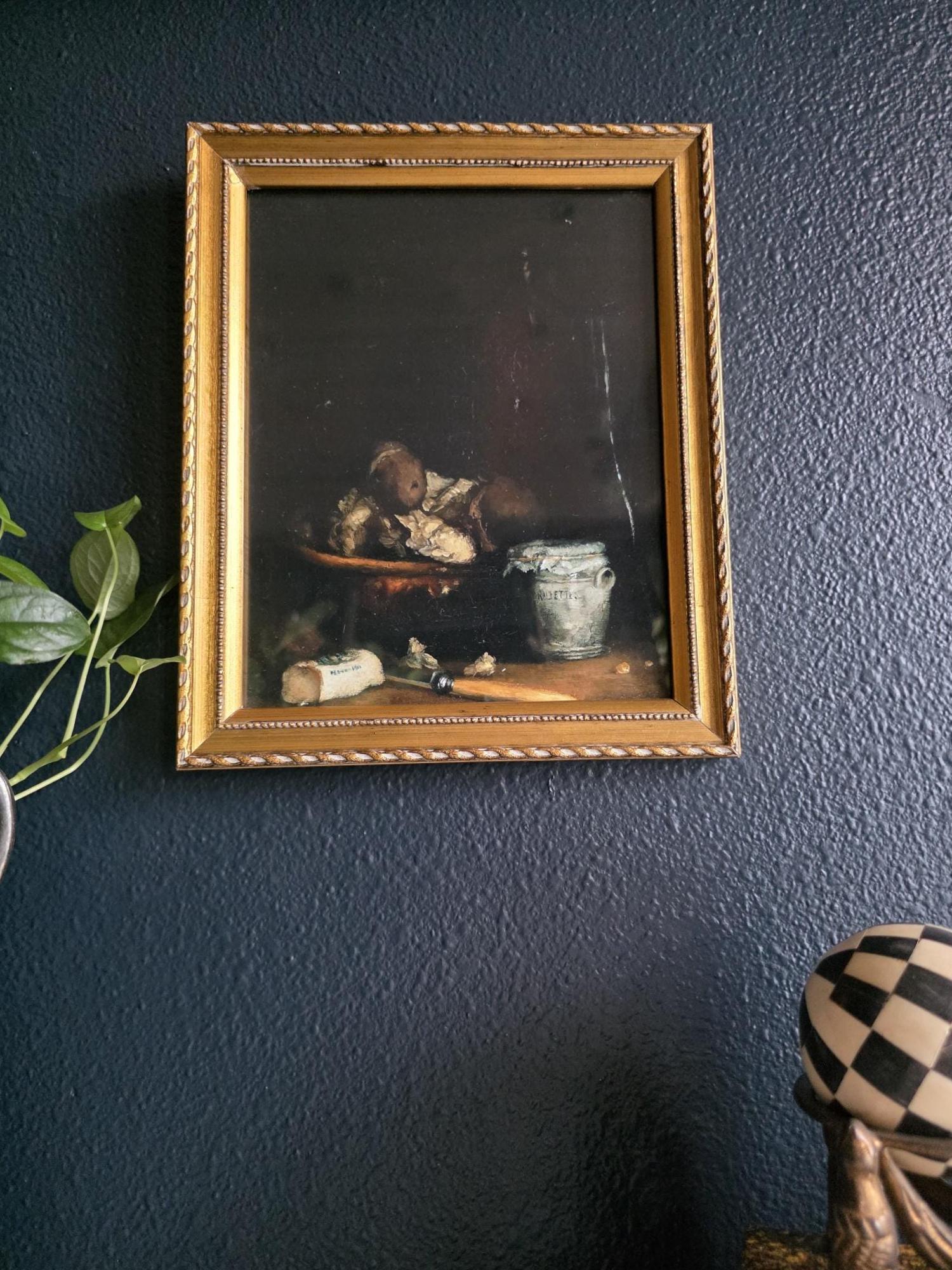 This listing presents a vintage gold wood composition frame containing a high-quality modern art print of "Rillettes Avec Accompagnements" (Rillettes with Accompaniments) by the French Realist painter Théodule Ribot (1823–1891). The image depicts a moody, Chiaroscuro-style still life featuring a traditional ceramic rillettes pot, a wrapped block of Isigny butter, and a rustic bowl, all rendered in deep, dramatic tones. The print is set within an ornate vintage frame characterized by a twisted rope outer edge and a delicate beaded inner border. The frame itself shows genuine signs of history, including corner separation, chipping to the gilt finish, and a warm patina that complements the dark aesthetic of the artwork. The back features a distressed vintage cardboard backing secured with glazier's points and a sawtooth hanger, making this a ready-to-hang piece that blends antique charm with classic fine art imagery.