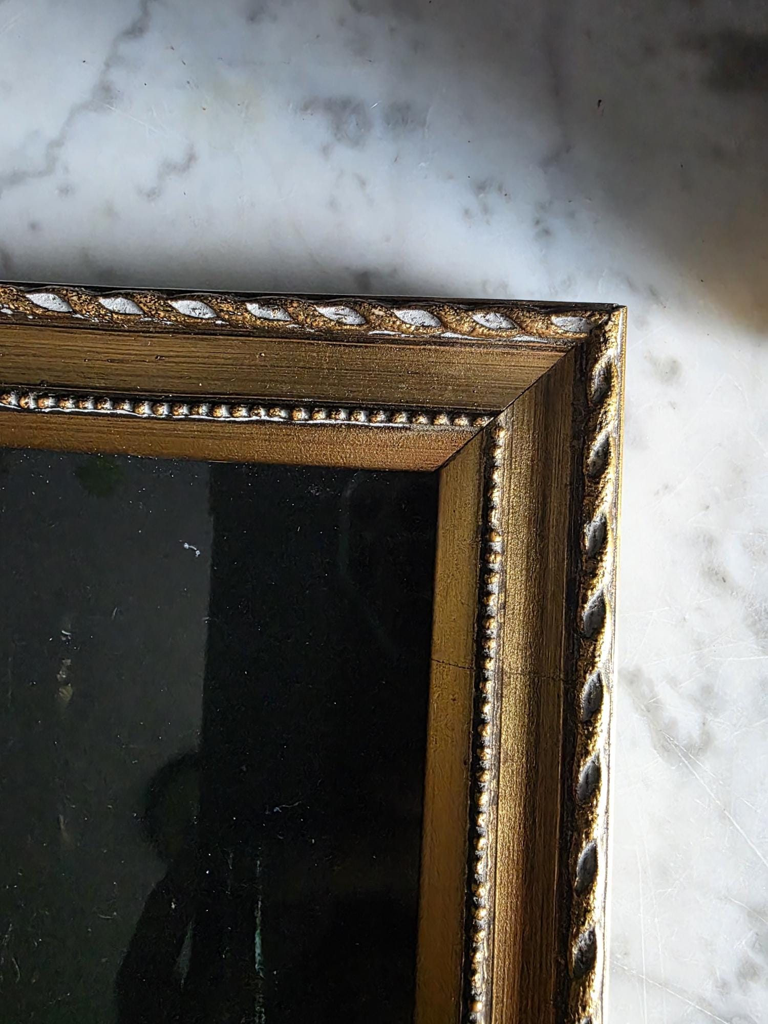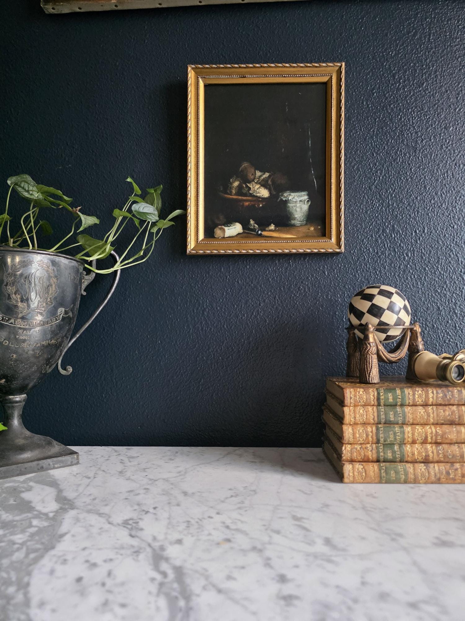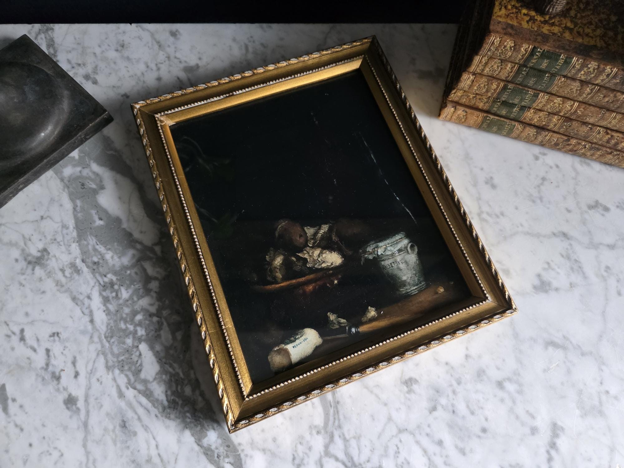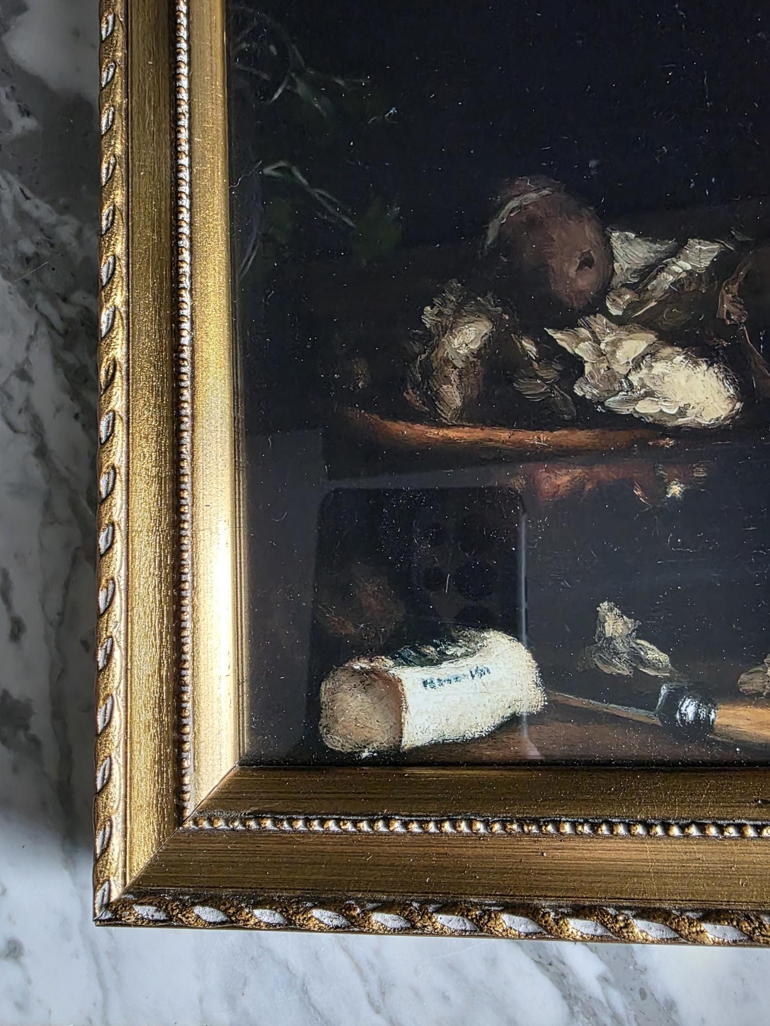 This listing presents a vintage gold wood composition frame containing a high-quality modern art print of "Rillettes Avec Accompagnements" (Rillettes with Accompaniments) by the French Realist painter Théodule Ribot (1823–1891). The image depicts a moody, Chiaroscuro-style still life featuring a traditional ceramic rillettes pot, a wrapped block of Isigny butter, and a rustic bowl, all rendered in deep, dramatic tones. The print is set within an ornate vintage frame characterized by a twisted rope outer edge and a delicate beaded inner border. The frame itself shows genuine signs of history, including corner separation, chipping to the gilt finish, and a warm patina that complements the dark aesthetic of the artwork. The back features a distressed vintage cardboard backing secured with glazier's points and a sawtooth hanger, making this a ready-to-hang piece that blends antique charm with classic fine art imagery.