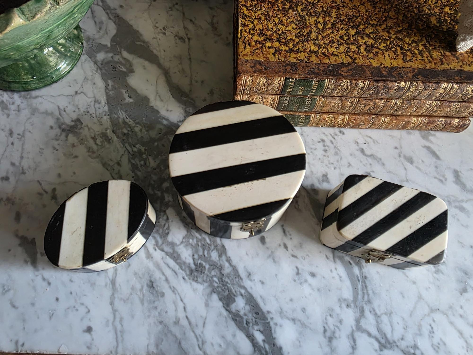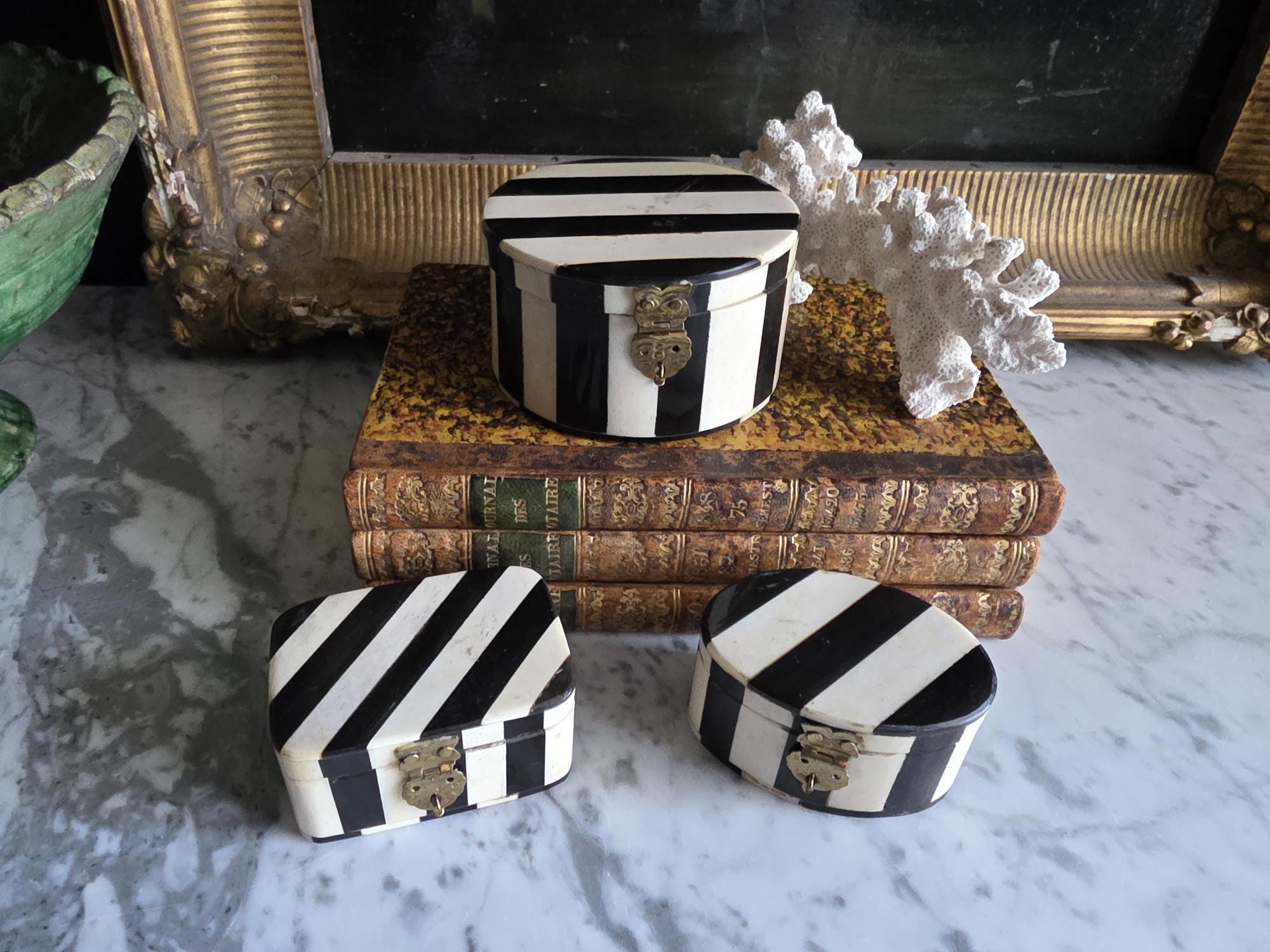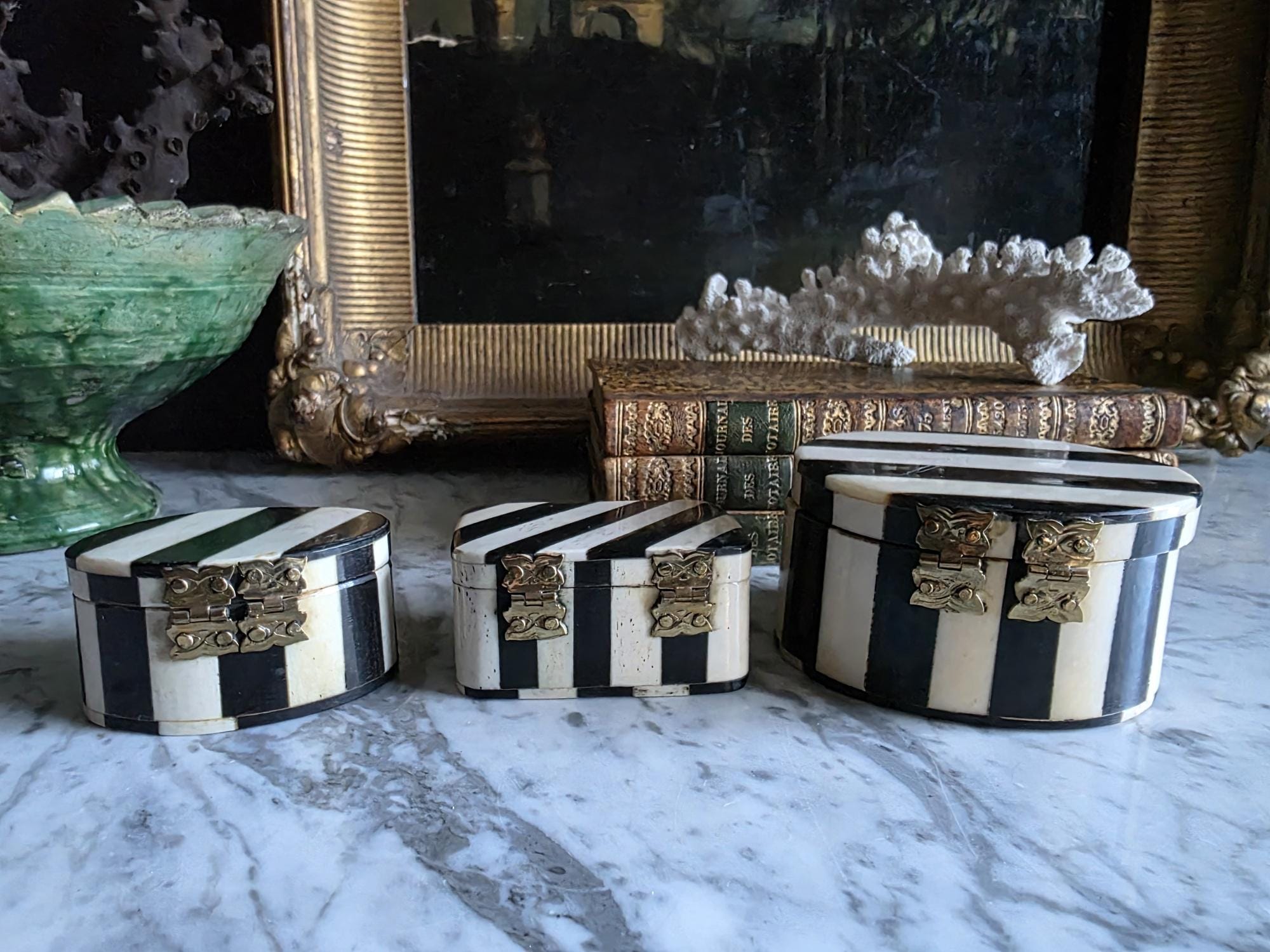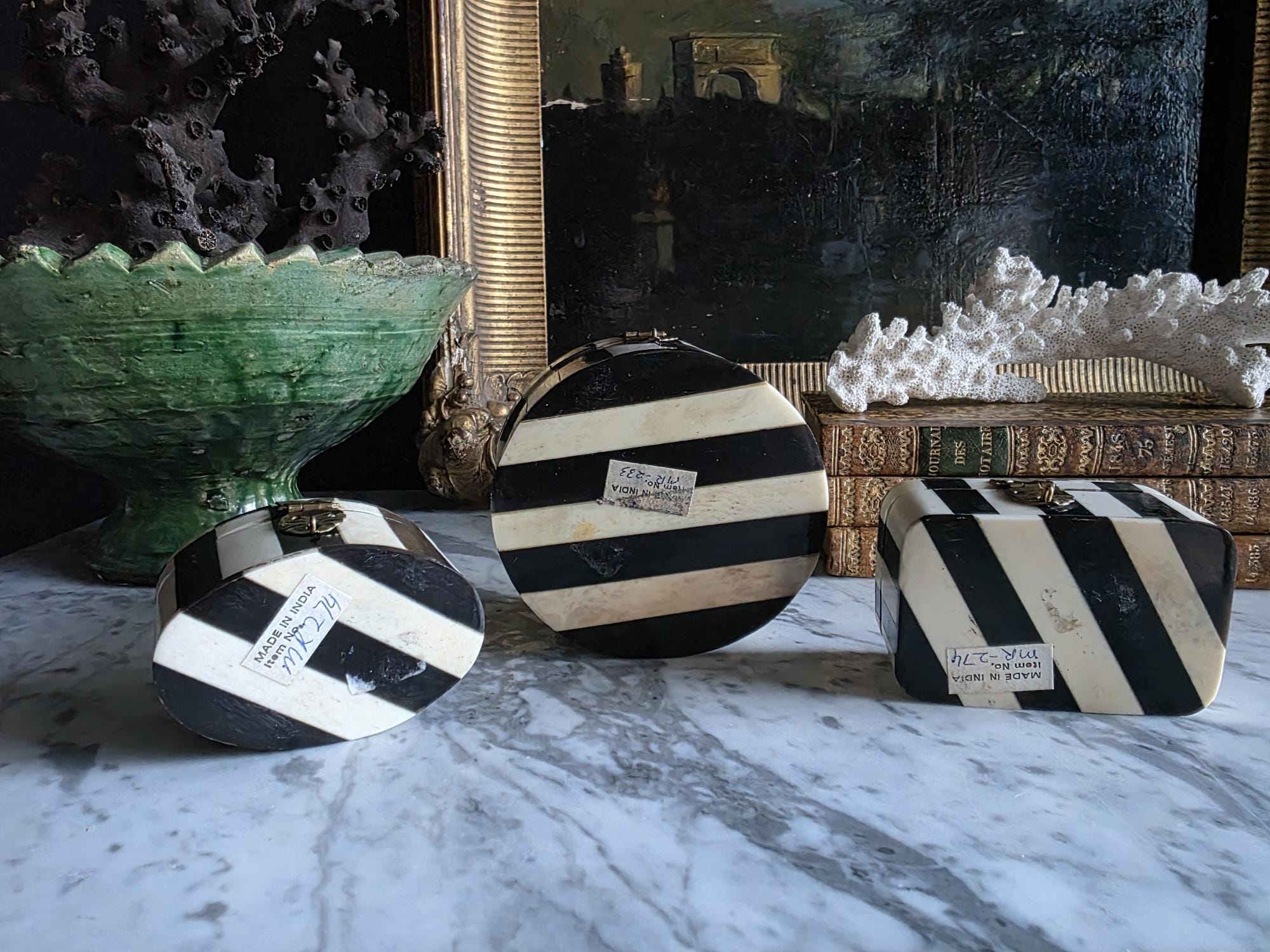Add a touch of graphic sophistication to your vanity or shelf with this striking set of three vintage trinket boxes. Each box is crafted with bold, alternating stripes of black natural ivory-toned bone inlay, creating a high-contrast look that is both classic and visually arresting. The set features three distinct shapes—one round, one oval, and one rectangular with rounded corners—making them a versatile trio for organizing small treasures.