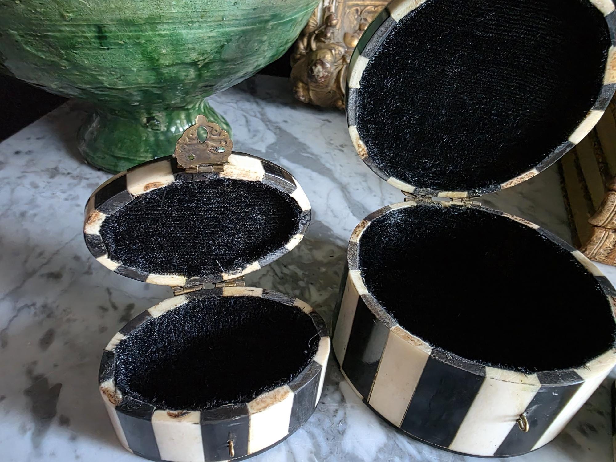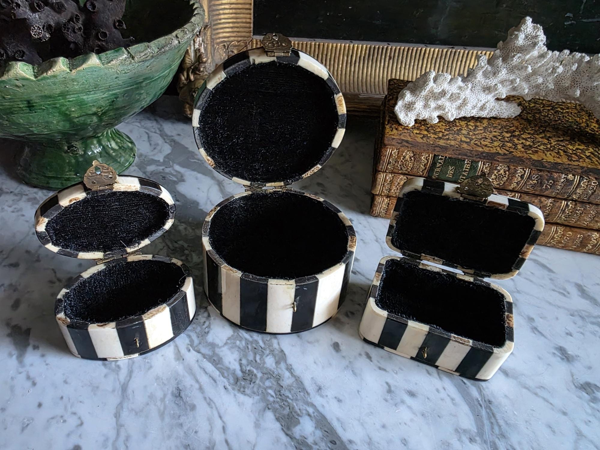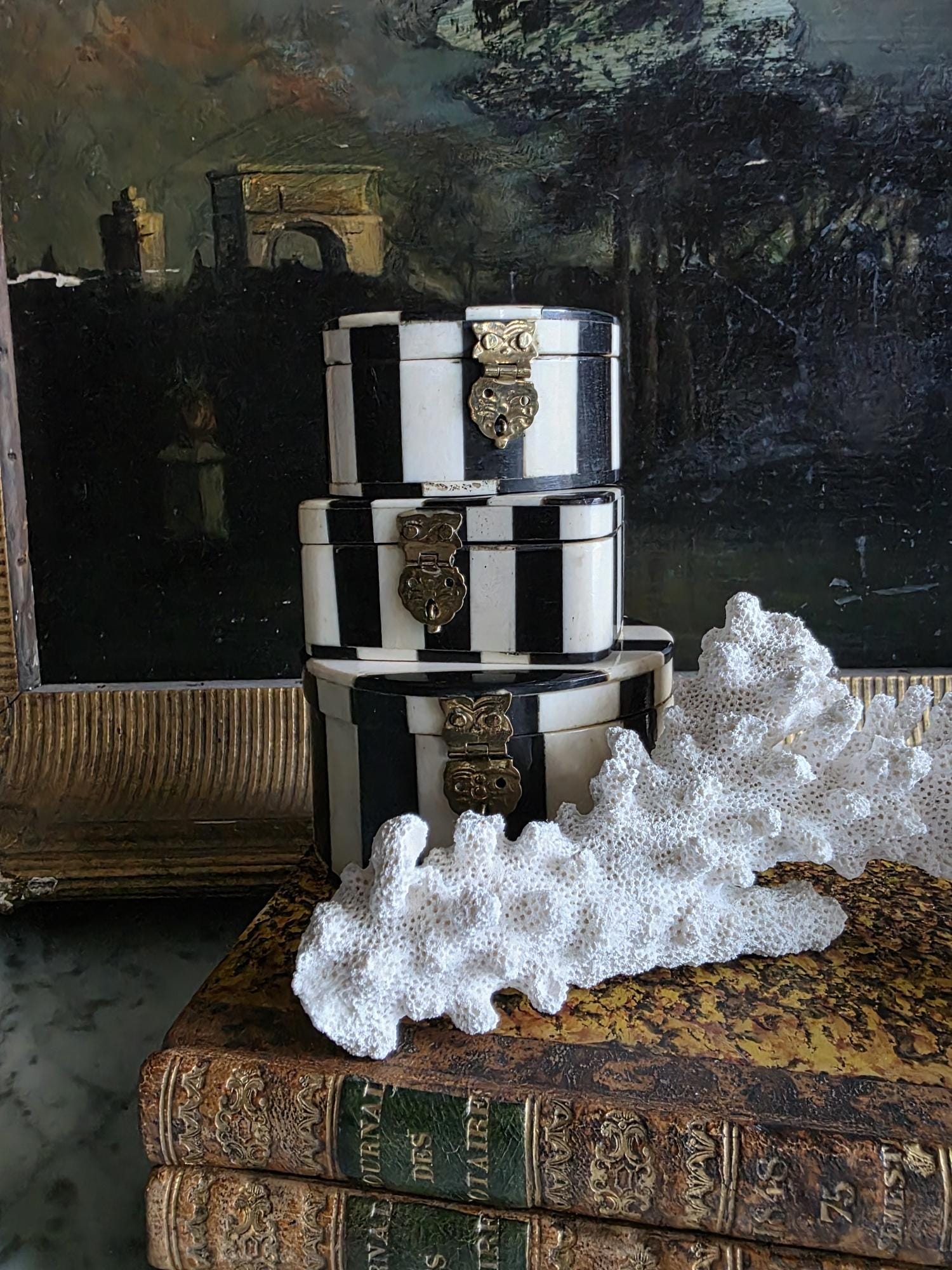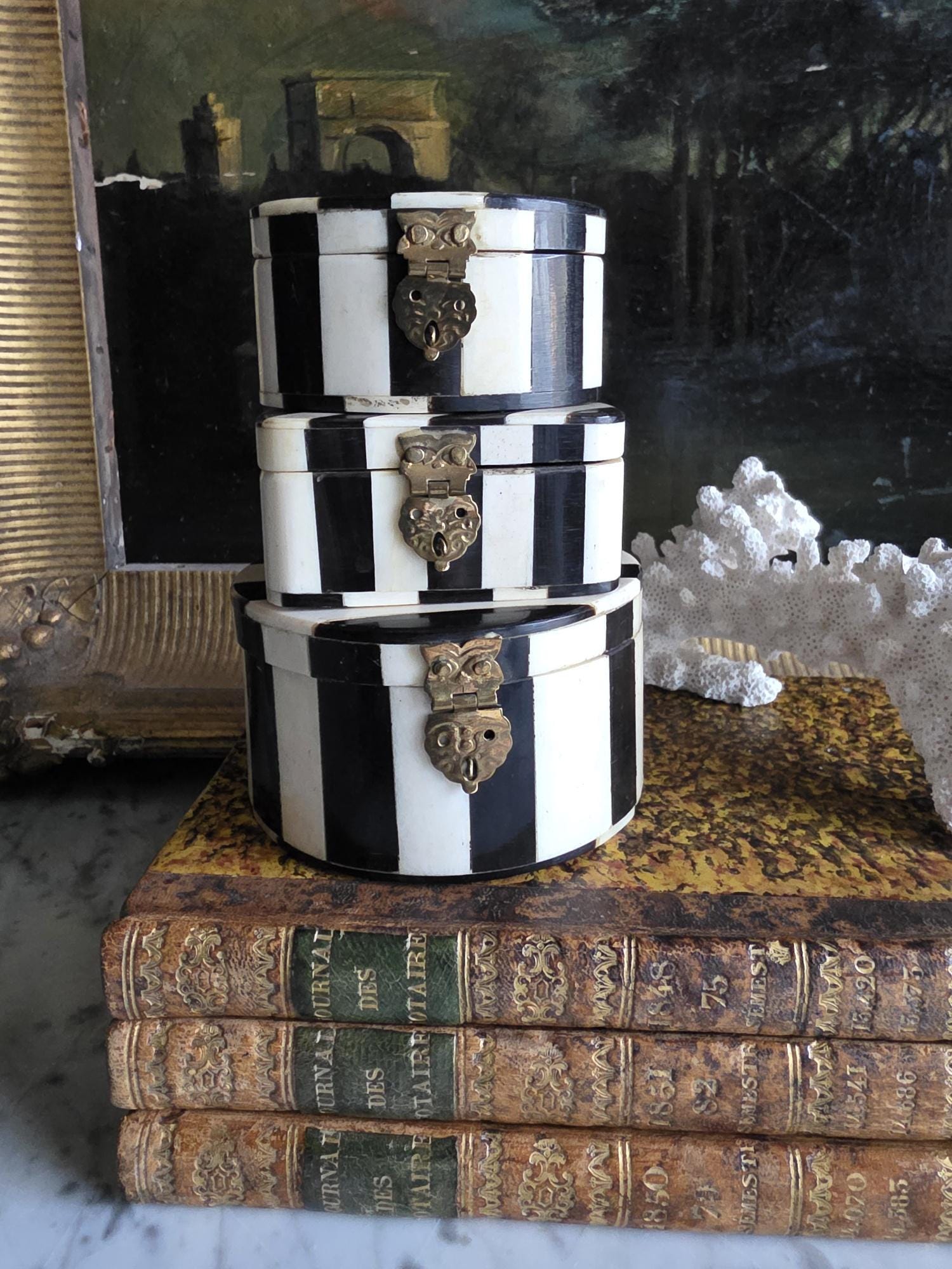 Add a touch of graphic sophistication to your vanity or shelf with this striking set of three vintage trinket boxes. Each box is crafted with bold, alternating stripes of black natural ivory-toned bone inlay, creating a high-contrast look that is both classic and visually arresting. The set features three distinct shapes—one round, one oval, and one rectangular with rounded corners—making them a versatile trio for organizing small treasures.