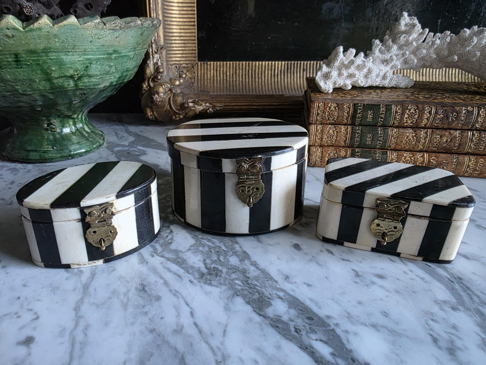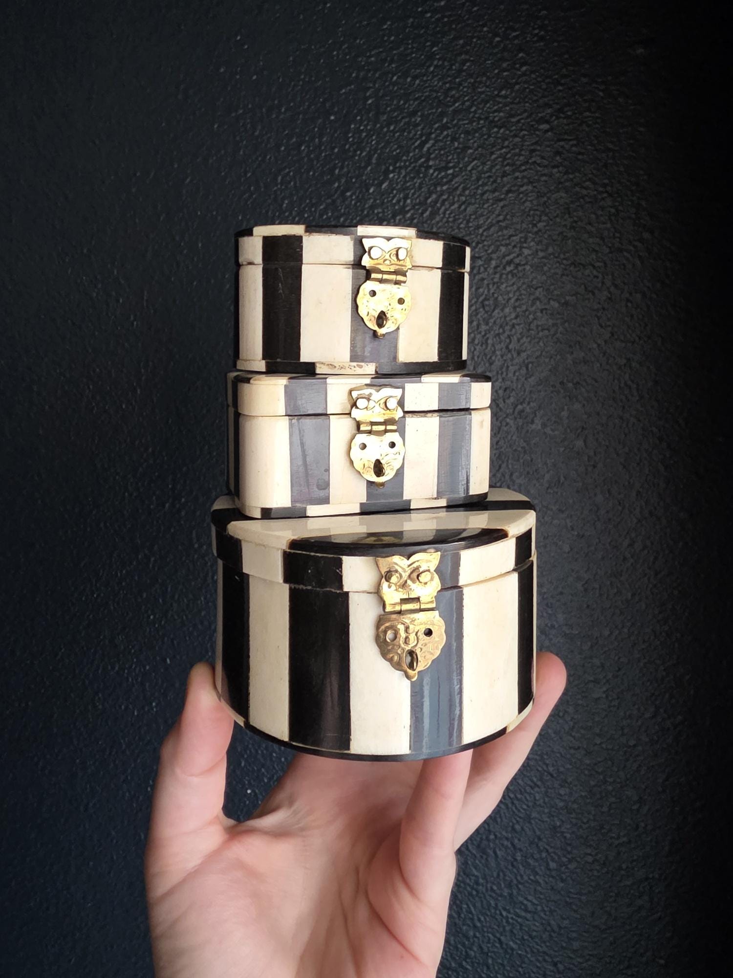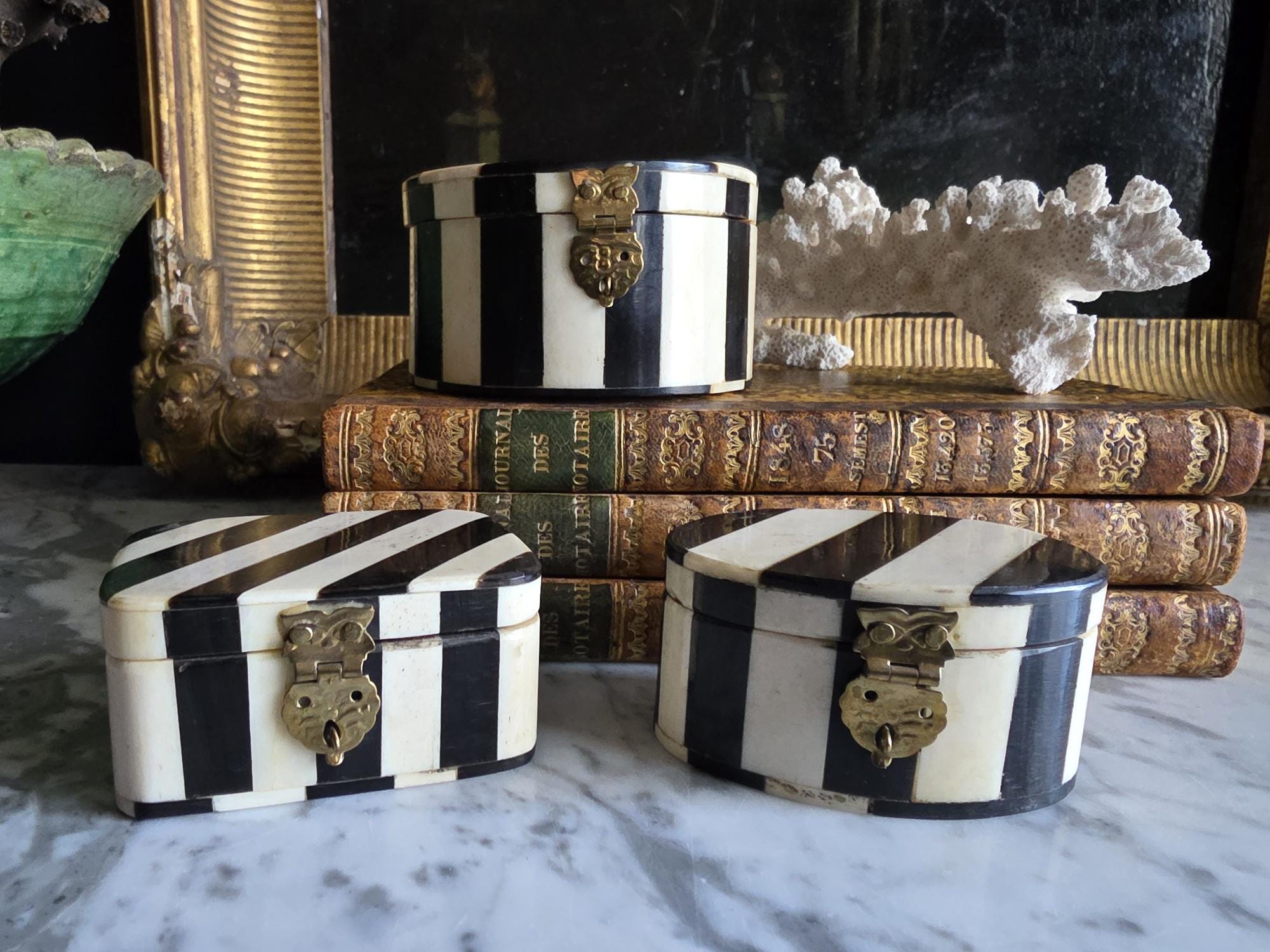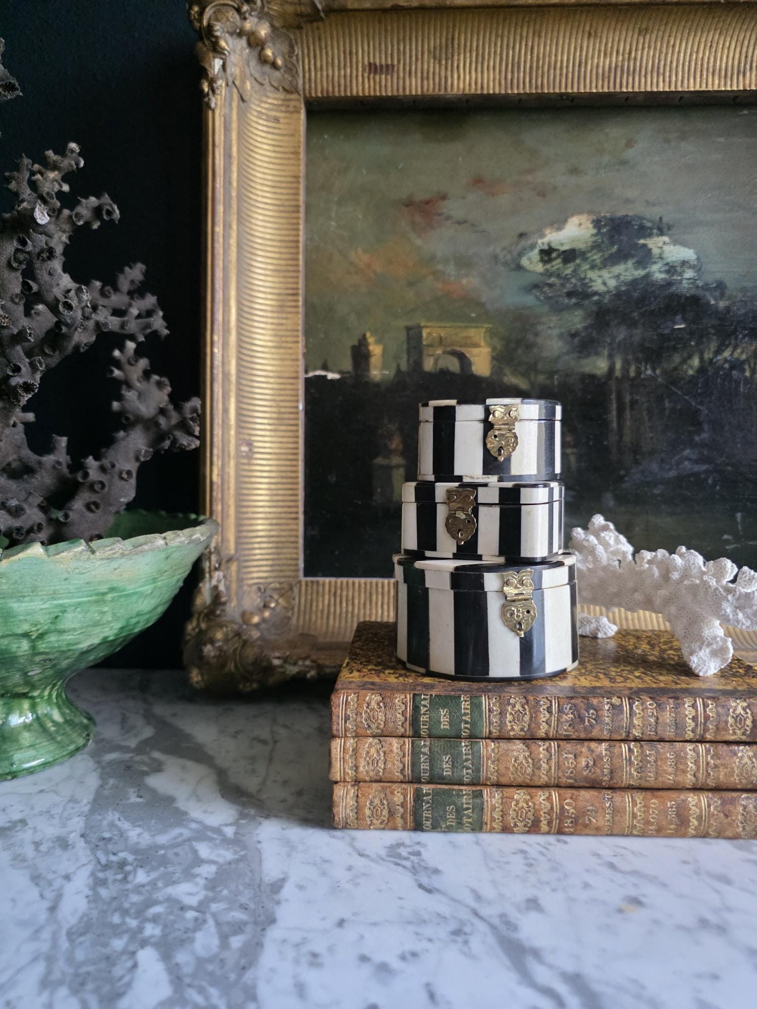 Add a touch of graphic sophistication to your vanity or shelf with this striking set of three vintage trinket boxes. Each box is crafted with bold, alternating stripes of black natural ivory-toned bone inlay, creating a high-contrast look that is both classic and visually arresting. The set features three distinct shapes—one round, one oval, and one rectangular with rounded corners—making them a versatile trio for organizing small treasures.