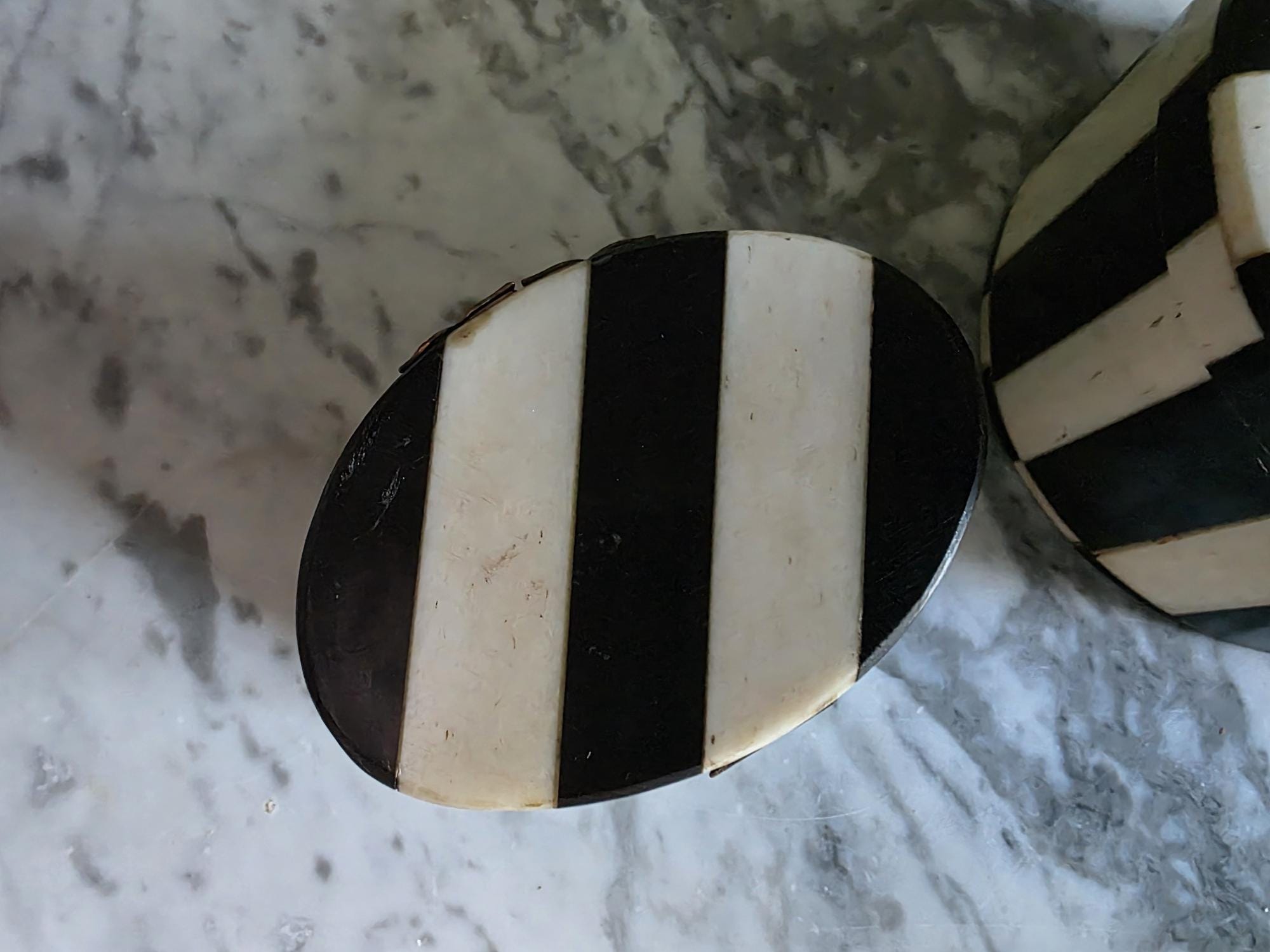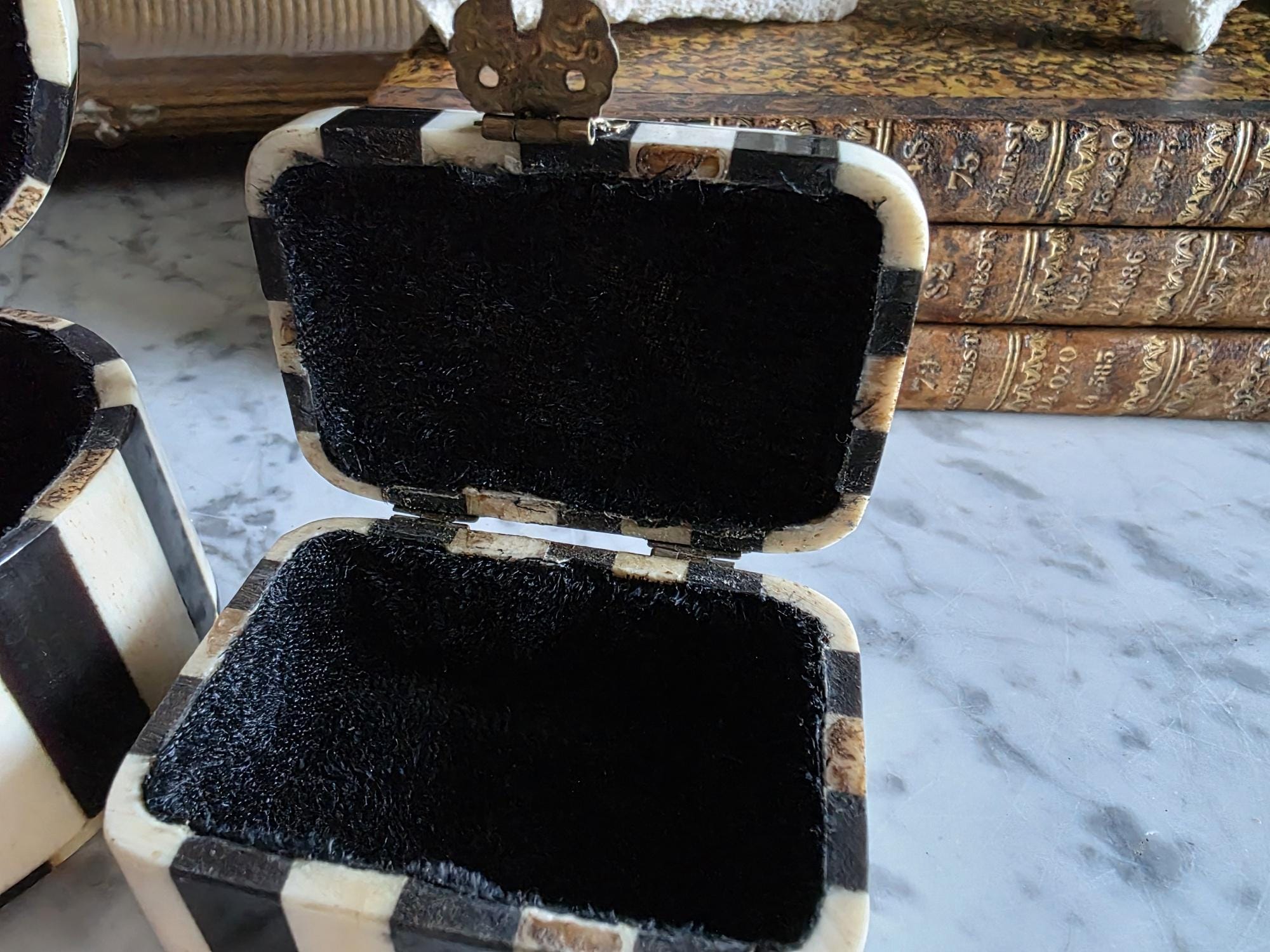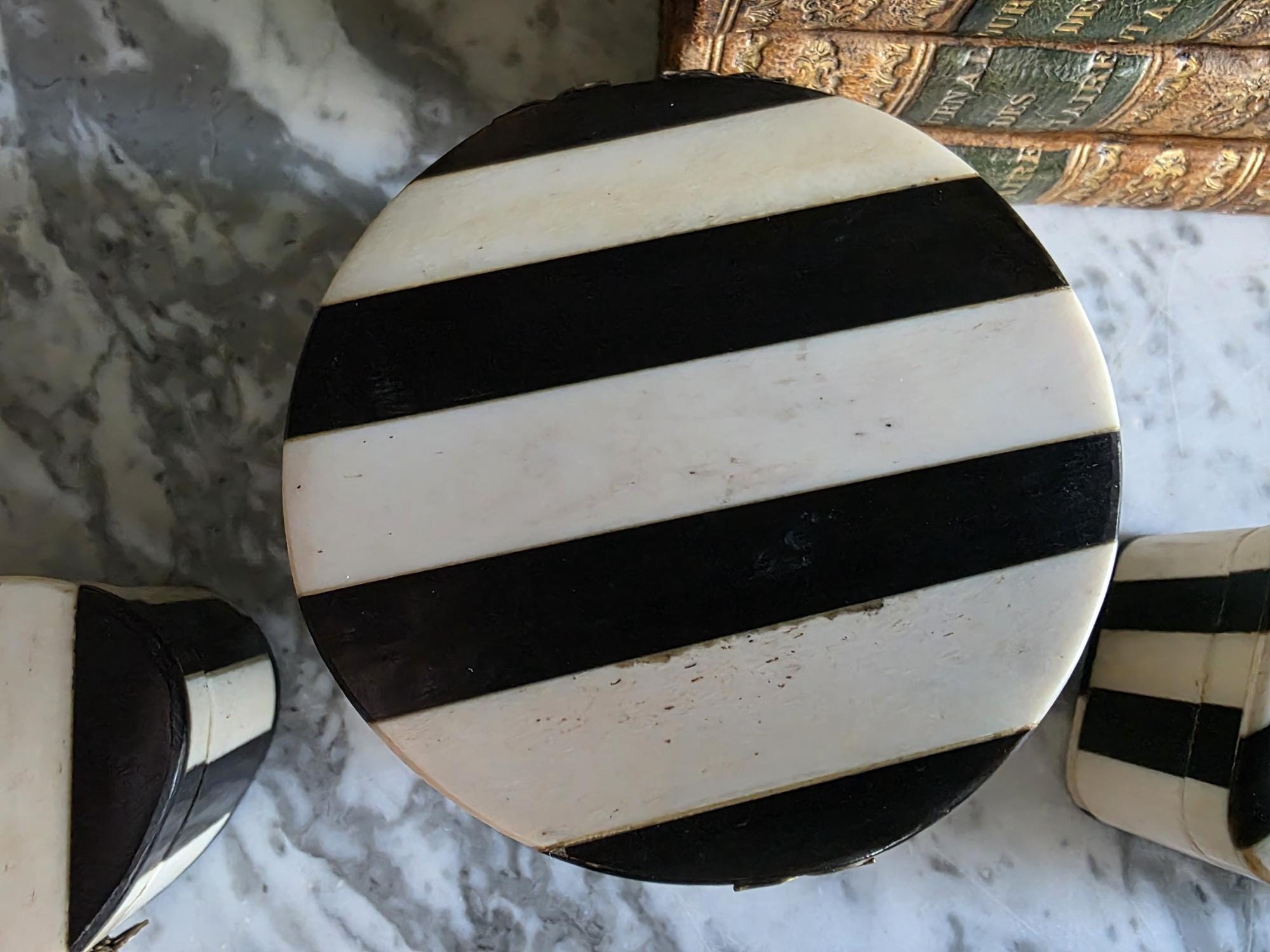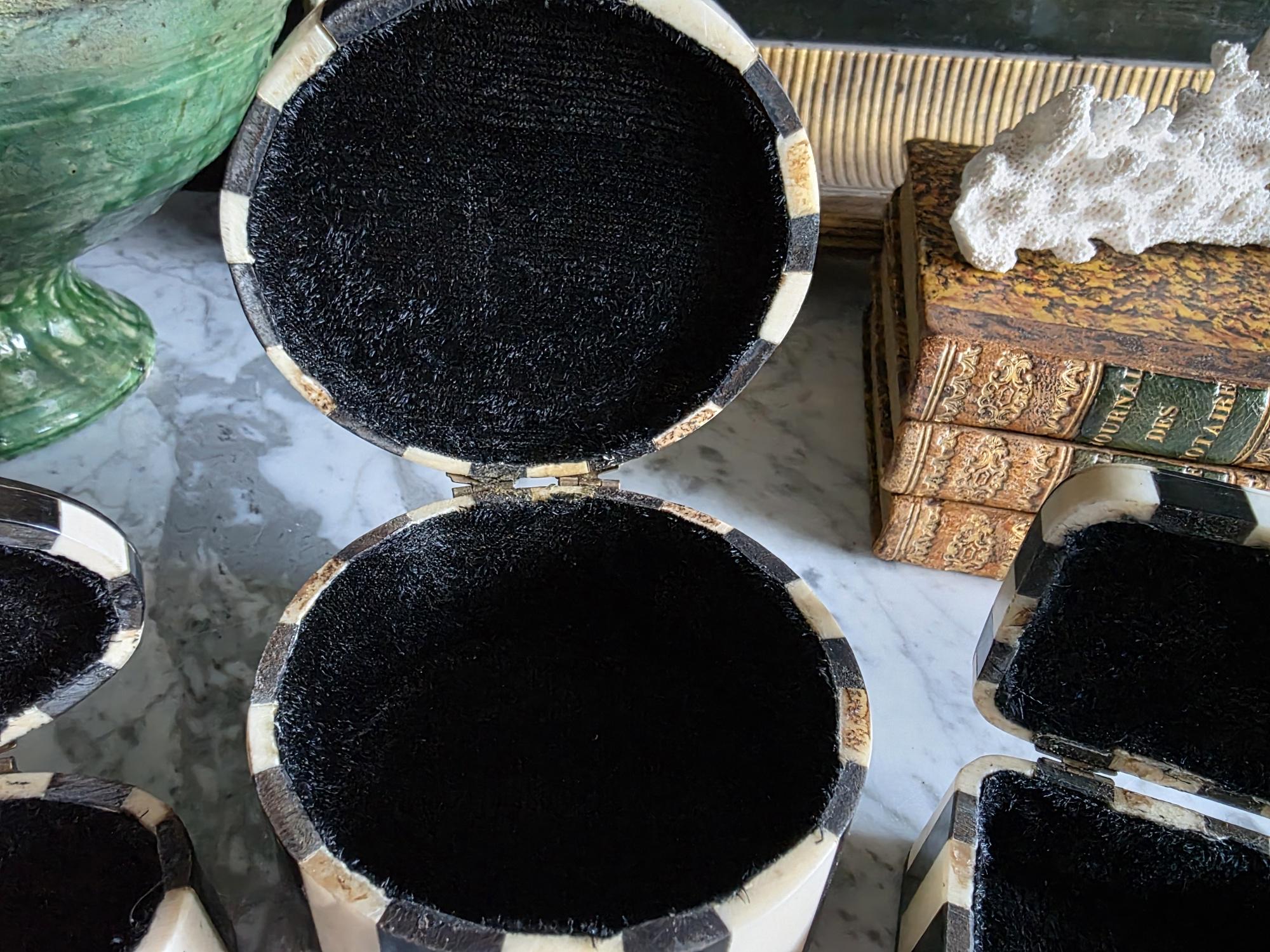 Add a touch of graphic sophistication to your vanity or shelf with this striking set of three vintage trinket boxes. Each box is crafted with bold, alternating stripes of black natural ivory-toned bone inlay, creating a high-contrast look that is both classic and visually arresting. The set features three distinct shapes—one round, one oval, and one rectangular with rounded corners—making them a versatile trio for organizing small treasures.