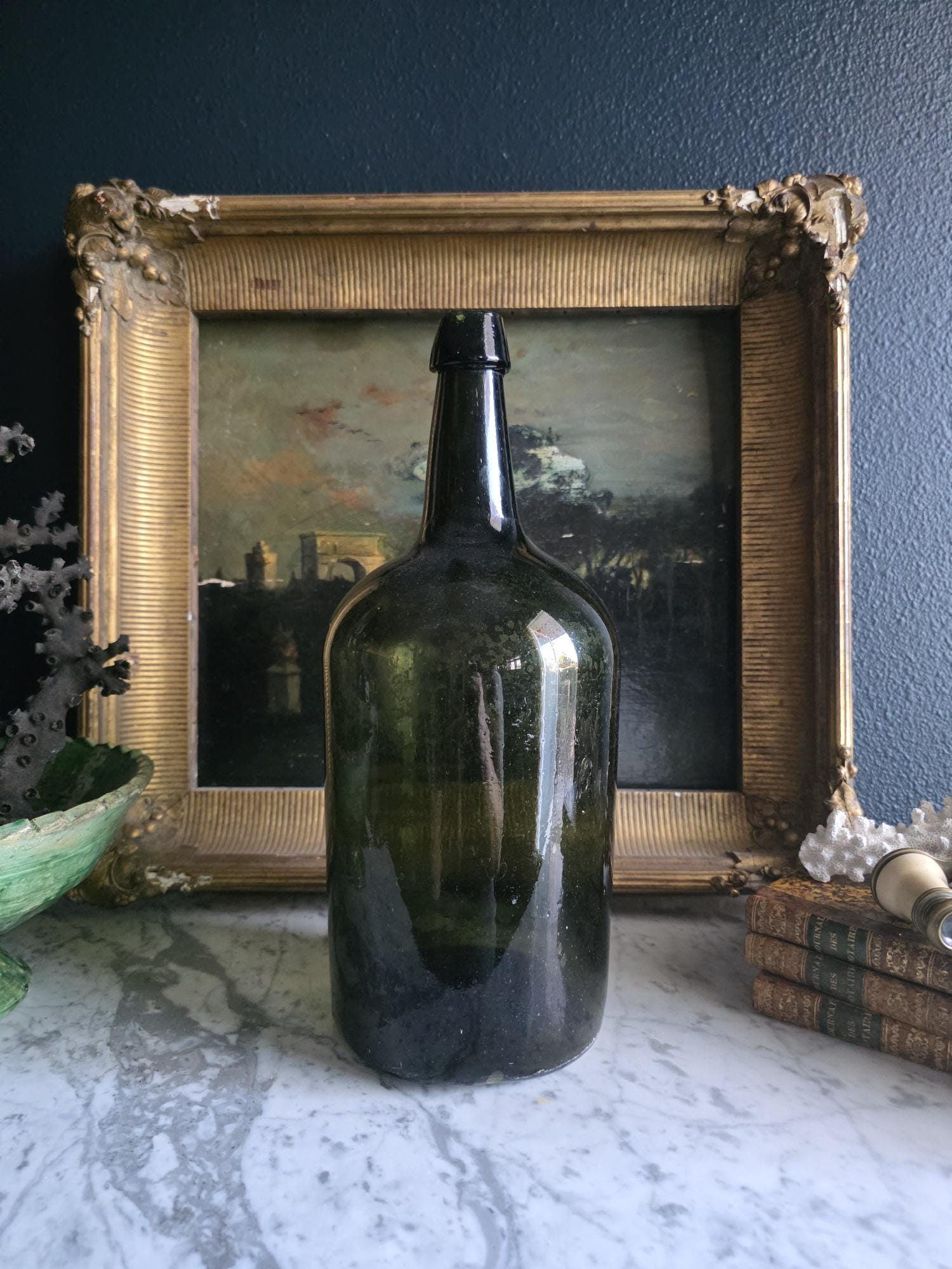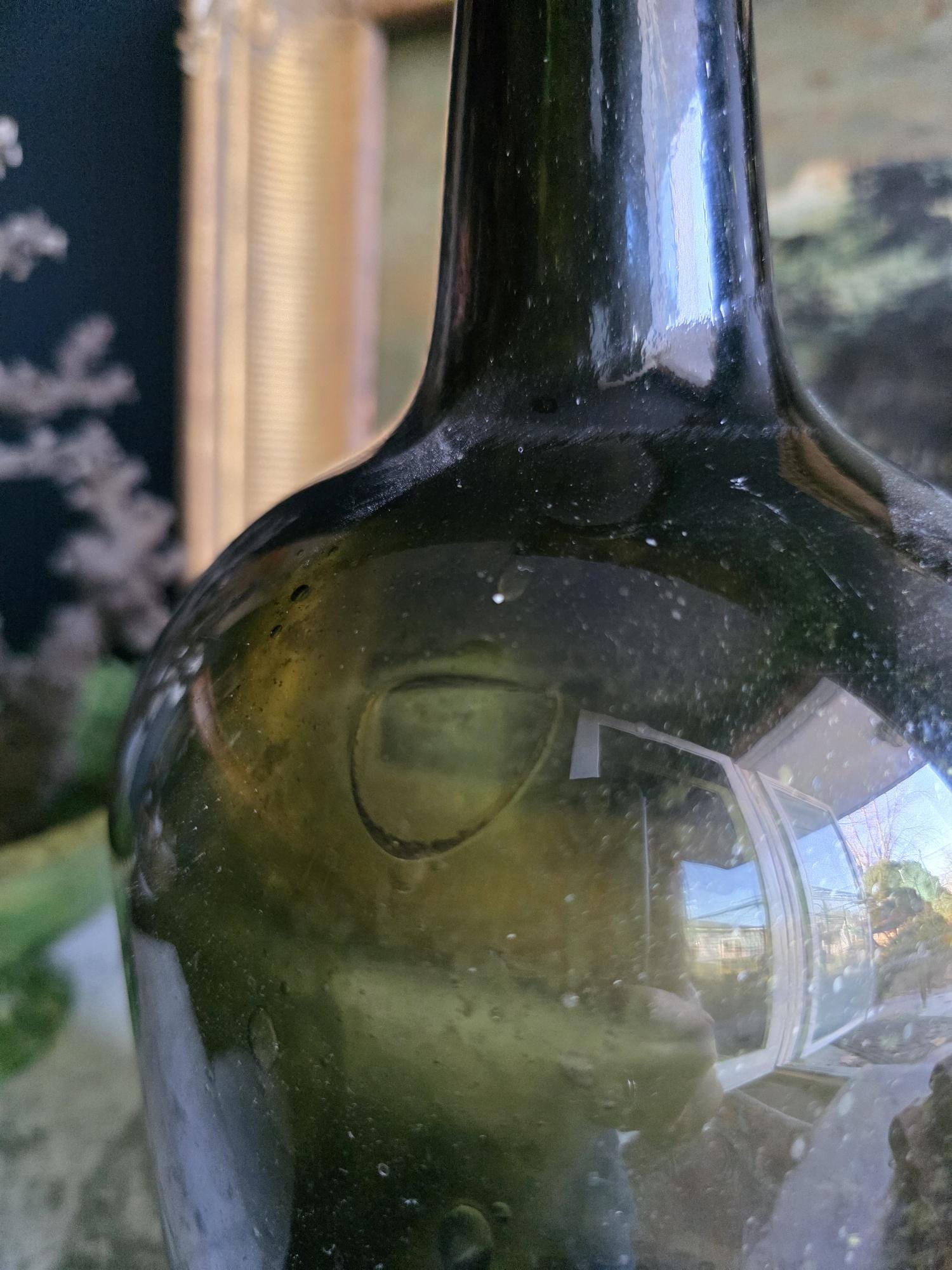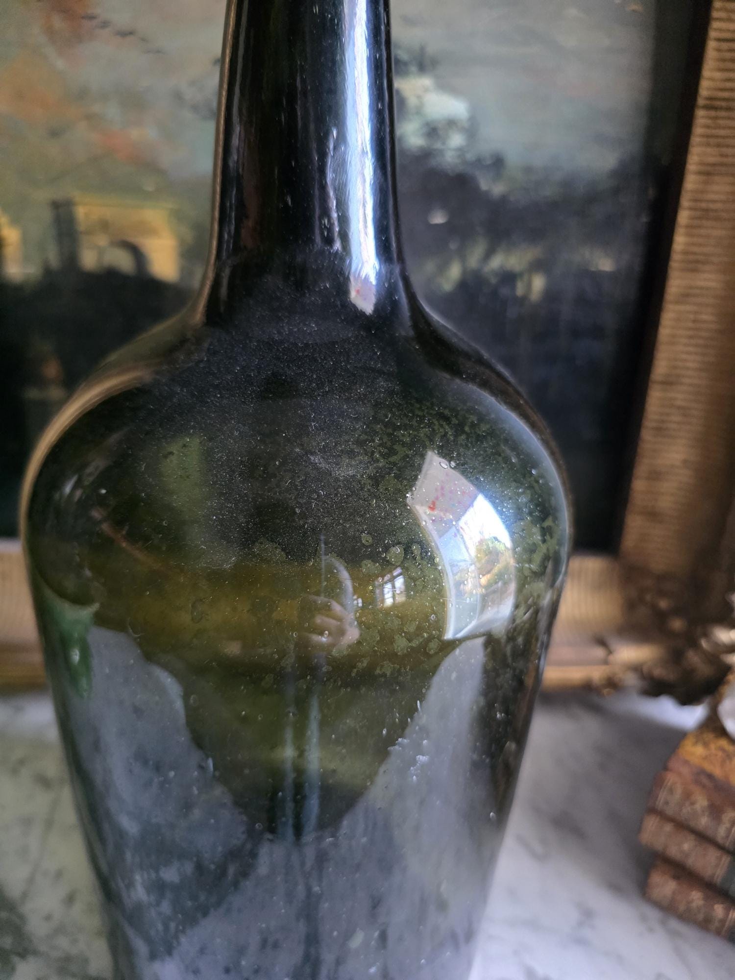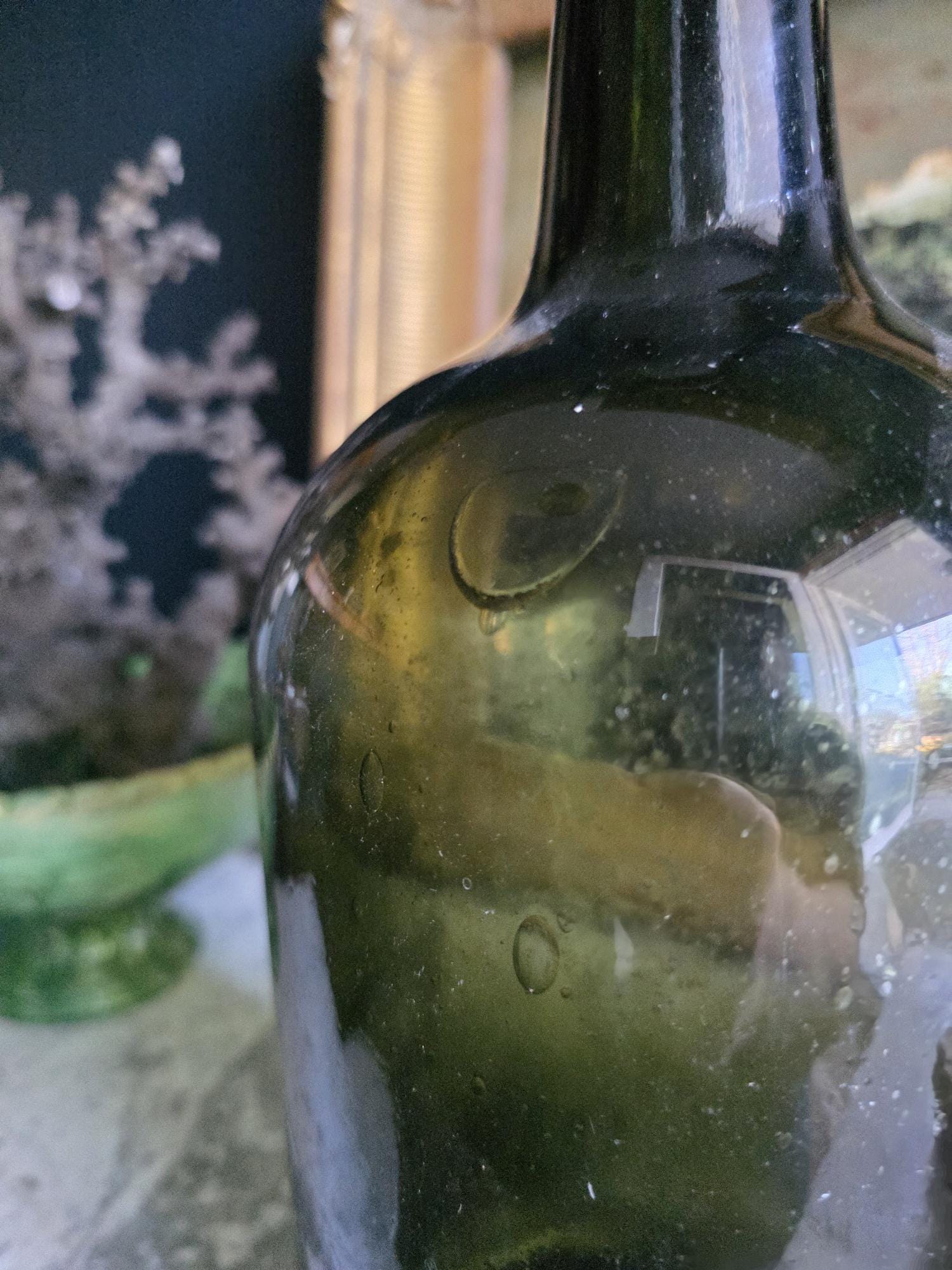 Add a piece of genuine history to your collection with this antique blown glass bottle, likely dating to the mid-to-late 19th century (c. 1860–1890). Known as "Black Glass" due to its deep, dark olive-green color that appears black in low light, this vessel was typically used for storing wine, port, or spirits. The glass is full of character, featuring numerous trapped air bubbles ("seeds"), whittle marks, and surface striations that serve as hallmarks of its hand-blown construction.