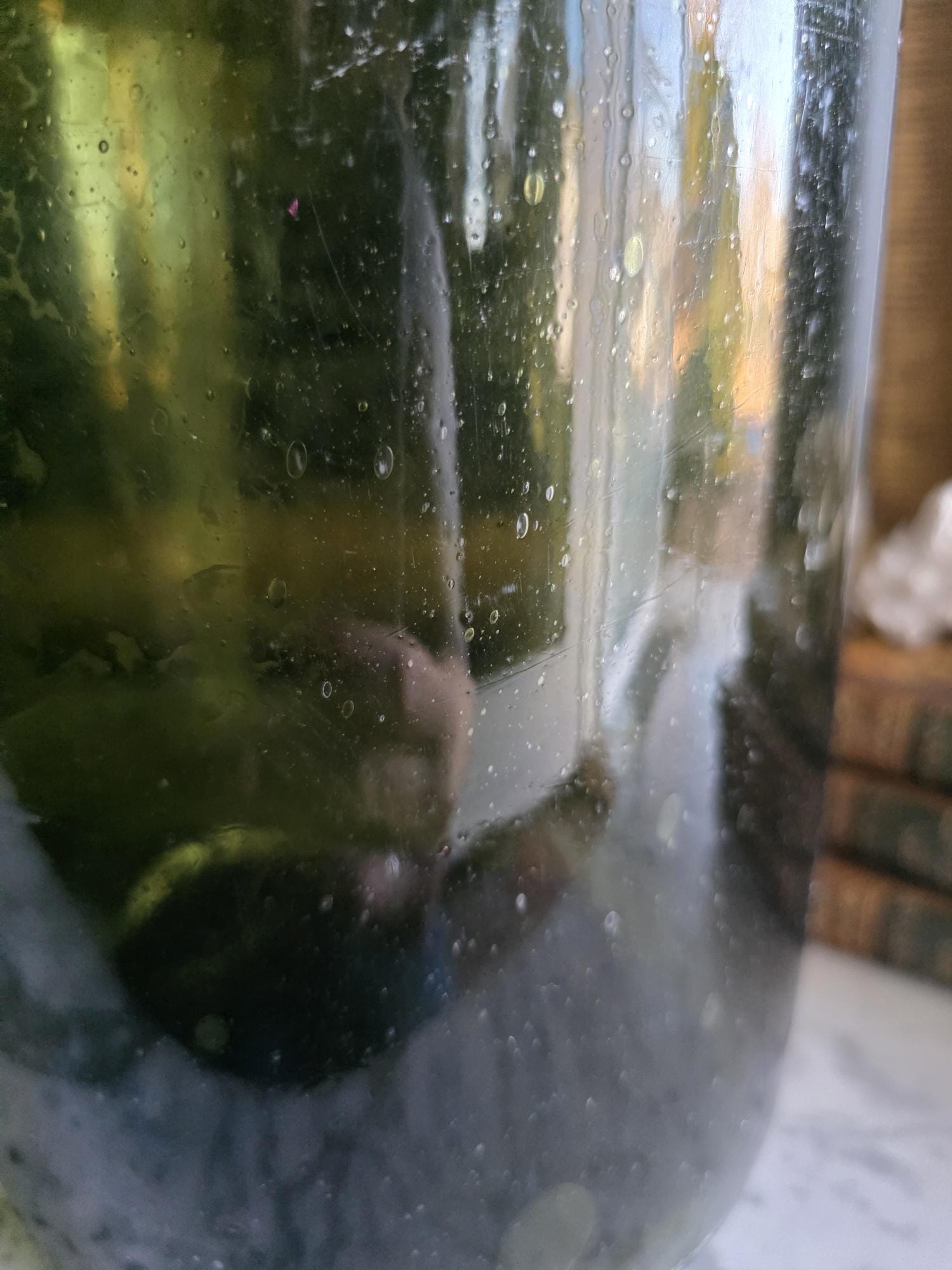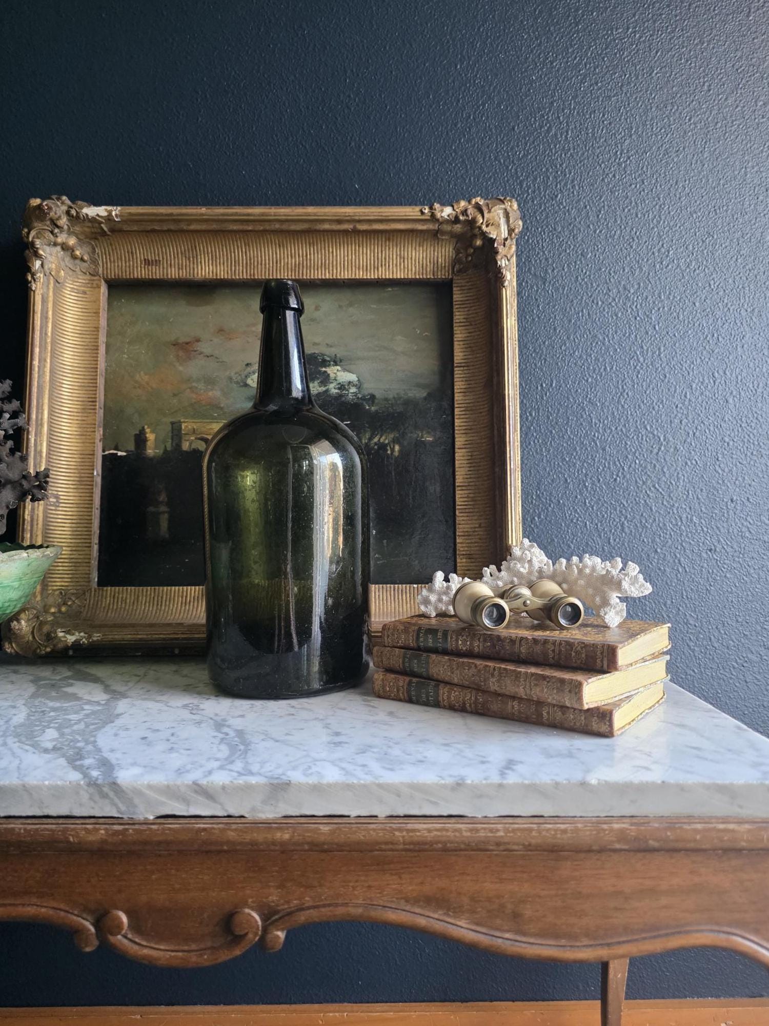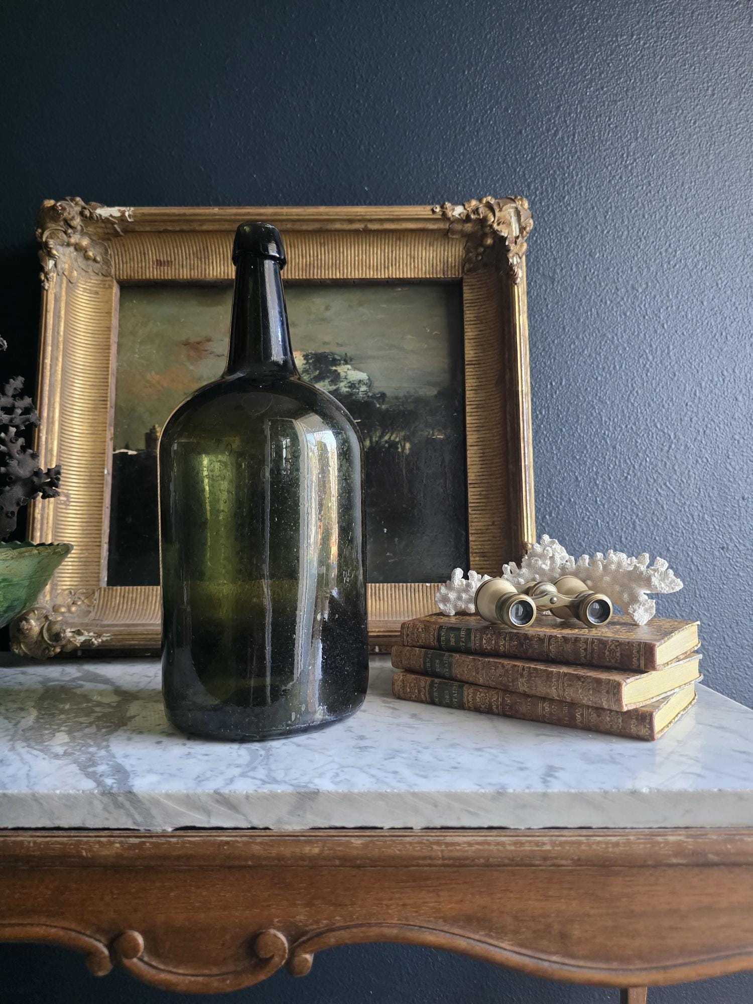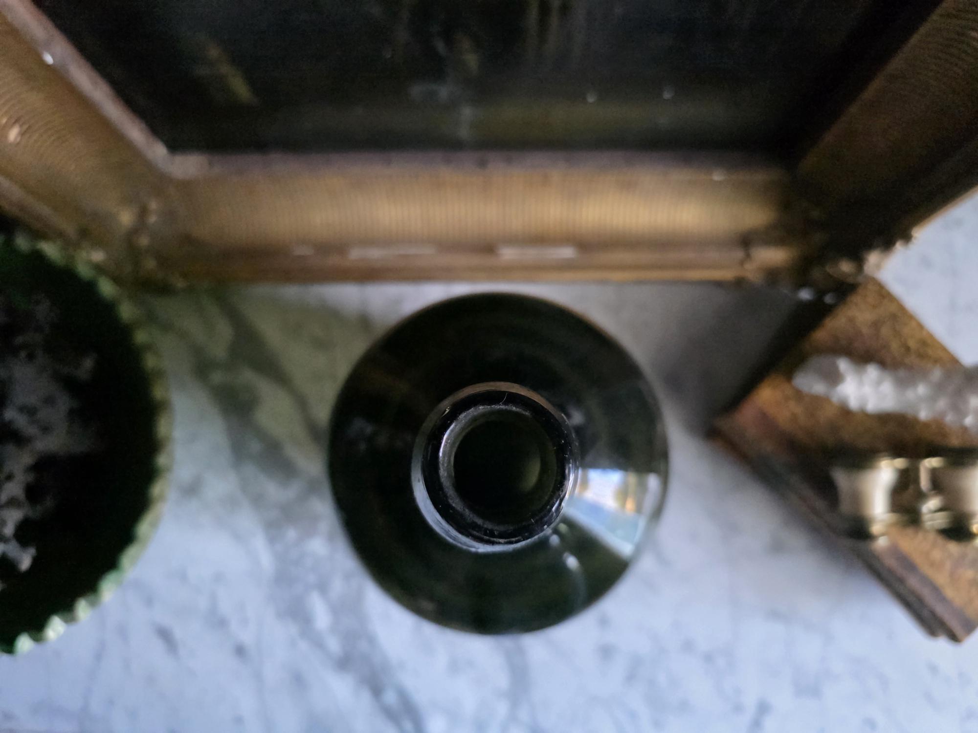 Add a piece of genuine history to your collection with this antique blown glass bottle, likely dating to the mid-to-late 19th century (c. 1860–1890). Known as "Black Glass" due to its deep, dark olive-green color that appears black in low light, this vessel was typically used for storing wine, port, or spirits. The glass is full of character, featuring numerous trapped air bubbles ("seeds"), whittle marks, and surface striations that serve as hallmarks of its hand-blown construction.