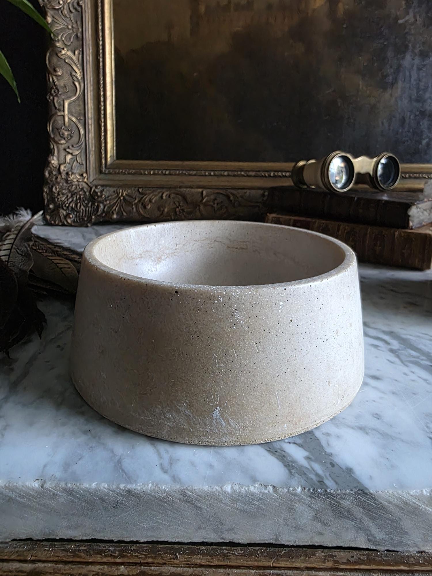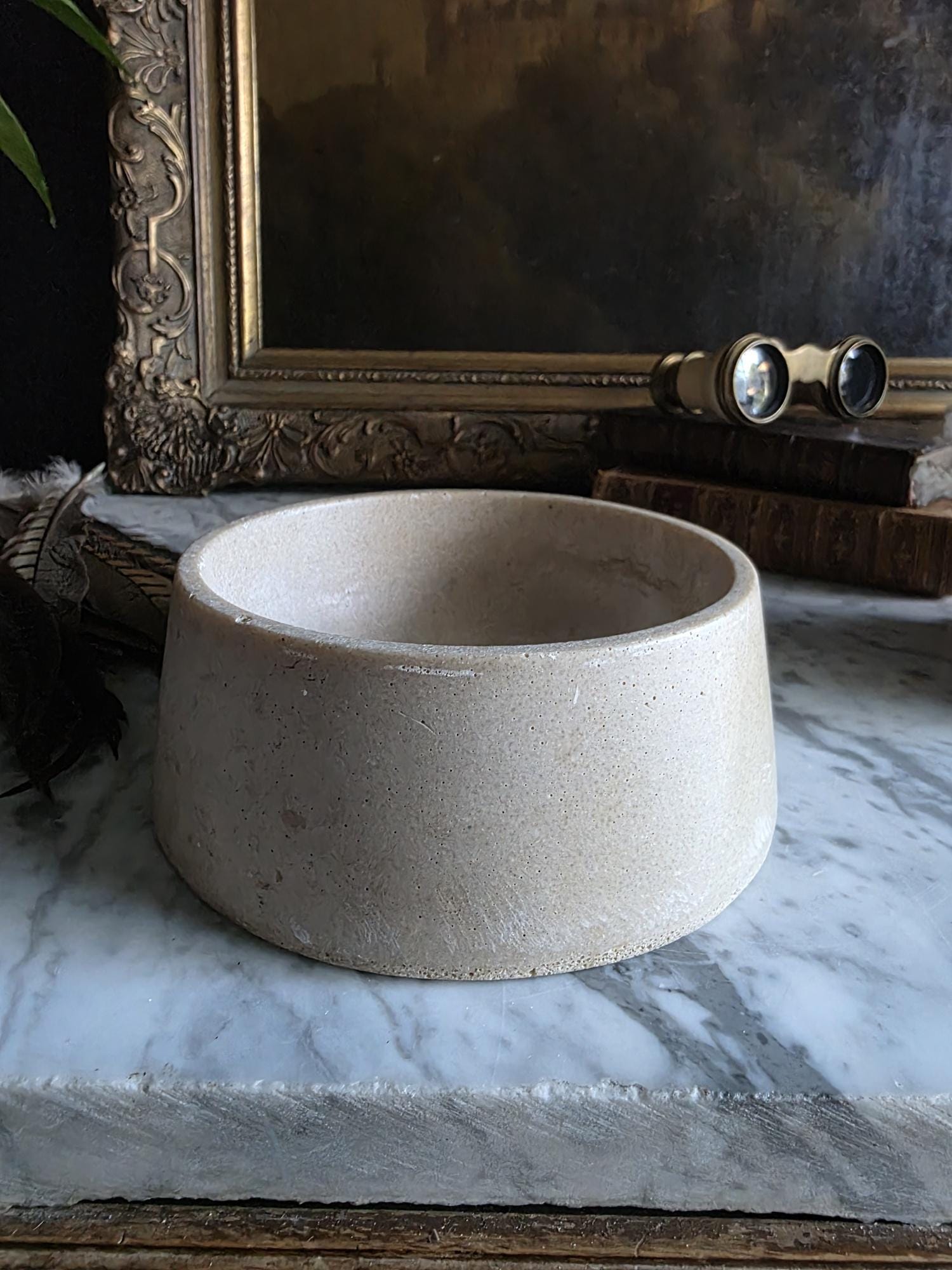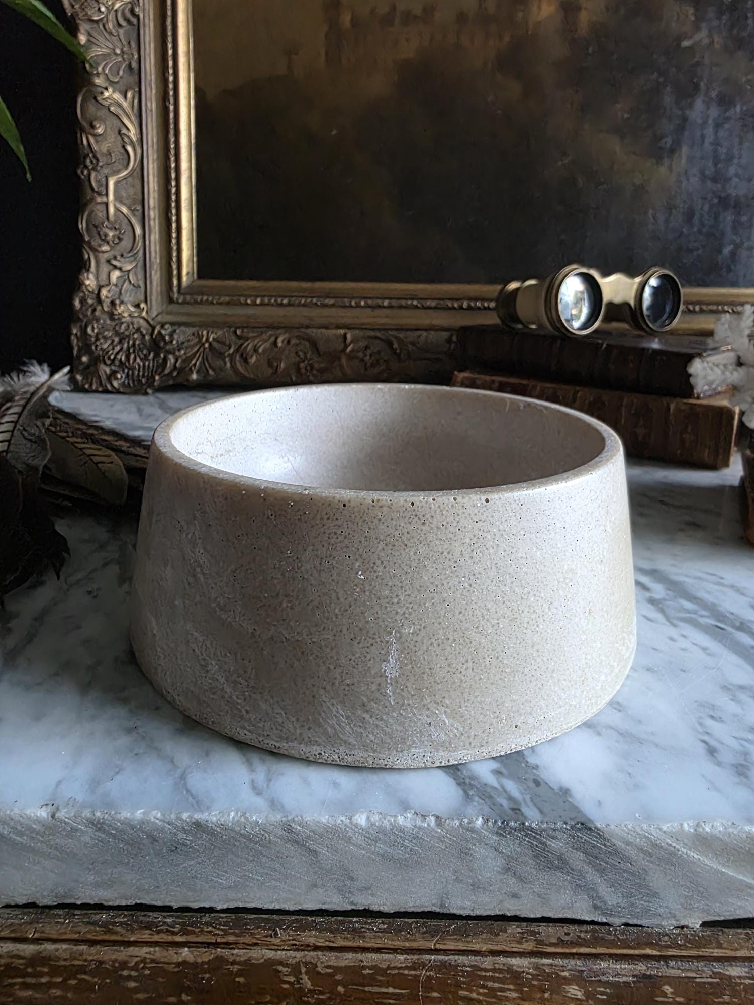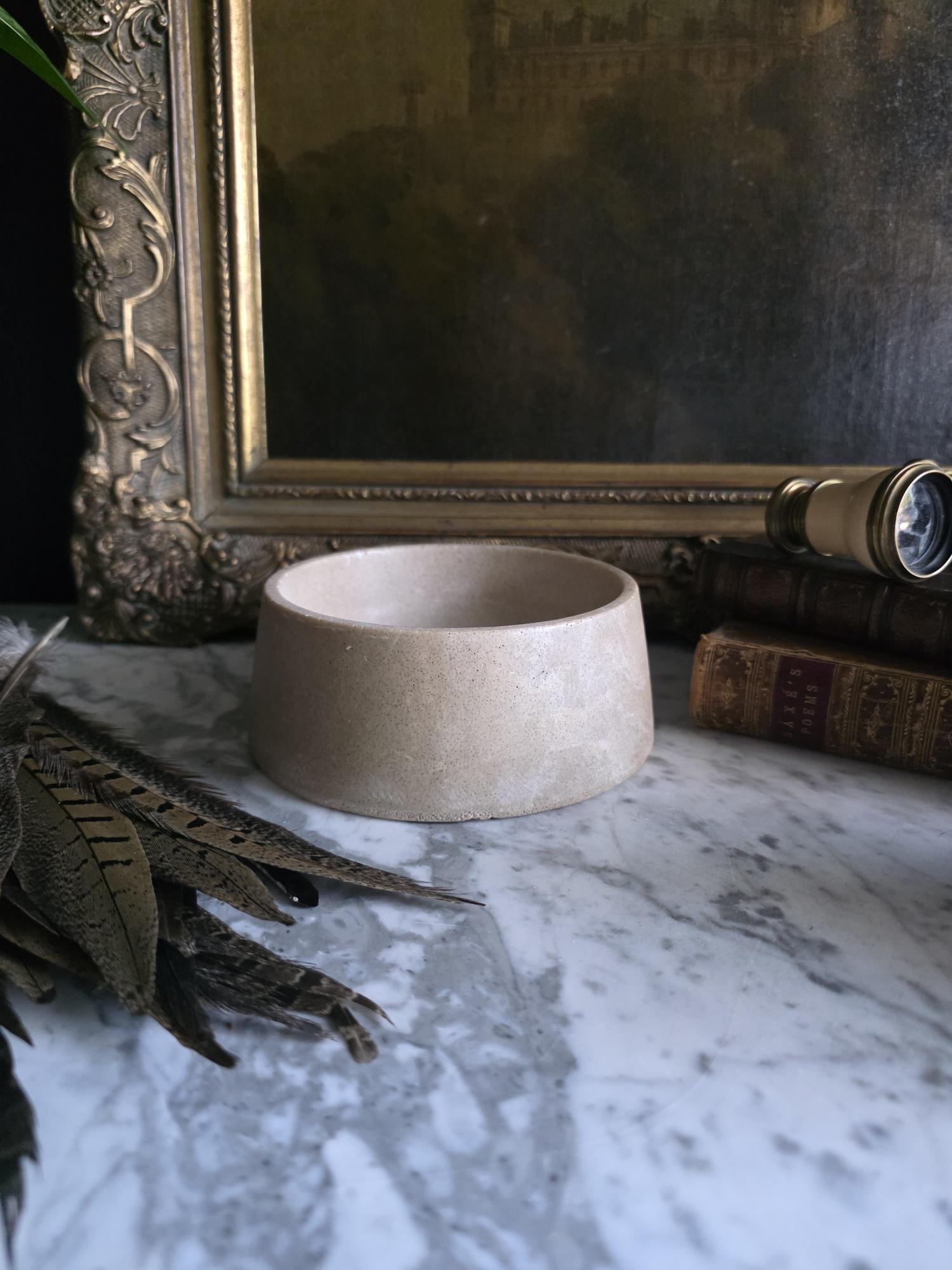 This vintage cast stoneware or concrete rabbit feeding bowl exudes a raw, industrial charm that makes it a standout piece of primitive decor. Defined by its cool neutral tones and heavily pitted texture, the bowl features the distinctive air bubbles and surface irregularities characteristic of utilitarian, hand-cast objects. Its thick walls and substantial weight were originally engineered to prevent tipping, giving the piece a satisfying heaviness and durability. The aesthetic is wonderfully brutalist and wabi-sabi, showing signs of its history with visible wear, including chipping along the bottom edge and a deeply textured, unrefined base. While it remains functional for small pets, its rugged, minimalist form makes it an ideal candidate for repurposing—imagine it as a striking planter for a single succulent, a holder for sage or palo santo, or a catch-all dish that adds a touch of grit to a moody, antique-filled vignette.