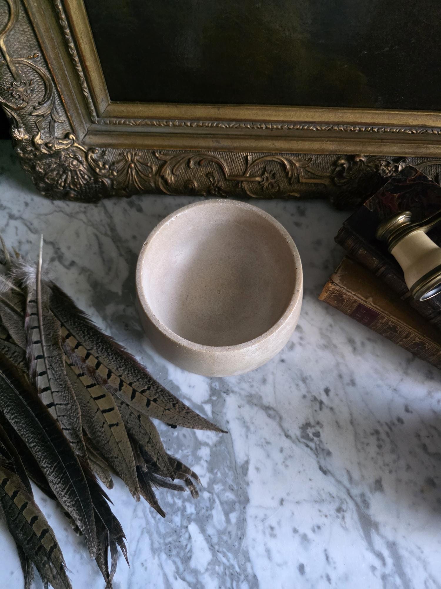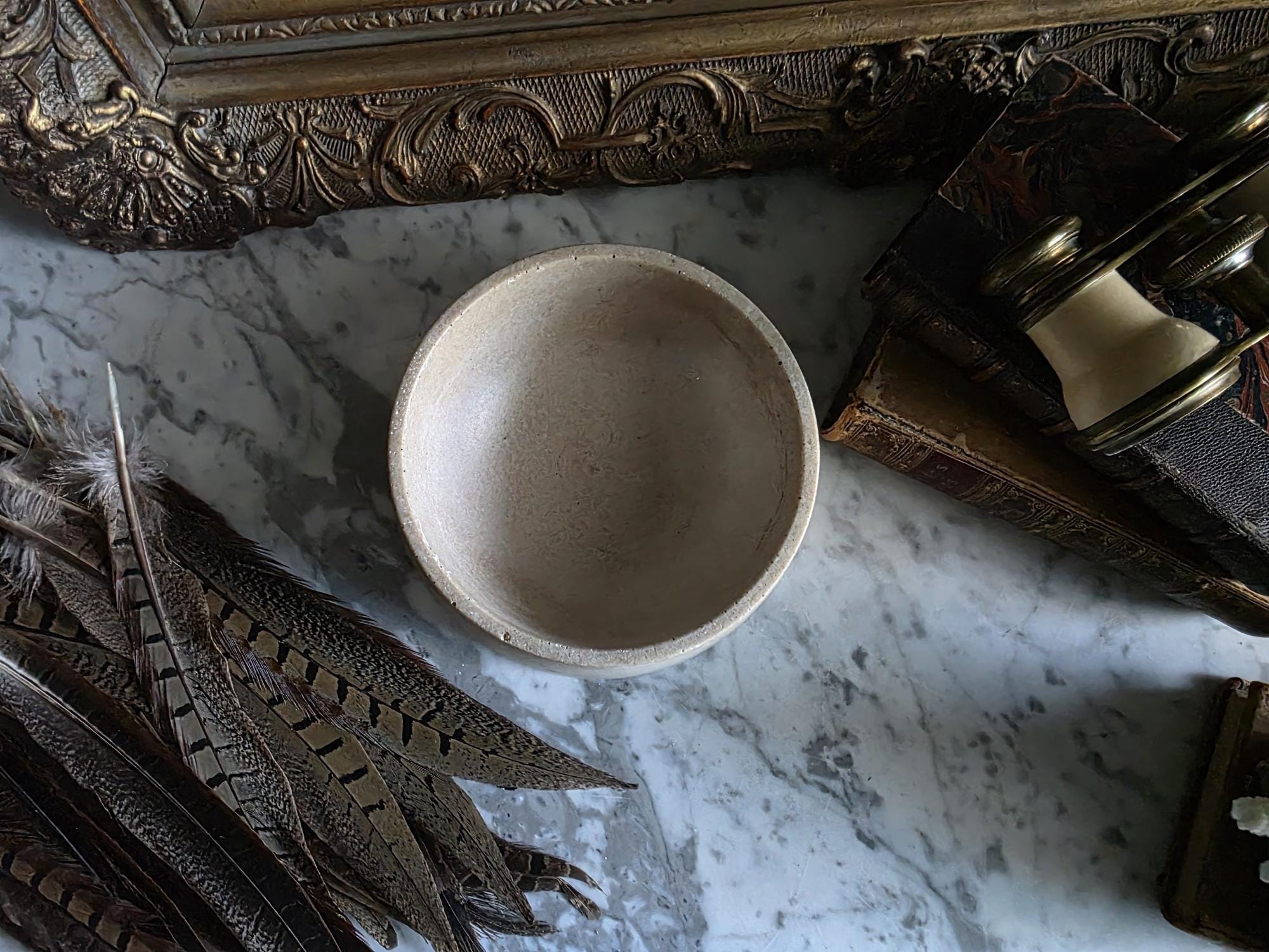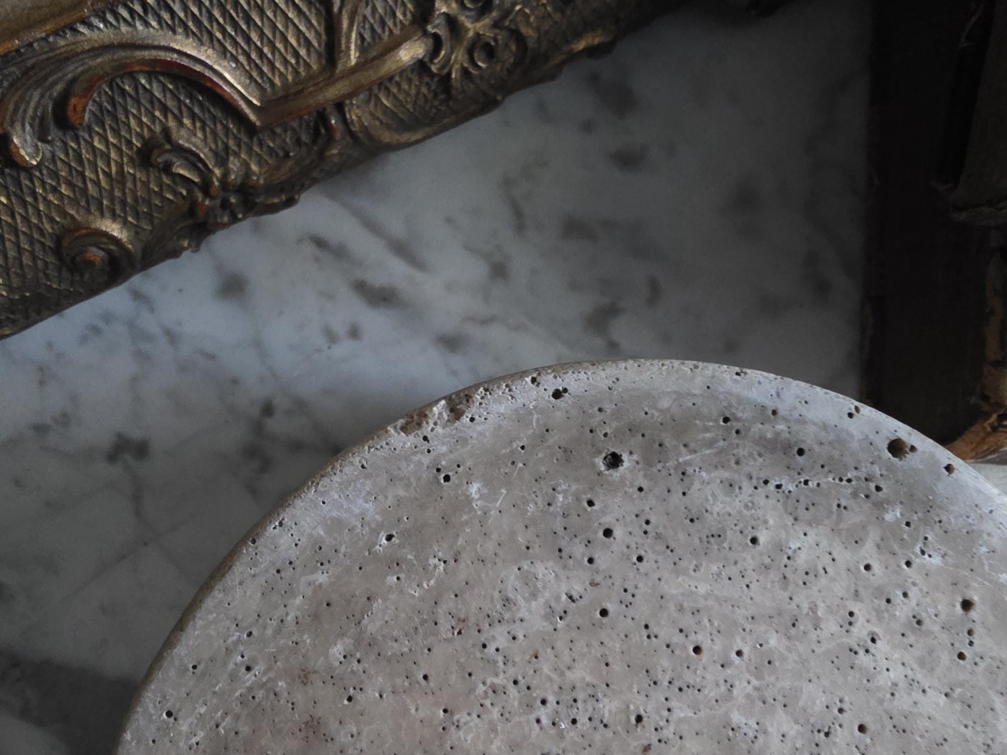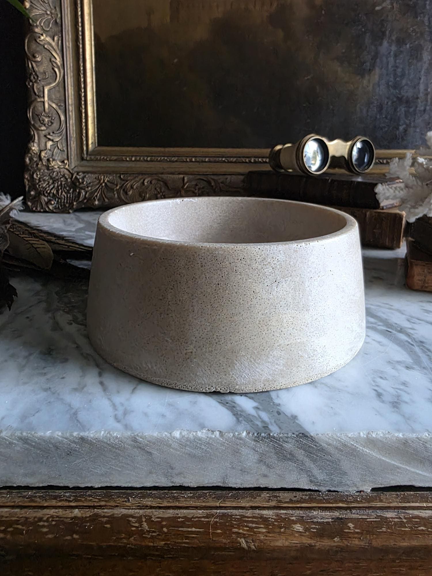 This vintage cast stoneware or concrete rabbit feeding bowl exudes a raw, industrial charm that makes it a standout piece of primitive decor. Defined by its cool neutral tones and heavily pitted texture, the bowl features the distinctive air bubbles and surface irregularities characteristic of utilitarian, hand-cast objects. Its thick walls and substantial weight were originally engineered to prevent tipping, giving the piece a satisfying heaviness and durability. The aesthetic is wonderfully brutalist and wabi-sabi, showing signs of its history with visible wear, including chipping along the bottom edge and a deeply textured, unrefined base. While it remains functional for small pets, its rugged, minimalist form makes it an ideal candidate for repurposing—imagine it as a striking planter for a single succulent, a holder for sage or palo santo, or a catch-all dish that adds a touch of grit to a moody, antique-filled vignette.