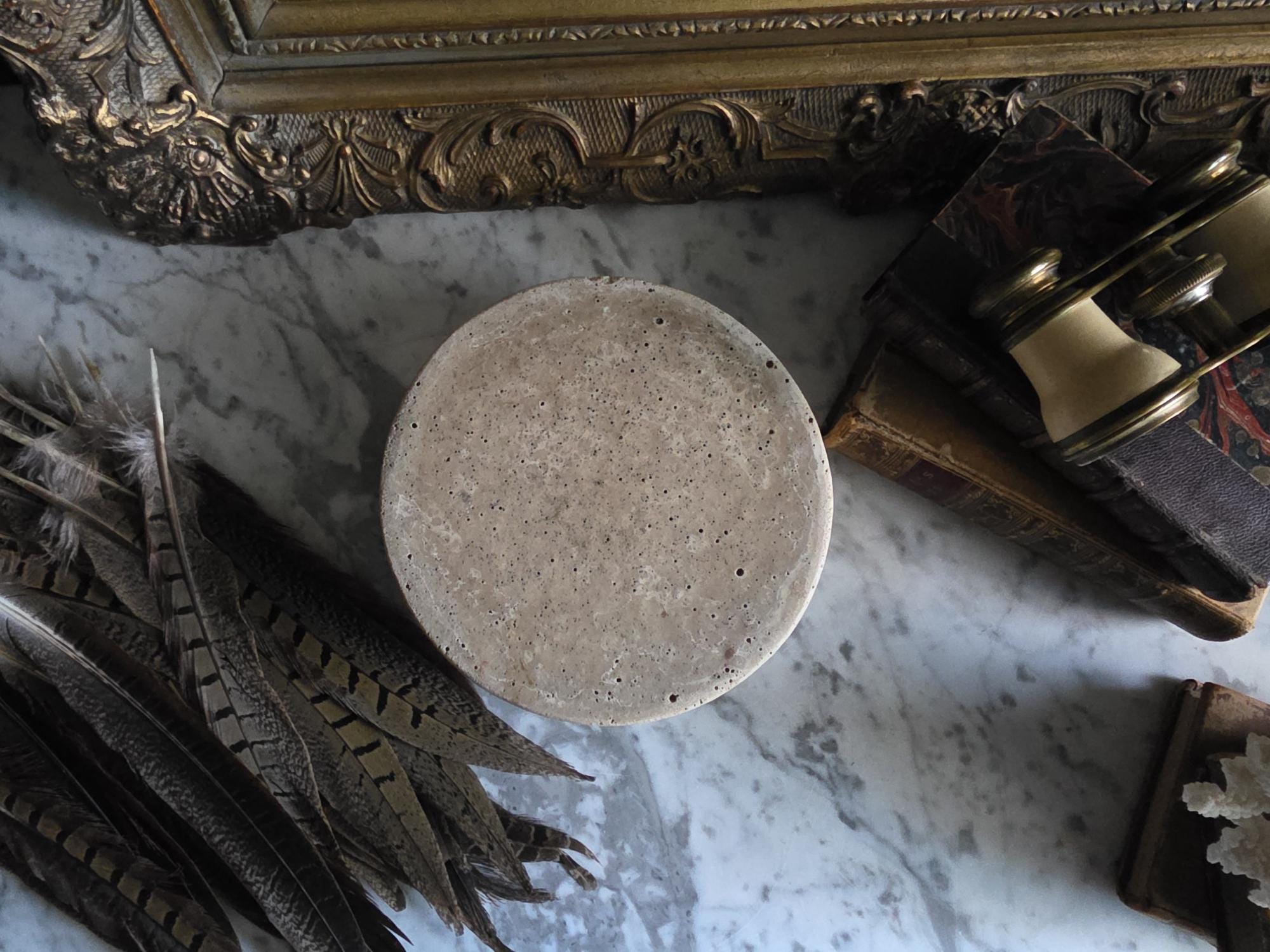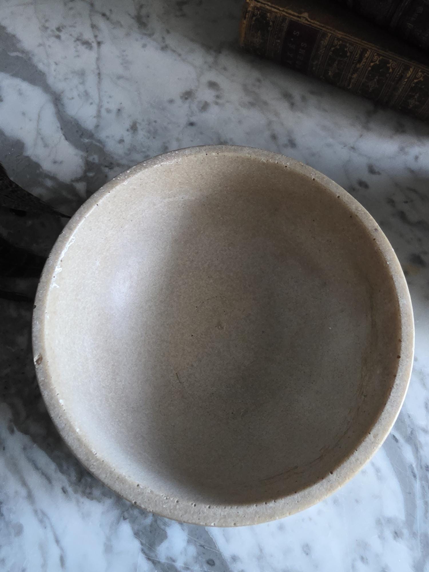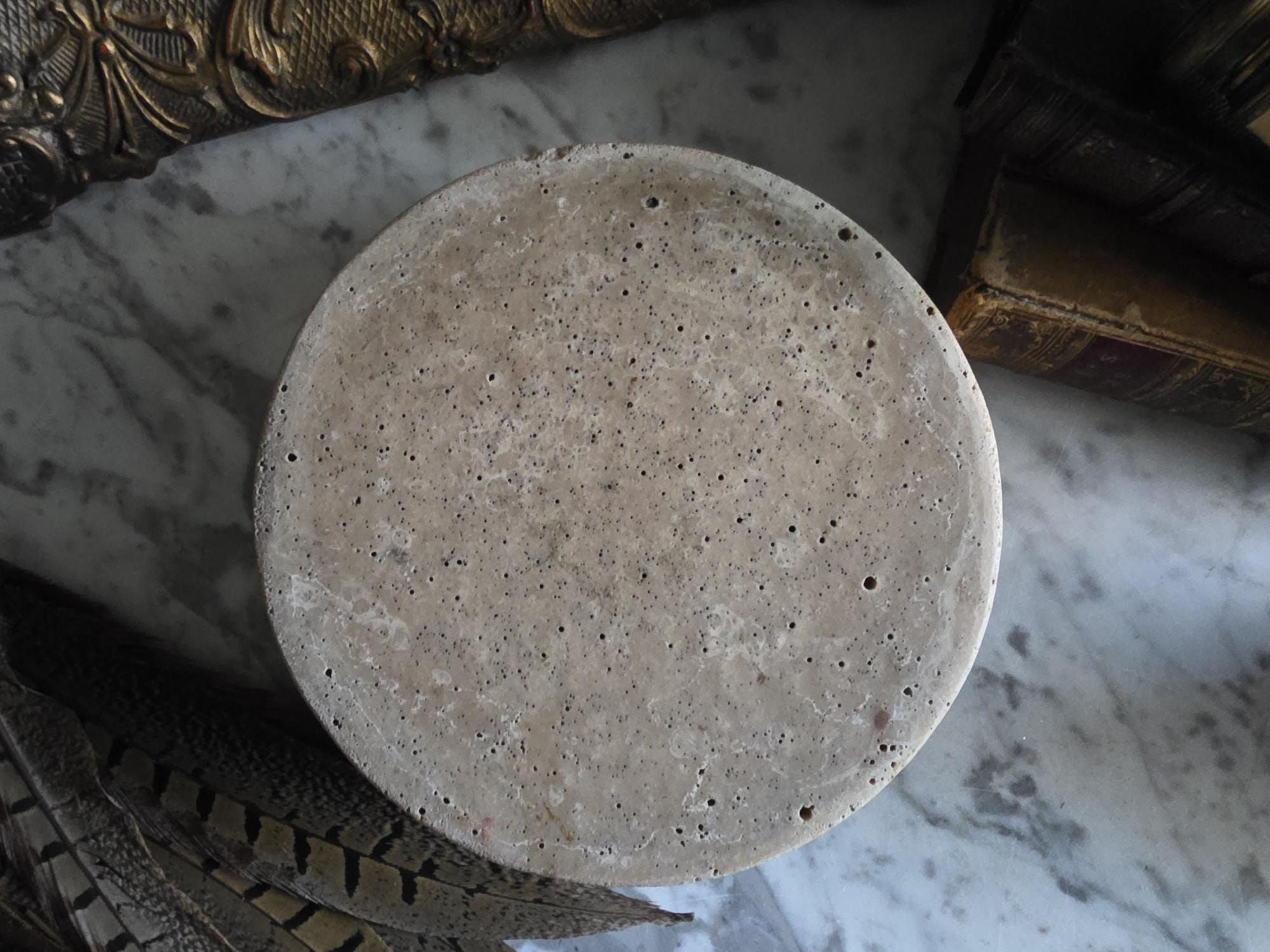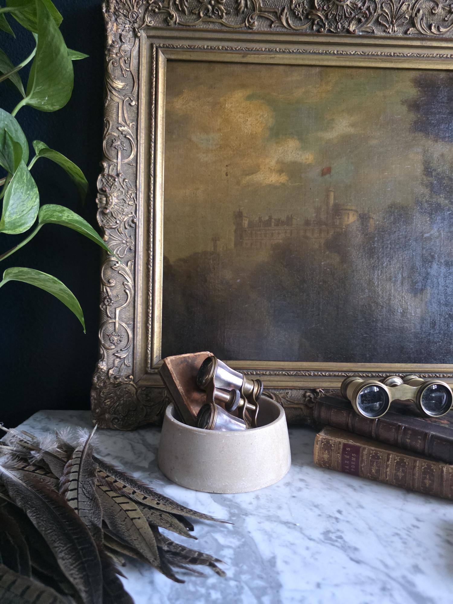 This vintage cast stoneware or concrete rabbit feeding bowl exudes a raw, industrial charm that makes it a standout piece of primitive decor. Defined by its cool neutral tones and heavily pitted texture, the bowl features the distinctive air bubbles and surface irregularities characteristic of utilitarian, hand-cast objects. Its thick walls and substantial weight were originally engineered to prevent tipping, giving the piece a satisfying heaviness and durability. The aesthetic is wonderfully brutalist and wabi-sabi, showing signs of its history with visible wear, including chipping along the bottom edge and a deeply textured, unrefined base. While it remains functional for small pets, its rugged, minimalist form makes it an ideal candidate for repurposing—imagine it as a striking planter for a single succulent, a holder for sage or palo santo, or a catch-all dish that adds a touch of grit to a moody, antique-filled vignette.