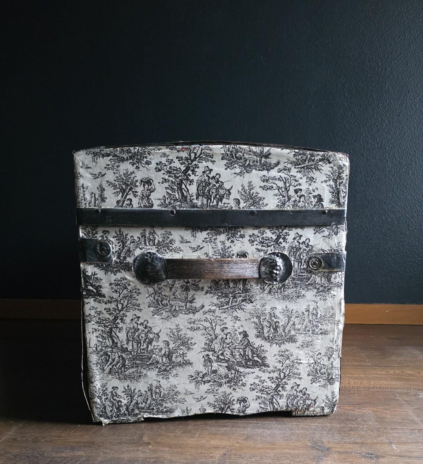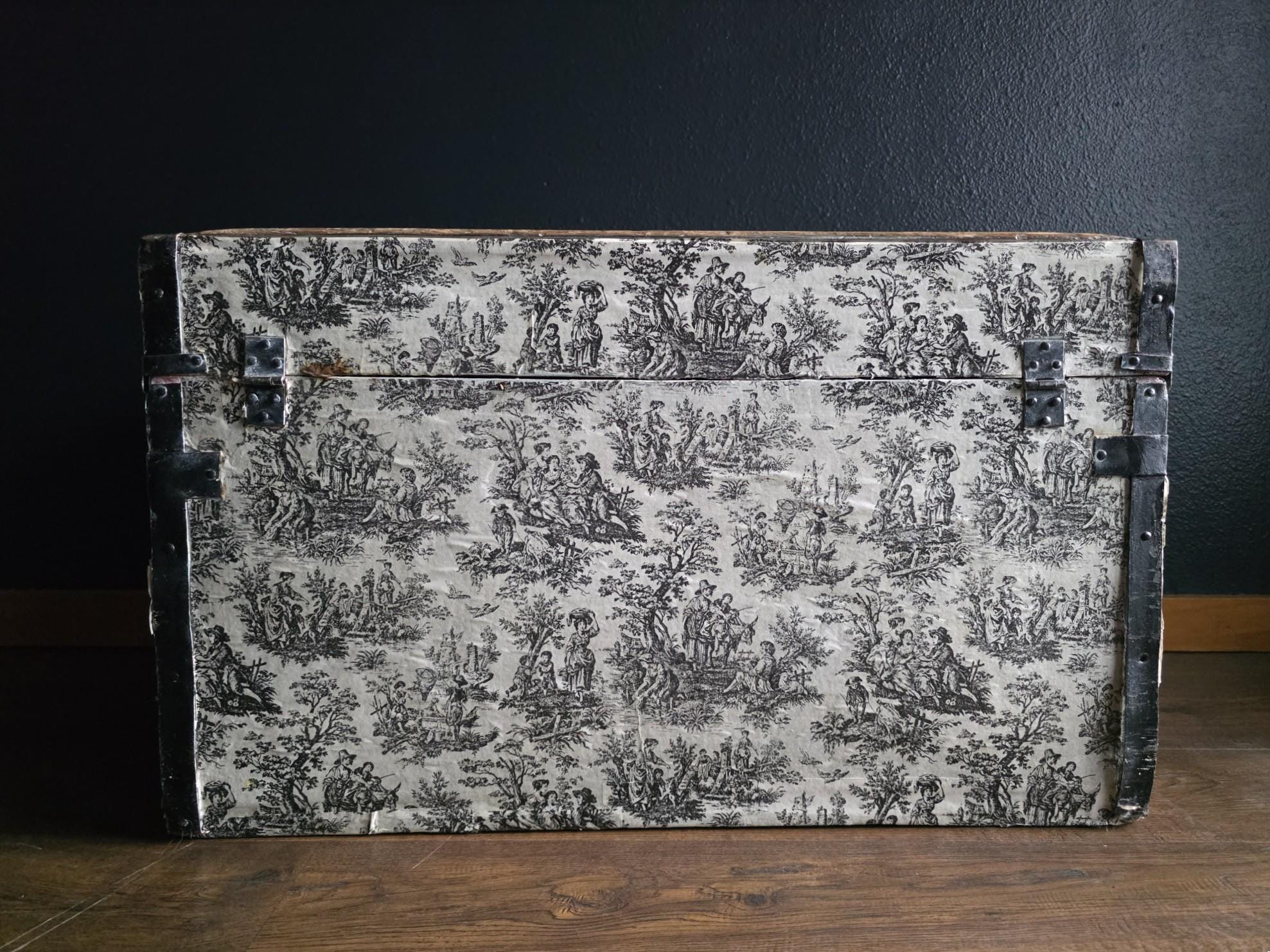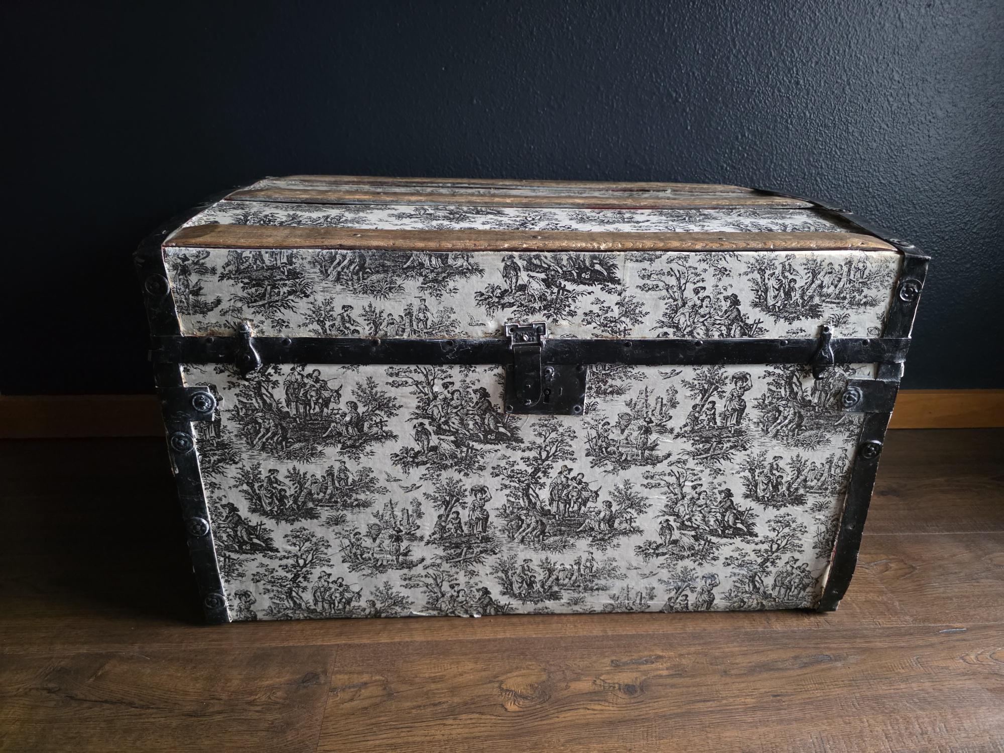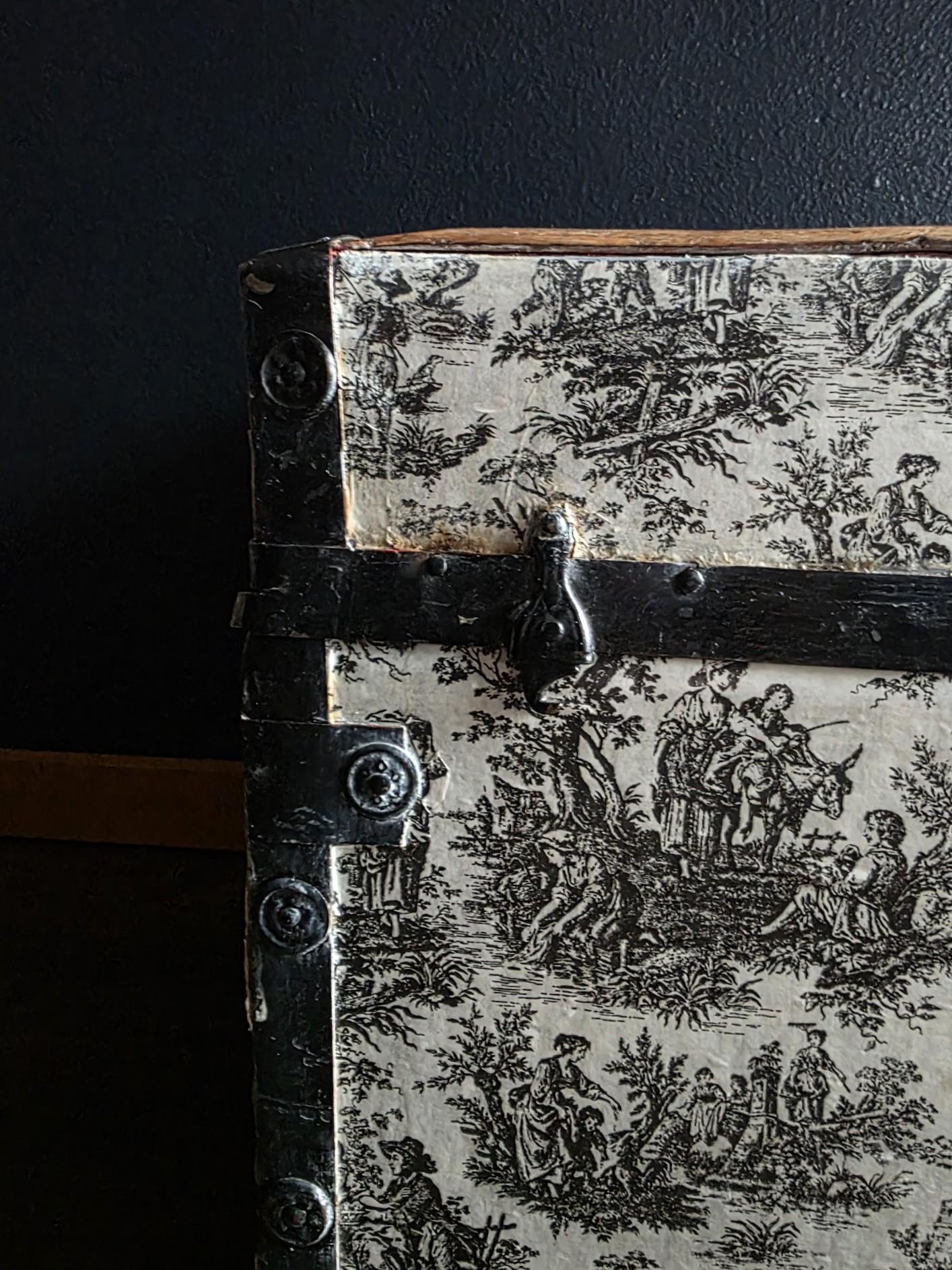 This distinctive antique steamer trunk, likely dating from the late 19th to early 20th century, showcases a striking Toile de Jouy paper covering featuring classic black and white pastoral scenes. The graphic print contrasts boldly with the black painted metal banding, creating a unique visual appeal that differs from standard vintage luggage. Embracing a true aesthetic, the exterior is heavily distressed with visible paper loss, peeling, staining, and discoloration consistent with its age. While the trunk retains its sturdy form and intact side handles, please note that several rivets securing the metal banding are missing in instances (see listing photos closely). The interior features a vibrant red and gold embossed paper lining; however, this appears to be a later addition and not original to the trunk. This character-filled piece would serve perfectly as a vintage coffee table, vignette accent, or decorative storage chest for those who appreciate authentic historical wear.