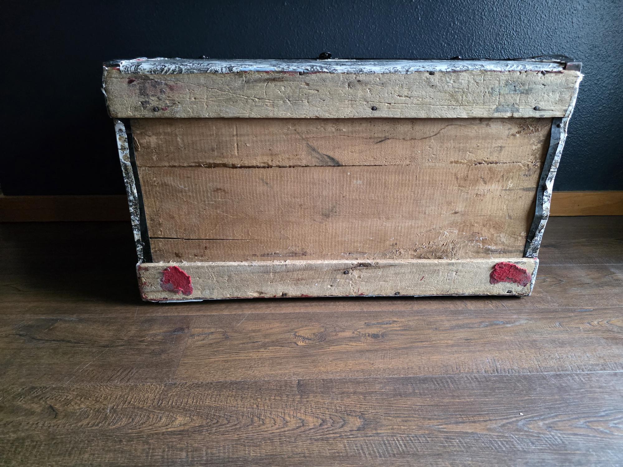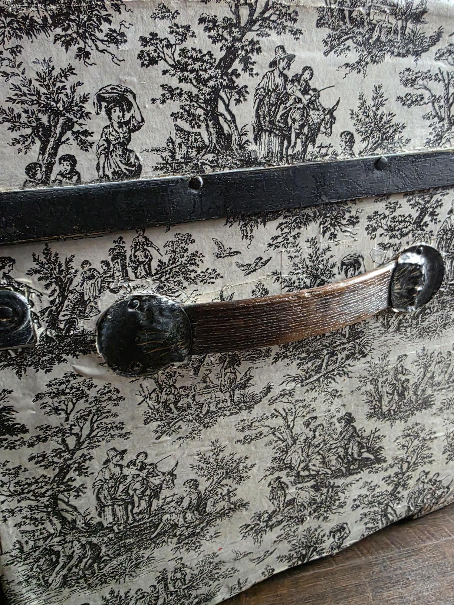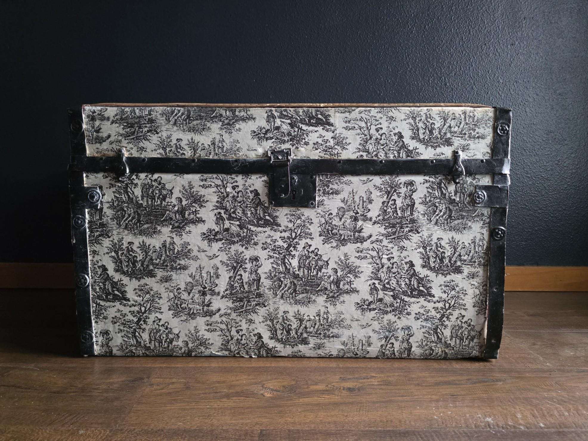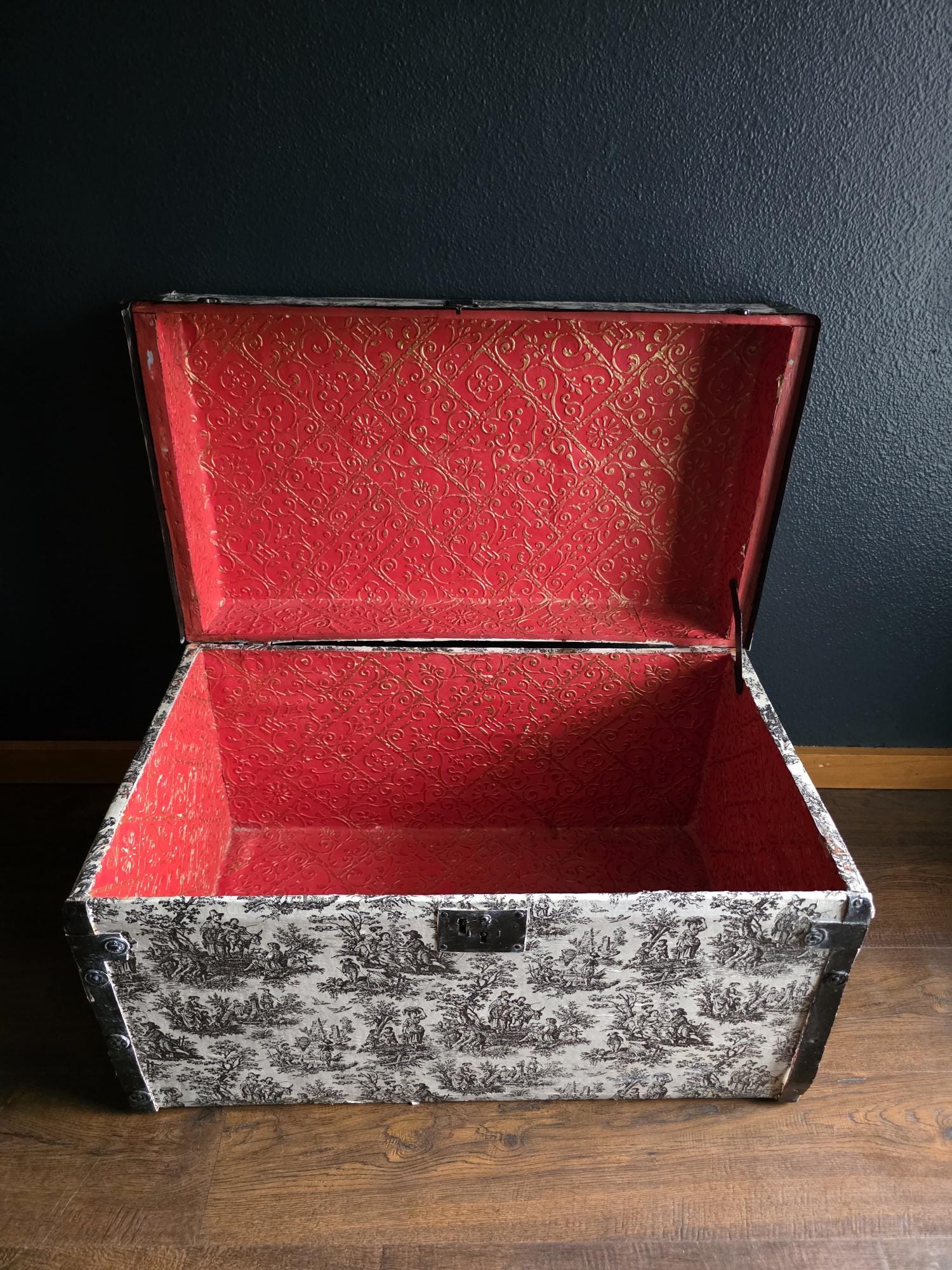This distinctive antique steamer trunk, likely dating from the late 19th to early 20th century, showcases a striking Toile de Jouy paper covering featuring classic black and white pastoral scenes. The graphic print contrasts boldly with the black painted metal banding, creating a unique visual appeal that differs from standard vintage luggage. Embracing a true aesthetic, the exterior is heavily distressed with visible paper loss, peeling, staining, and discoloration consistent with its age. While the trunk retains its sturdy form and intact side handles, please note that several rivets securing the metal banding are missing in instances (see listing photos closely). The interior features a vibrant red and gold embossed paper lining; however, this appears to be a later addition and not original to the trunk. This character-filled piece would serve perfectly as a vintage coffee table, vignette accent, or decorative storage chest for those who appreciate authentic historical wear.