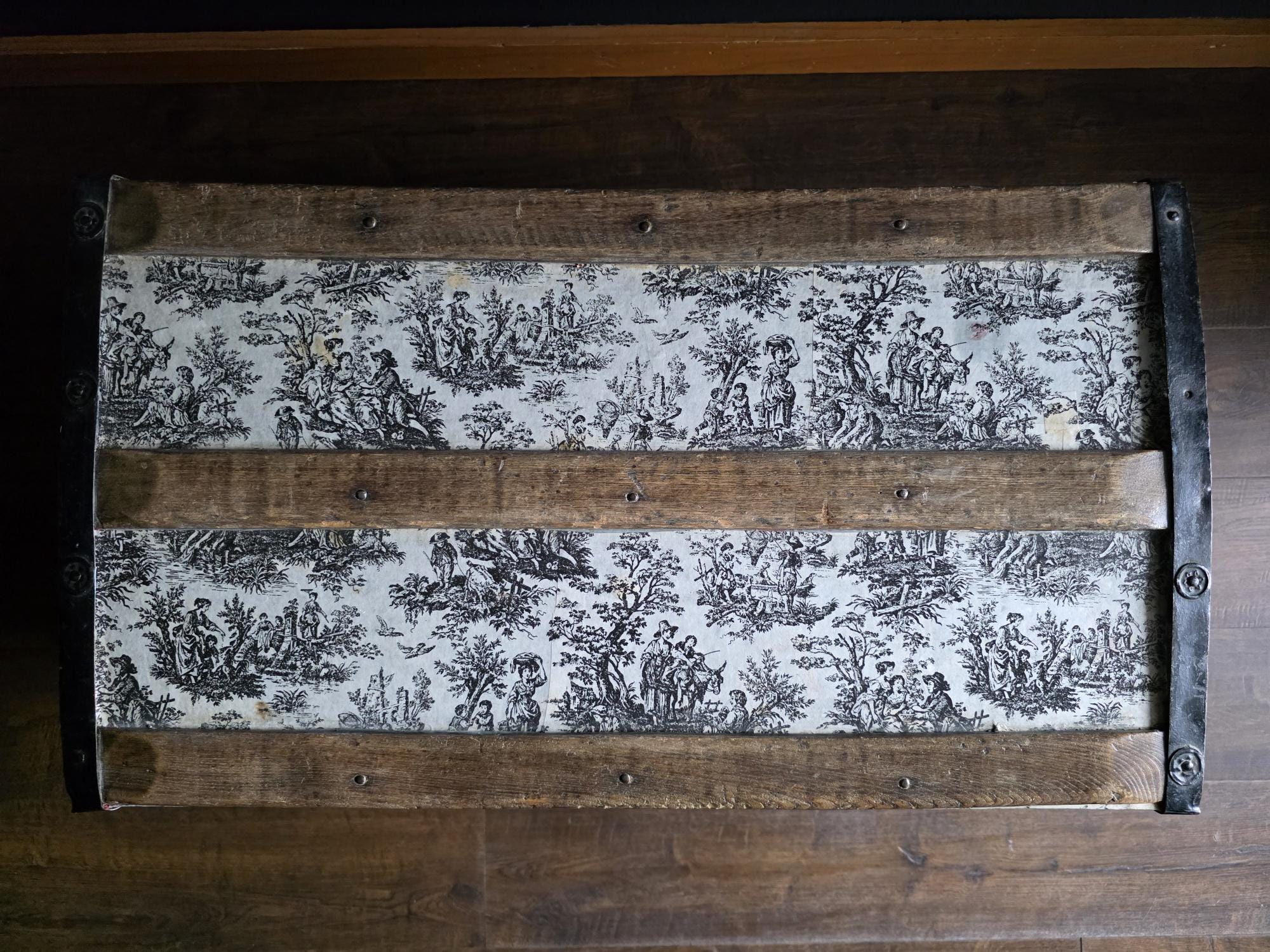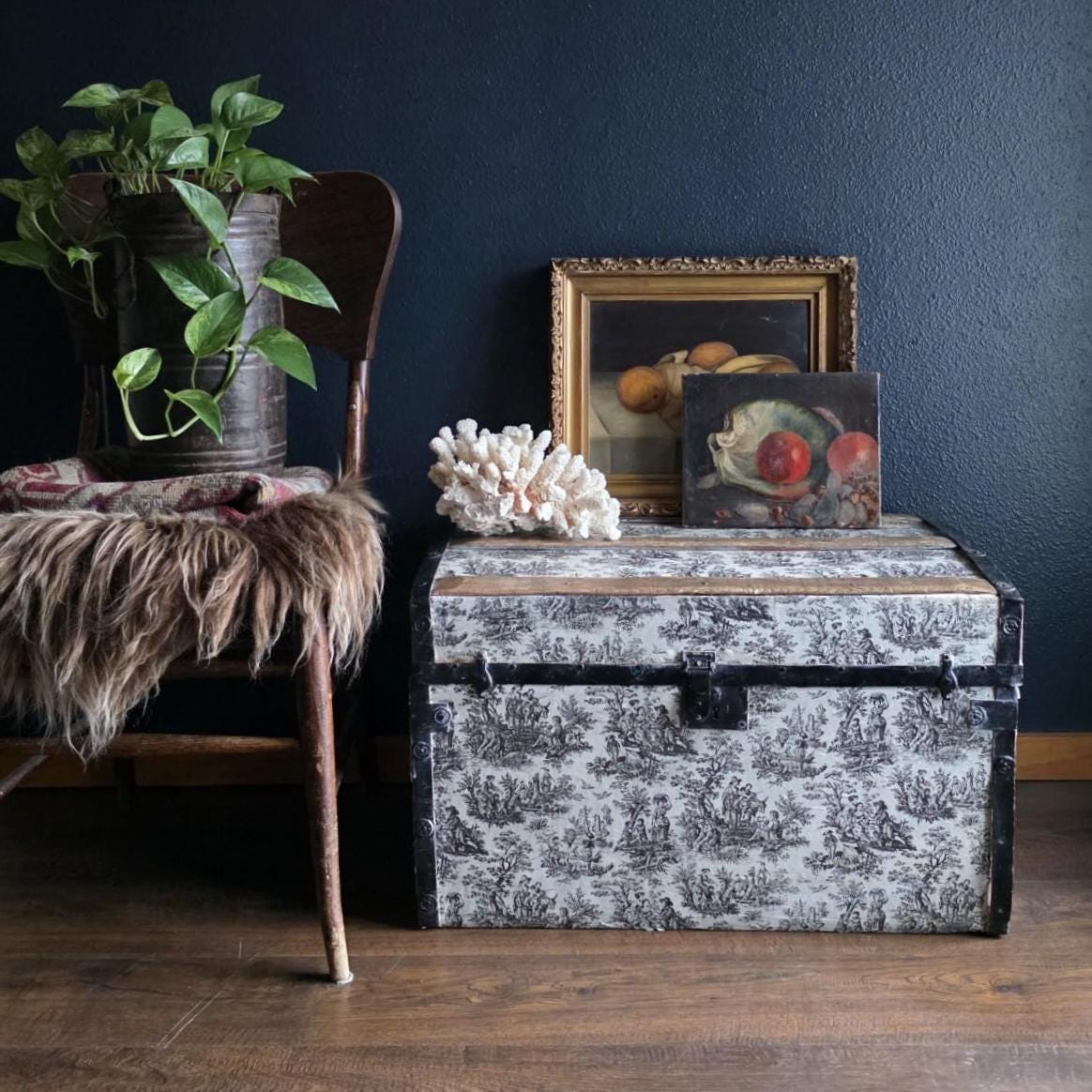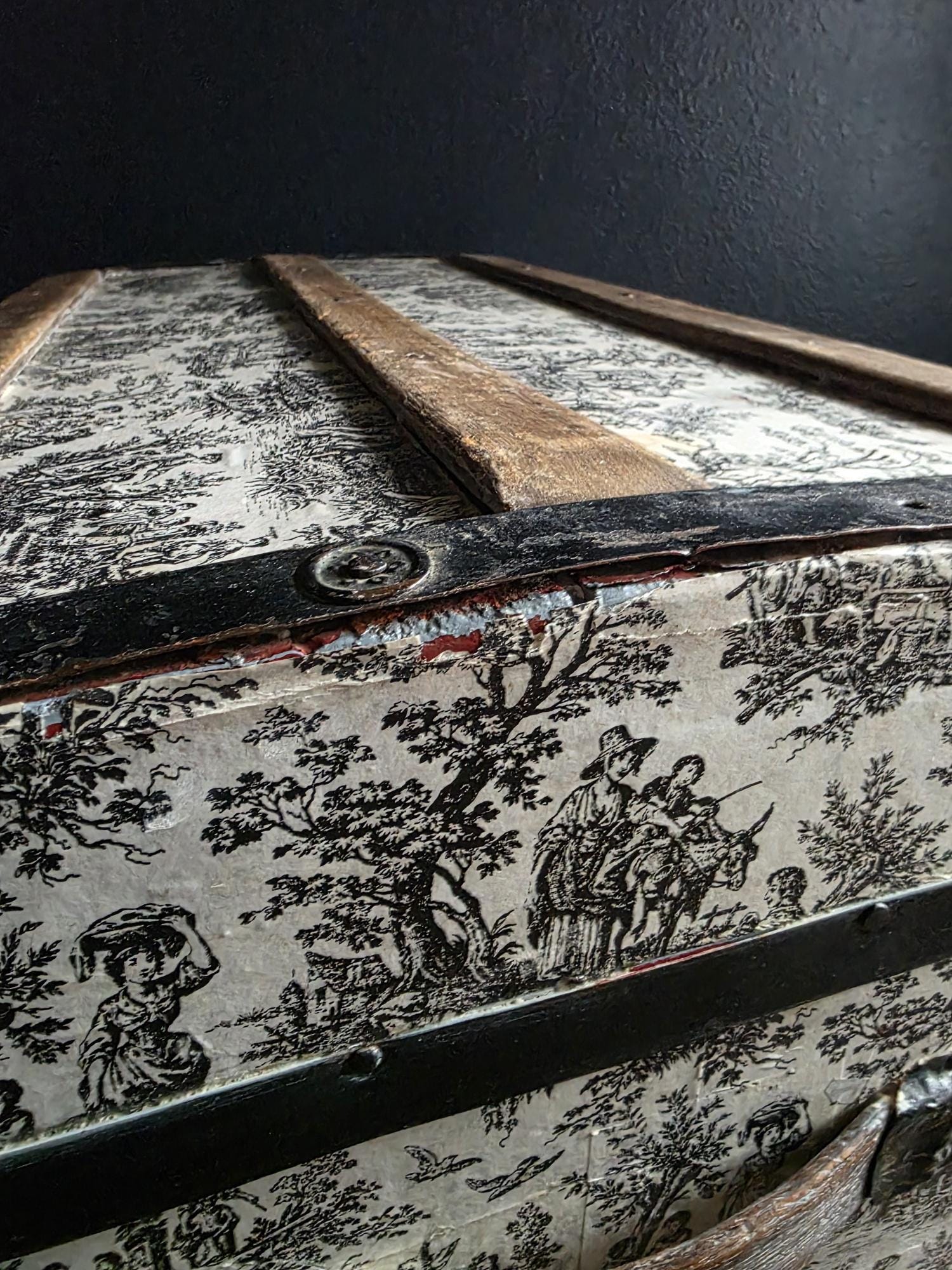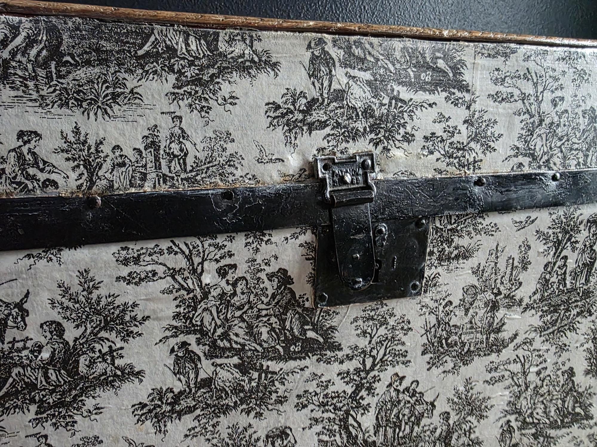 This distinctive antique steamer trunk, likely dating from the late 19th to early 20th century, showcases a striking Toile de Jouy paper covering featuring classic black and white pastoral scenes. The graphic print contrasts boldly with the black painted metal banding, creating a unique visual appeal that differs from standard vintage luggage. Embracing a true aesthetic, the exterior is heavily distressed with visible paper loss, peeling, staining, and discoloration consistent with its age. While the trunk retains its sturdy form and intact side handles, please note that several rivets securing the metal banding are missing in instances (see listing photos closely). The interior features a vibrant red and gold embossed paper lining; however, this appears to be a later addition and not original to the trunk. This character-filled piece would serve perfectly as a vintage coffee table, vignette accent, or decorative storage chest for those who appreciate authentic historical wear.