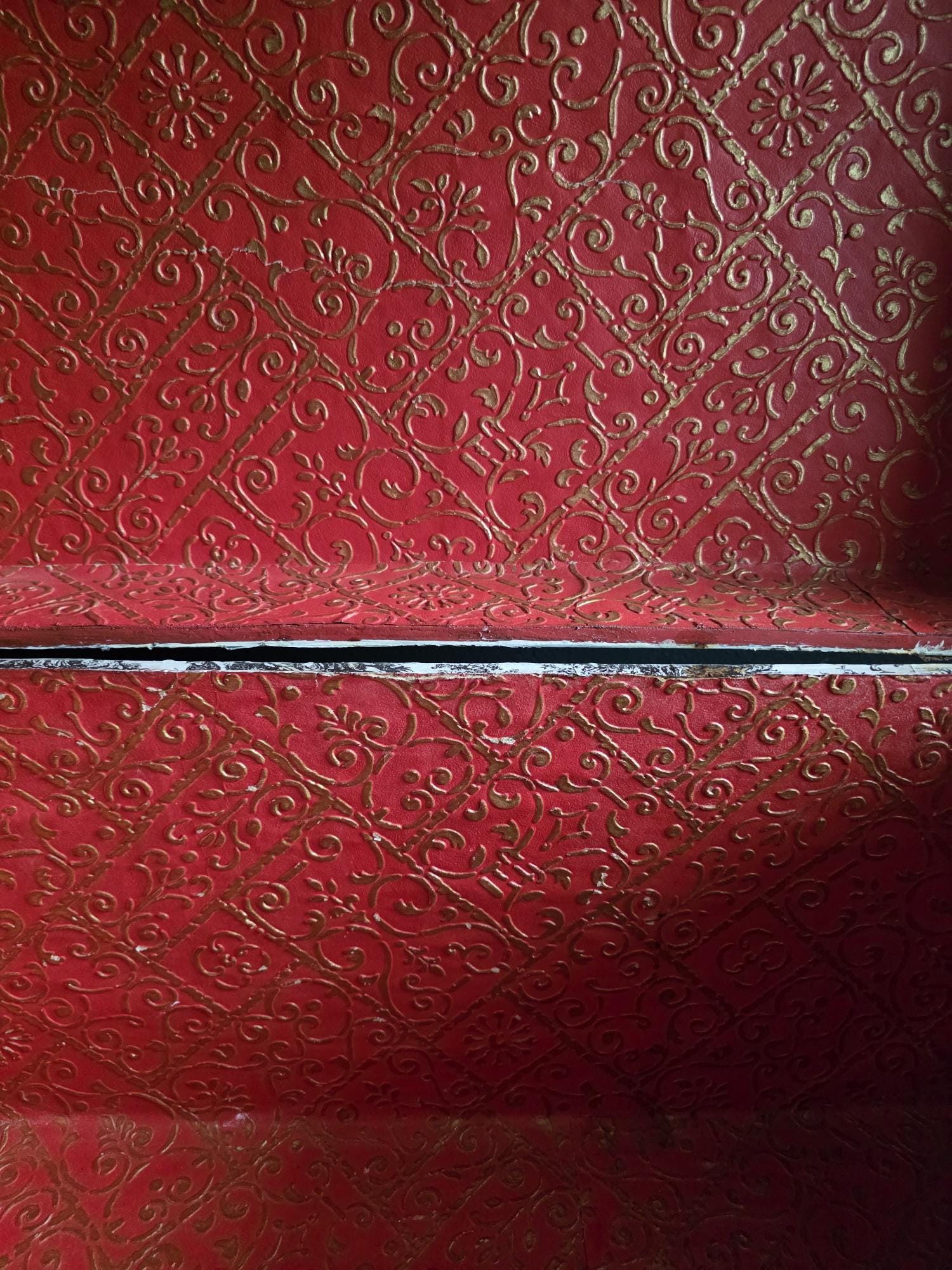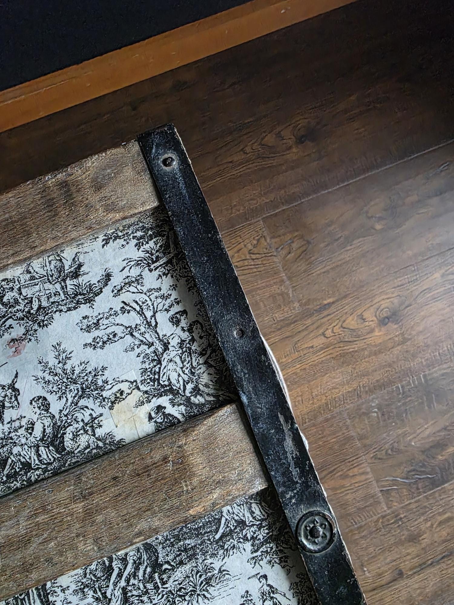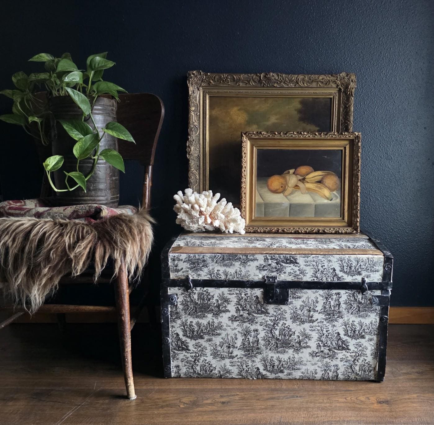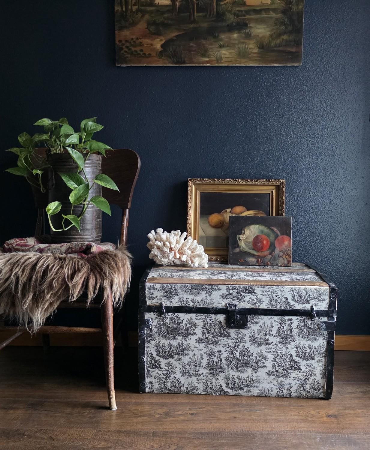 This distinctive antique steamer trunk, likely dating from the late 19th to early 20th century, showcases a striking Toile de Jouy paper covering featuring classic black and white pastoral scenes. The graphic print contrasts boldly with the black painted metal banding, creating a unique visual appeal that differs from standard vintage luggage. Embracing a true aesthetic, the exterior is heavily distressed with visible paper loss, peeling, staining, and discoloration consistent with its age. While the trunk retains its sturdy form and intact side handles, please note that several rivets securing the metal banding are missing in instances (see listing photos closely). The interior features a vibrant red and gold embossed paper lining; however, this appears to be a later addition and not original to the trunk. This character-filled piece would serve perfectly as a vintage coffee table, vignette accent, or decorative storage chest for those who appreciate authentic historical wear.