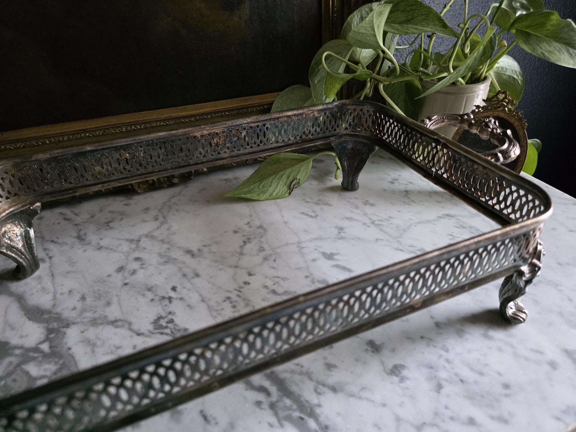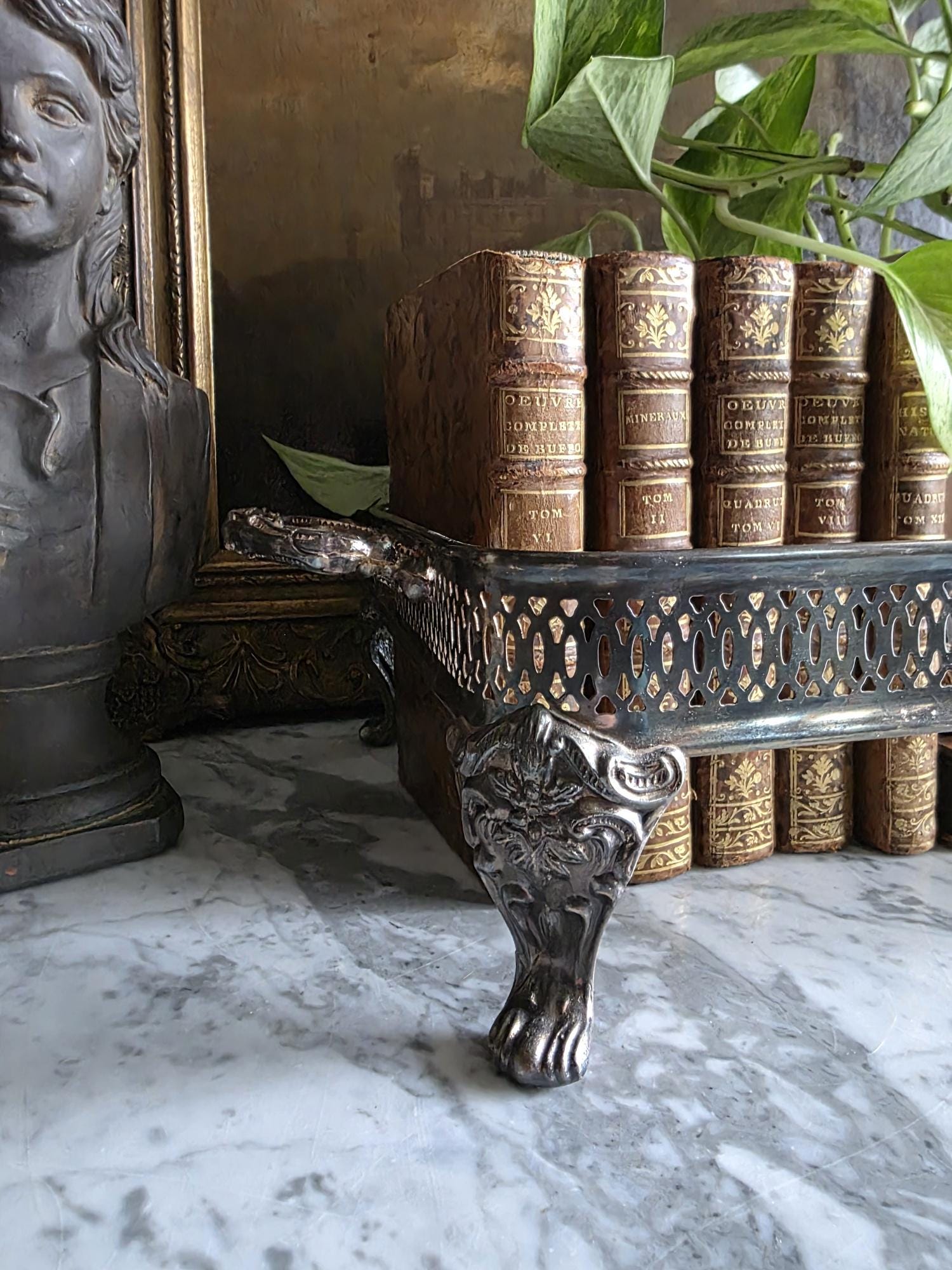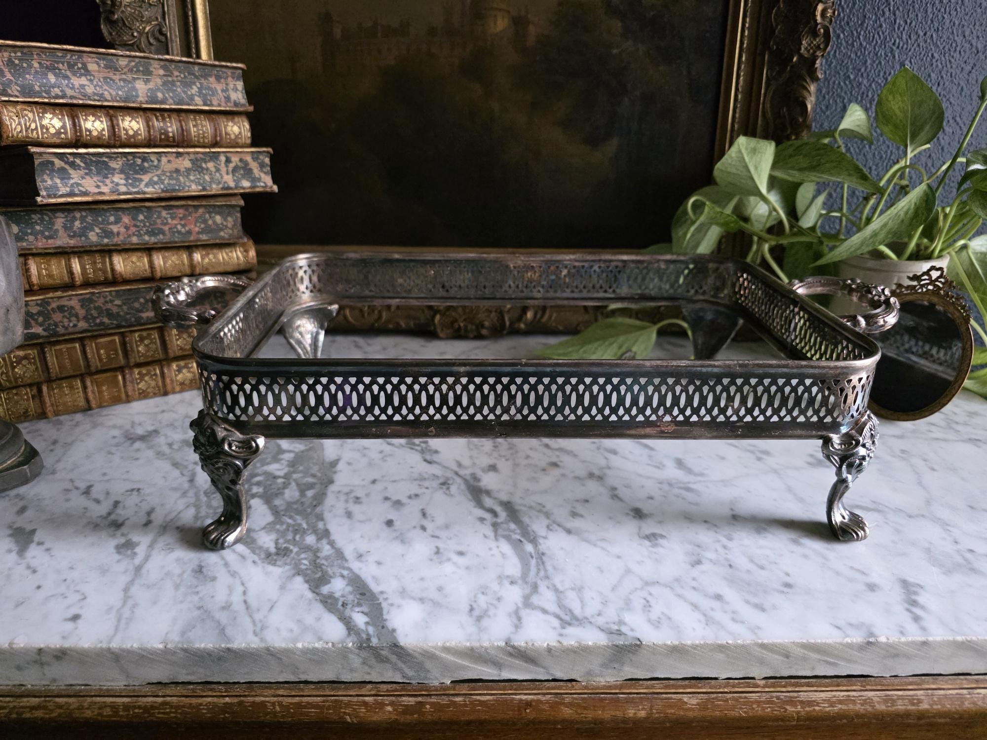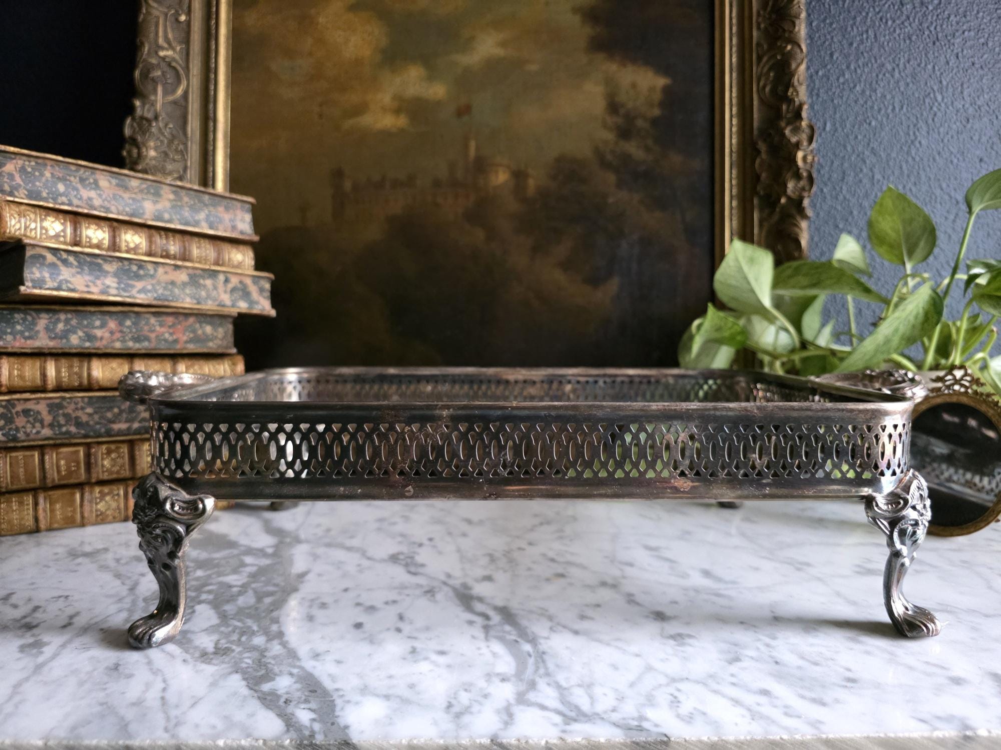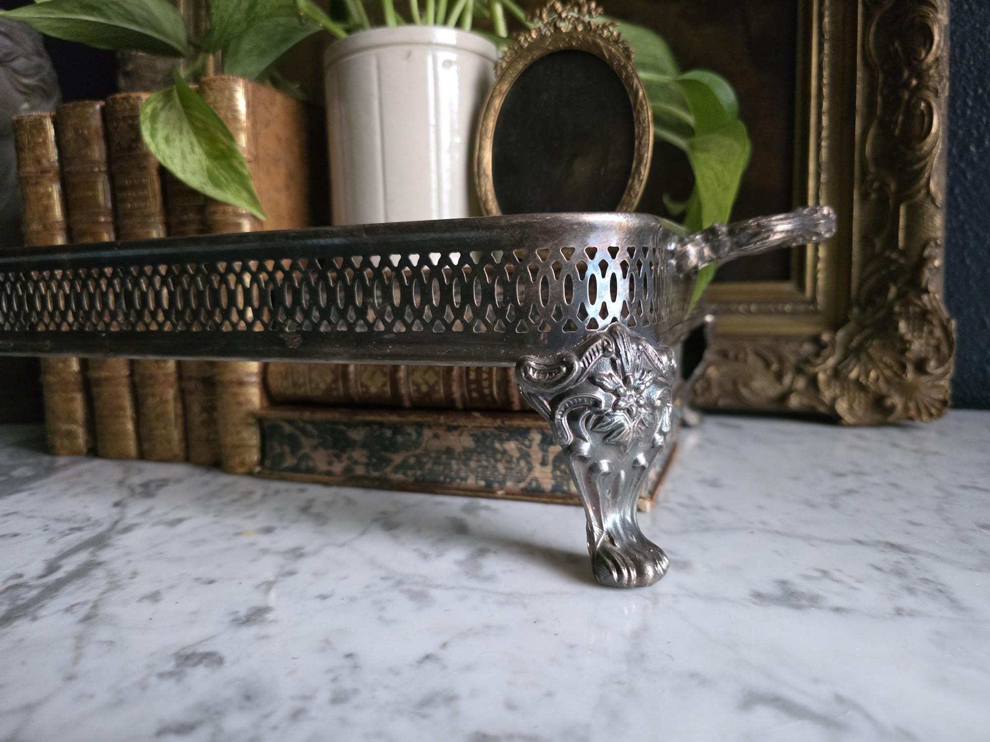 This antique silver plate casserole dish holder, estimated to date from the Late Victorian to Edwardian era (circa 1890s–1920s), transcends its original culinary function to become a sophisticated styling object. Featuring a reticulated gallery with a geometric lattice pattern, the piece offers an airy, textured border raised on four substantial, ornately cast claw feet with detailed floral headers. Its sturdy scrolled handles and regal stance make it an ideal architectural foundation for curating vignettes—perfect for cradling a stack of vintage books, a cluster of pillar candles, or a trailing potted plant. The silver plate currently exhibits a deep, authentic patina with visible tarnish that accentuates the relief details, providing a moody, historic character well-suited for dark academia or eclectic interiors.