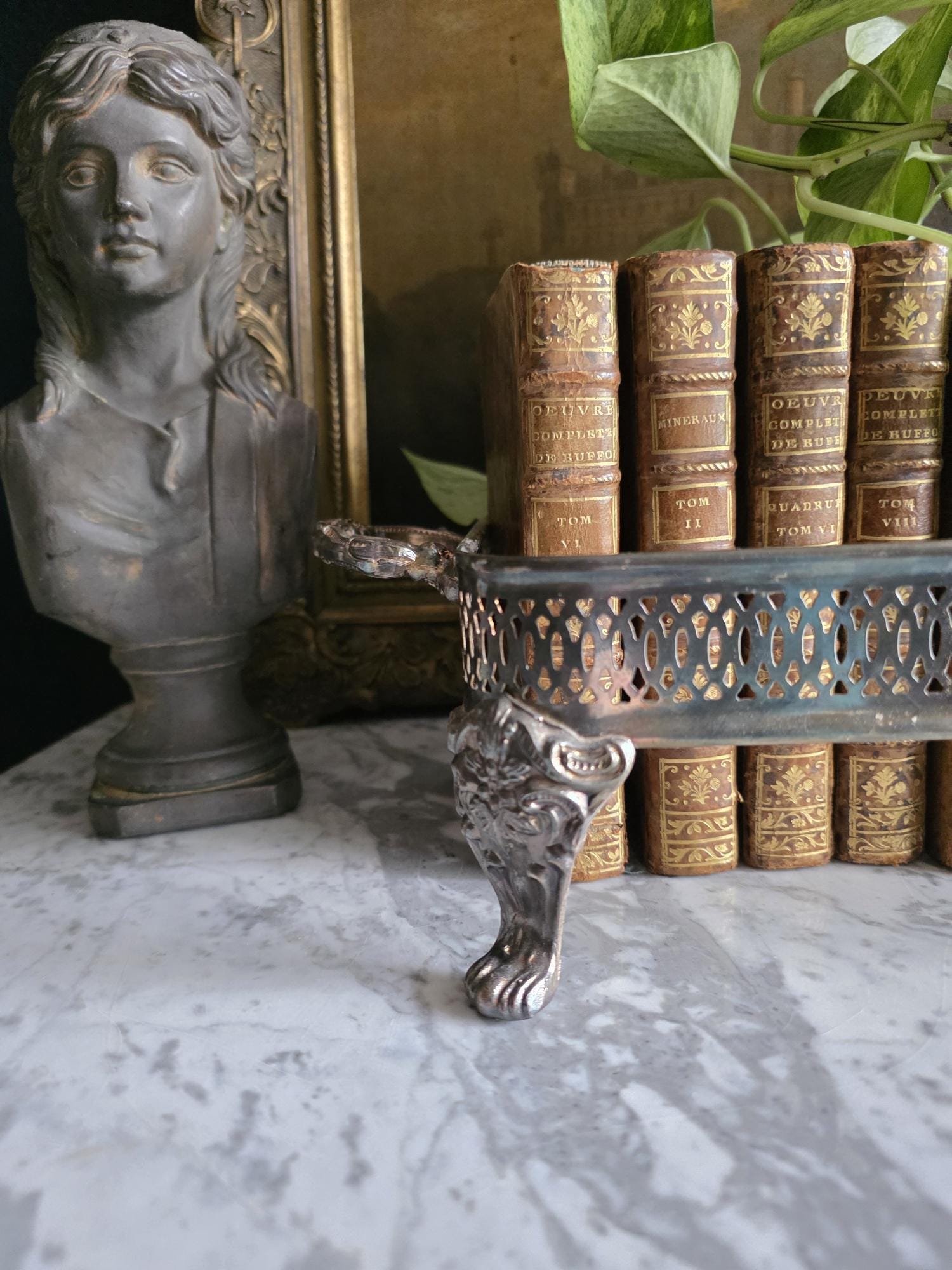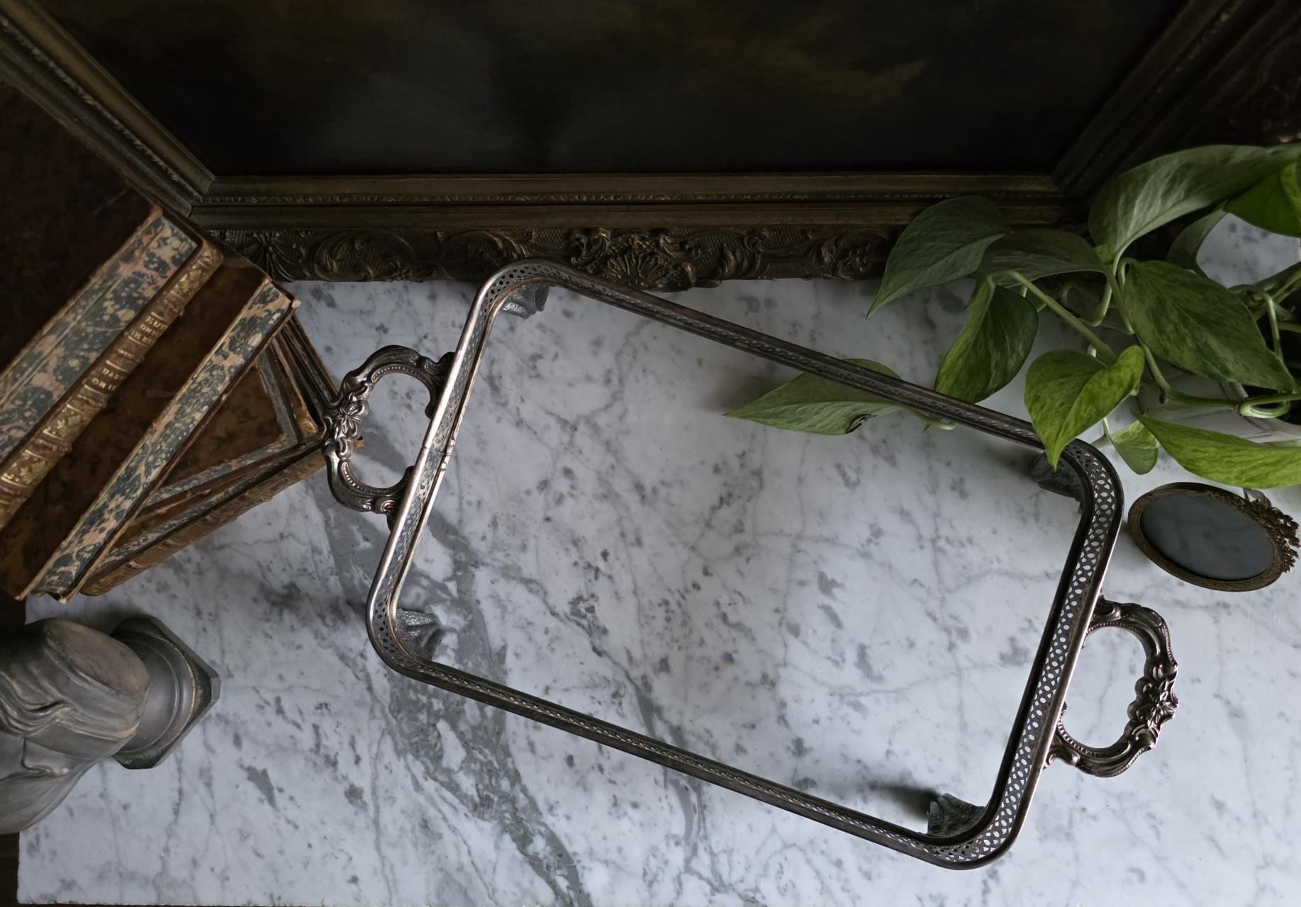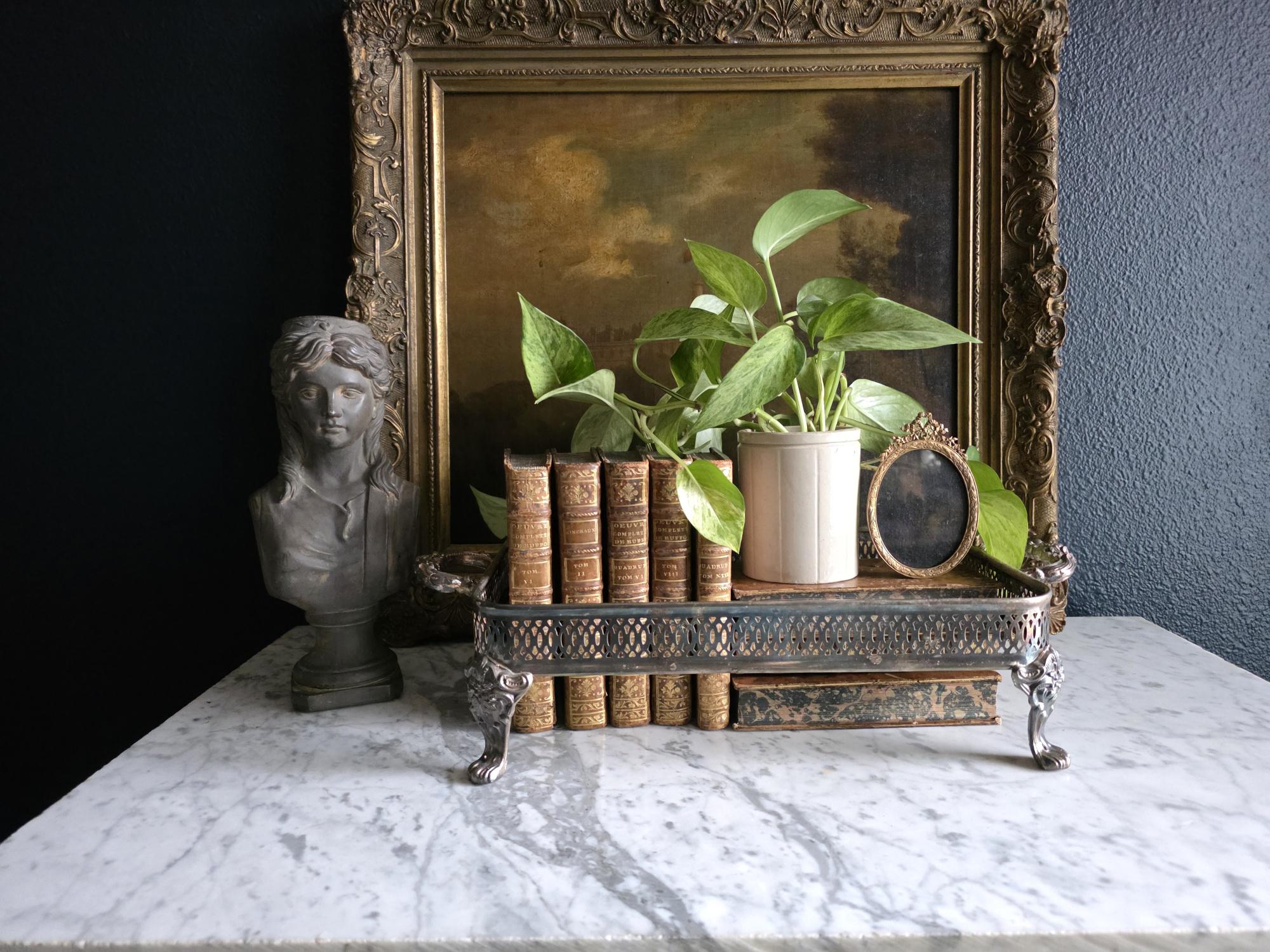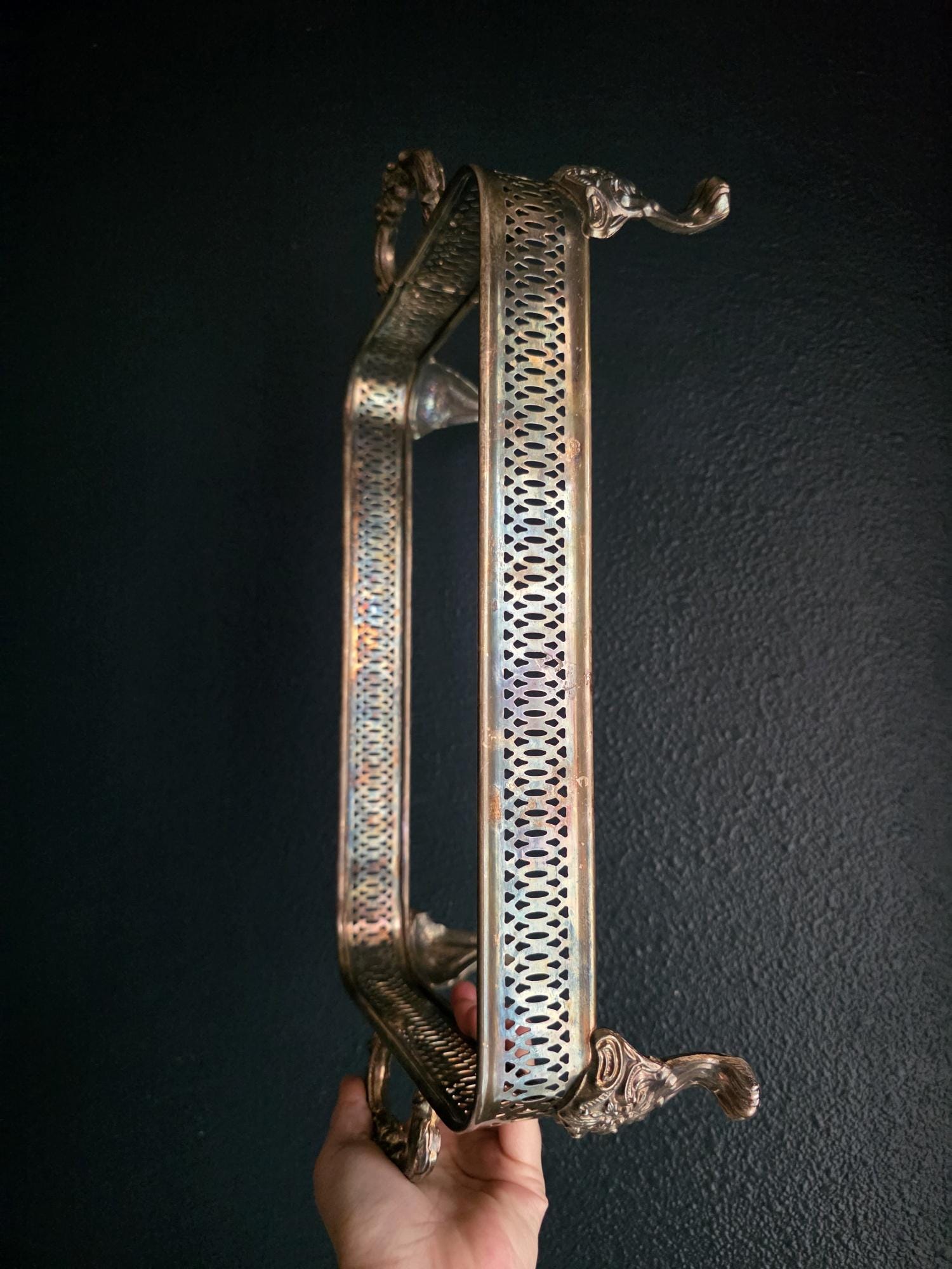 This antique silver plate casserole dish holder, estimated to date from the Late Victorian to Edwardian era (circa 1890s–1920s), transcends its original culinary function to become a sophisticated styling object. Featuring a reticulated gallery with a geometric lattice pattern, the piece offers an airy, textured border raised on four substantial, ornately cast claw feet with detailed floral headers. Its sturdy scrolled handles and regal stance make it an ideal architectural foundation for curating vignettes—perfect for cradling a stack of vintage books, a cluster of pillar candles, or a trailing potted plant. The silver plate currently exhibits a deep, authentic patina with visible tarnish that accentuates the relief details, providing a moody, historic character well-suited for dark academia or eclectic interiors.