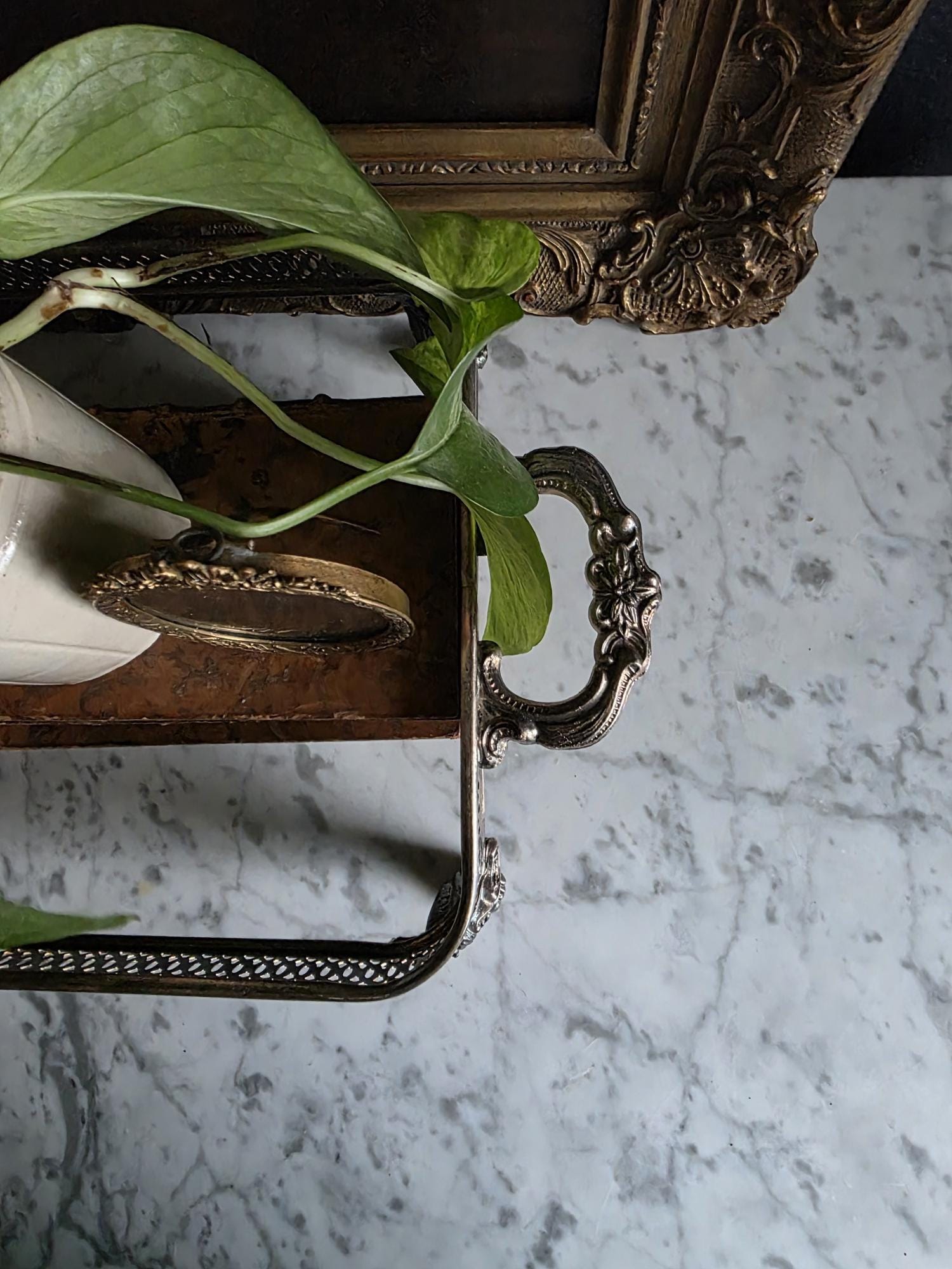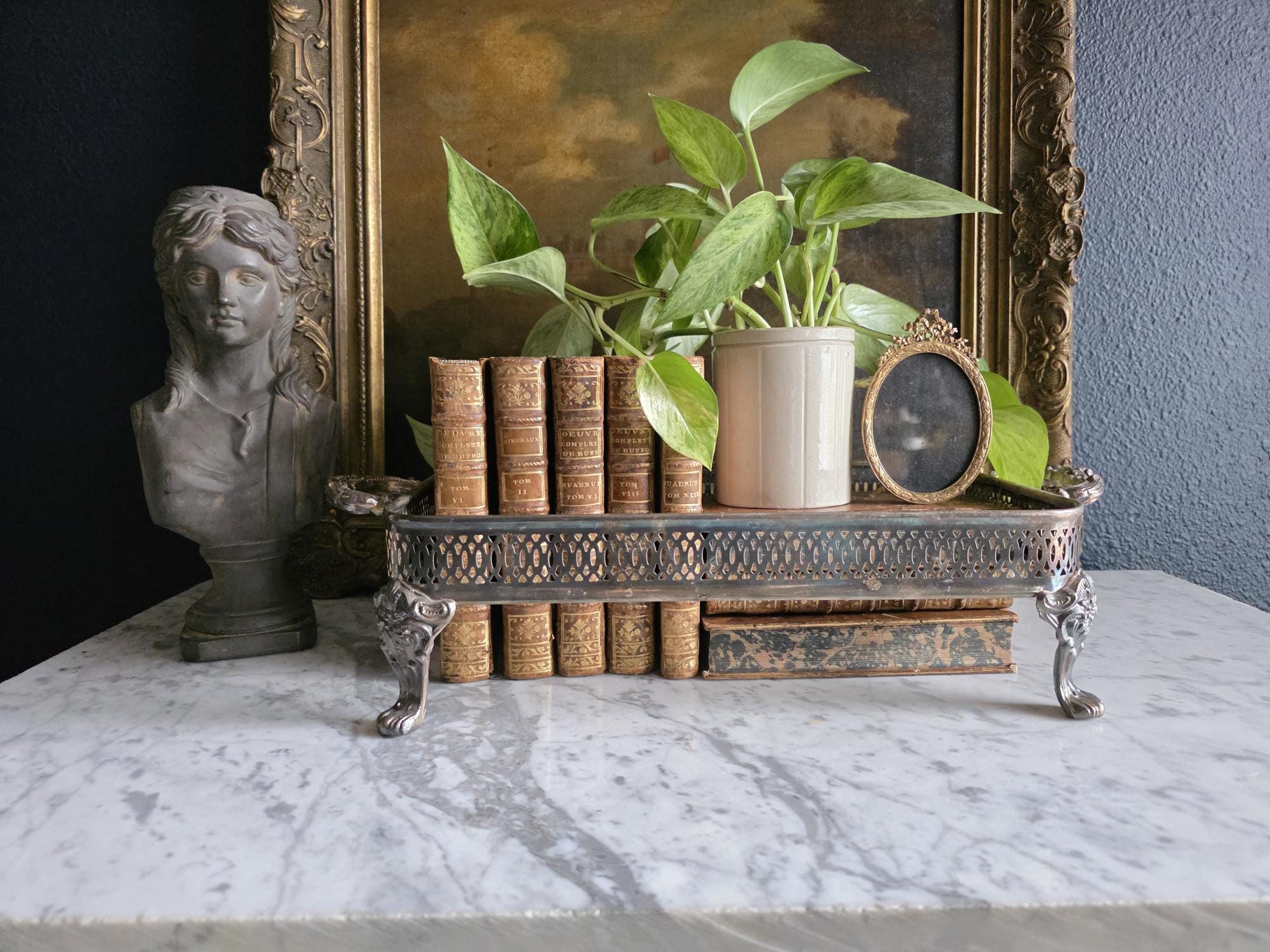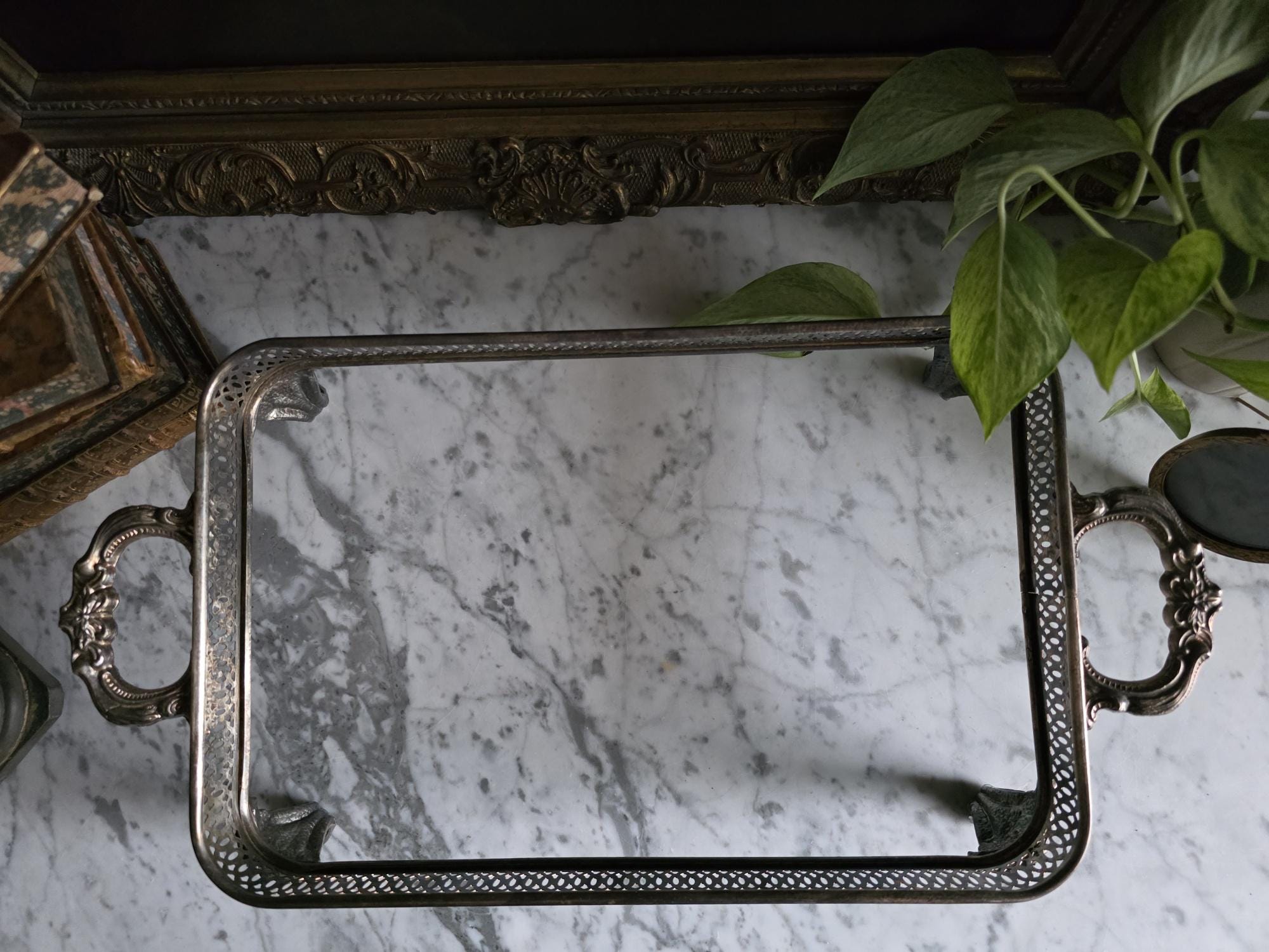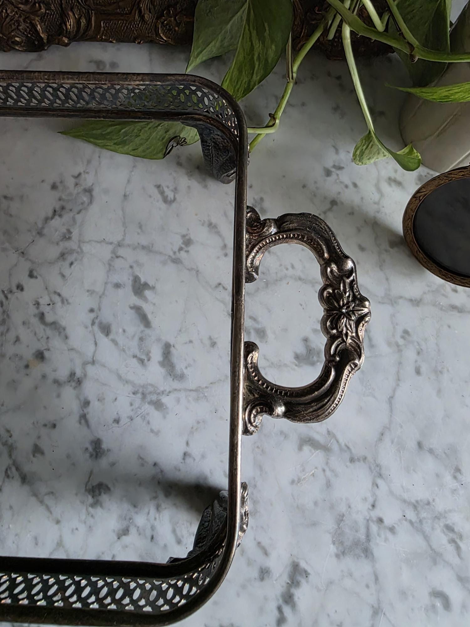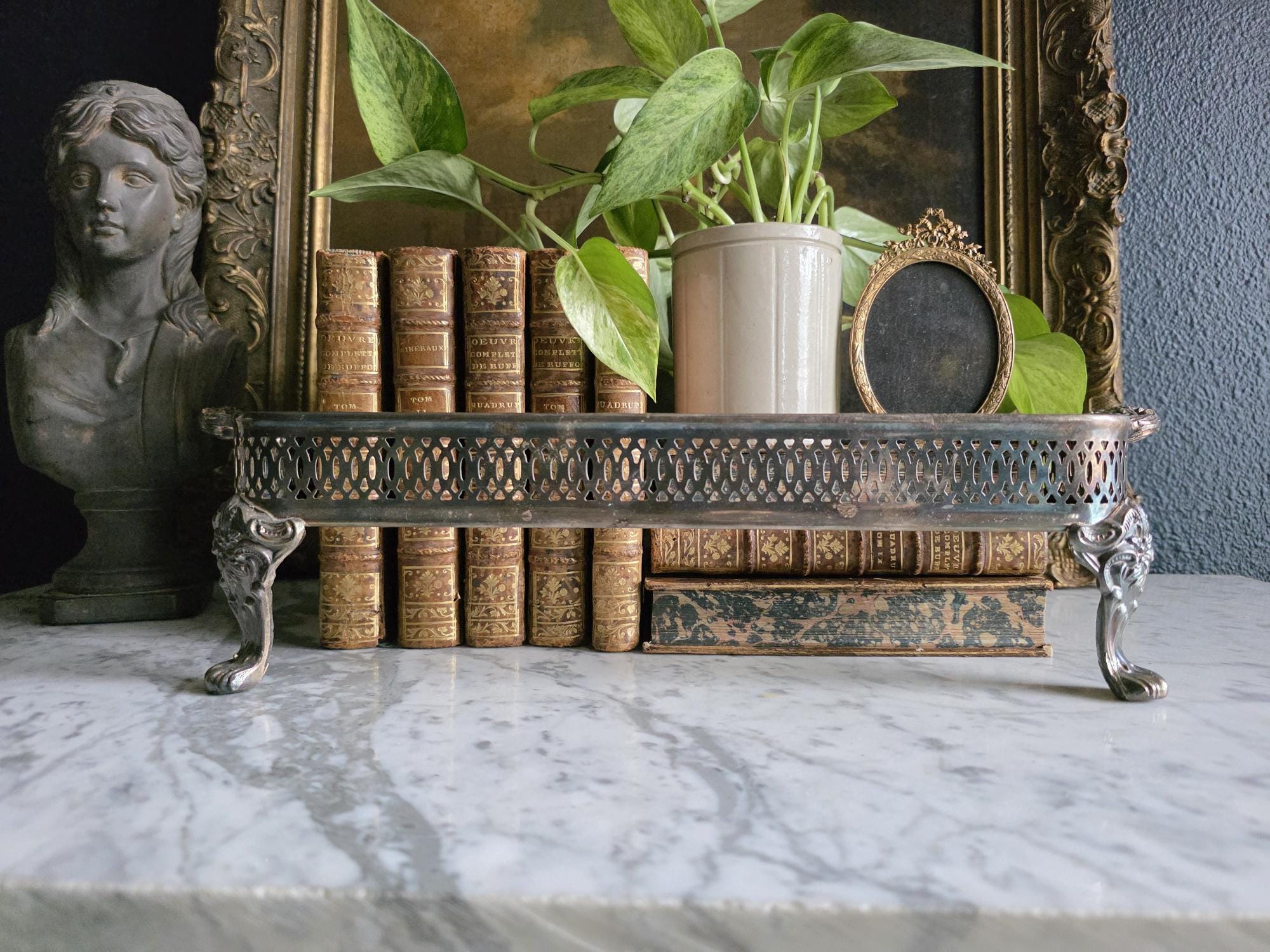This antique silver plate casserole dish holder, estimated to date from the Late Victorian to Edwardian era (circa 1890s–1920s), transcends its original culinary function to become a sophisticated styling object. Featuring a reticulated gallery with a geometric lattice pattern, the piece offers an airy, textured border raised on four substantial, ornately cast claw feet with detailed floral headers. Its sturdy scrolled handles and regal stance make it an ideal architectural foundation for curating vignettes—perfect for cradling a stack of vintage books, a cluster of pillar candles, or a trailing potted plant. The silver plate currently exhibits a deep, authentic patina with visible tarnish that accentuates the relief details, providing a moody, historic character well-suited for dark academia or eclectic interiors.