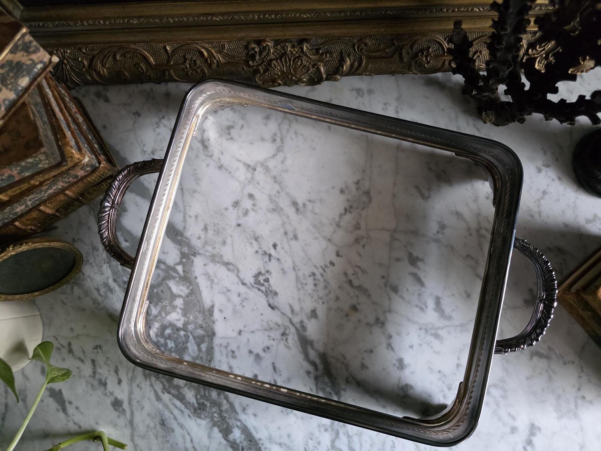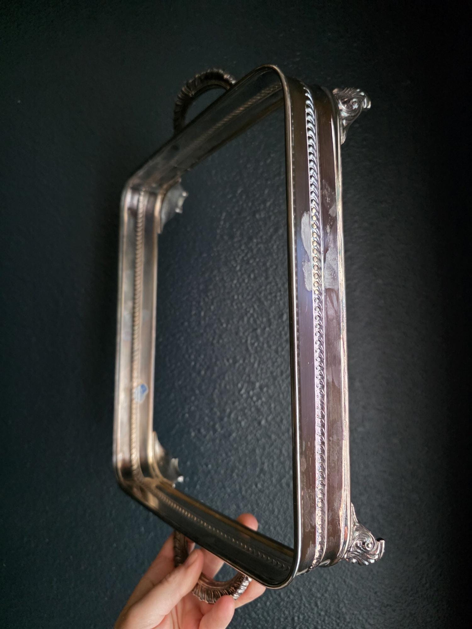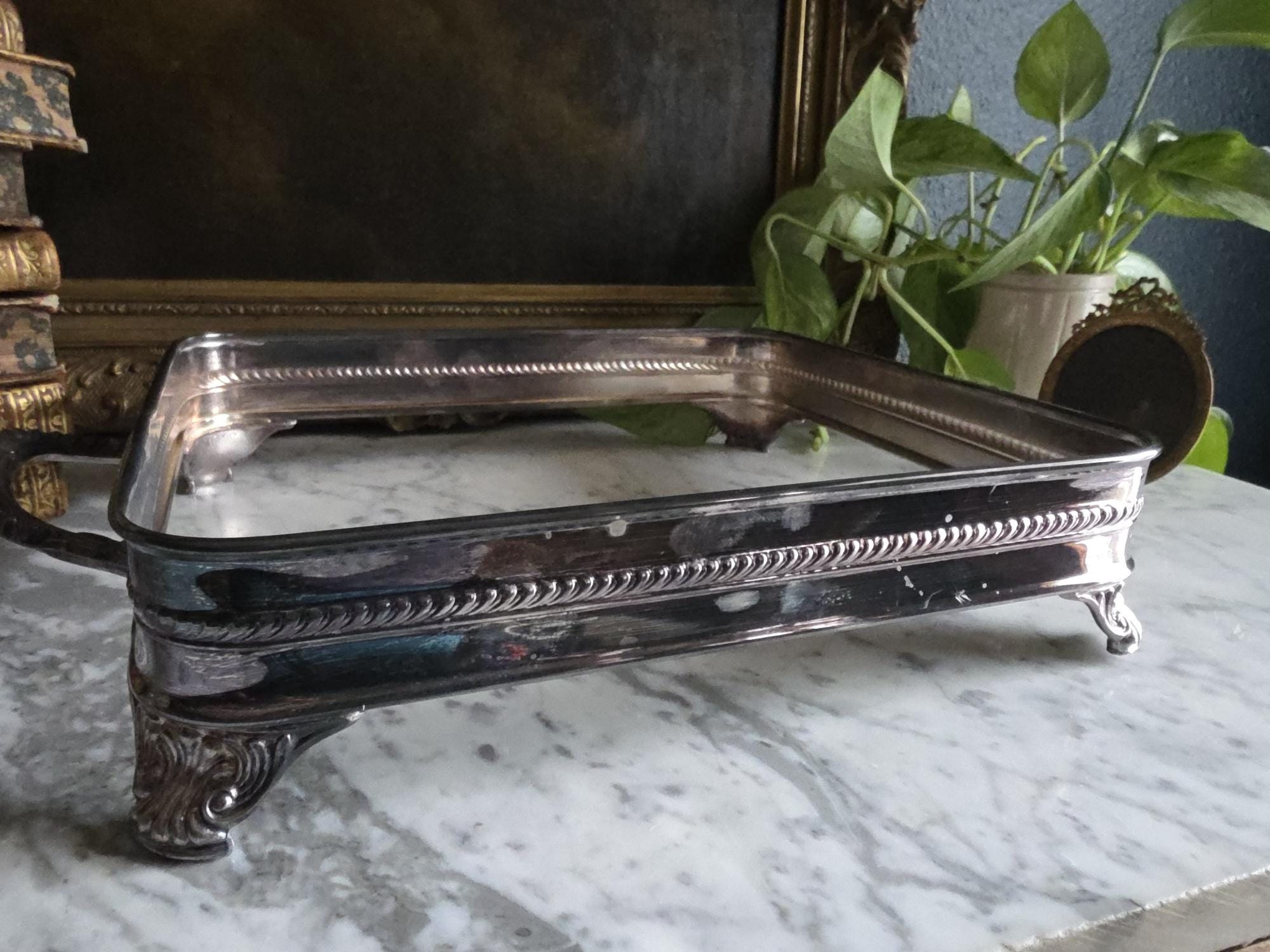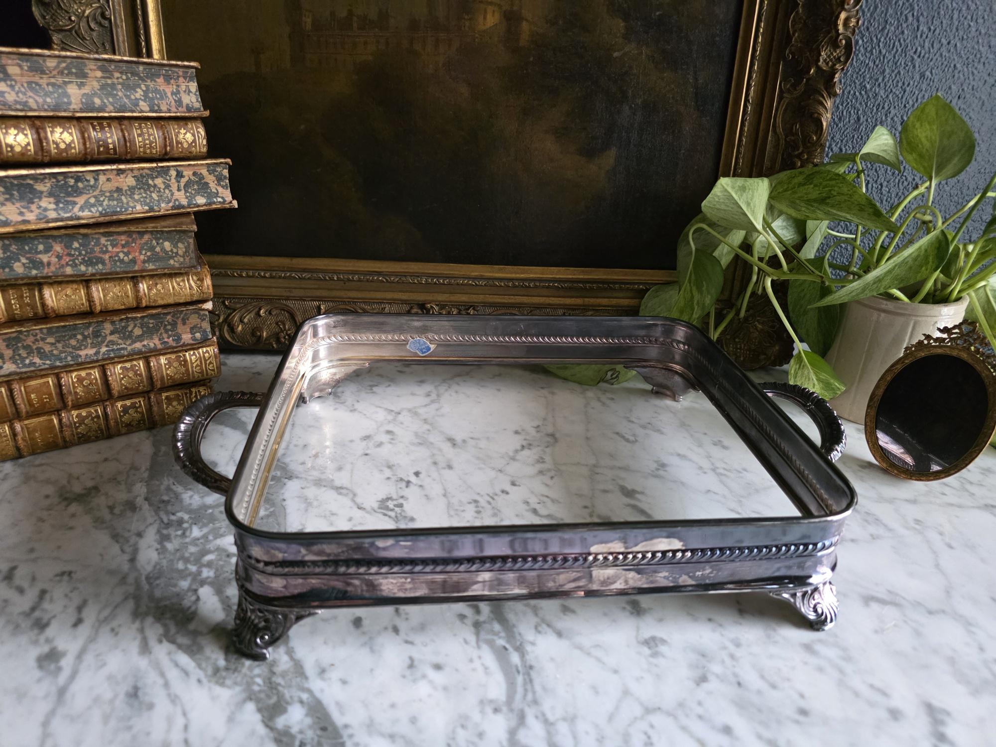 This vintage silver plate casserole dish holder by the renowned F.B. Rogers Silver Co. serves as a classic example of mid-century elegance, even retaining its original blue and silver foil manufacturer's label. Distinguished by its sleek, solid gallery, the frame is bordered by a sophisticated rope-twist (gadroon) trim that adds a timeless, traditional texture. It rests on four heavy, cast acanthus scroll feet that provide a stately, elevated profile, while the ornate handles allow for easy transport. The silver plate is in bright, polished condition with a mirror-like finish that beautifully reflects its surroundings, a stark contrast to more heavily patinated pieces. While designed to cradle a standard rectangular baking dish, its enclosed form and substantial weight make it exceptionally versatile as a chic catchall tray for an entryway, a distinct base for a bar display, or a luxurious holder for guest towels in a powder room.