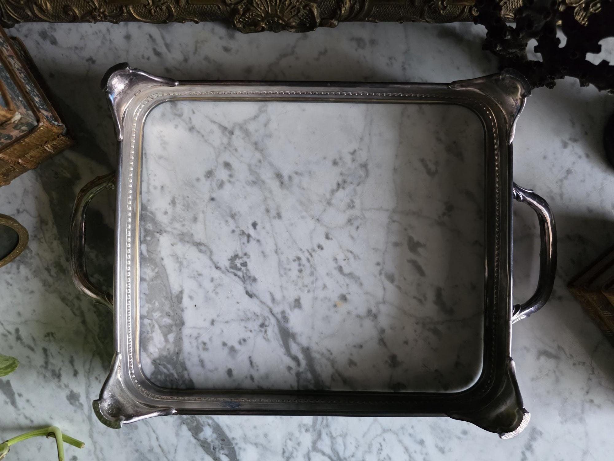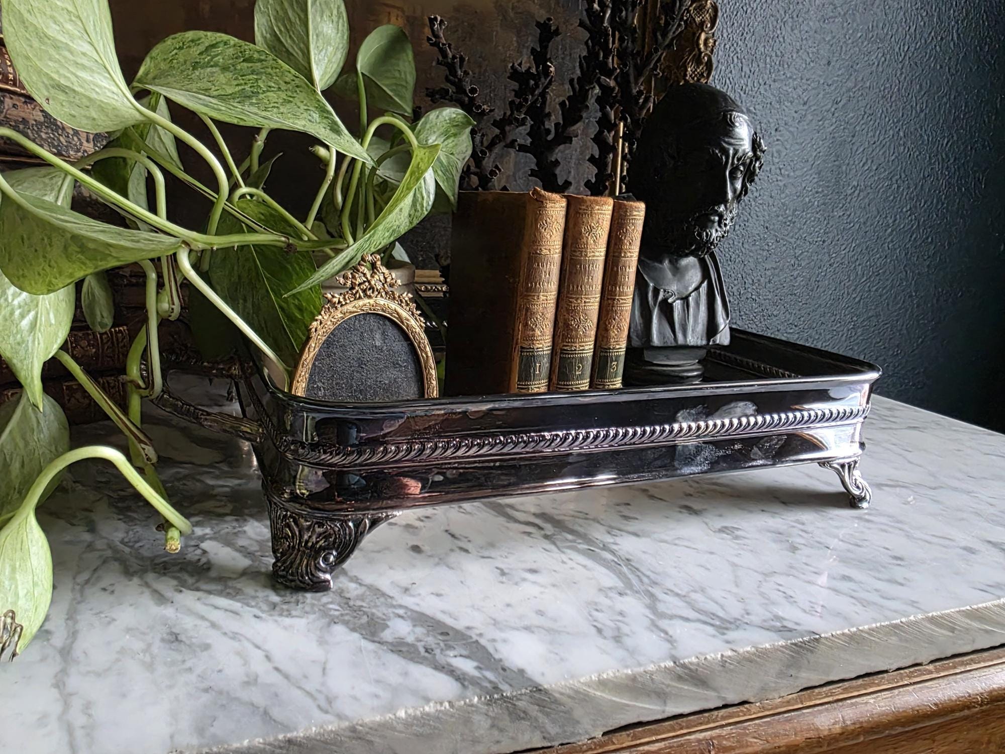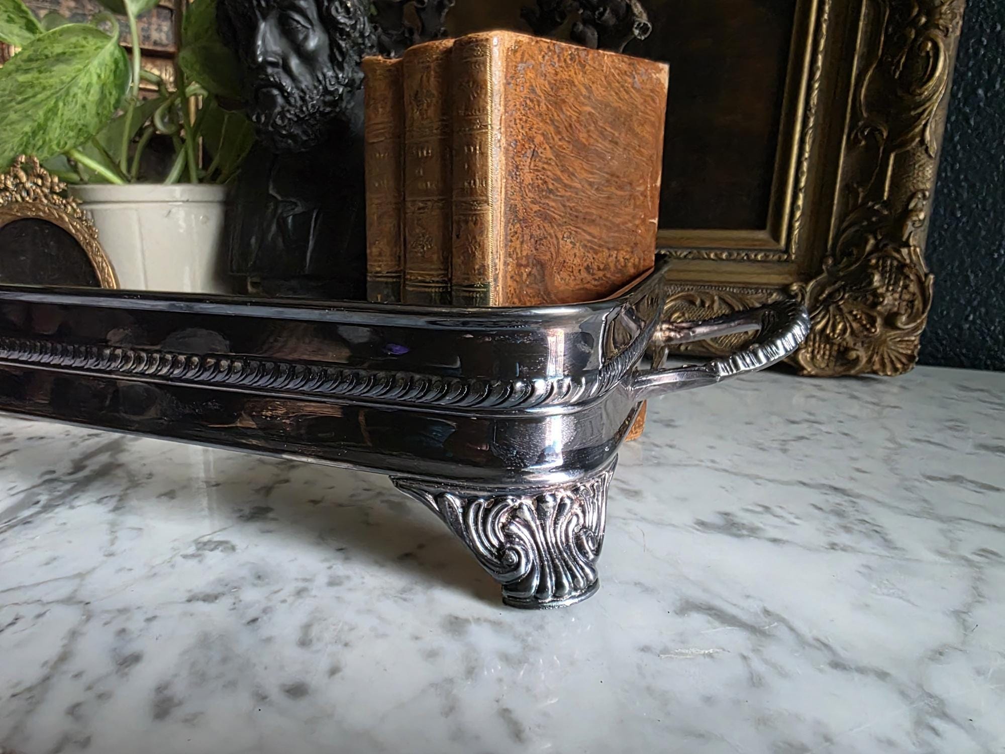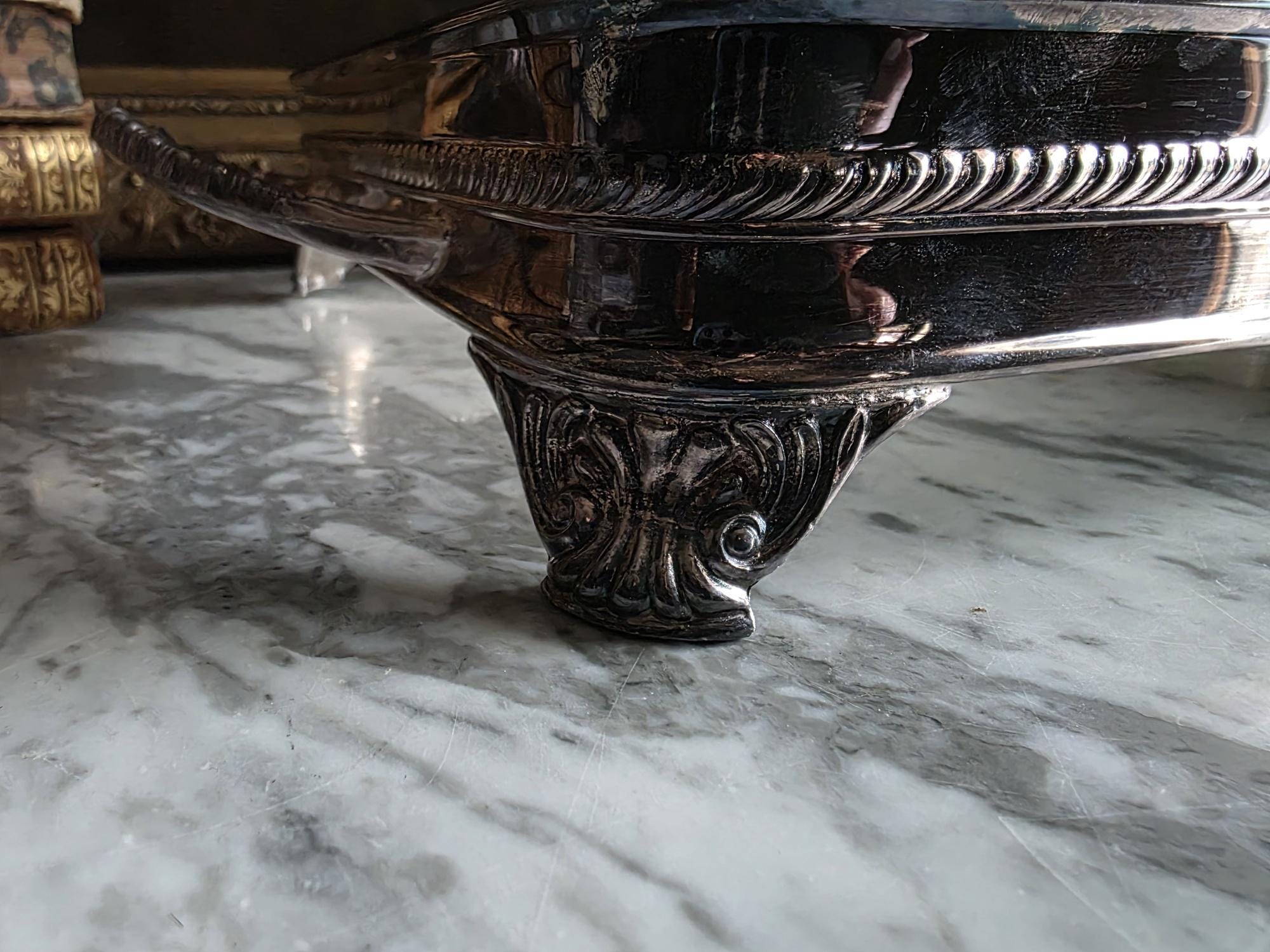 This vintage silver plate casserole dish holder by the renowned F.B. Rogers Silver Co. serves as a classic example of mid-century elegance, even retaining its original blue and silver foil manufacturer's label. Distinguished by its sleek, solid gallery, the frame is bordered by a sophisticated rope-twist (gadroon) trim that adds a timeless, traditional texture. It rests on four heavy, cast acanthus scroll feet that provide a stately, elevated profile, while the ornate handles allow for easy transport. The silver plate is in bright, polished condition with a mirror-like finish that beautifully reflects its surroundings, a stark contrast to more heavily patinated pieces. While designed to cradle a standard rectangular baking dish, its enclosed form and substantial weight make it exceptionally versatile as a chic catchall tray for an entryway, a distinct base for a bar display, or a luxurious holder for guest towels in a powder room.