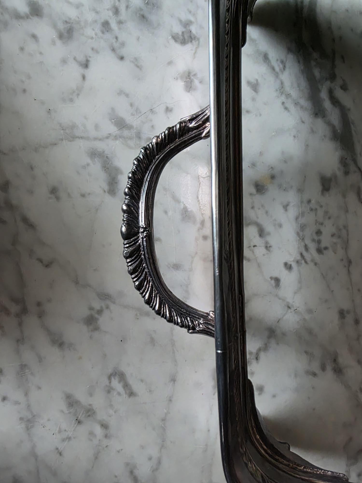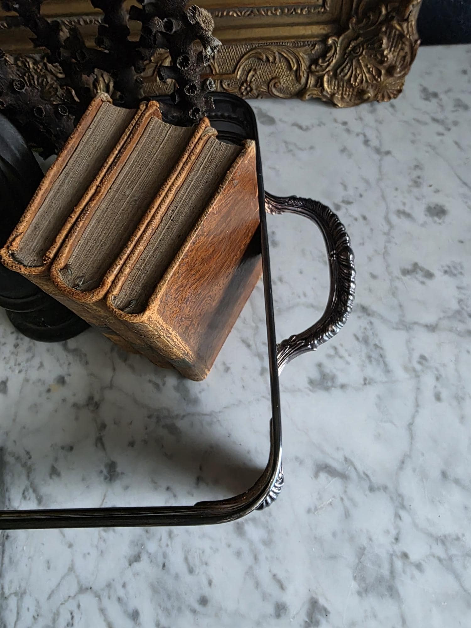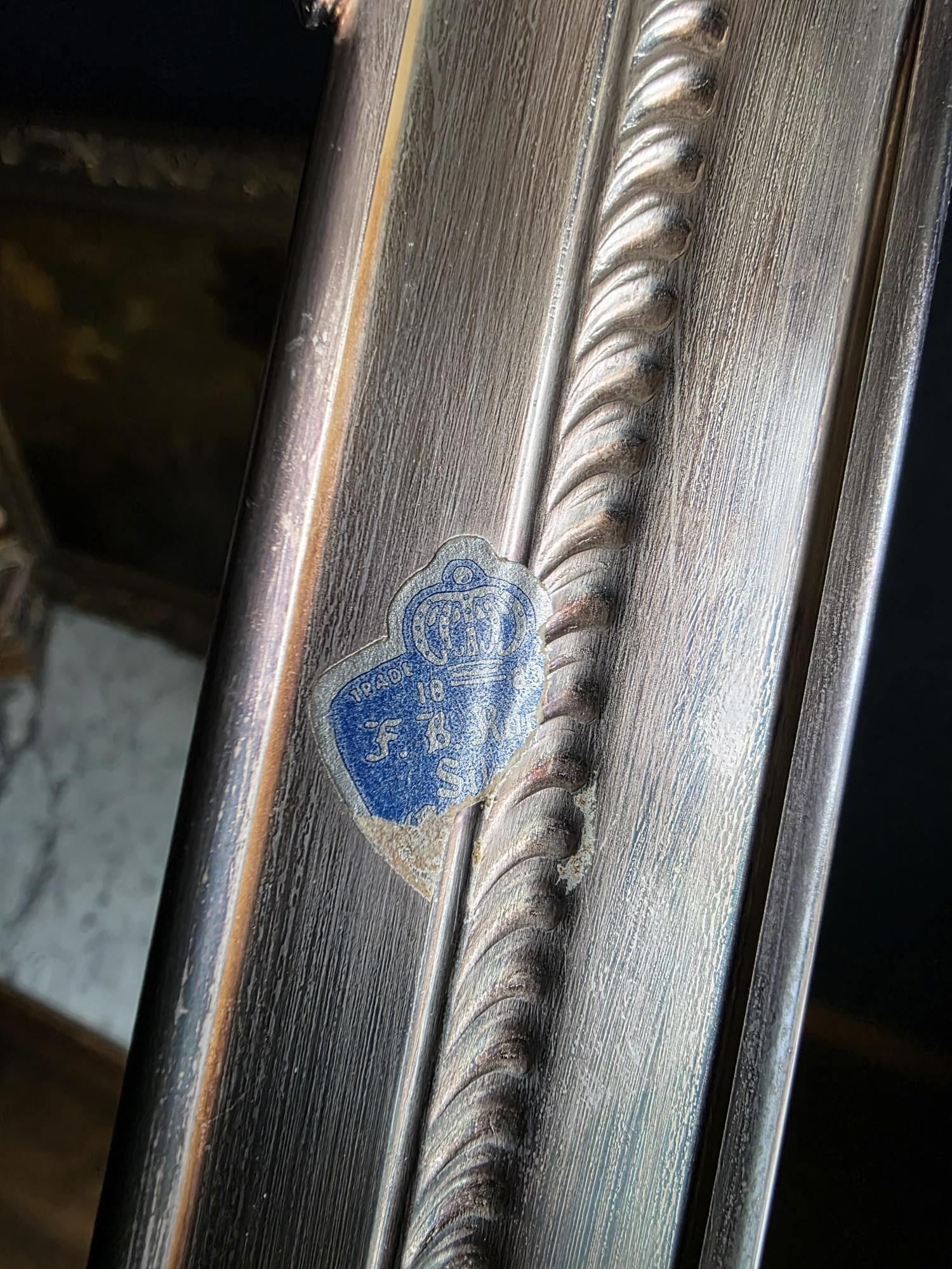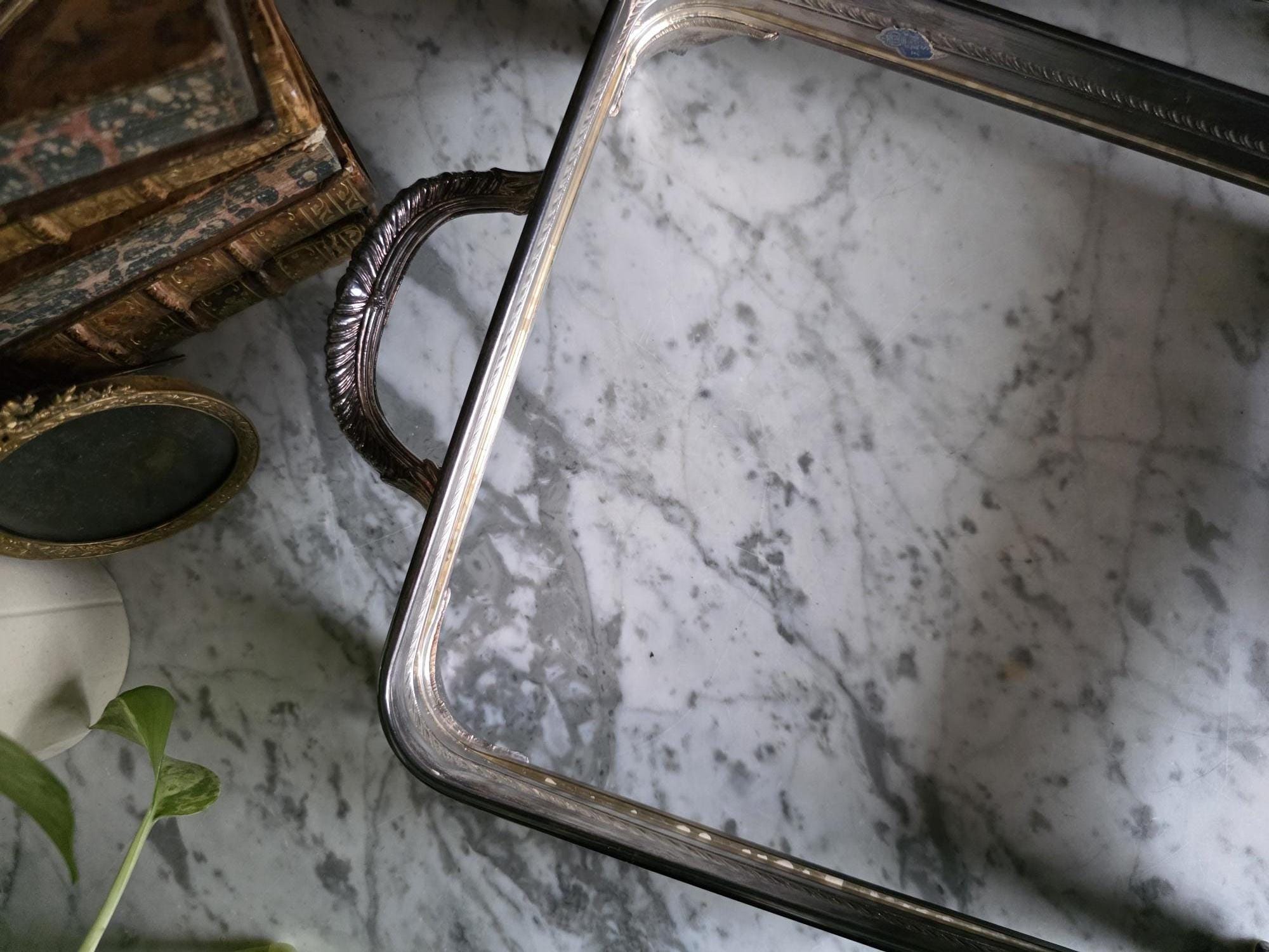 This vintage silver plate casserole dish holder by the renowned F.B. Rogers Silver Co. serves as a classic example of mid-century elegance, even retaining its original blue and silver foil manufacturer's label. Distinguished by its sleek, solid gallery, the frame is bordered by a sophisticated rope-twist (gadroon) trim that adds a timeless, traditional texture. It rests on four heavy, cast acanthus scroll feet that provide a stately, elevated profile, while the ornate handles allow for easy transport. The silver plate is in bright, polished condition with a mirror-like finish that beautifully reflects its surroundings, a stark contrast to more heavily patinated pieces. While designed to cradle a standard rectangular baking dish, its enclosed form and substantial weight make it exceptionally versatile as a chic catchall tray for an entryway, a distinct base for a bar display, or a luxurious holder for guest towels in a powder room.
