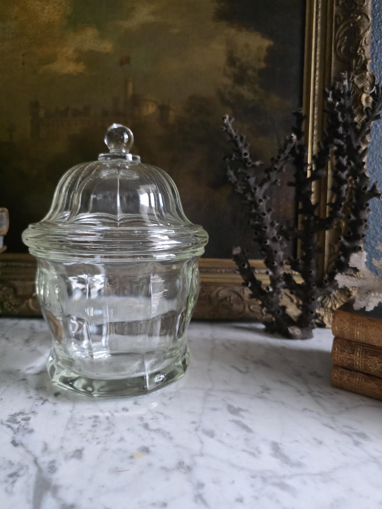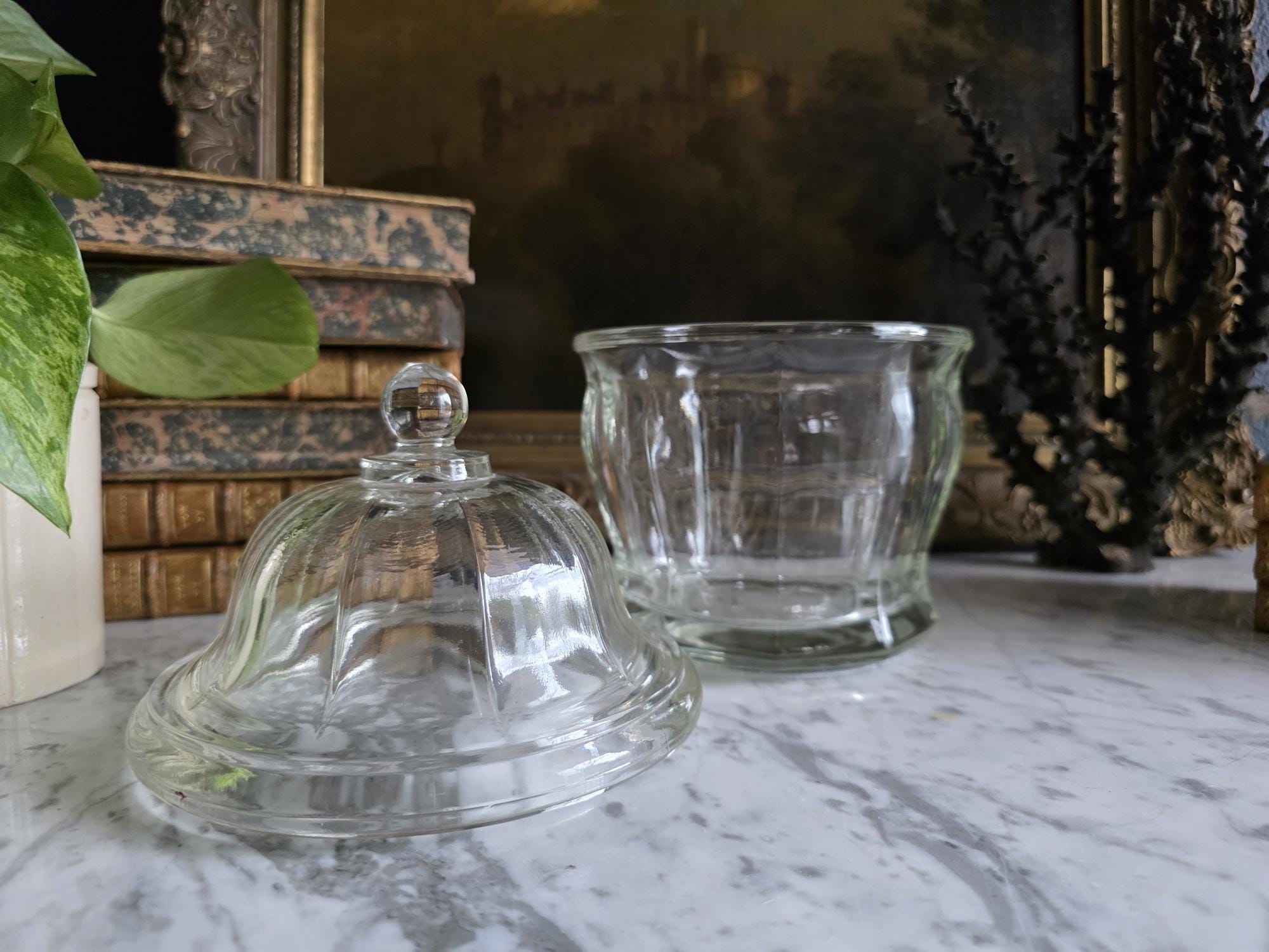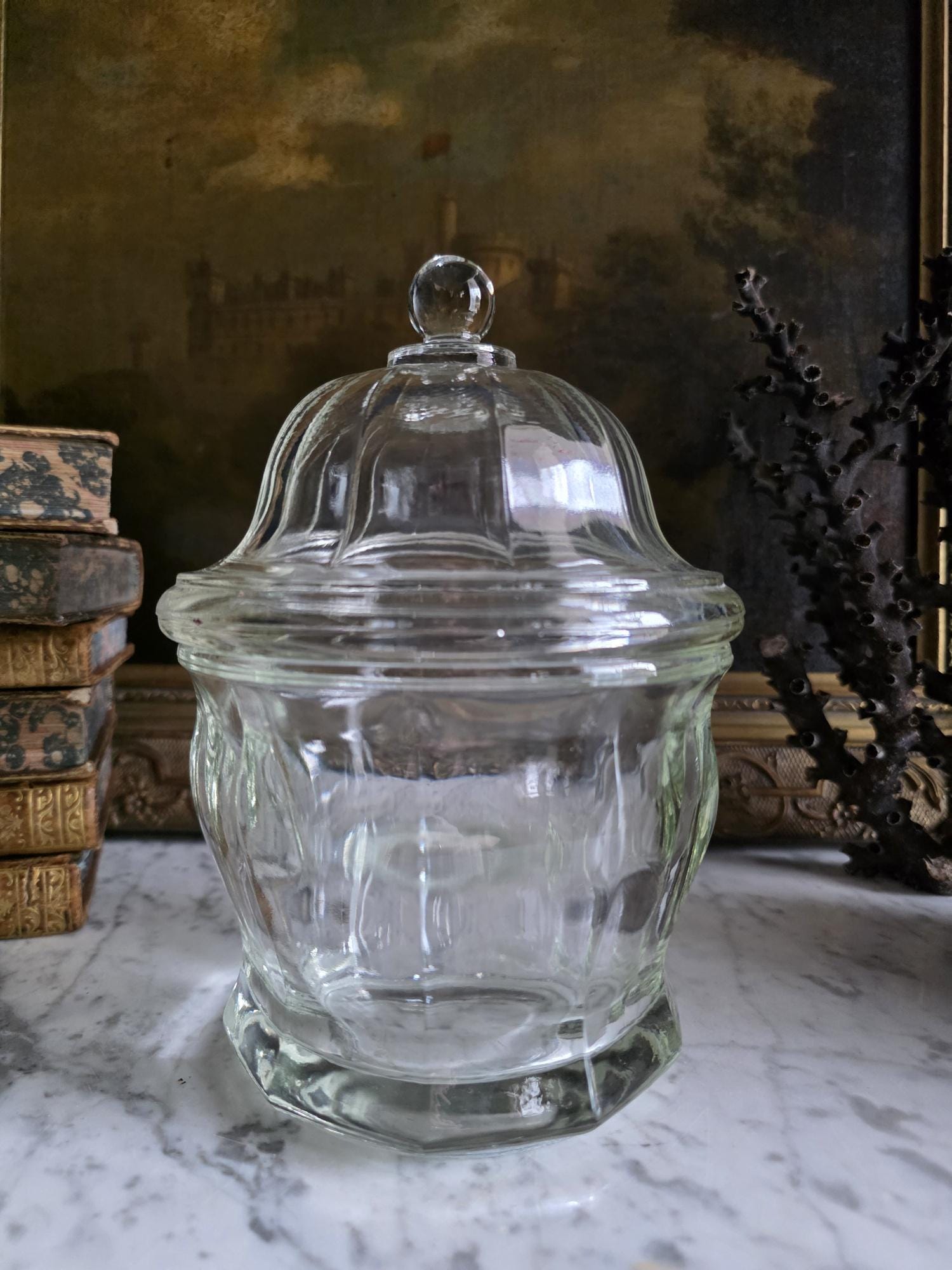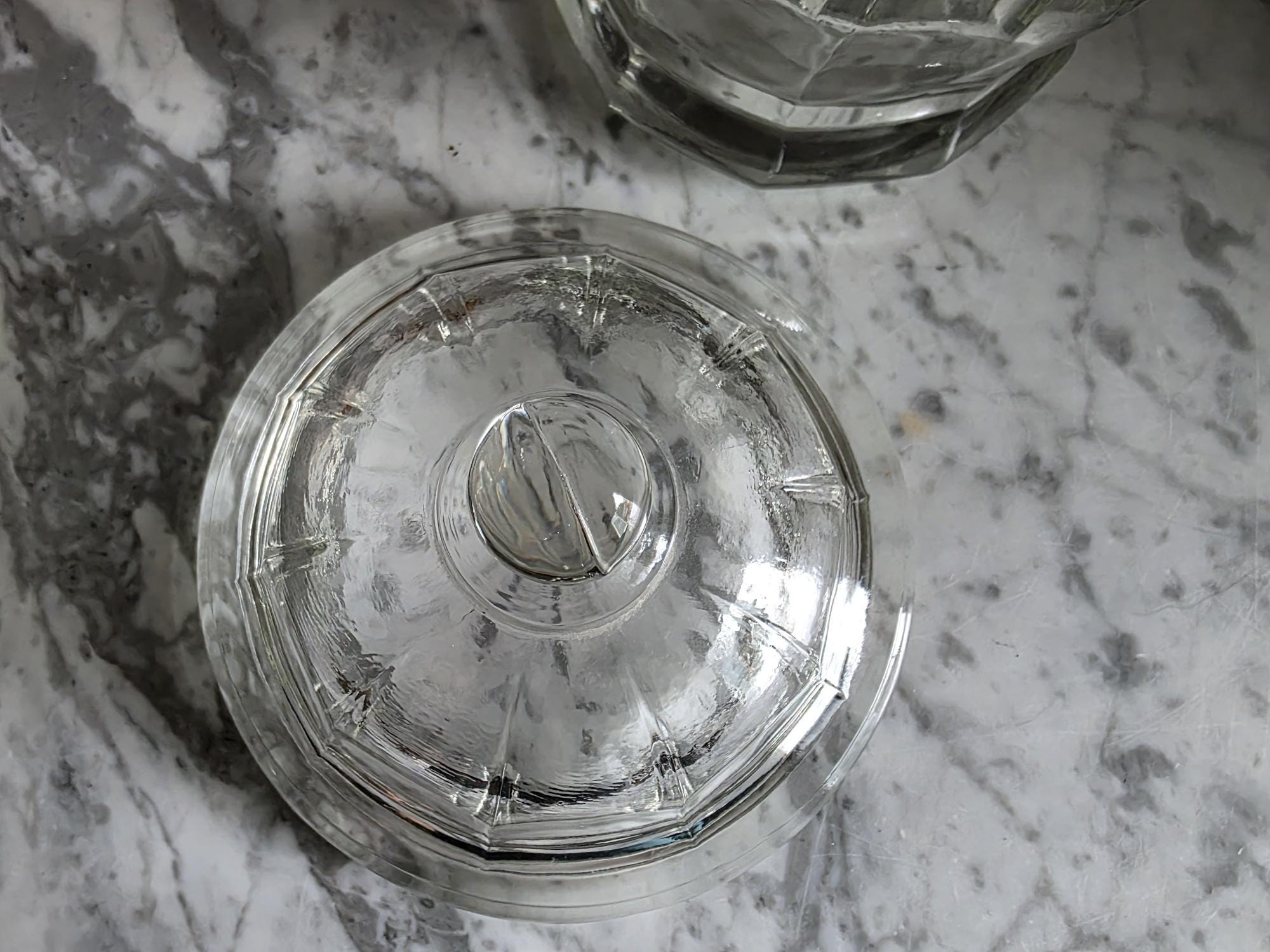 Add a touch of classic retro charm to your kitchen, bathroom, or vanity with this vintage clear glass apothecary jar by Indiana Glass. Featuring a pleasing paneled design, an octagonal faceted base, and a matching domed lid topped with a smooth ball finial, this versatile piece beautifully bridges form and function. Originally popular in the mid-20th century as charming candy dishes or functional storage, jars like this are perfect today for showcasing colorful wrapped sweets, elegantly housing bath salts or cotton balls, or serving as a lovely standalone accent in a vintage-inspired vignette. The clear, substantial pressed glass allows the contents to take center stage while catching the light beautifully. The jar remains in great vintage condition, displaying beautifully with only minor, typical manufacturing characteristics like mold seams that are authentic to glass wares of this era.