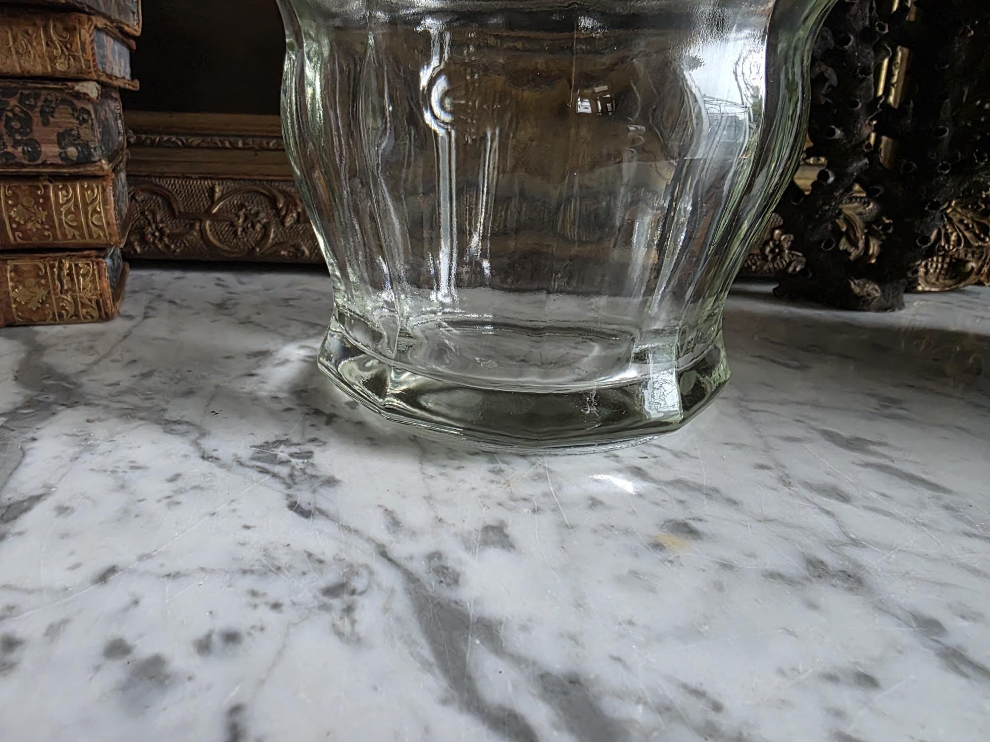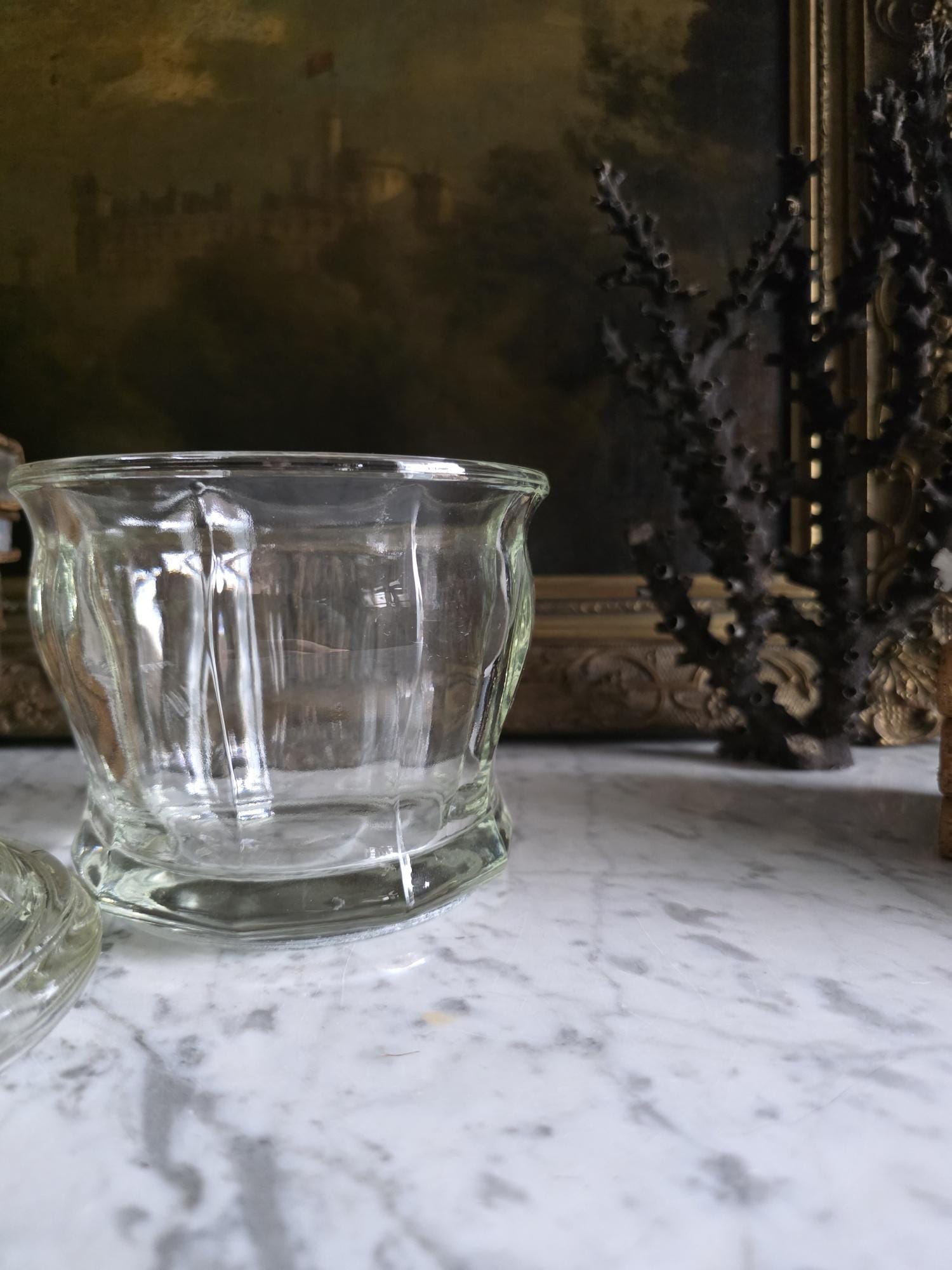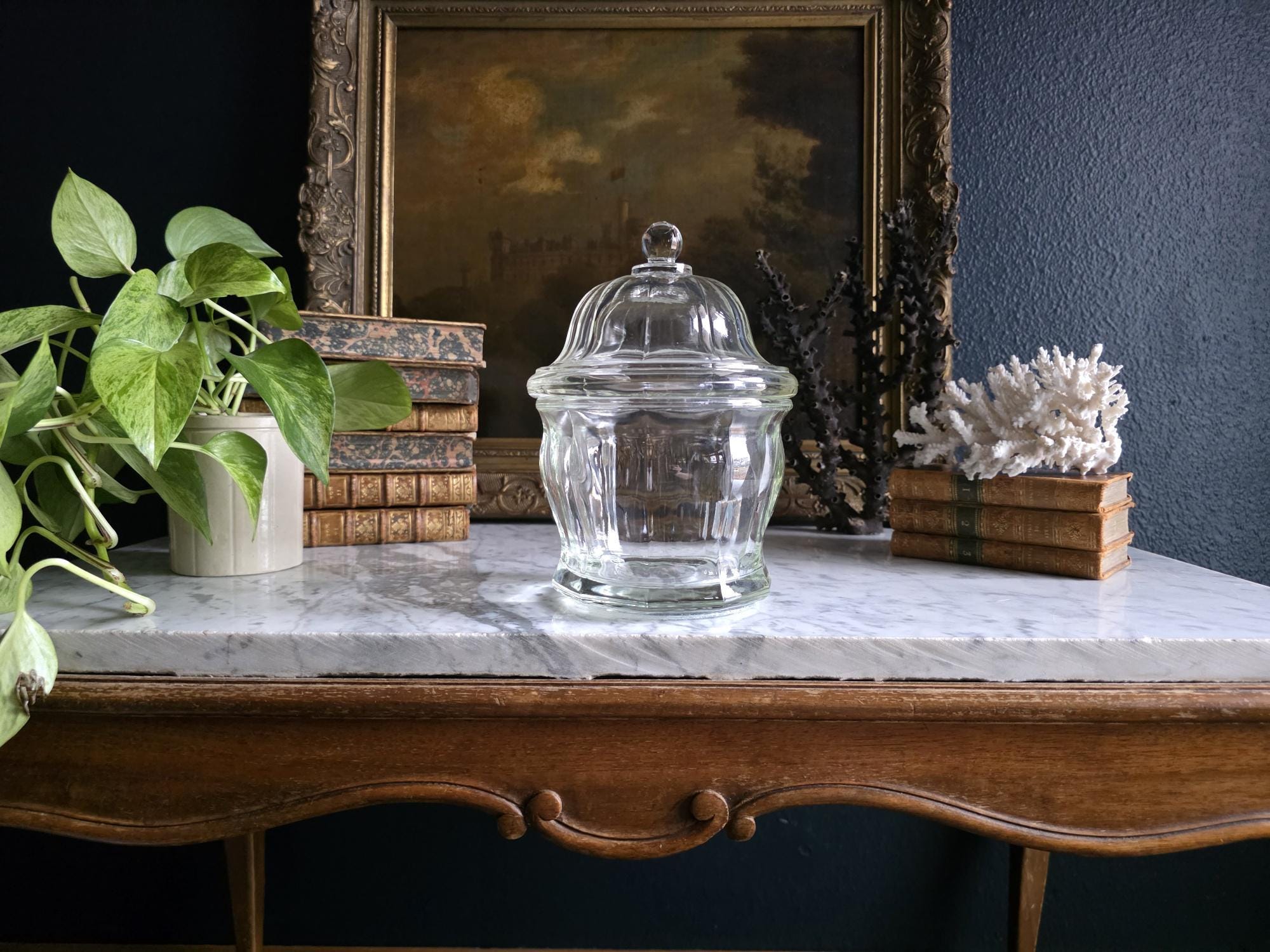 Add a touch of classic retro charm to your kitchen, bathroom, or vanity with this vintage clear glass apothecary jar by Indiana Glass. Featuring a pleasing paneled design, an octagonal faceted base, and a matching domed lid topped with a smooth ball finial, this versatile piece beautifully bridges form and function. Originally popular in the mid-20th century as charming candy dishes or functional storage, jars like this are perfect today for showcasing colorful wrapped sweets, elegantly housing bath salts or cotton balls, or serving as a lovely standalone accent in a vintage-inspired vignette. The clear, substantial pressed glass allows the contents to take center stage while catching the light beautifully. The jar remains in great vintage condition, displaying beautifully with only minor, typical manufacturing characteristics like mold seams that are authentic to glass wares of this era.