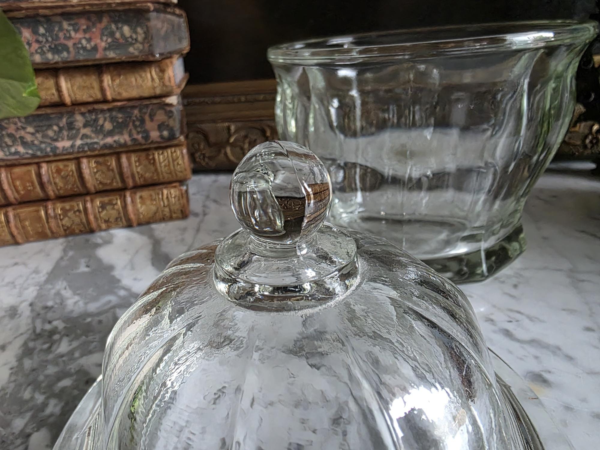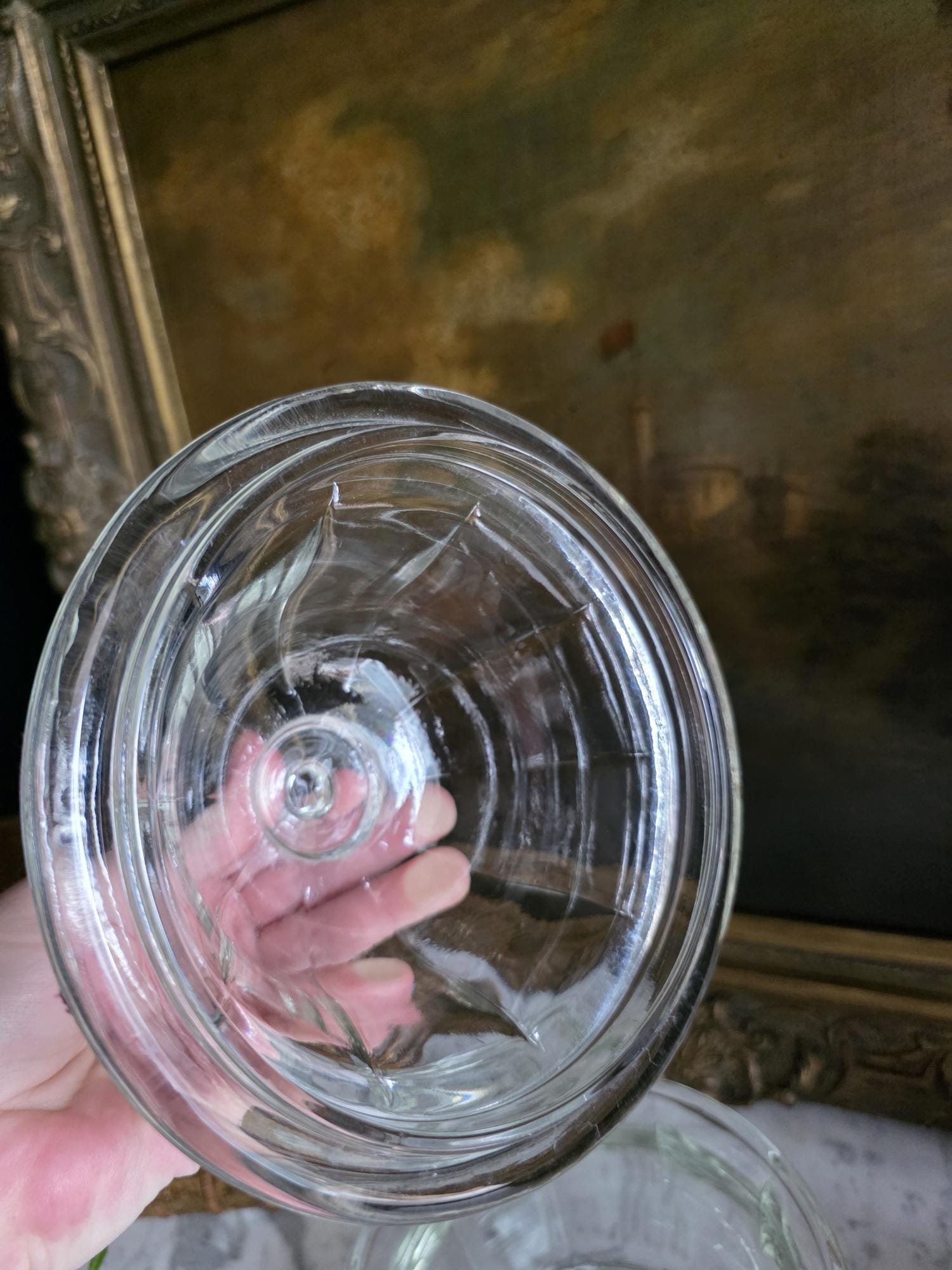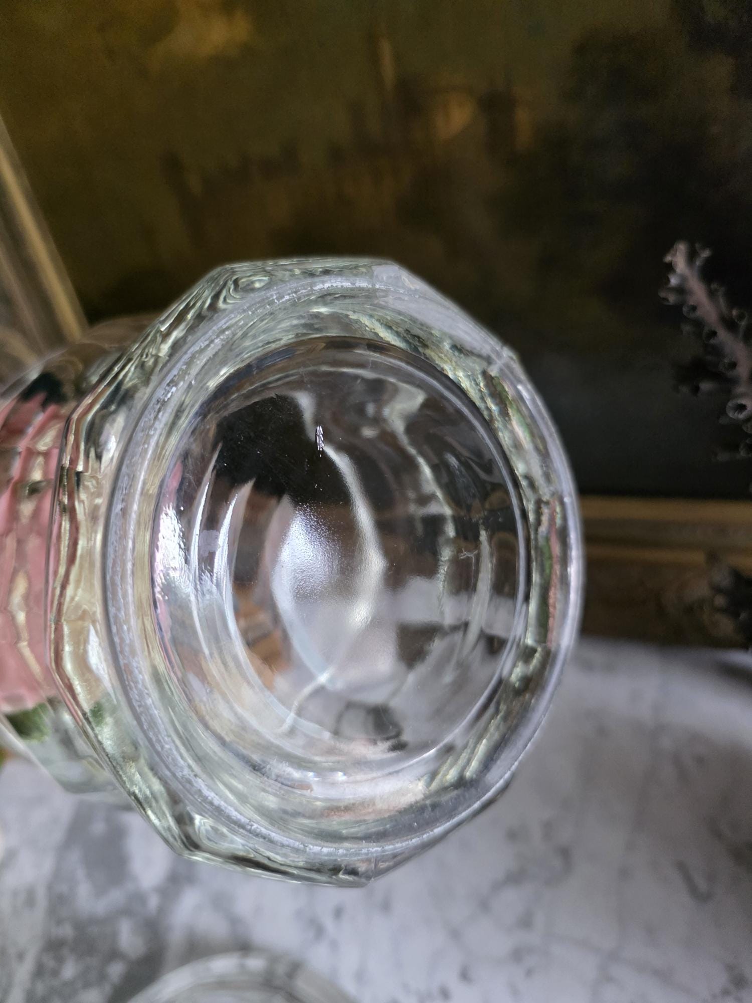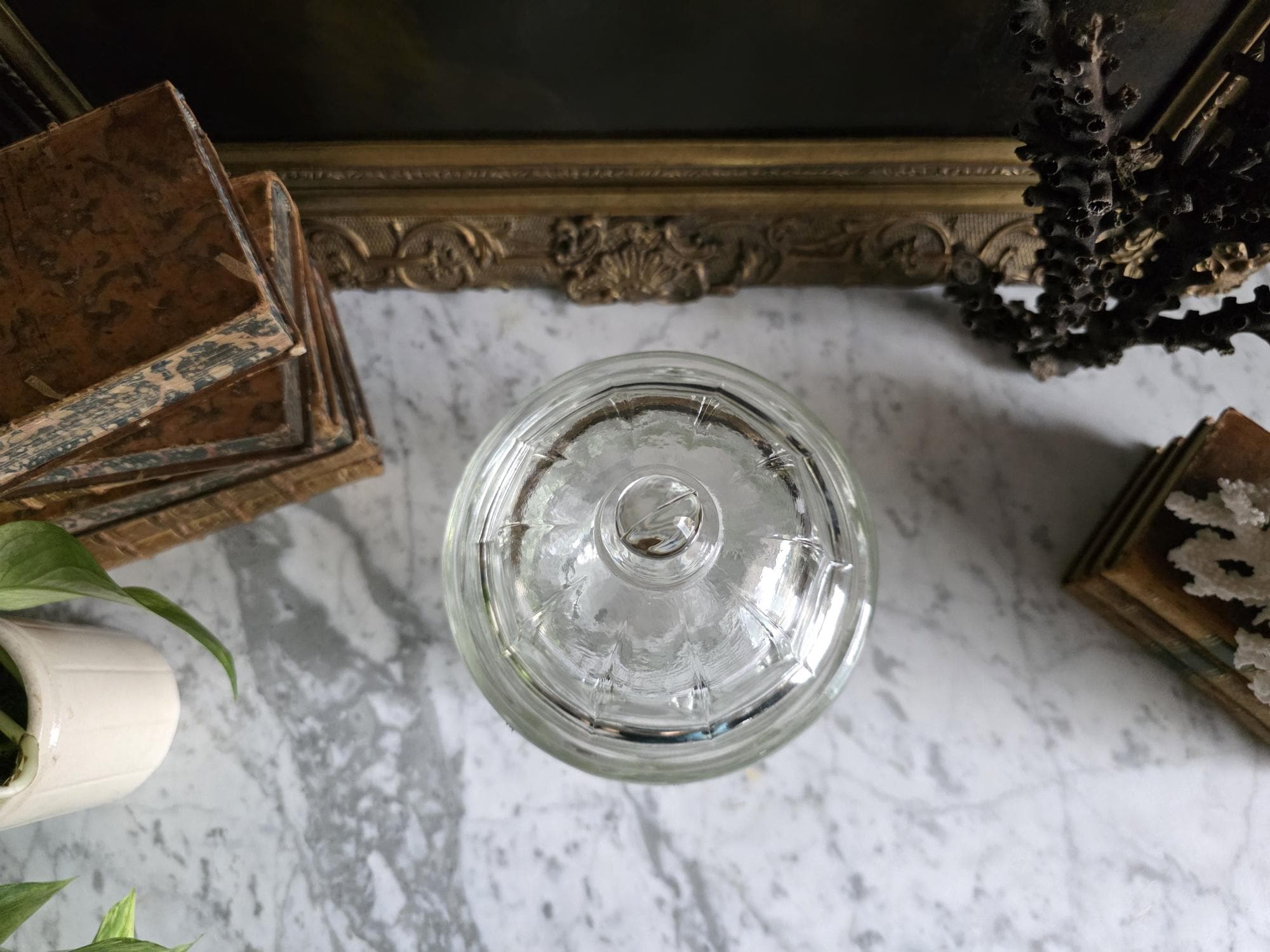 Add a touch of classic retro charm to your kitchen, bathroom, or vanity with this vintage clear glass apothecary jar by Indiana Glass. Featuring a pleasing paneled design, an octagonal faceted base, and a matching domed lid topped with a smooth ball finial, this versatile piece beautifully bridges form and function. Originally popular in the mid-20th century as charming candy dishes or functional storage, jars like this are perfect today for showcasing colorful wrapped sweets, elegantly housing bath salts or cotton balls, or serving as a lovely standalone accent in a vintage-inspired vignette. The clear, substantial pressed glass allows the contents to take center stage while catching the light beautifully. The jar remains in great vintage condition, displaying beautifully with only minor, typical manufacturing characteristics like mold seams that are authentic to glass wares of this era.