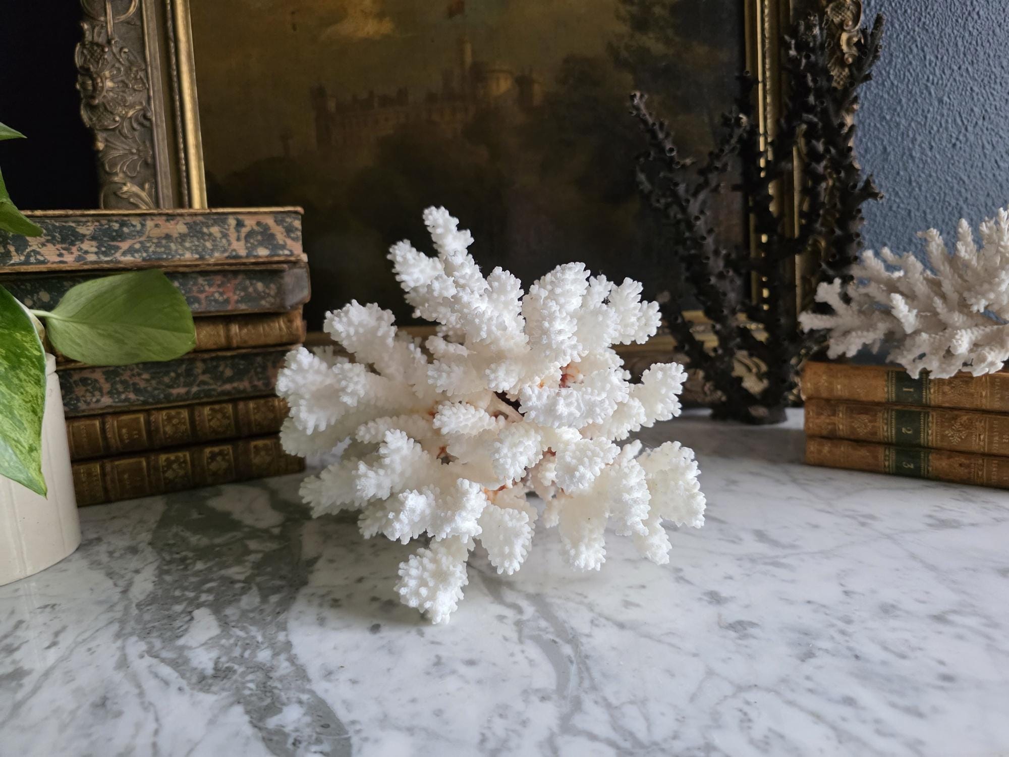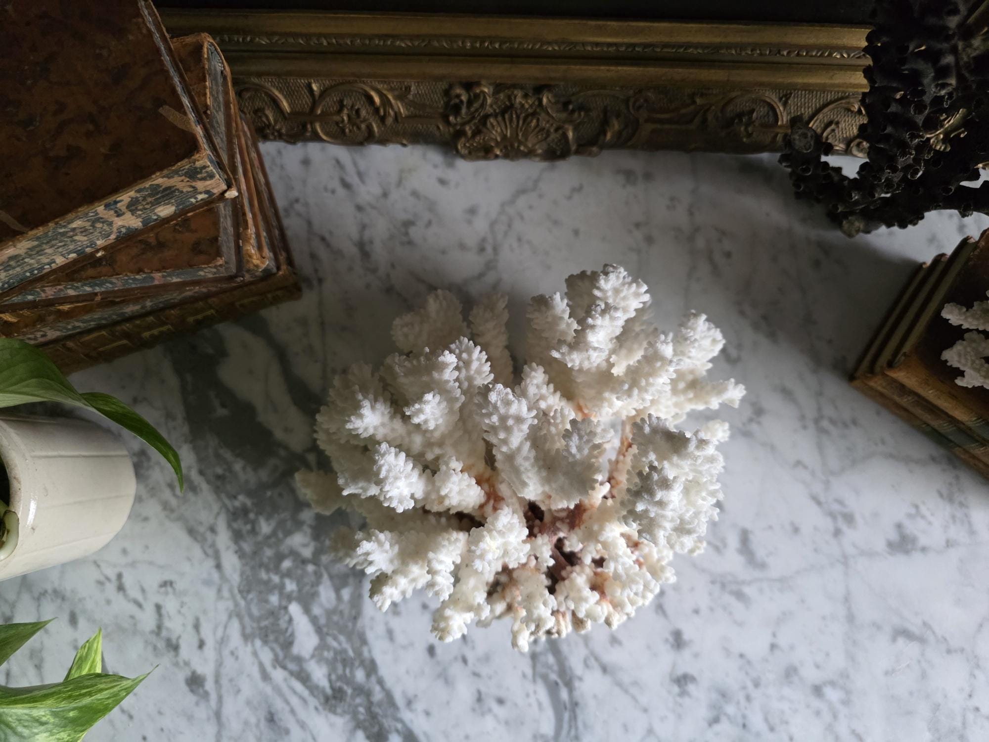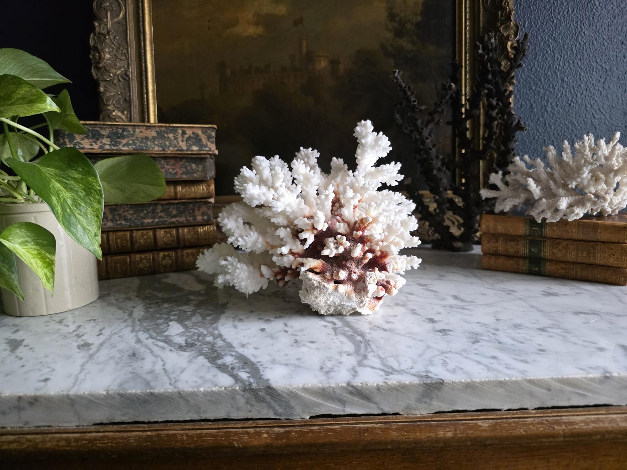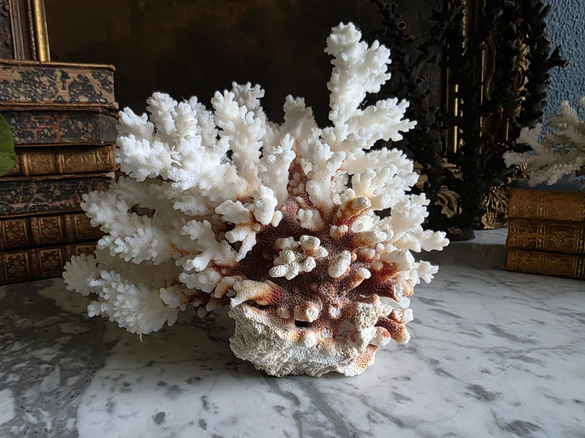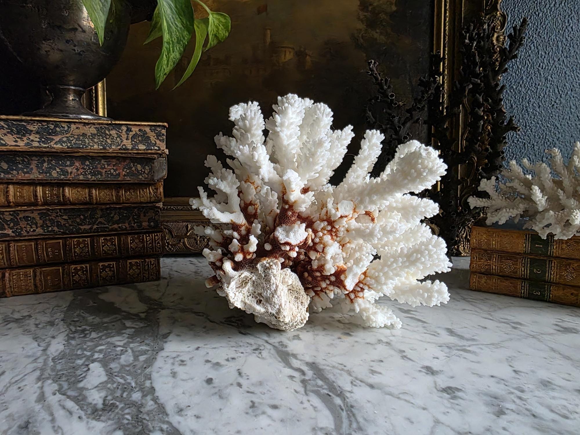 Bring a touch of classic natural history to your curated interior with this stunning, large coral specimen. Based on its distinctive knobby, tightly clustered branches and rich coloration, this piece is a beautiful example of brownstem coral. The specimen features a dynamic, organic structure with crisp white outer branches that transition deeply into a striking, earthy reddish-brown at the core and base. Perfect for adding textural contrast to a "cabinet of curiosities" vignette, resting atop a stack of weathered library books, or displayed elegantly inside a tarnished silver pedestal bowl, this piece effortlessly bridges classic coastal decor with traditional, eclectic styling. It remains in beautiful vintage condition, offering a substantial, weighty presence and a fascinating geometry that serves as a captivating focal point in any room.