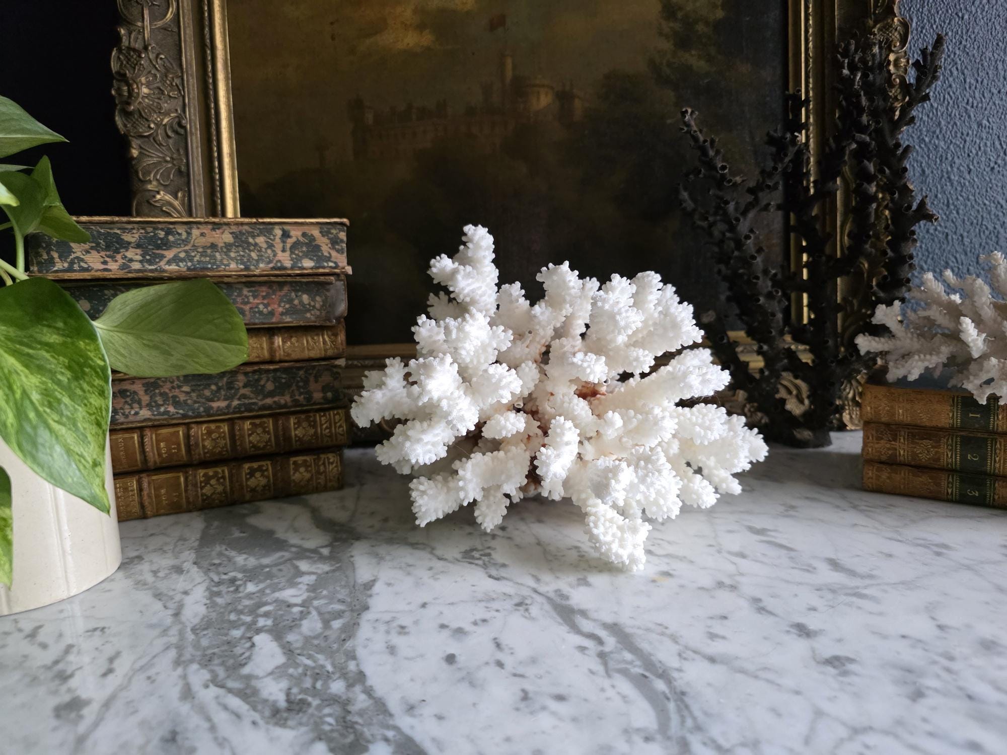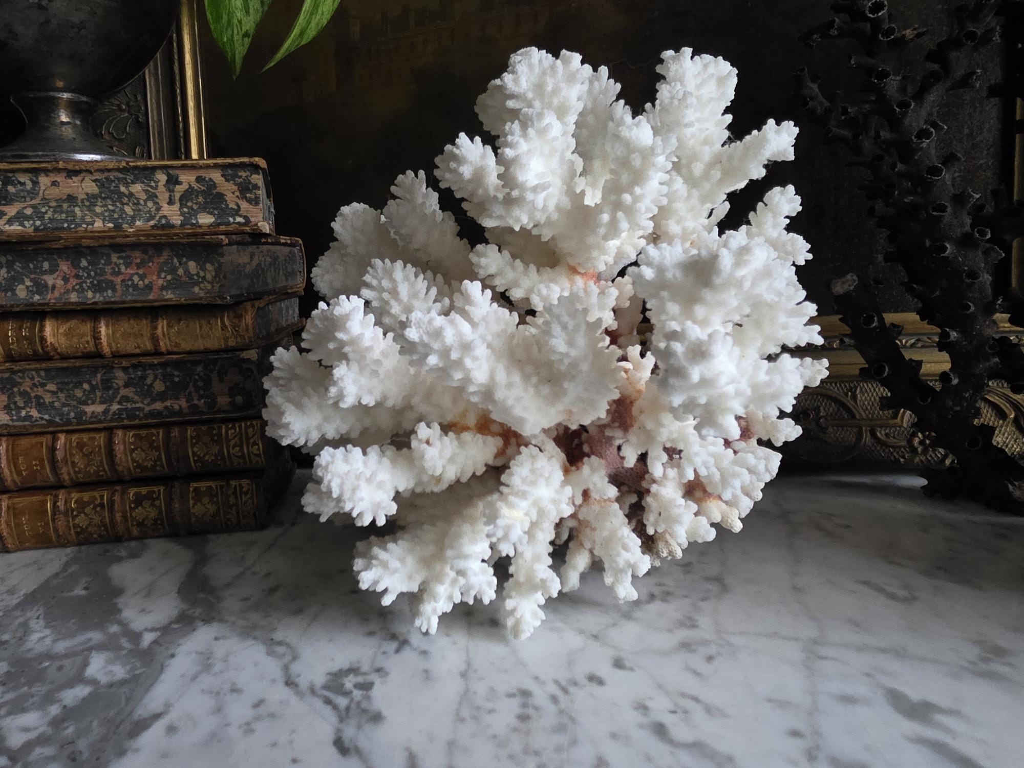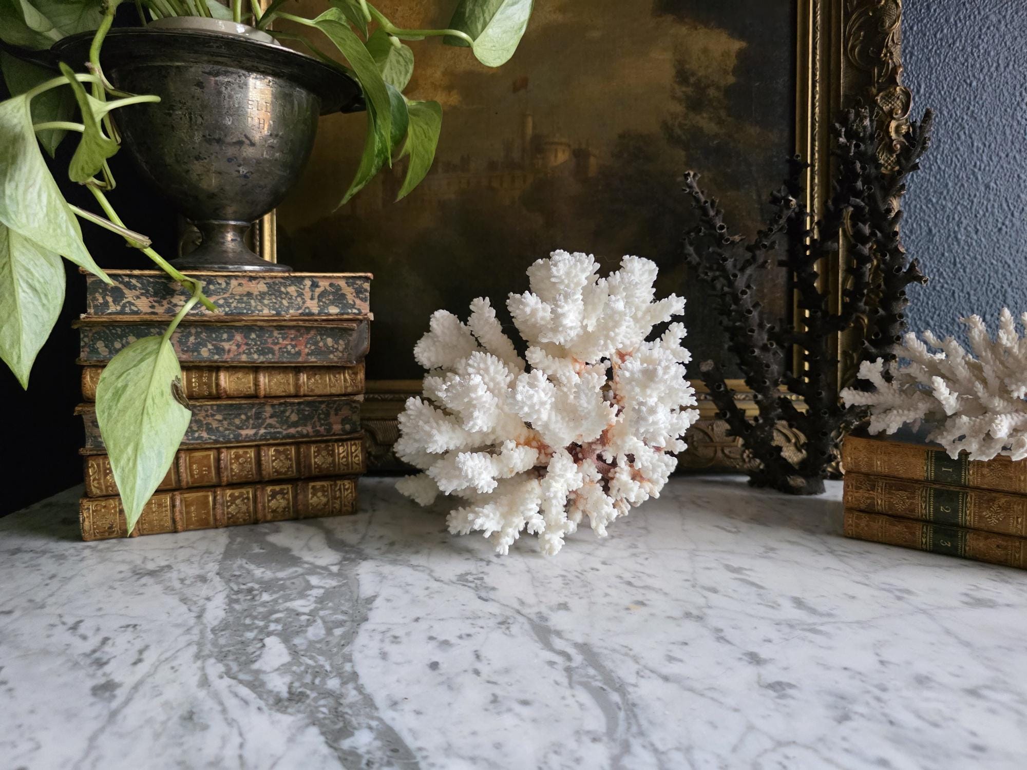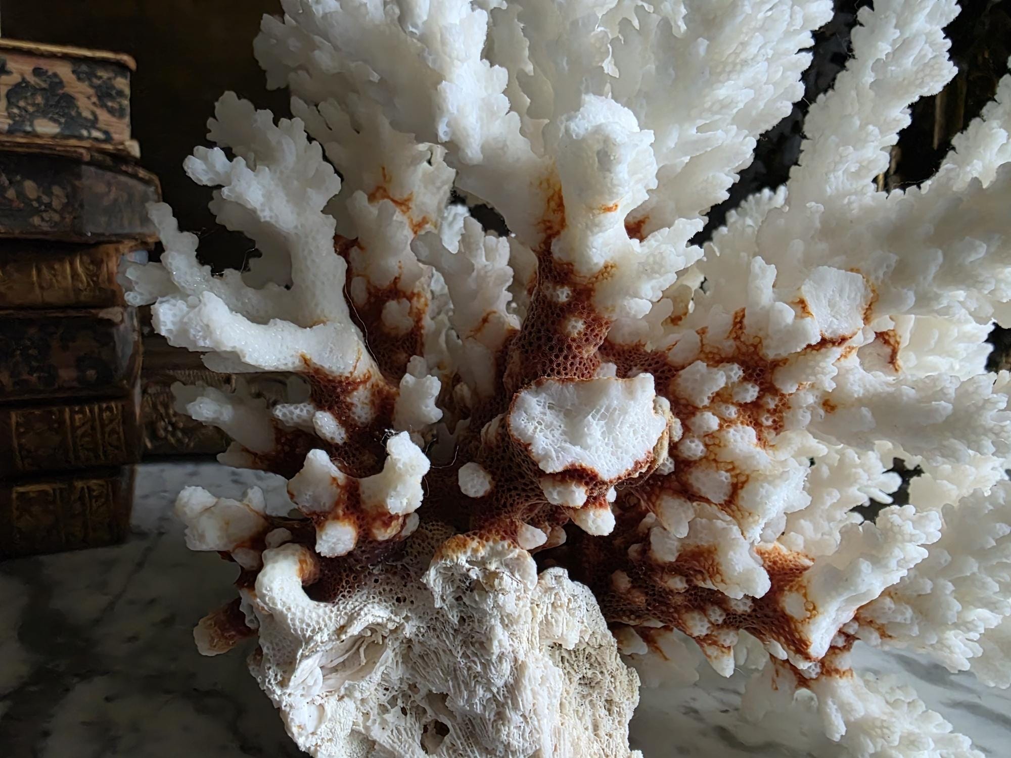 Bring a touch of classic natural history to your curated interior with this stunning, large coral specimen. Based on its distinctive knobby, tightly clustered branches and rich coloration, this piece is a beautiful example of brownstem coral. The specimen features a dynamic, organic structure with crisp white outer branches that transition deeply into a striking, earthy reddish-brown at the core and base. Perfect for adding textural contrast to a "cabinet of curiosities" vignette, resting atop a stack of weathered library books, or displayed elegantly inside a tarnished silver pedestal bowl, this piece effortlessly bridges classic coastal decor with traditional, eclectic styling. It remains in beautiful vintage condition, offering a substantial, weighty presence and a fascinating geometry that serves as a captivating focal point in any room.