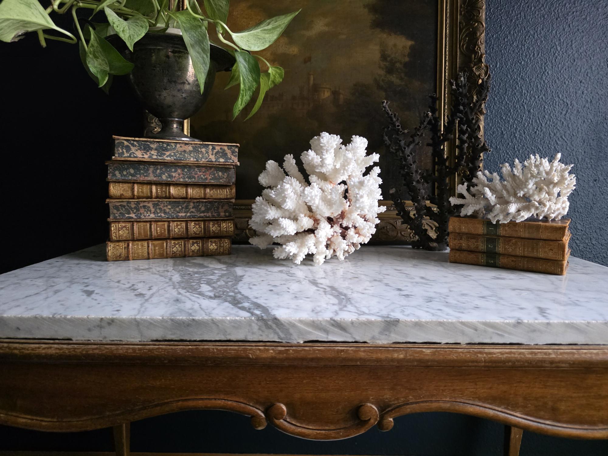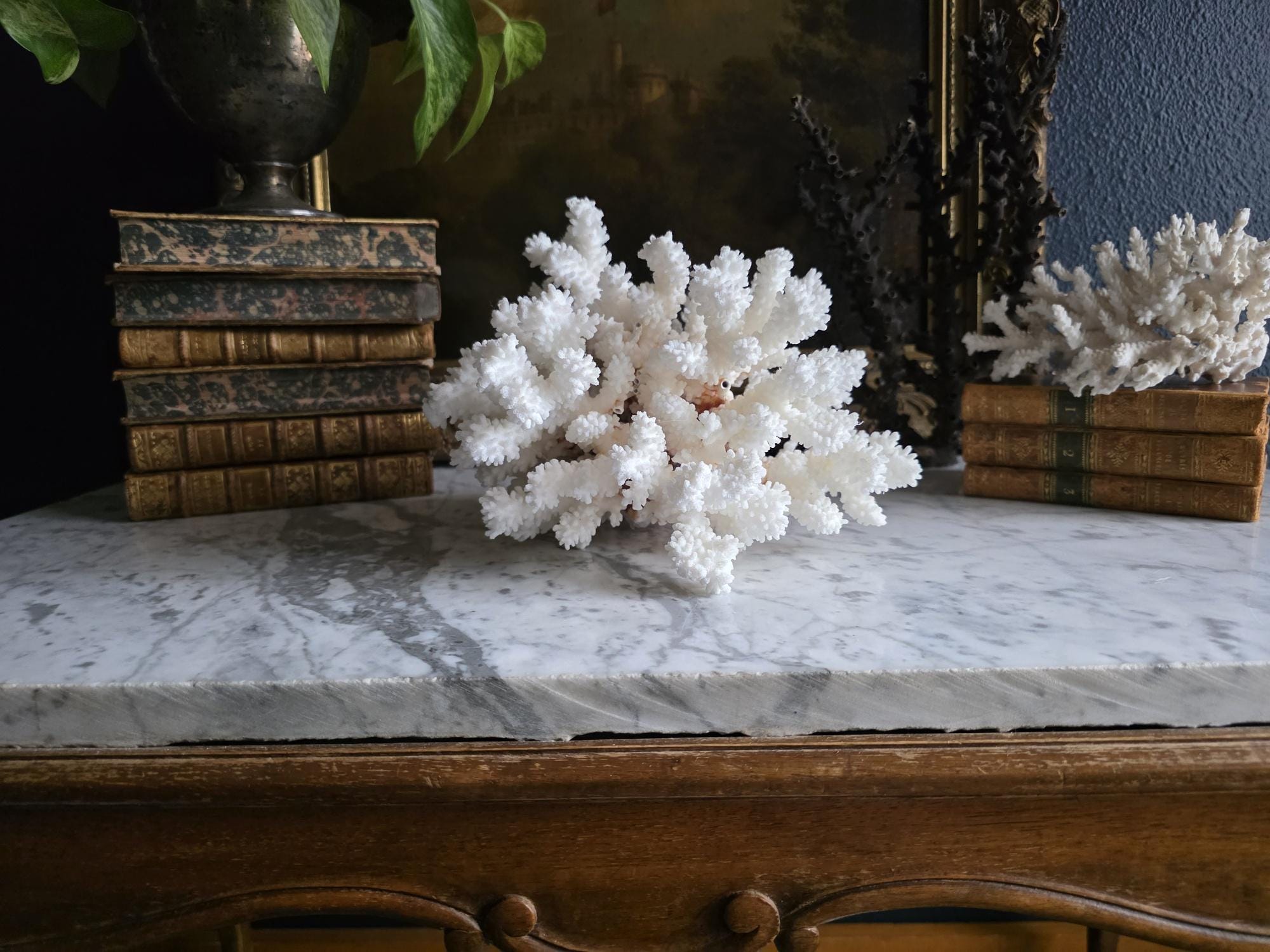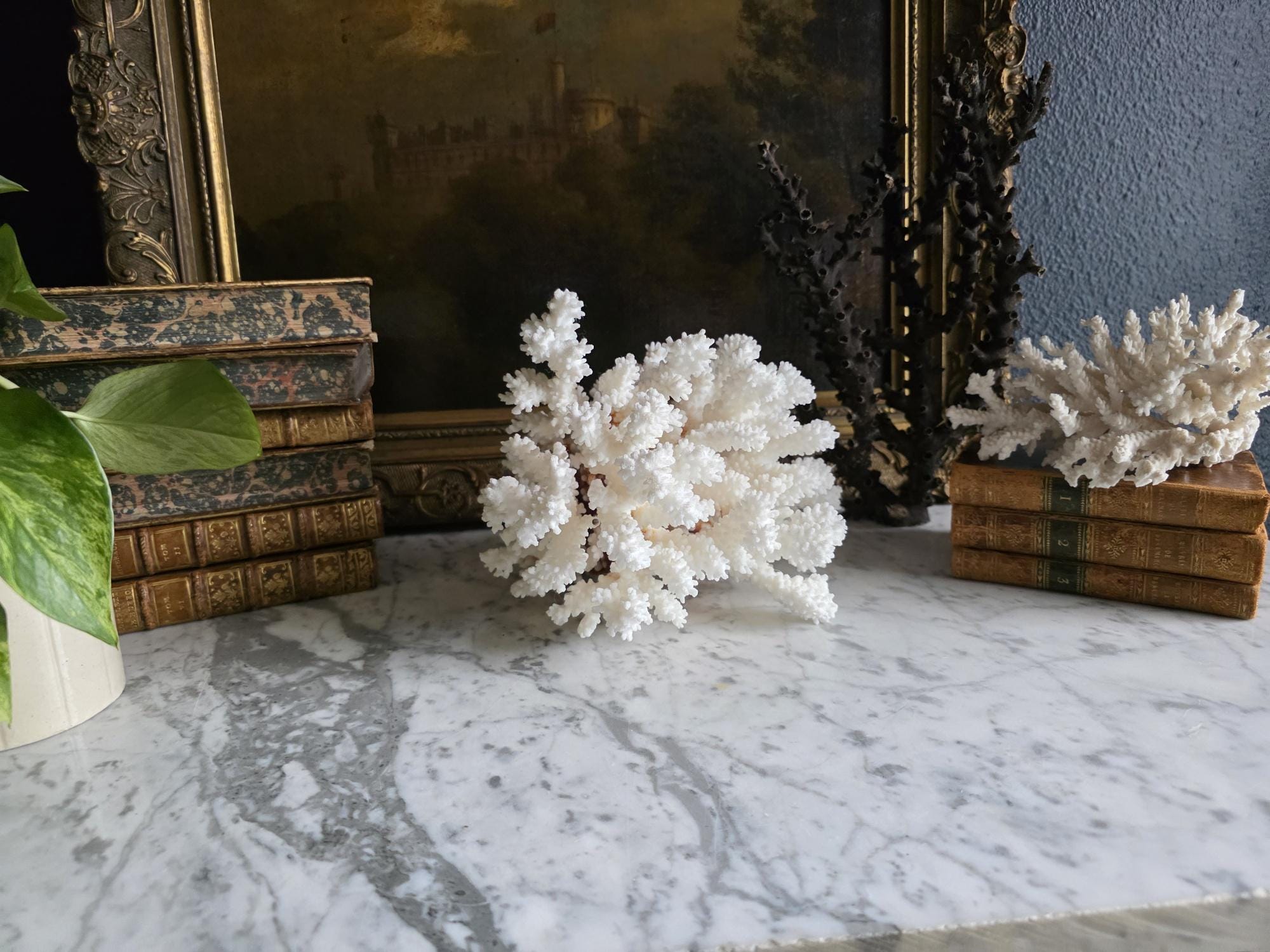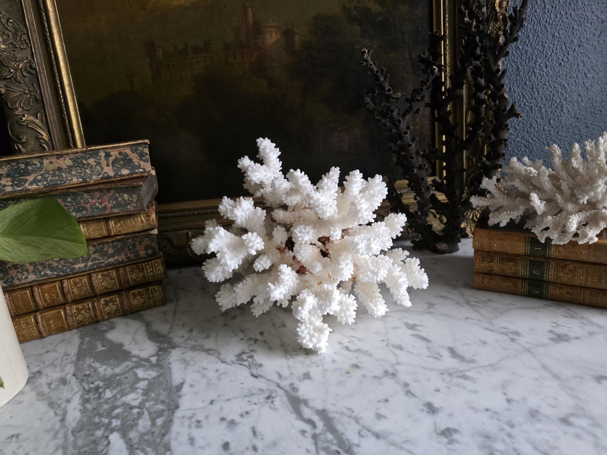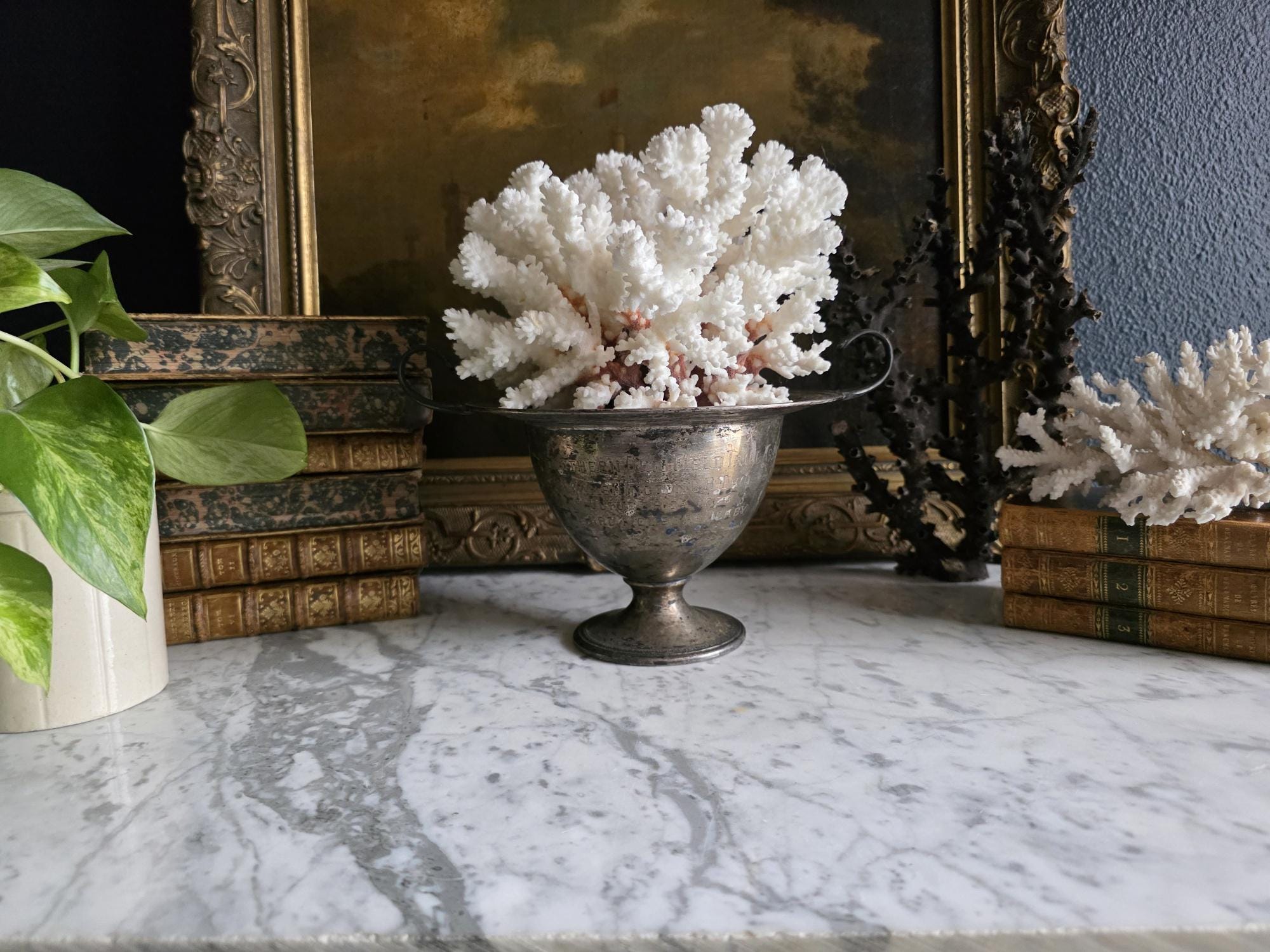 Bring a touch of classic natural history to your curated interior with this stunning, large coral specimen. Based on its distinctive knobby, tightly clustered branches and rich coloration, this piece is a beautiful example of brownstem coral. The specimen features a dynamic, organic structure with crisp white outer branches that transition deeply into a striking, earthy reddish-brown at the core and base. Perfect for adding textural contrast to a "cabinet of curiosities" vignette, resting atop a stack of weathered library books, or displayed elegantly inside a tarnished silver pedestal bowl, this piece effortlessly bridges classic coastal decor with traditional, eclectic styling. It remains in beautiful vintage condition, offering a substantial, weighty presence and a fascinating geometry that serves as a captivating focal point in any room.