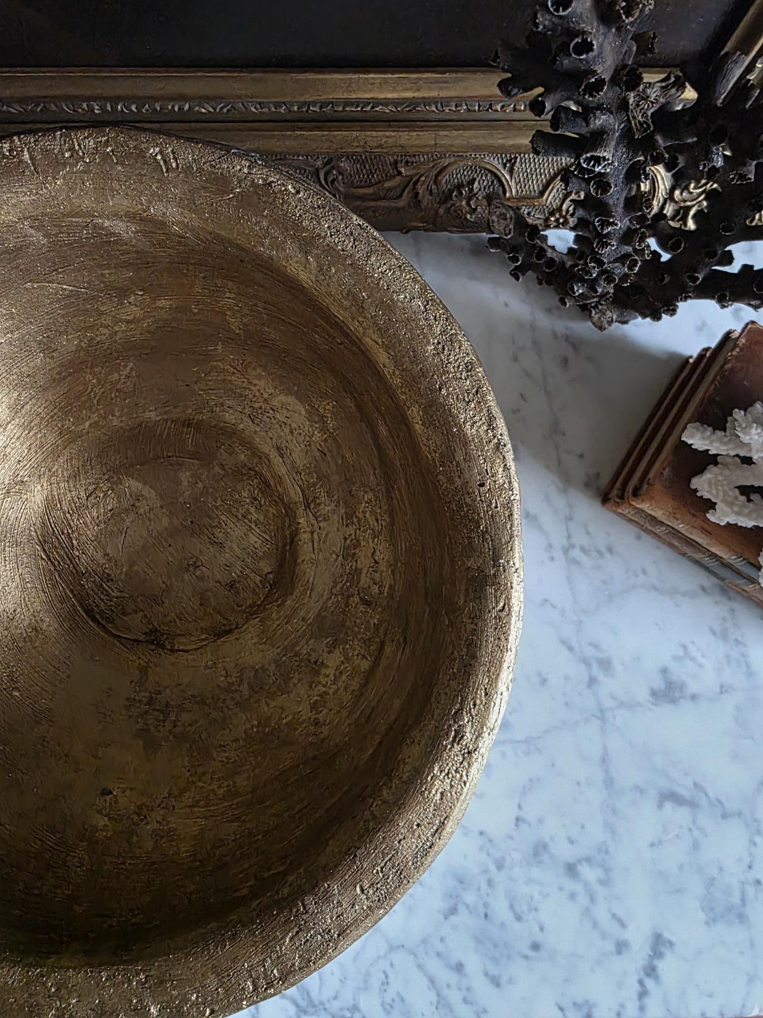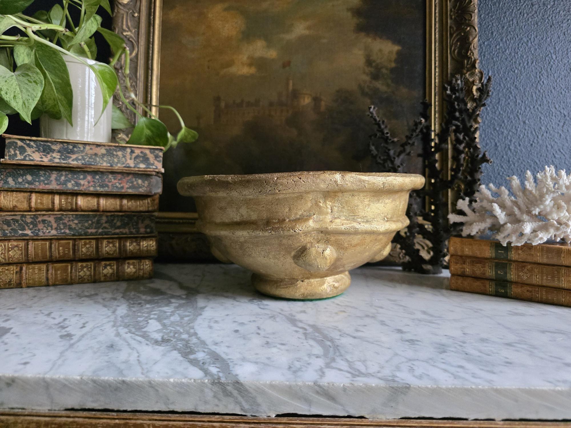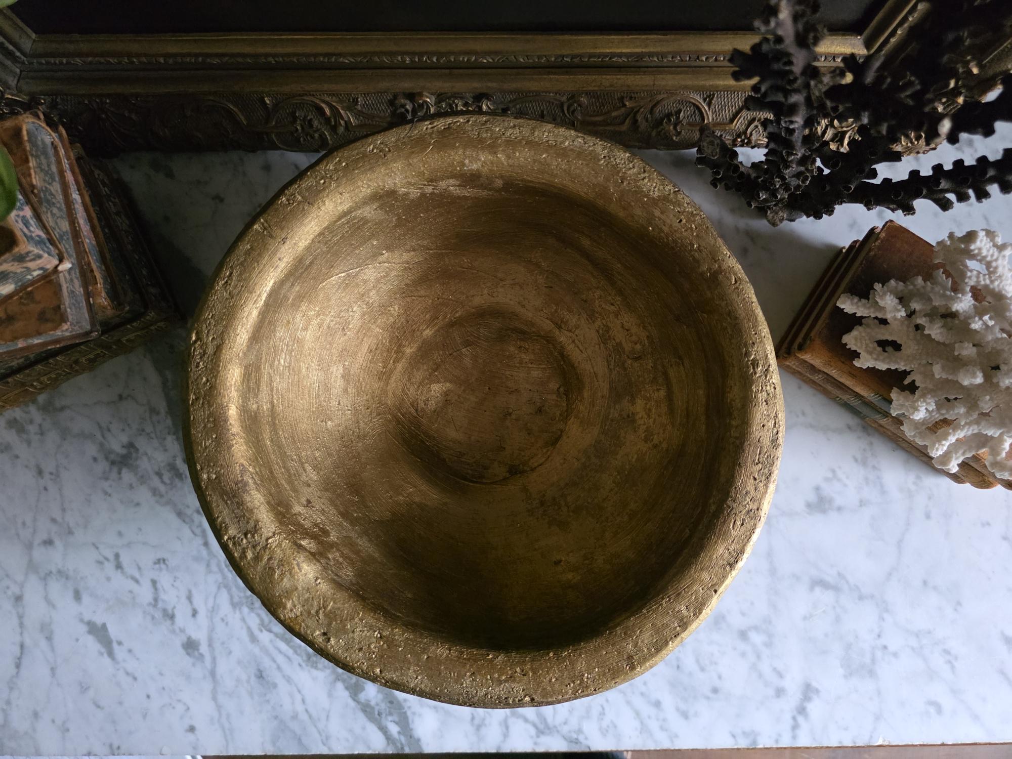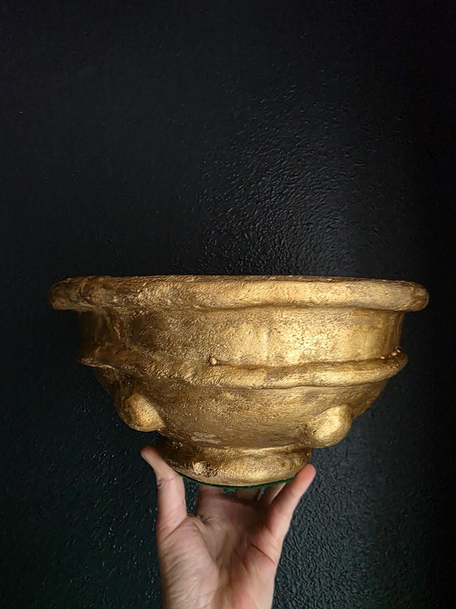 Make a bold, sculptural statement with this heavy vintage (likely mid-century Italian) ceramic bowl, featuring a striking brutalist design and a heavily textured metallic gold finish. Sitting on a sturdy pedestal foot, the wide bowl is encircled by a distinct horizontal ridge and adorned with flattened, applied ceramic knob studs around its lower half. The rustic gilding gives the piece the illusion of cast bronze or gilded concrete, adding incredible warmth and a Hollywood Regency-meets-brutalist edge to any space. The underside is finished with a protective green felt pad, making this substantial piece table-ready as a dramatic centerpiece, fruit bowl, or an elegant entryway catch-all.